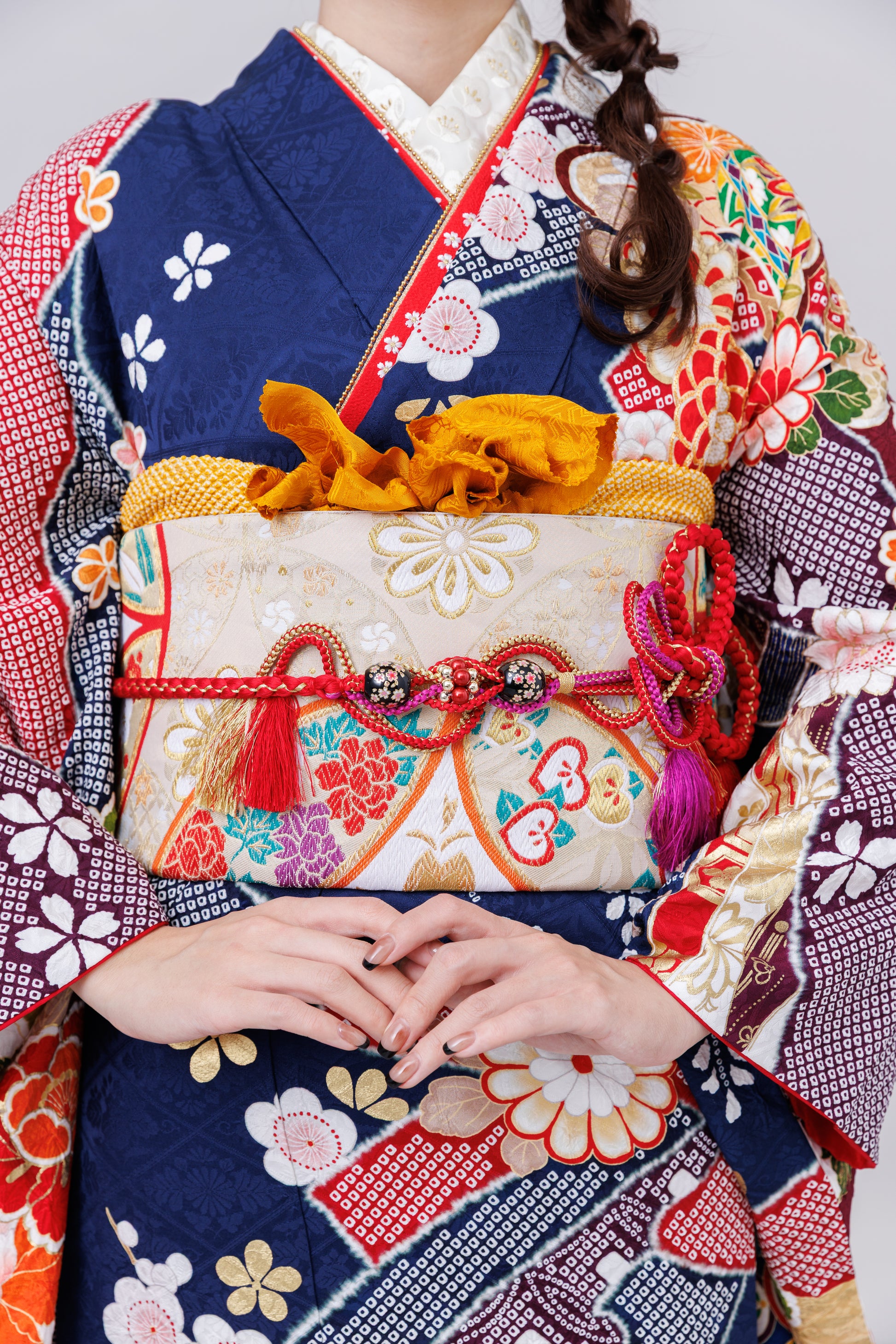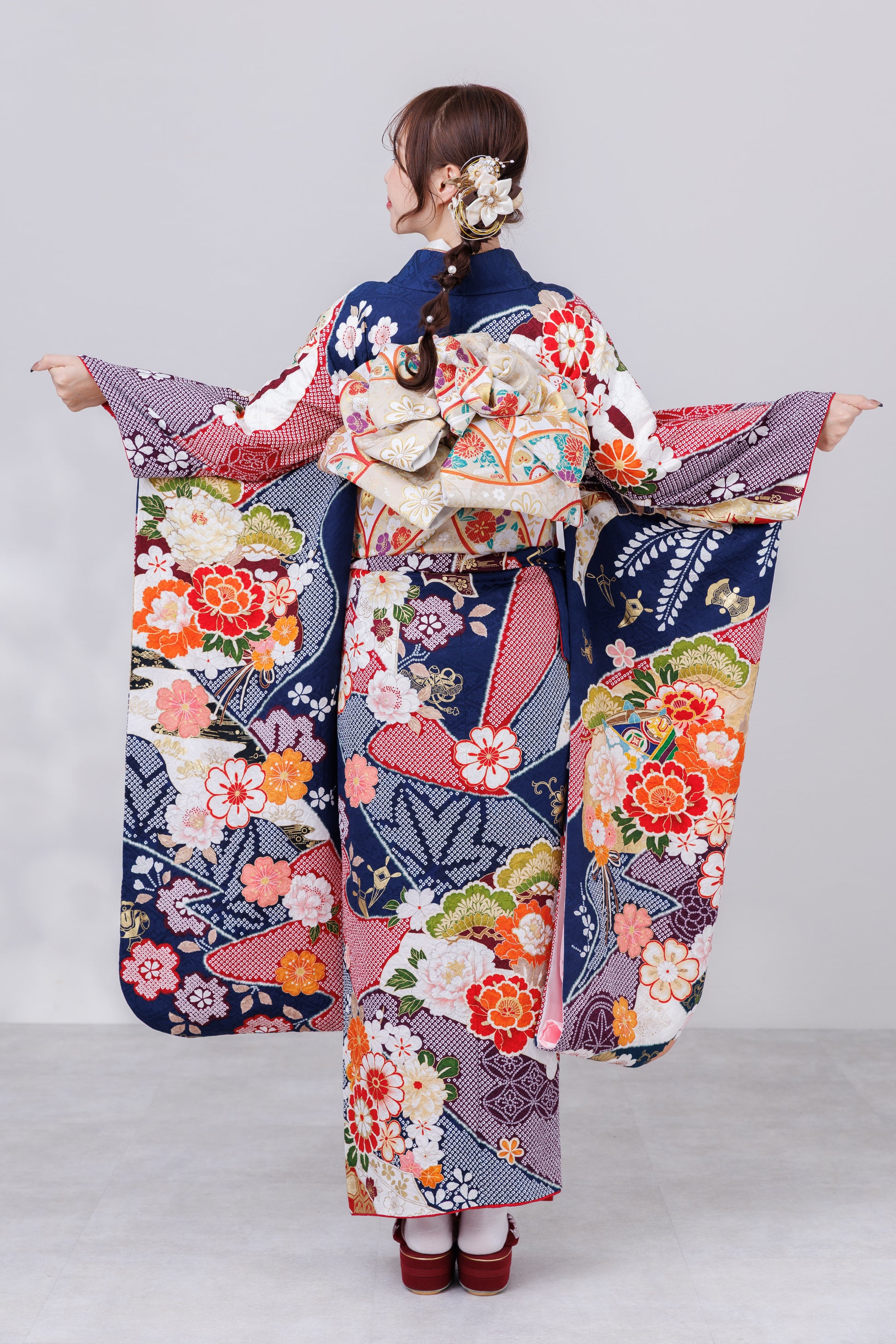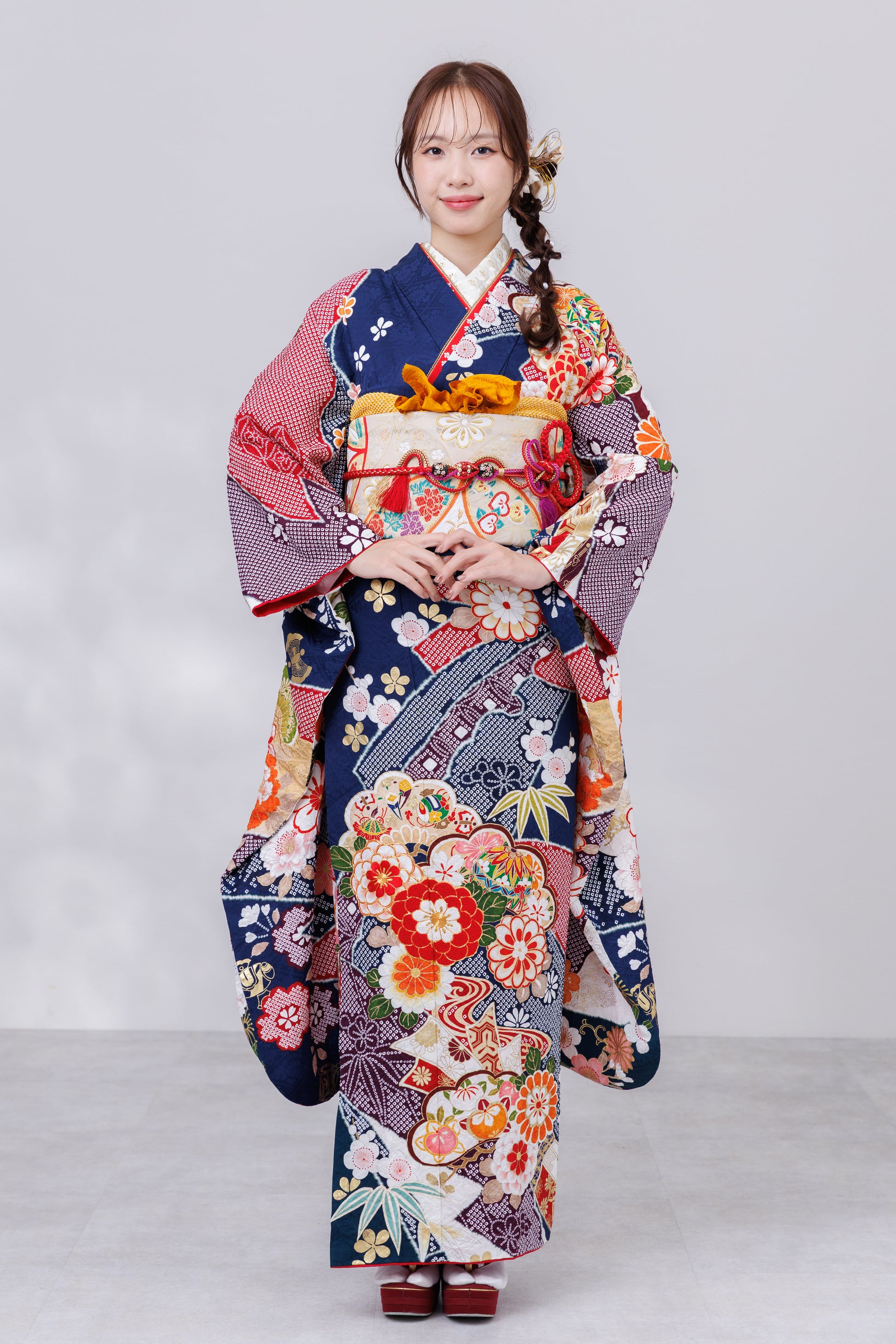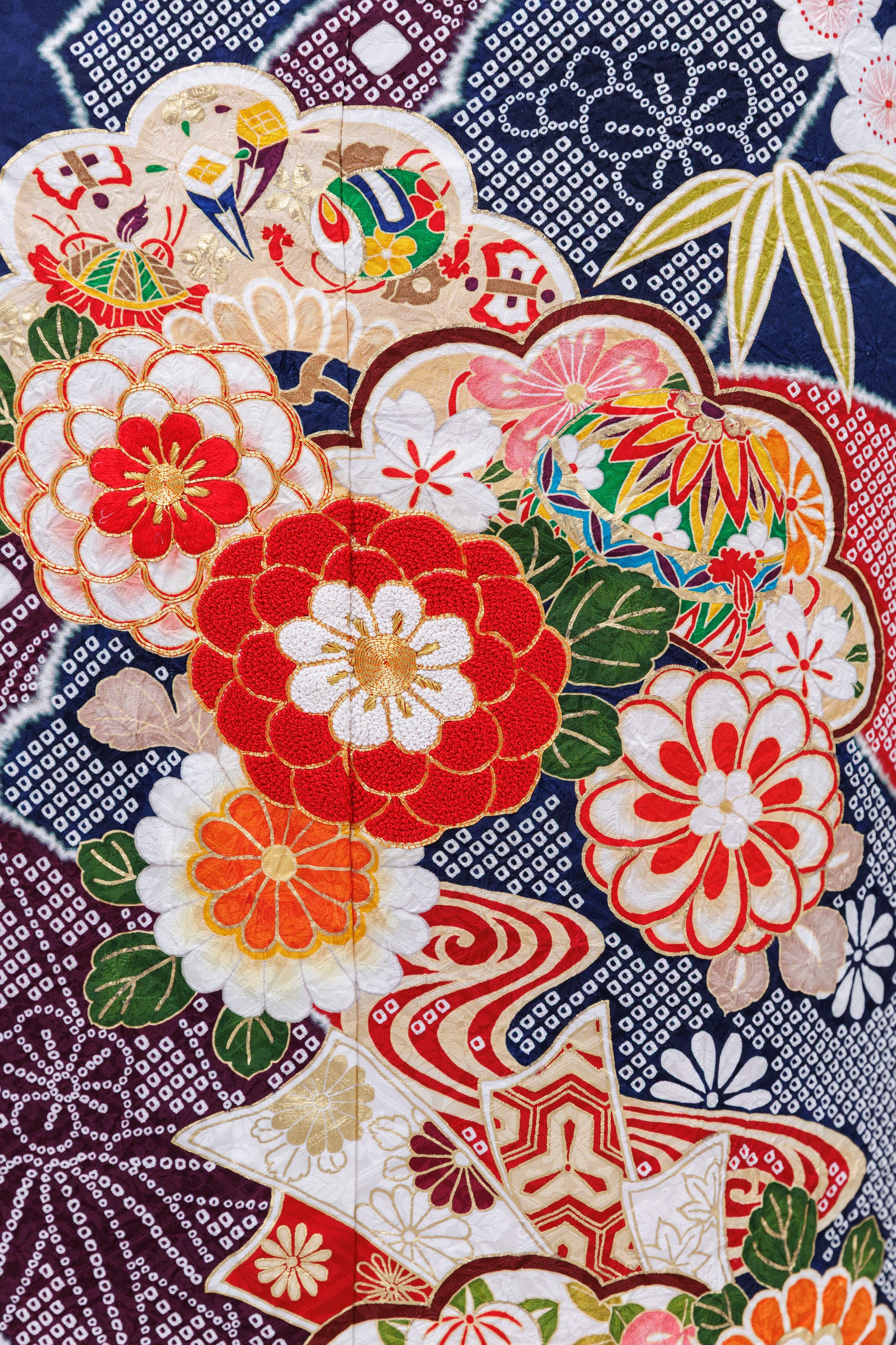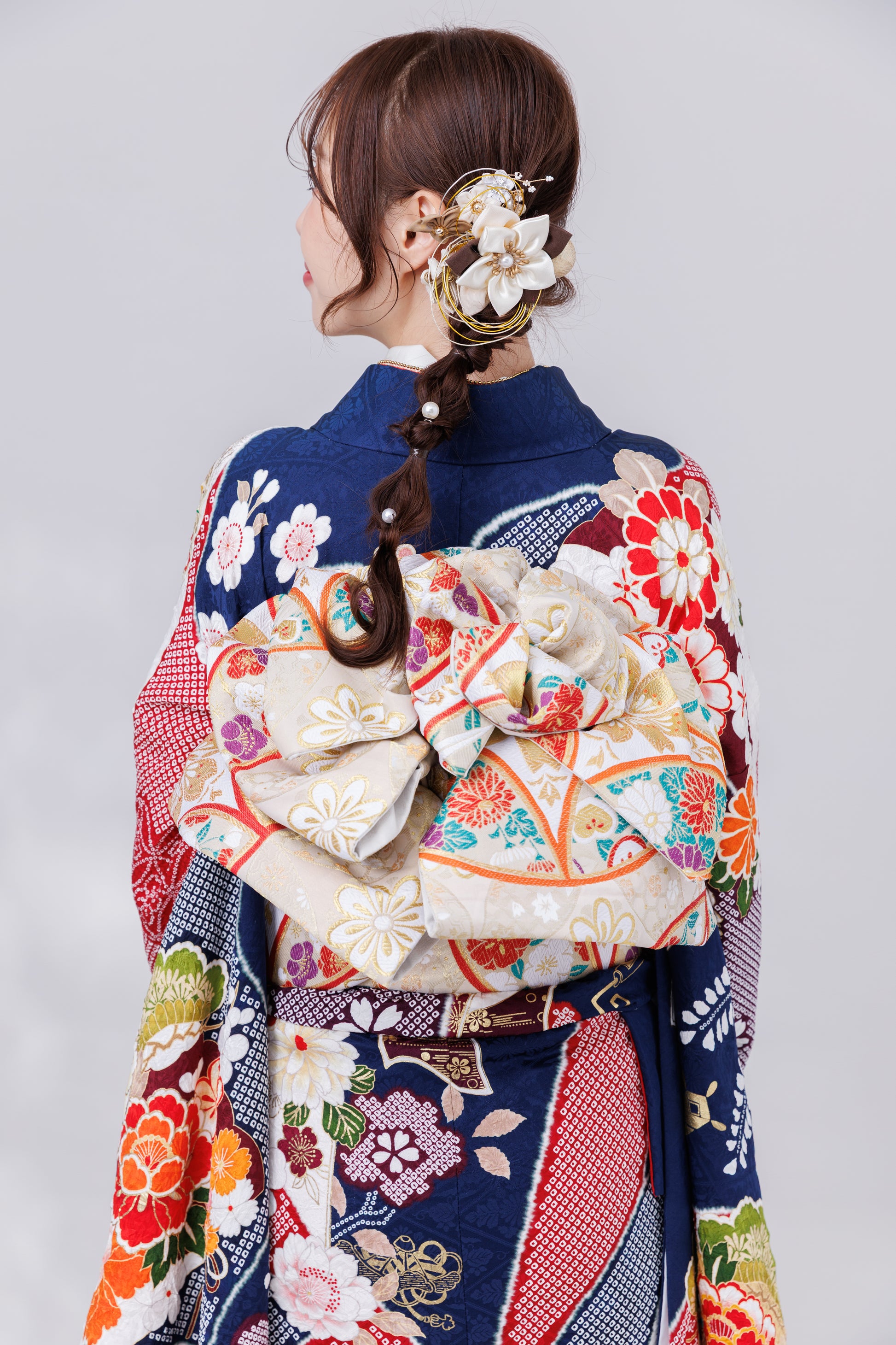明るい紺地に豪華な絞り加工が施された、気品あふれる振袖。