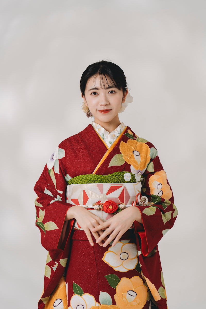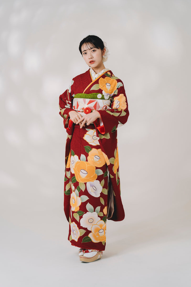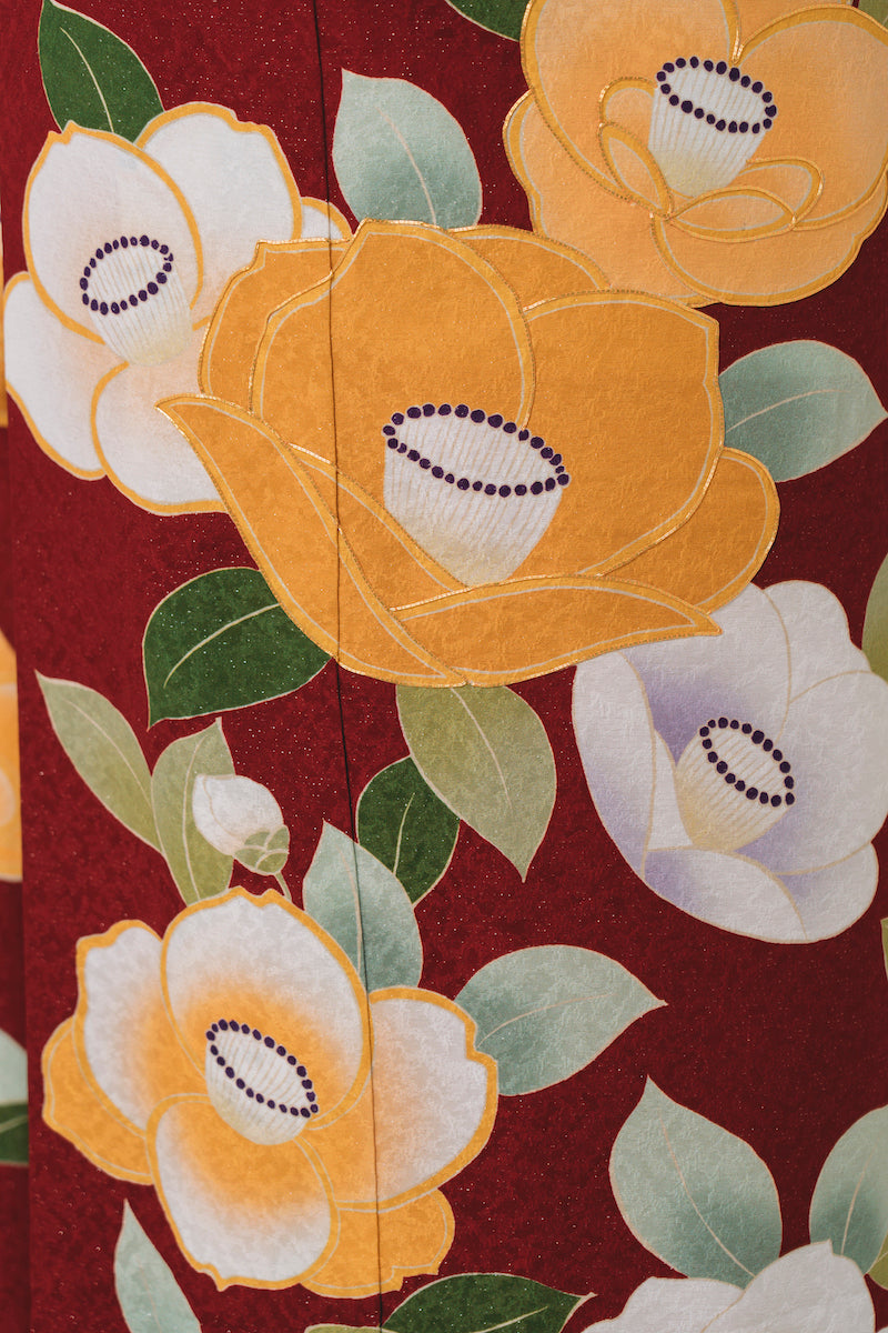 赤地 椿柄 正絹振袖【316】