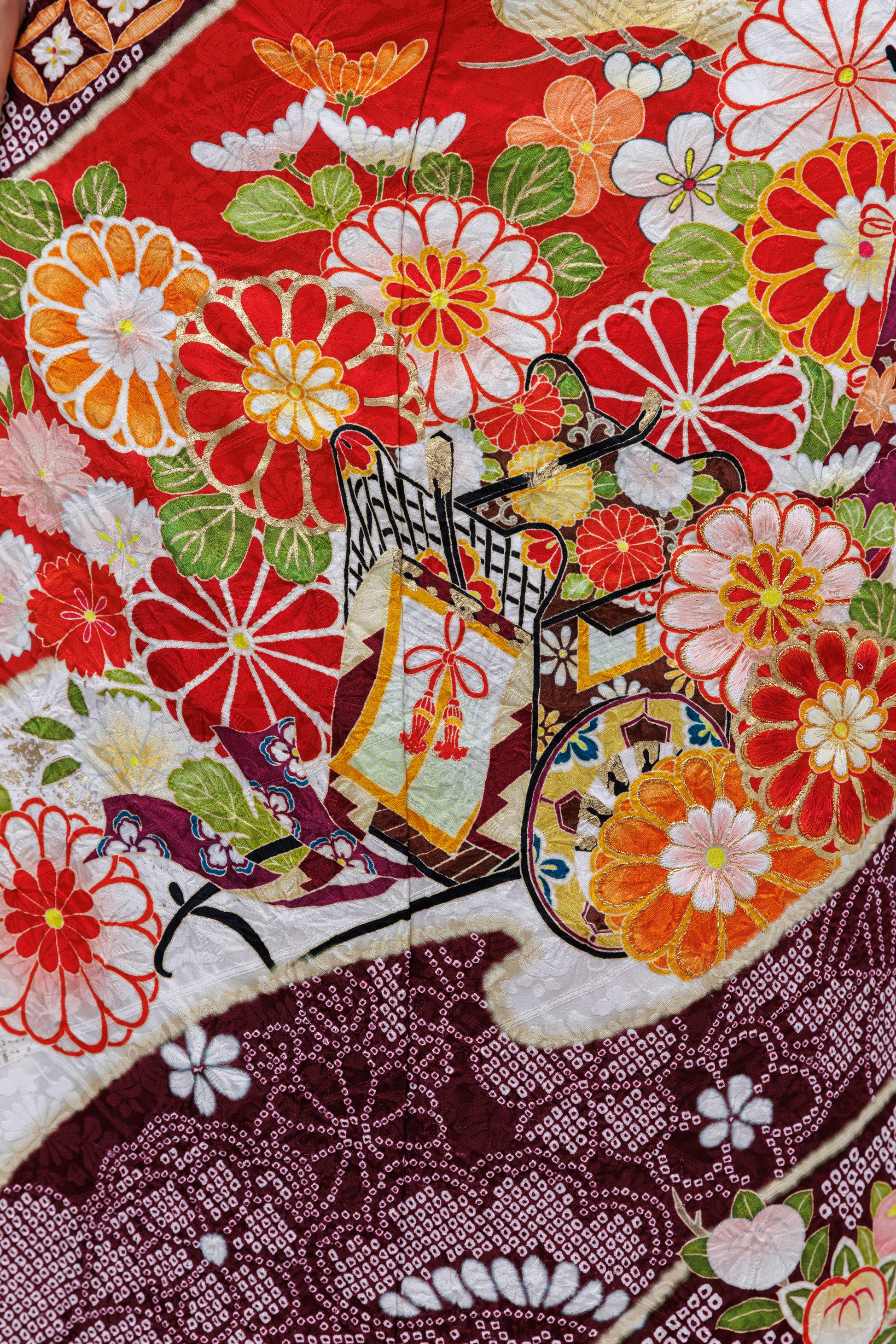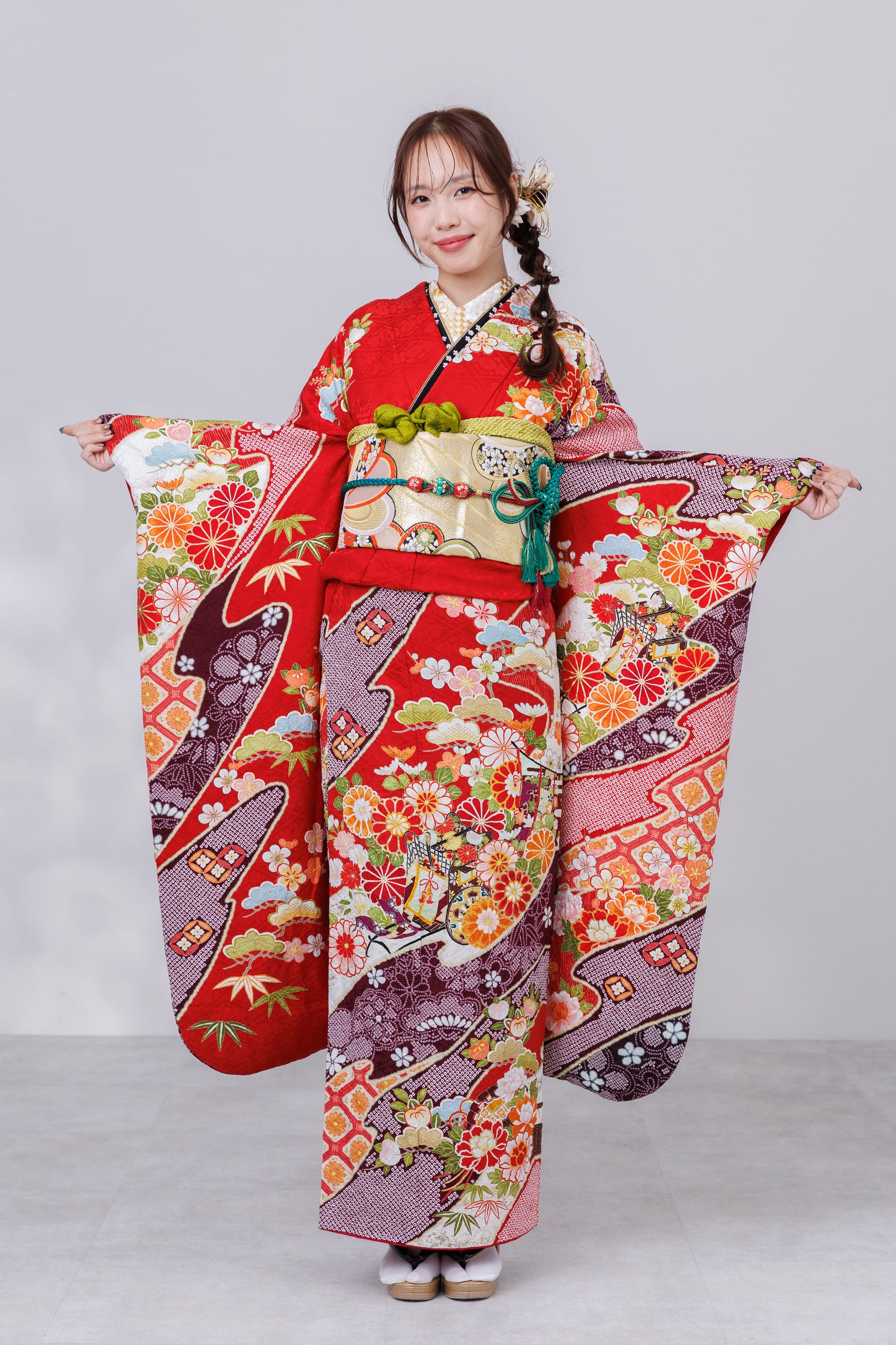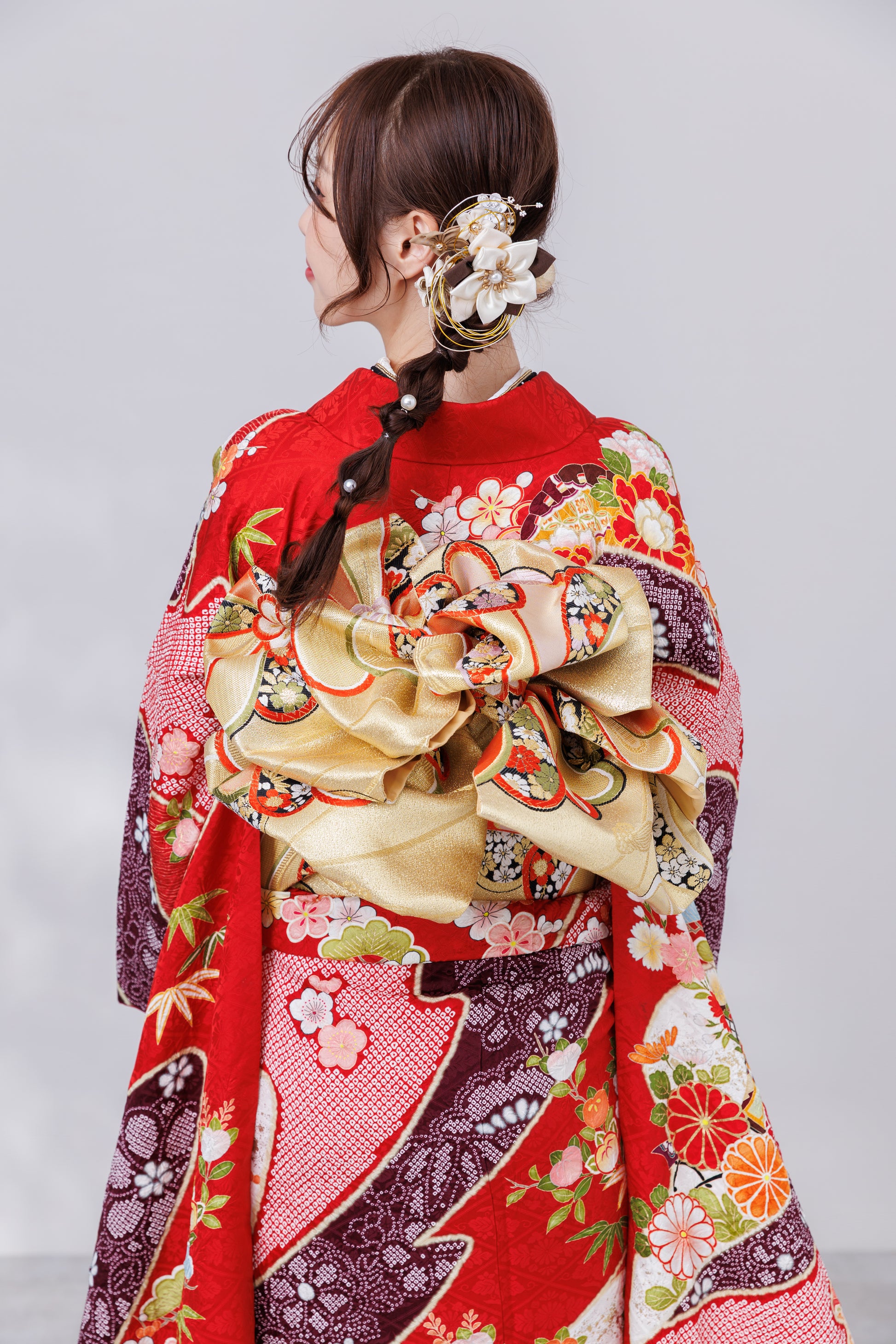 成人式らしい華やかな赤の振袖です。絞りの加工や御所車などの縁起柄が贅沢にあしらわれ、王道ならではの存在感で主役にふさわしい一着です。