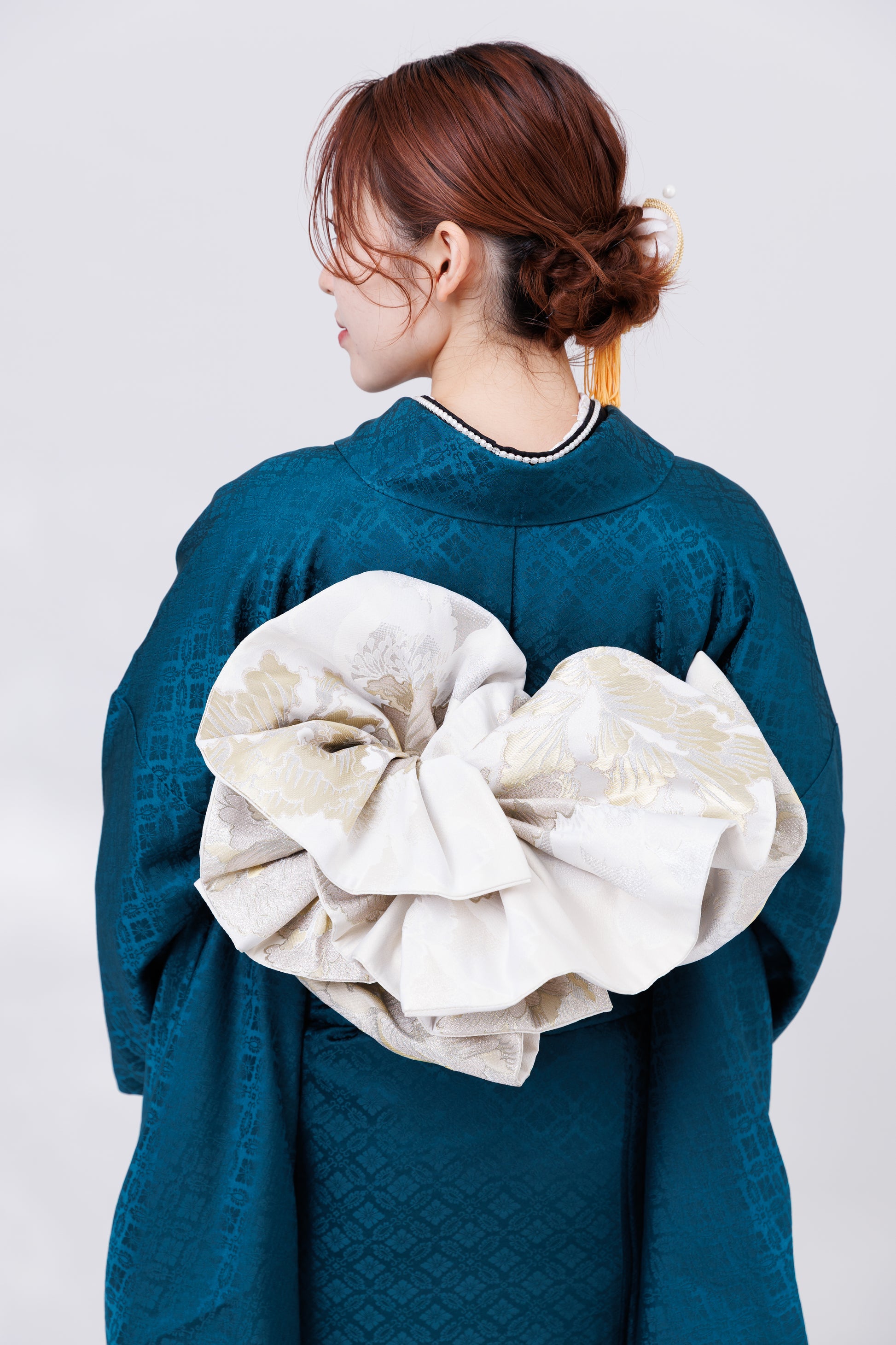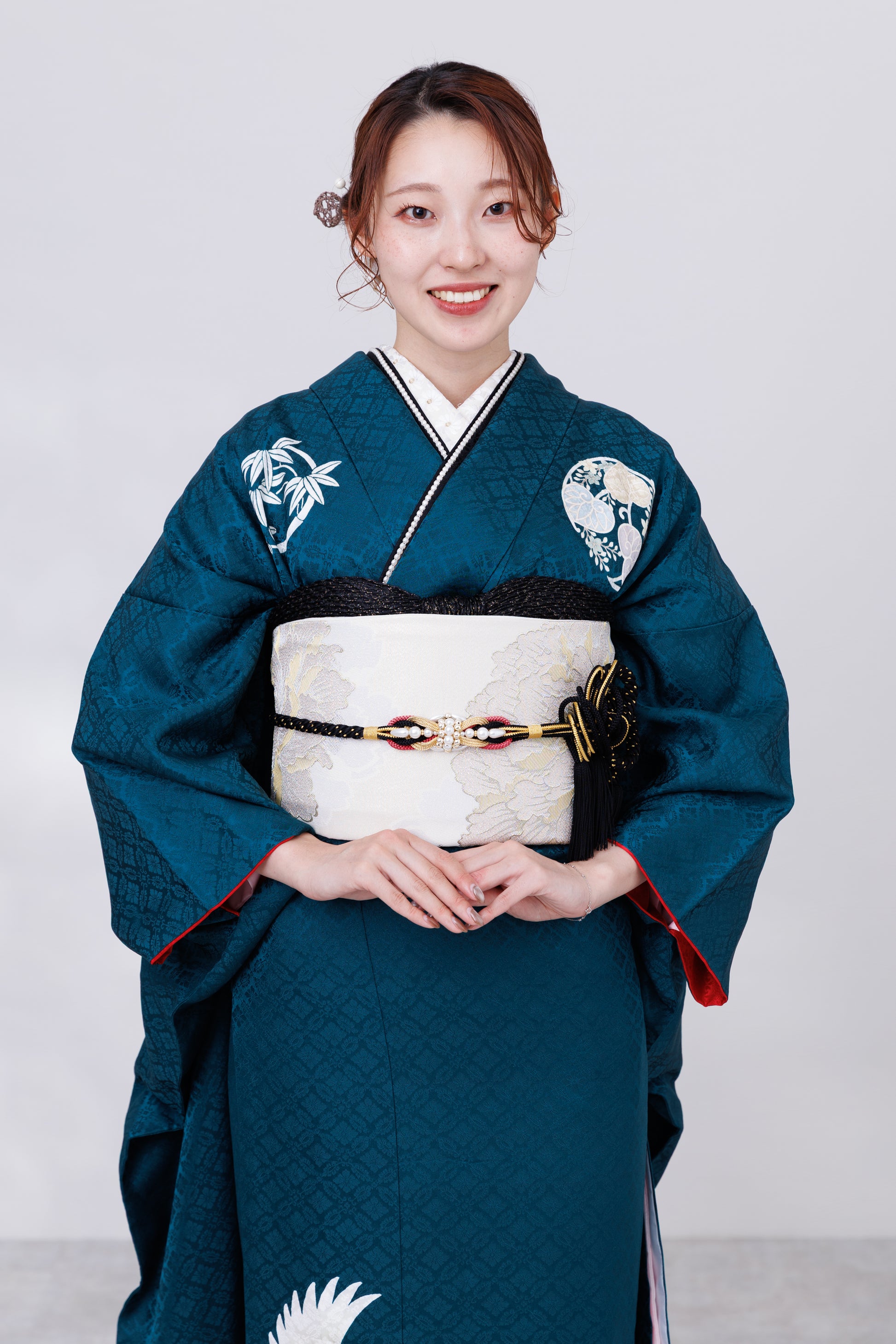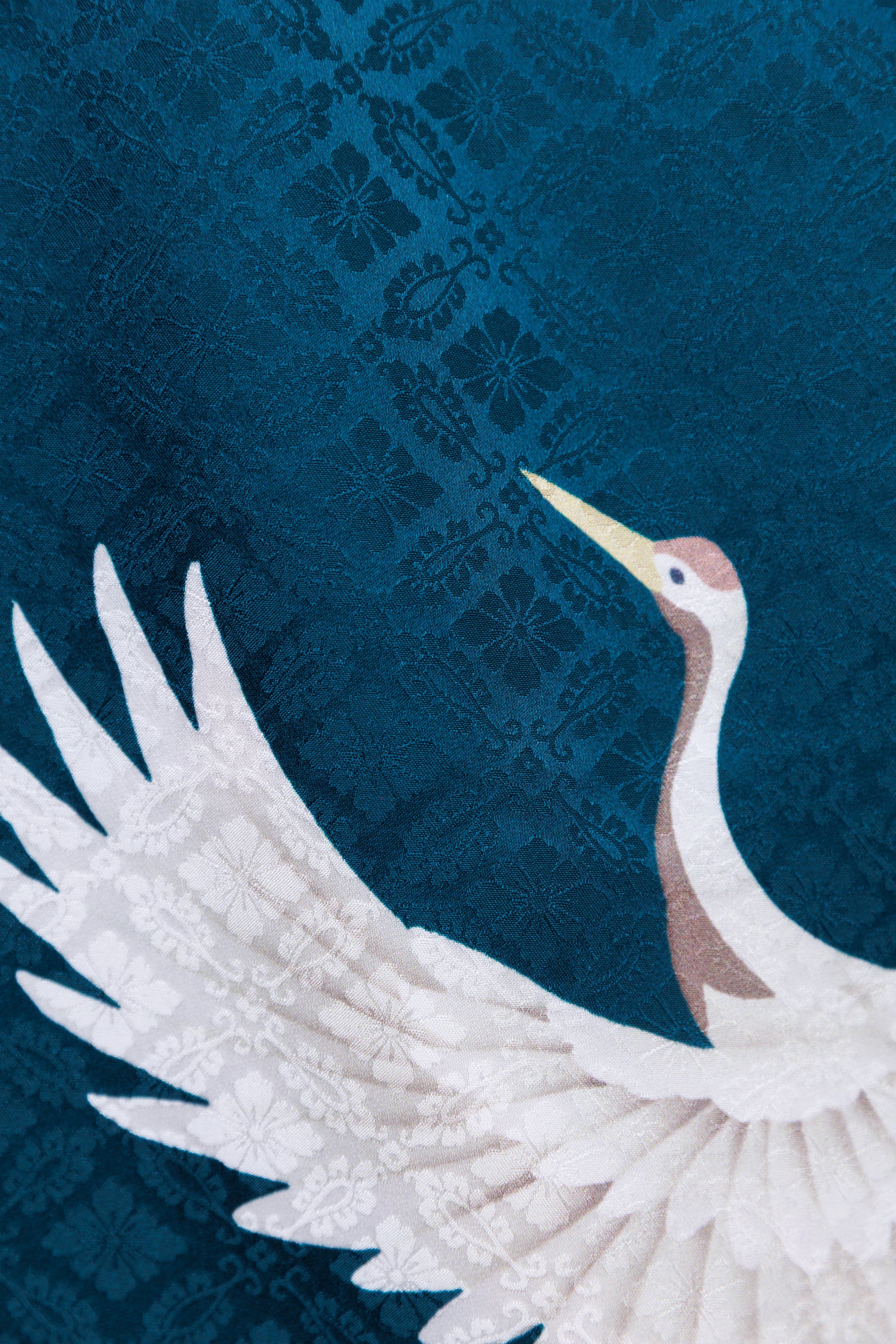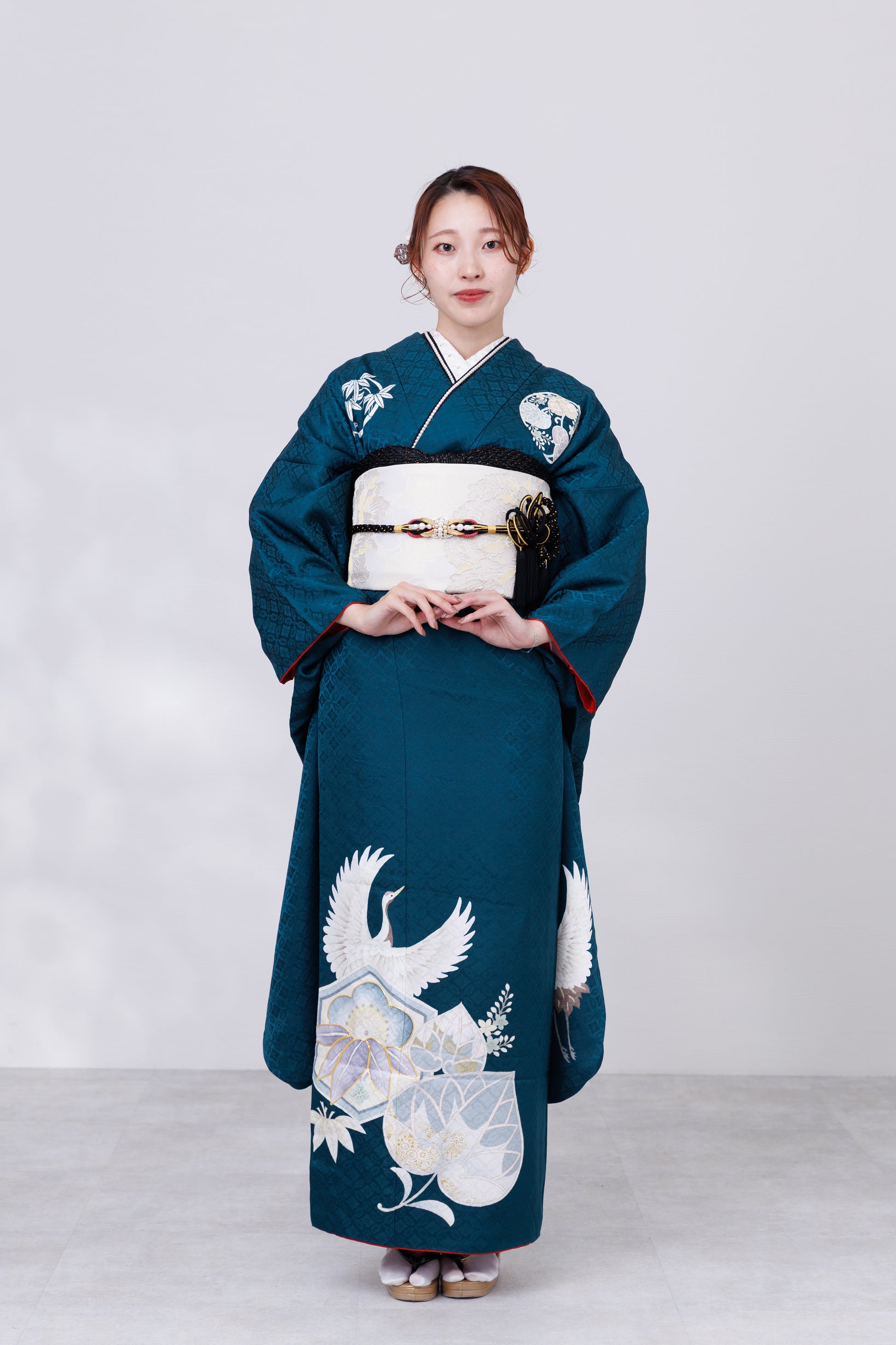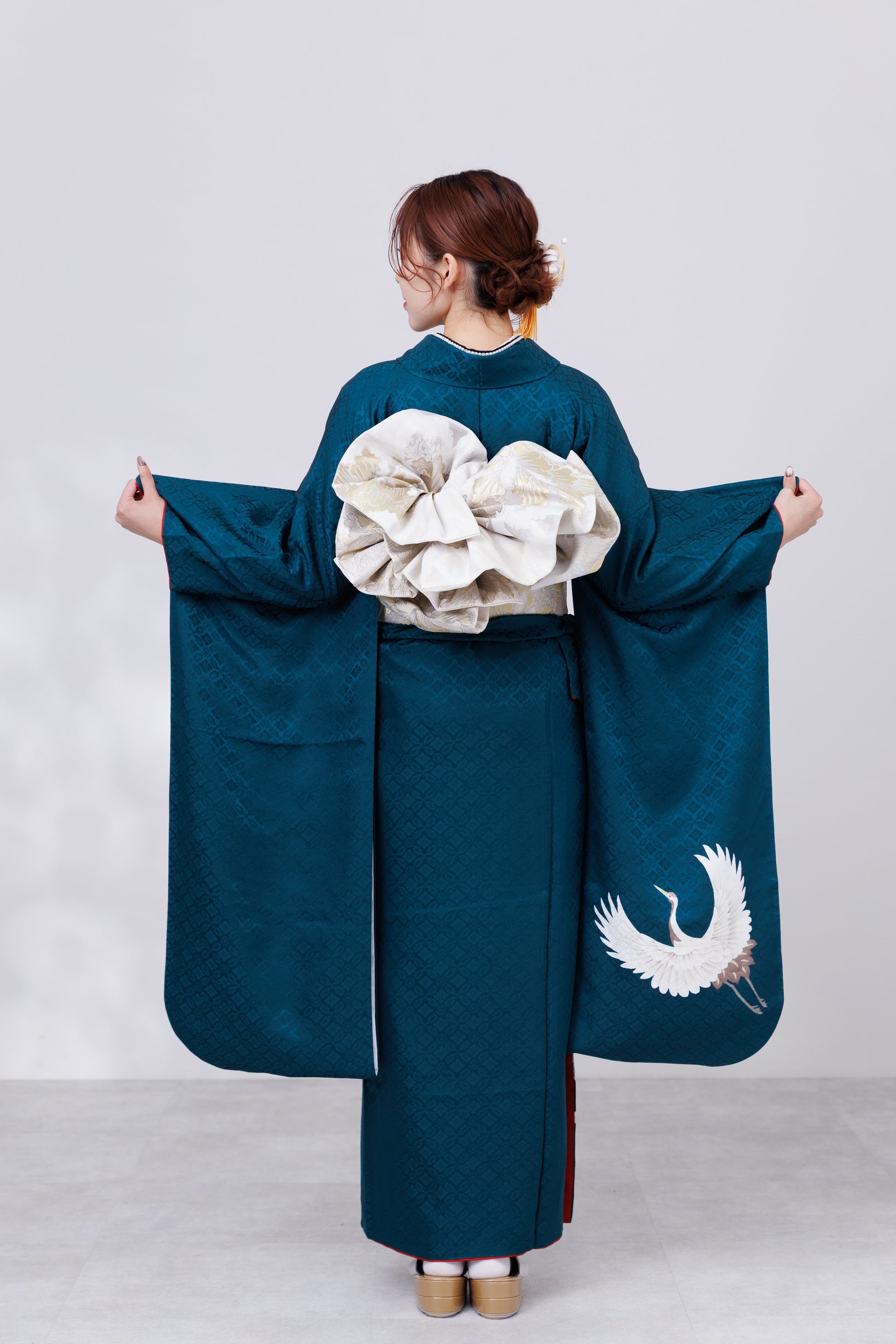 青緑の地に舞う大きな鶴が存在感を放つ一着。清くシンプルなデザインだからこそ、自分だけの楽しみ方が叶う一着です。