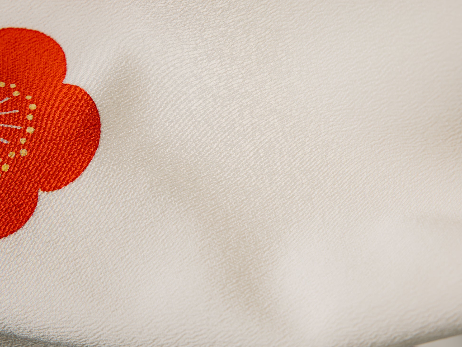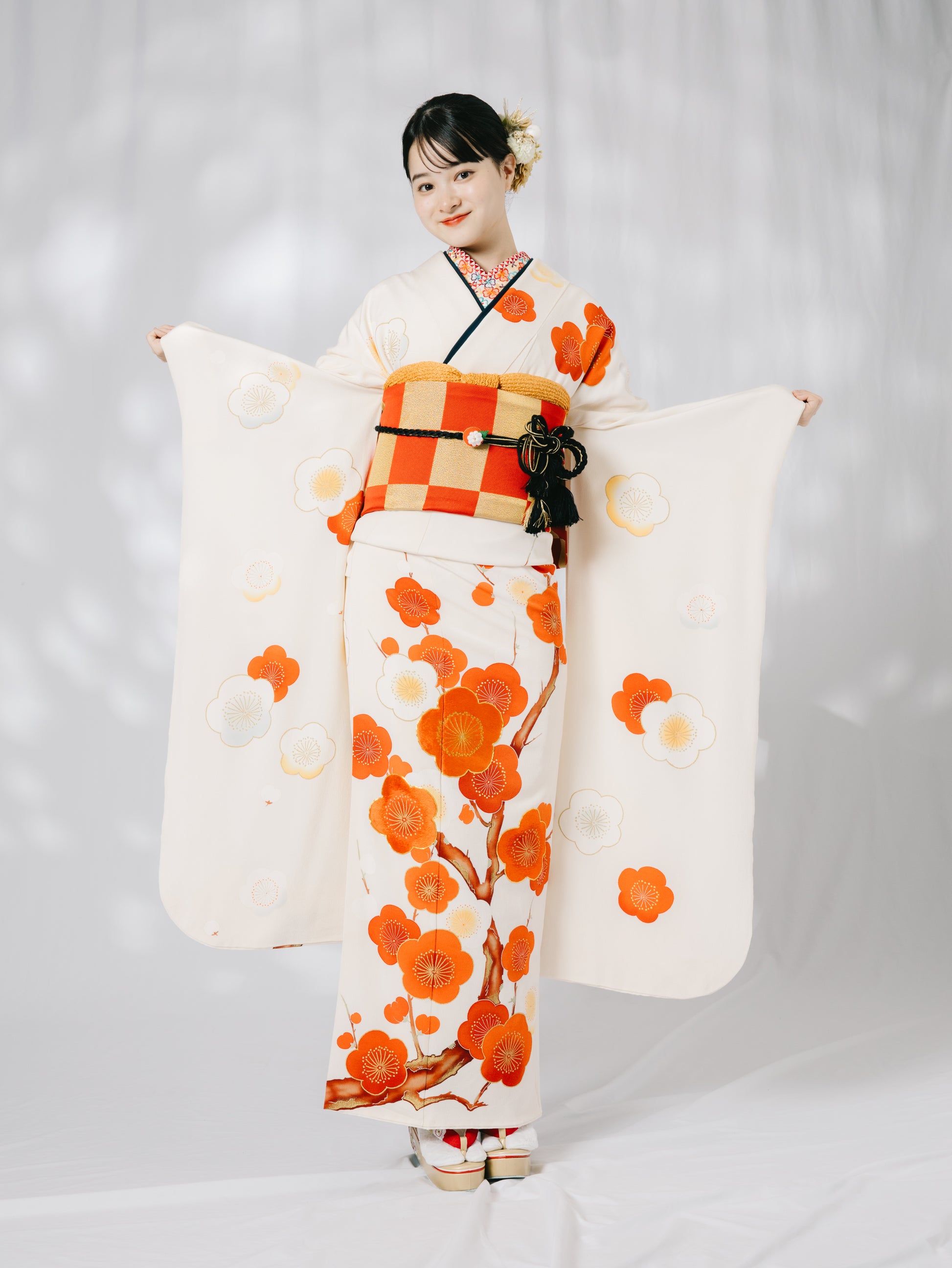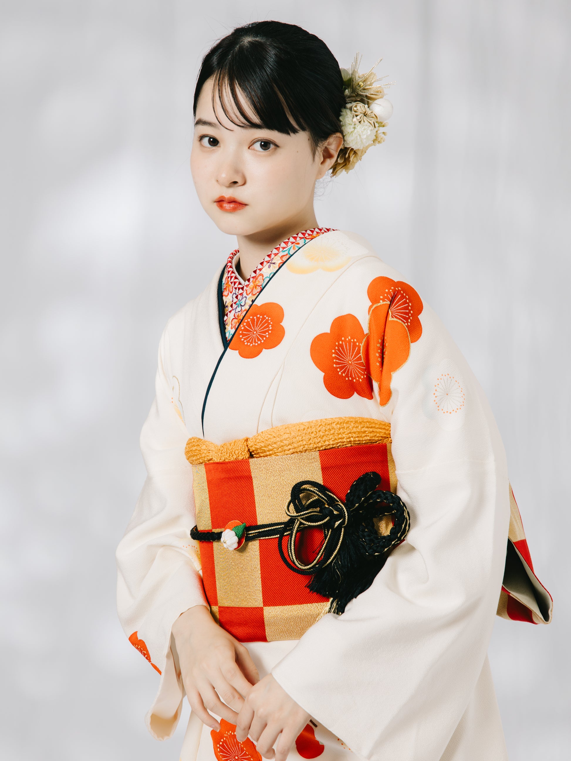 クリーム地に梅の花が散りばめられたシンプルかつ上品な一着。派手すぎない衿元と帯締めで落ち着いたまとまりに。