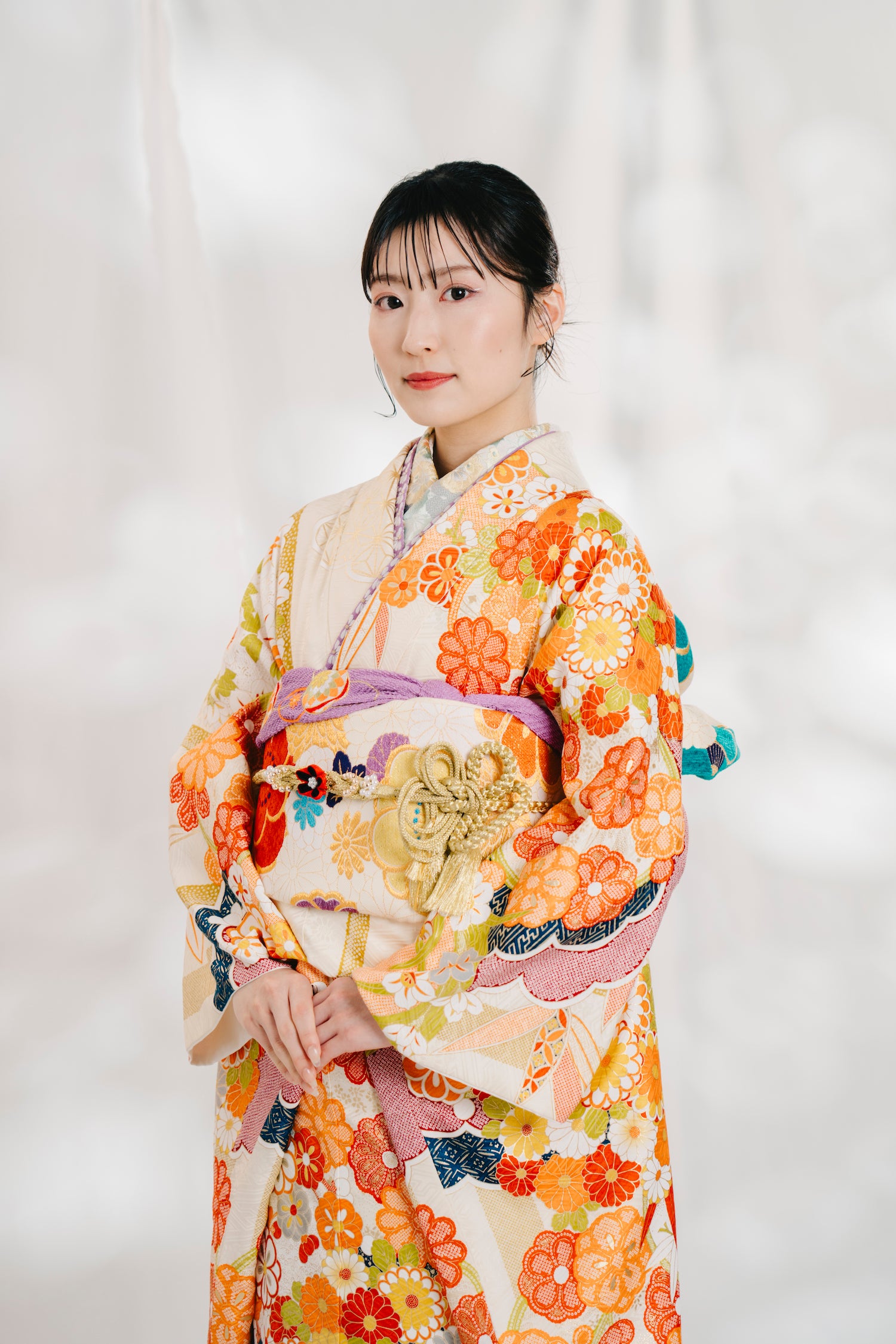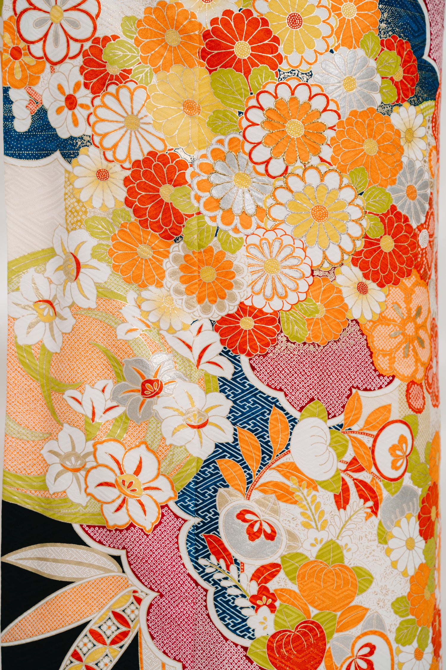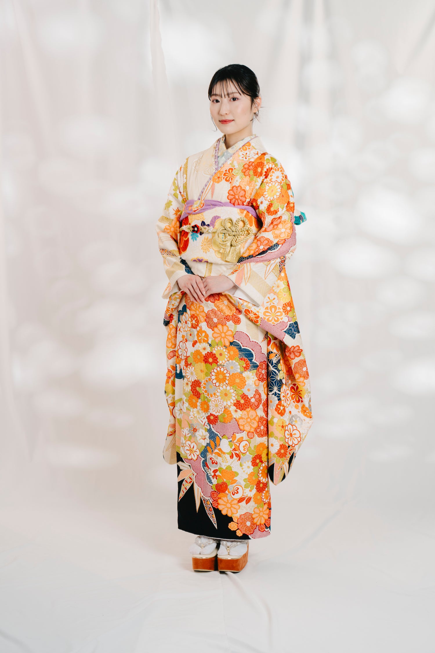 クリーム色に小花柄で描かれた菊柄が美しい一着。裾の黒色や雲どりの紺色がポイントに入った、おしゃれな雰囲気のお着物です。