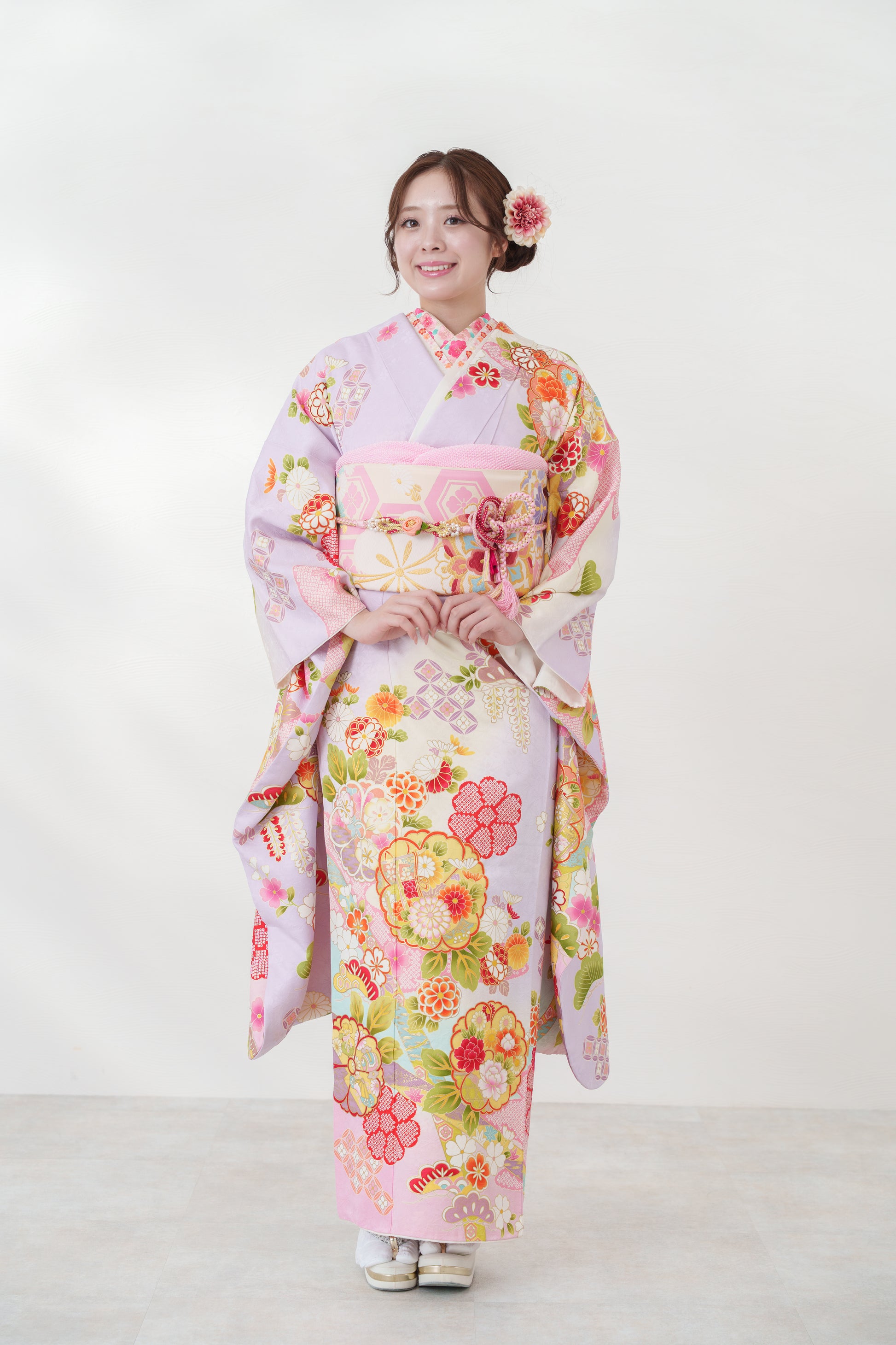 ラベンダー地に様々な花があしらわれた可愛らしい一着。