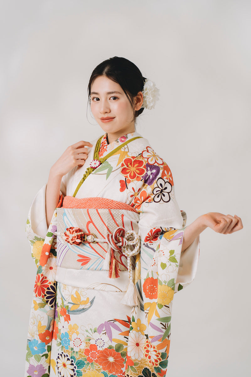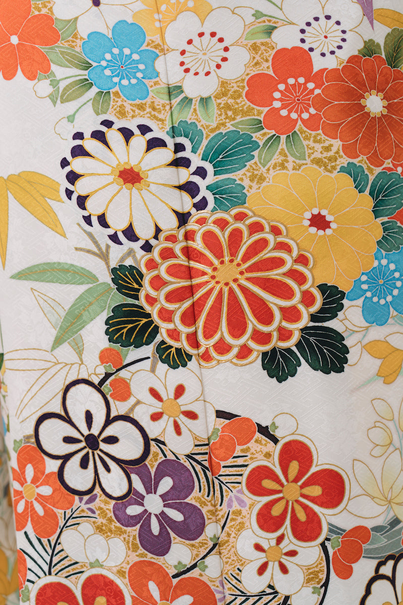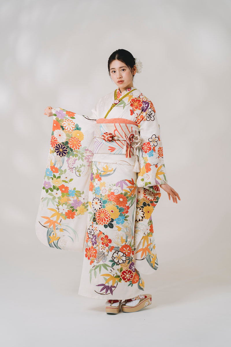 白地に色とりどりに描かれた花々が美しい一着。シルバーの帯で色味をまとめて上品な印象に
