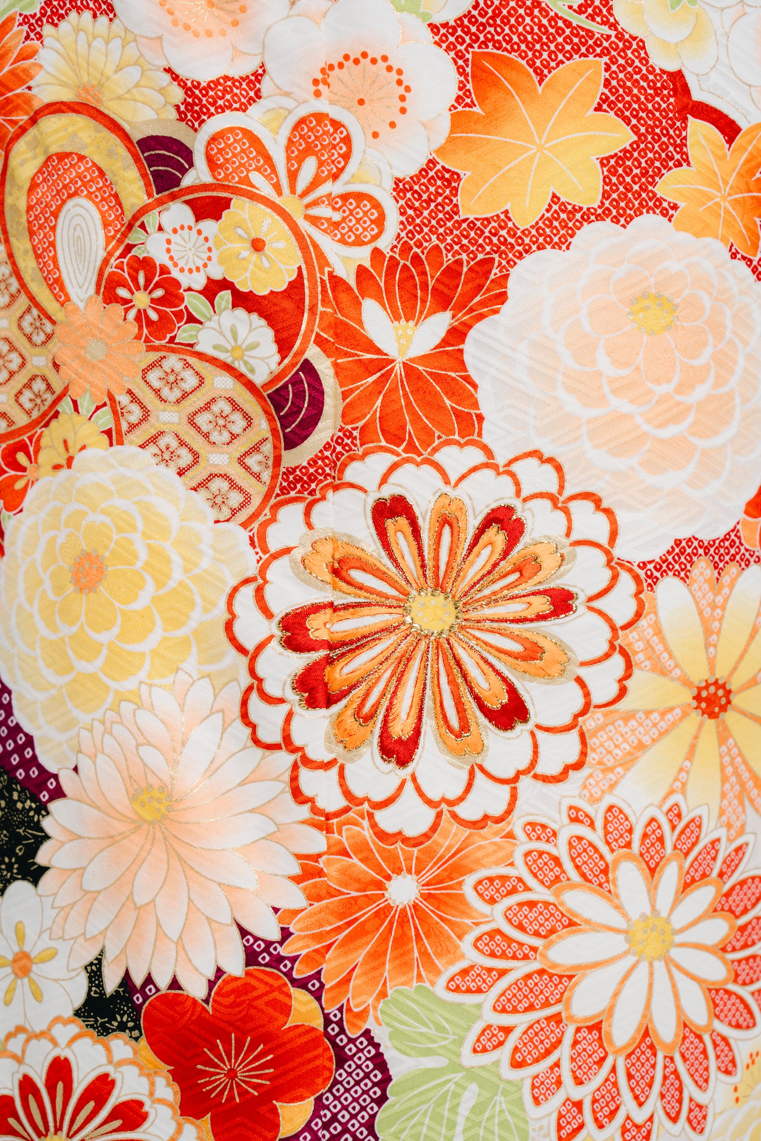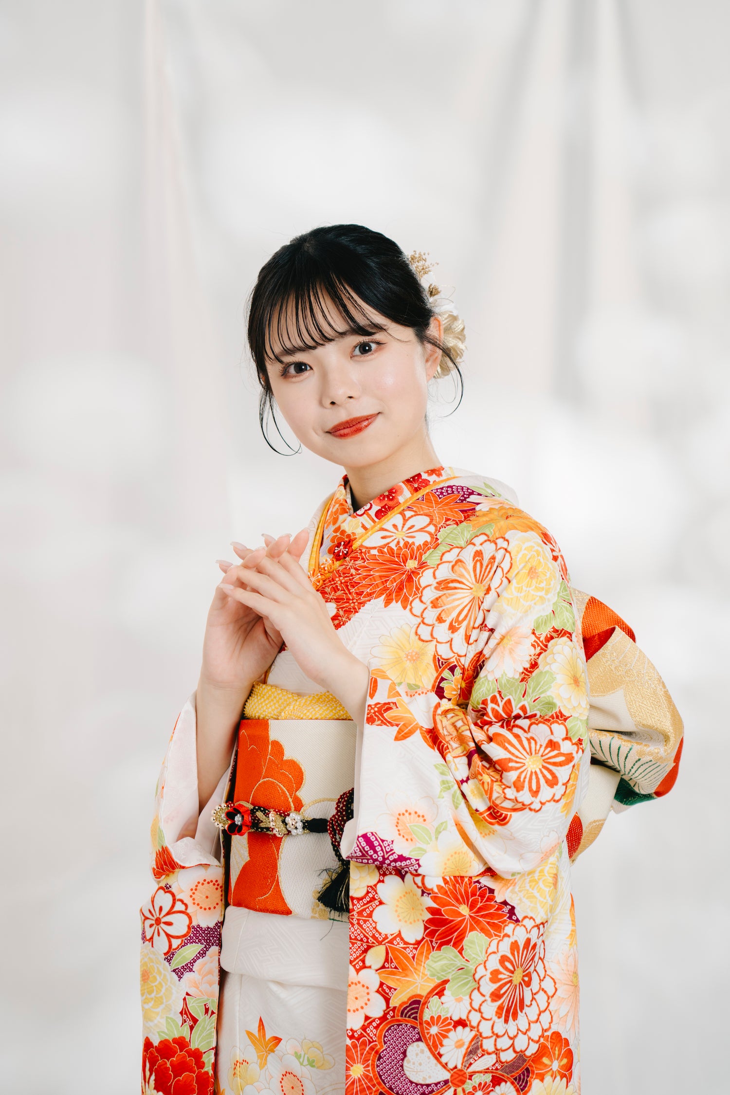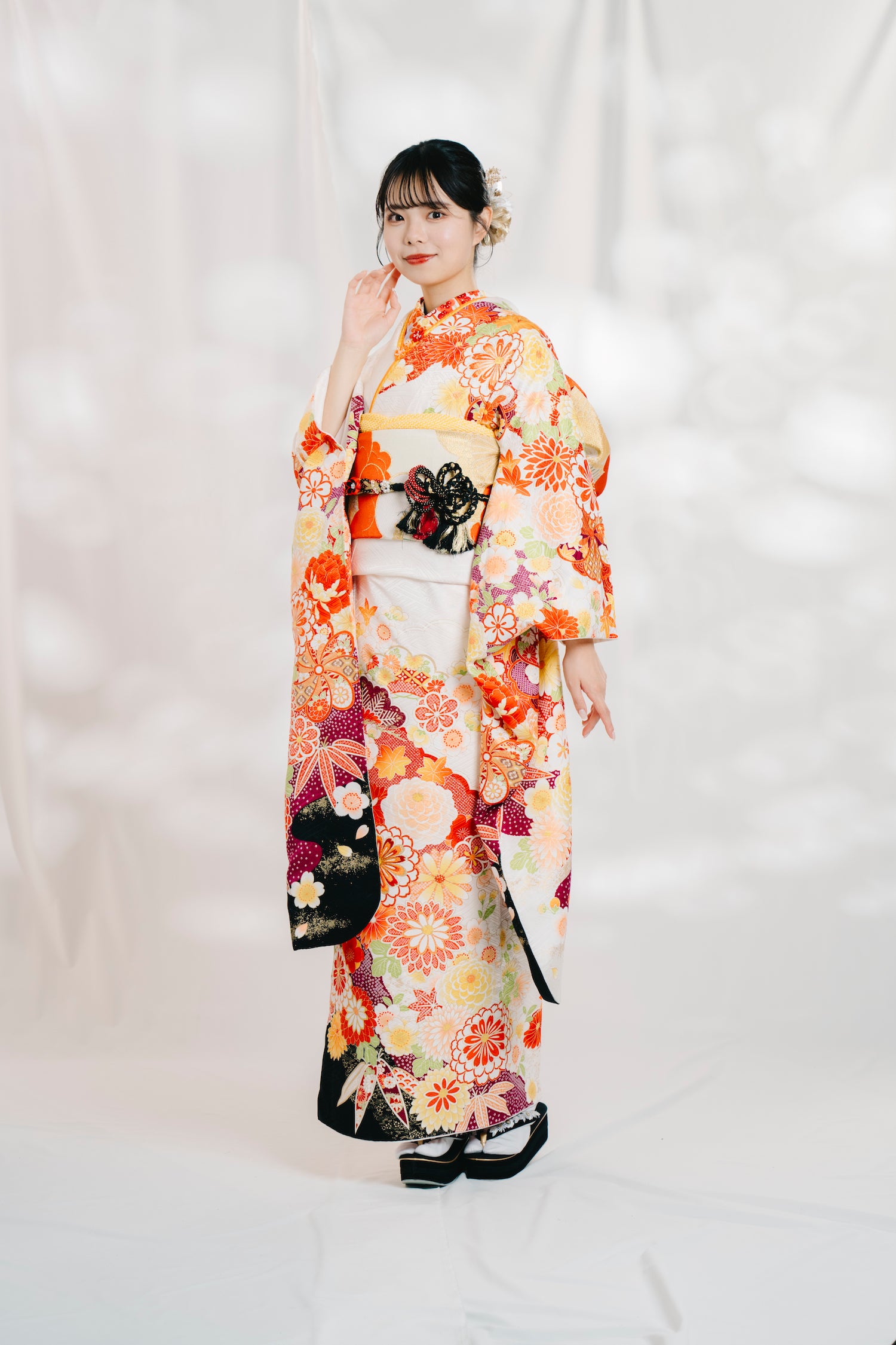 白地に裾の黒が印象的なお着物。オレンジで描かれたお花が可愛らしい印象に。