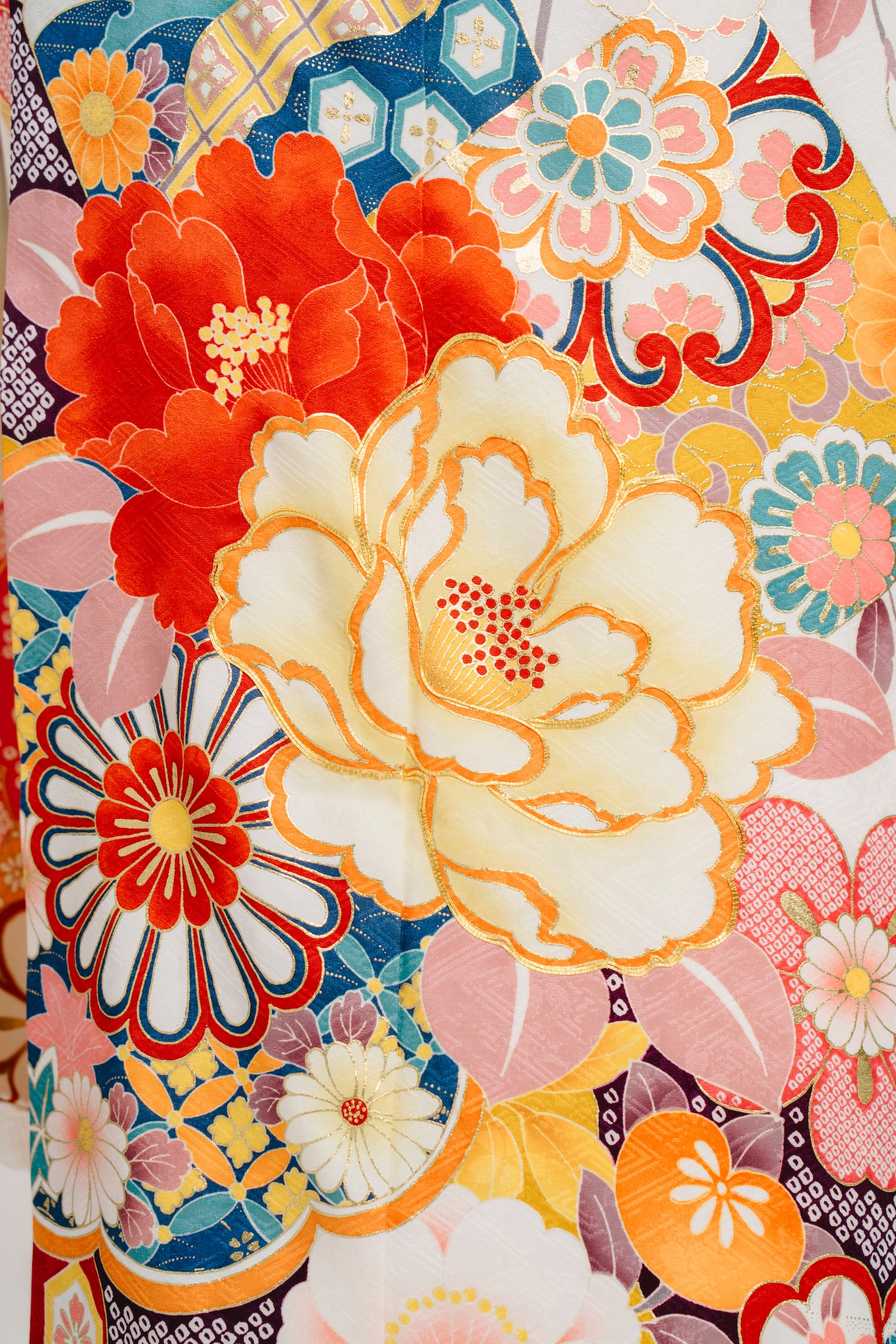 白地に裾の赤色が印象的なお着物。白や赤で描かれた牡丹のお花が美しい印象に。