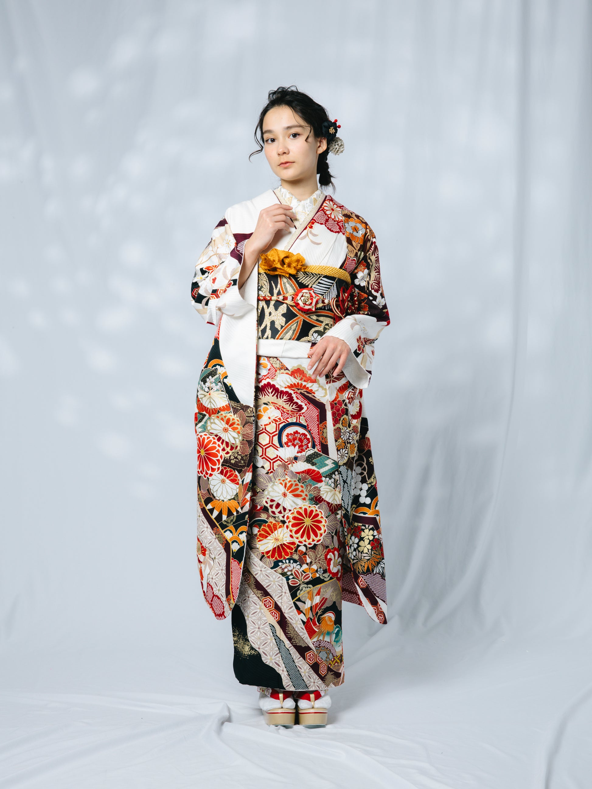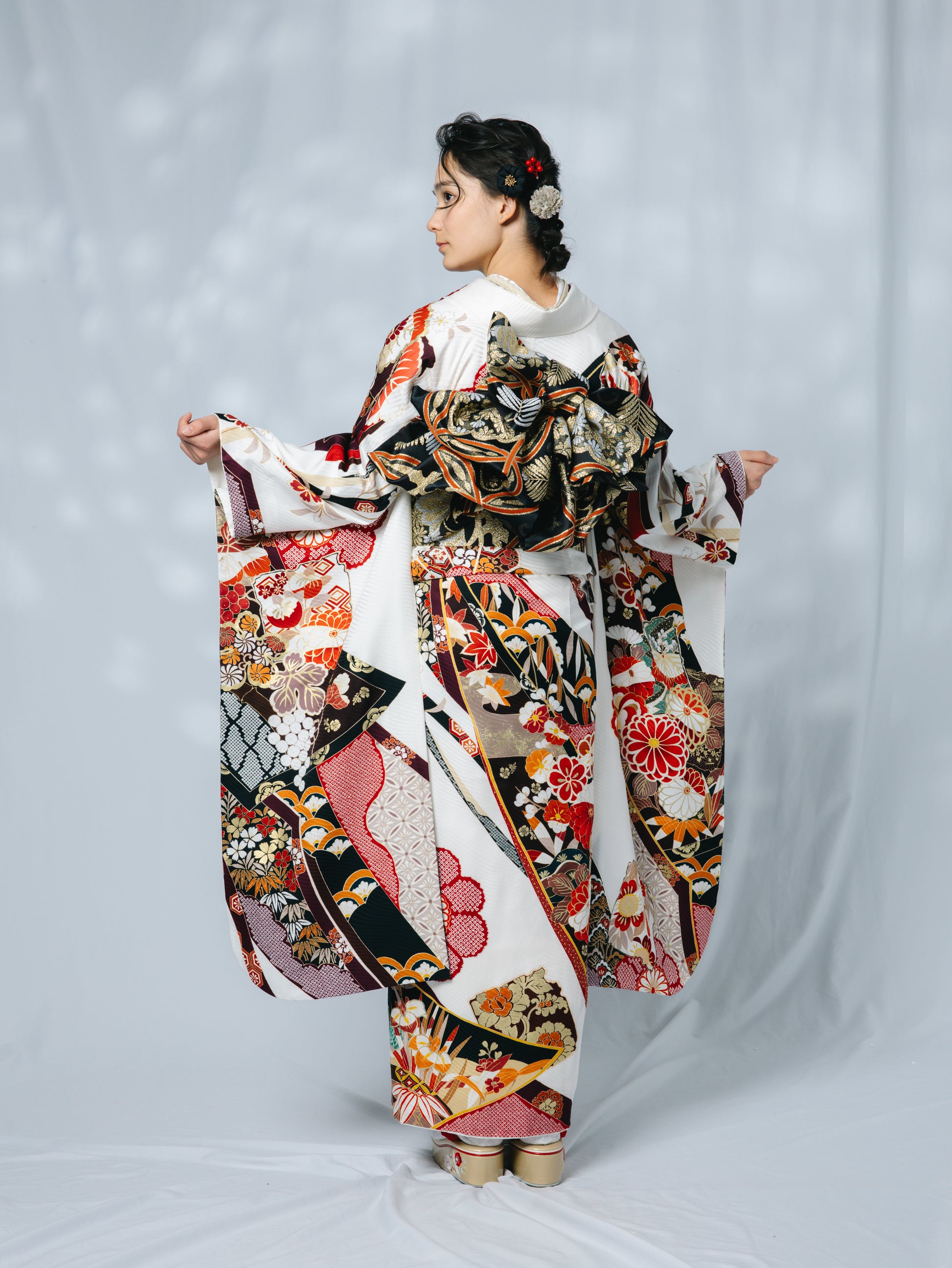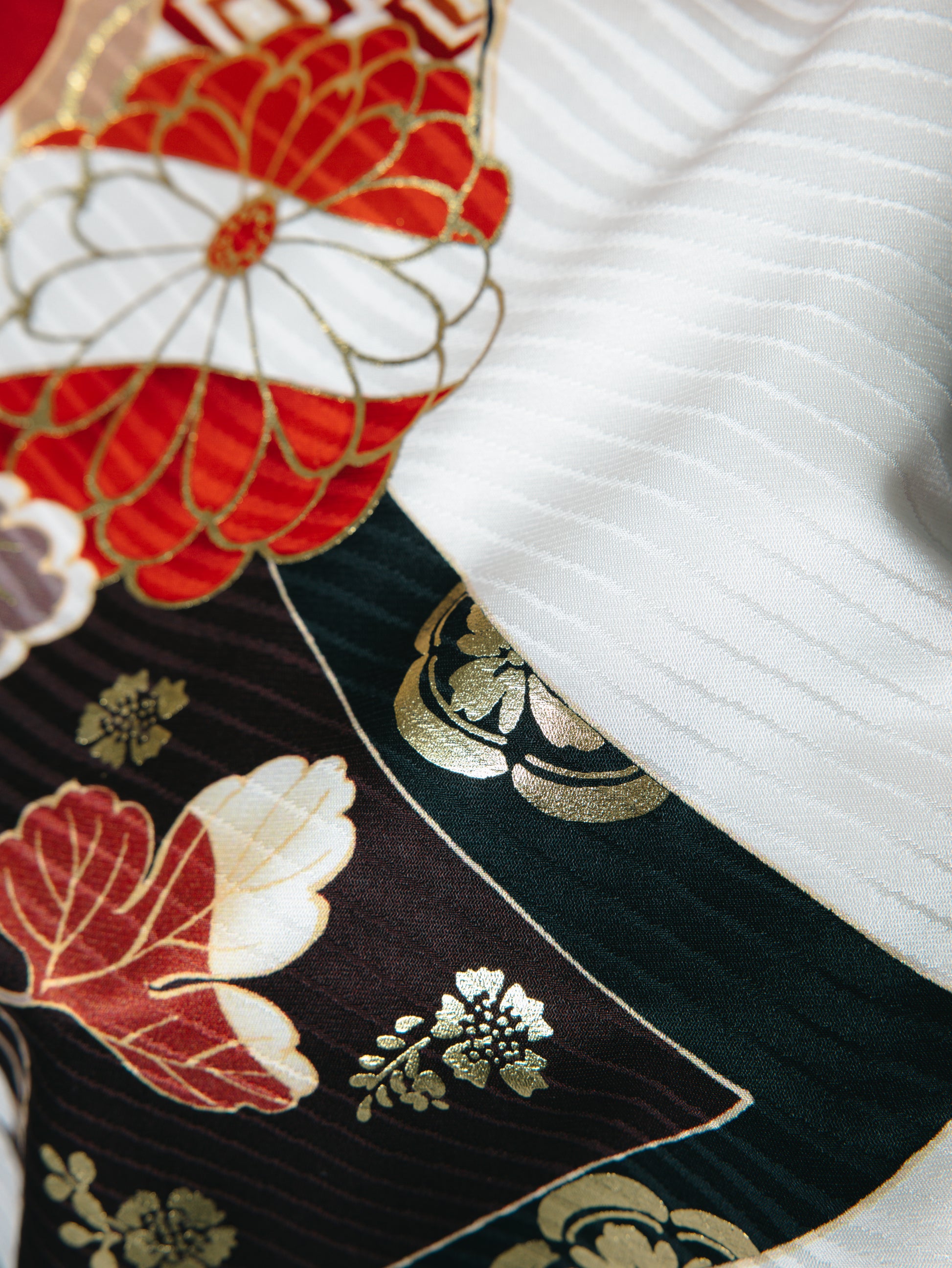 白地に落ち着いた色味で描かれた菊や熨斗柄が上品で美しい一着
