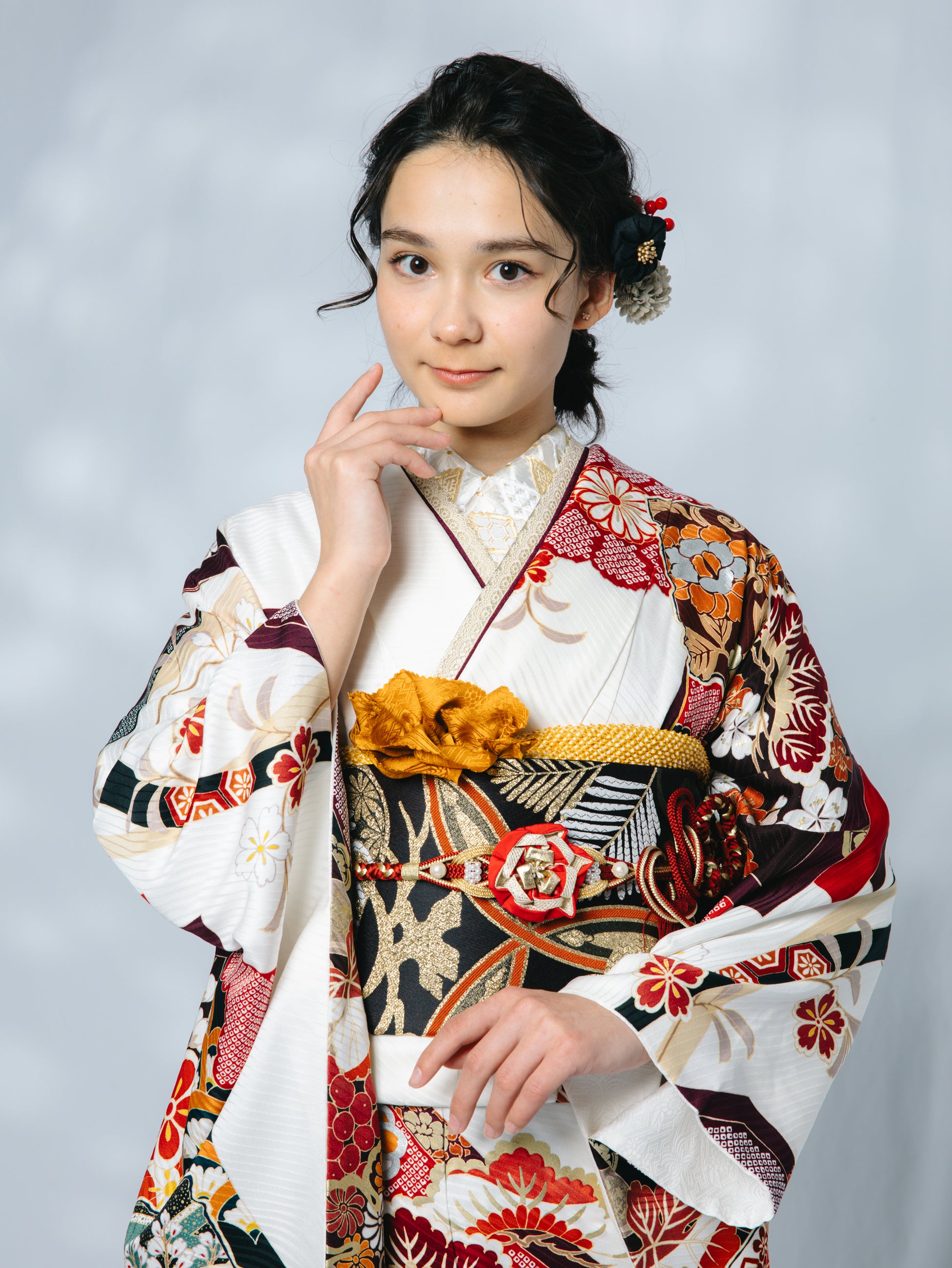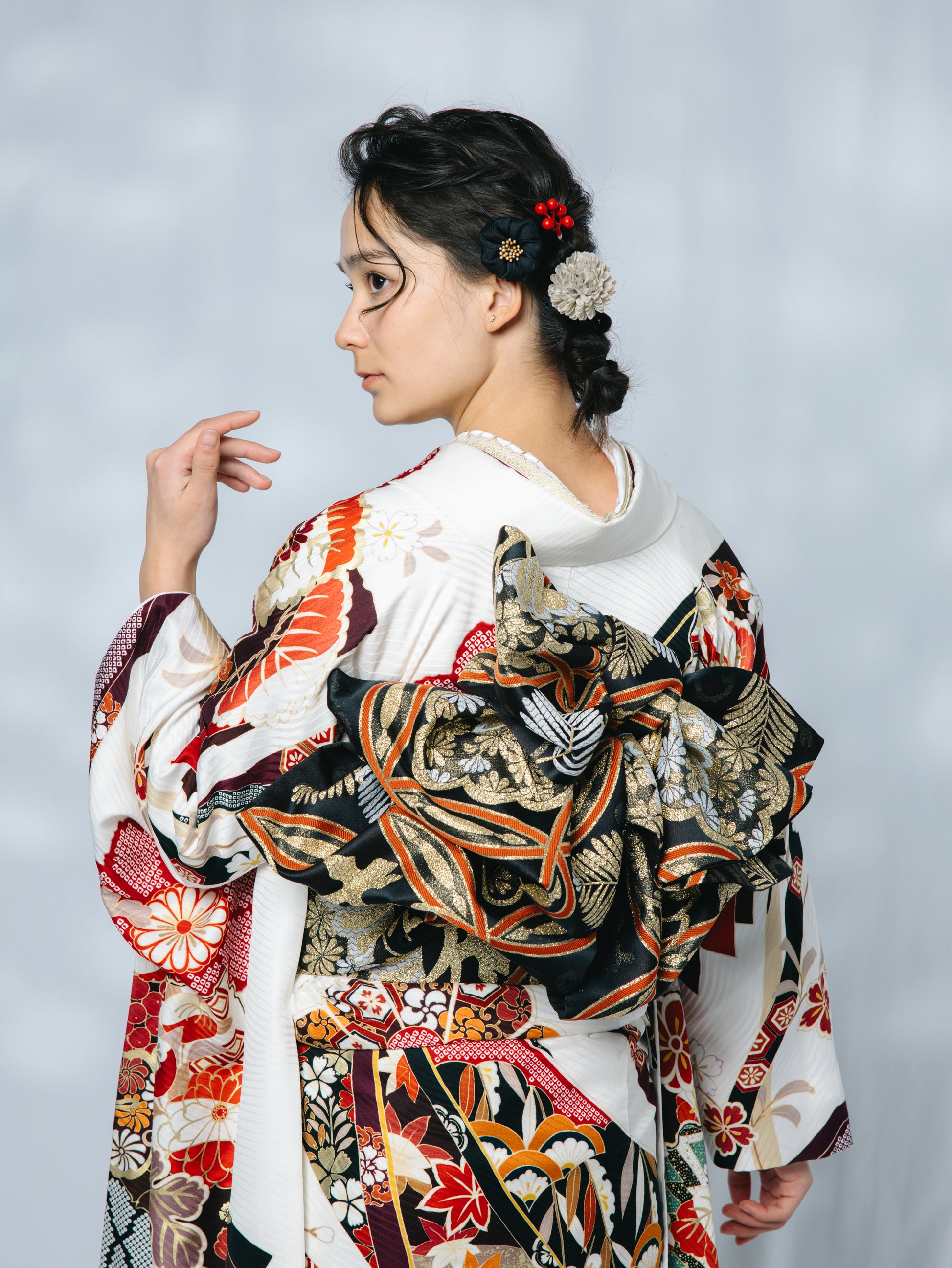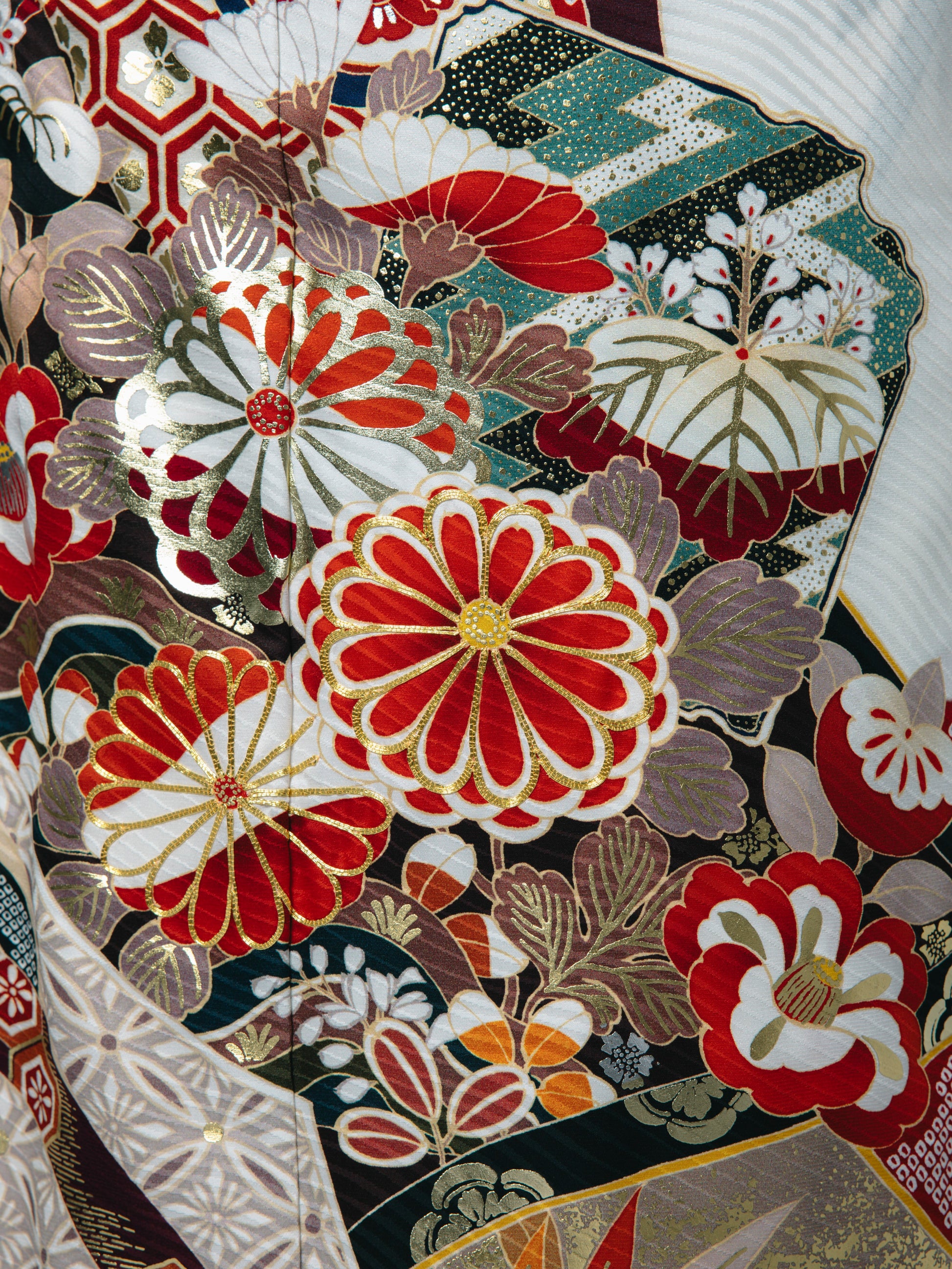 白地に落ち着いた色味で描かれた菊や熨斗柄が上品で美しい一着