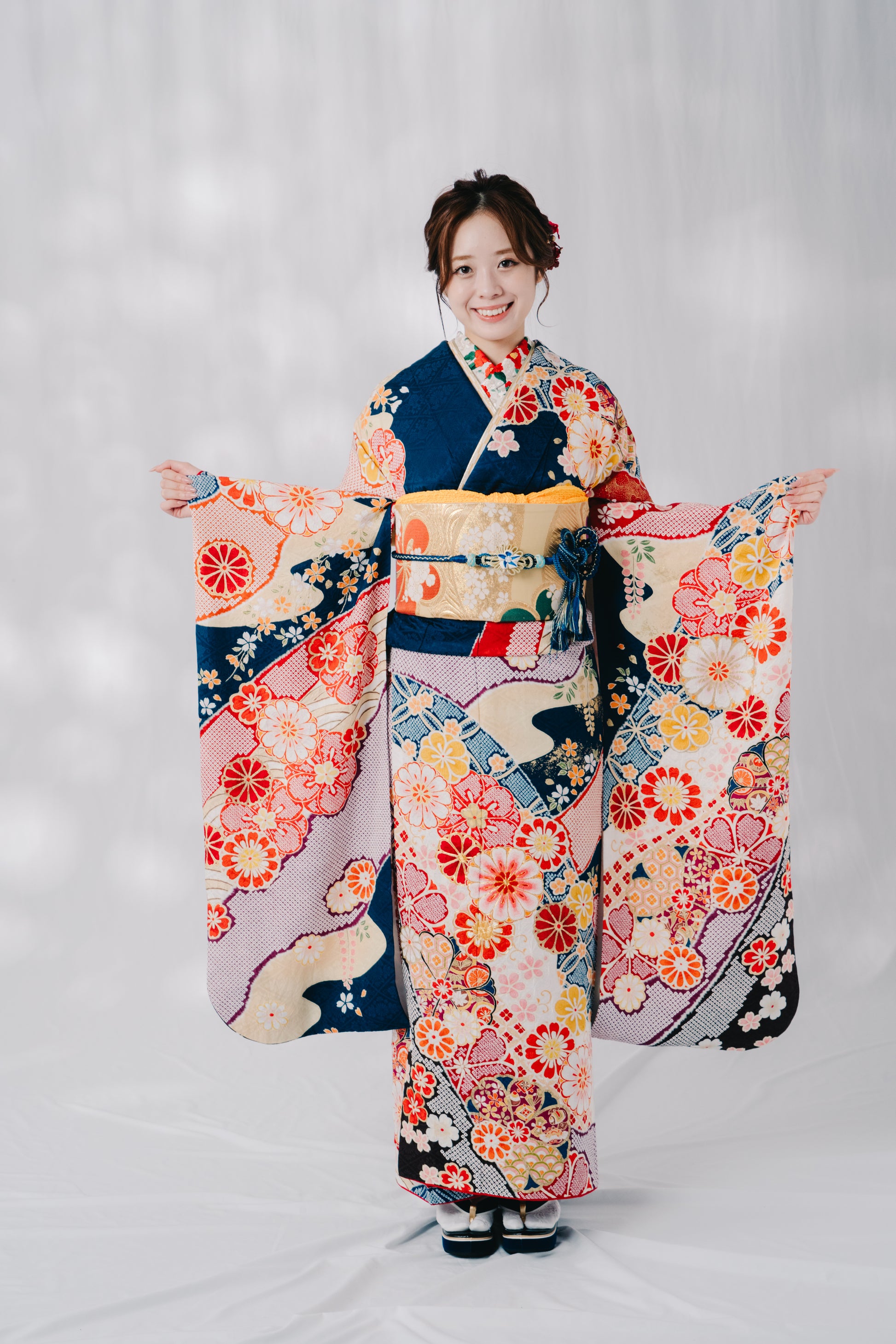 紺地に絞りや金彩加工が多く入った豪華絢爛な1着。ゴールドの帯を使ってさらに豪華に