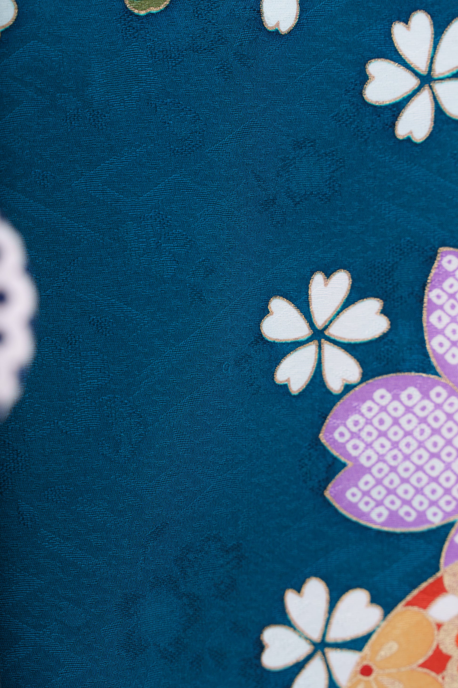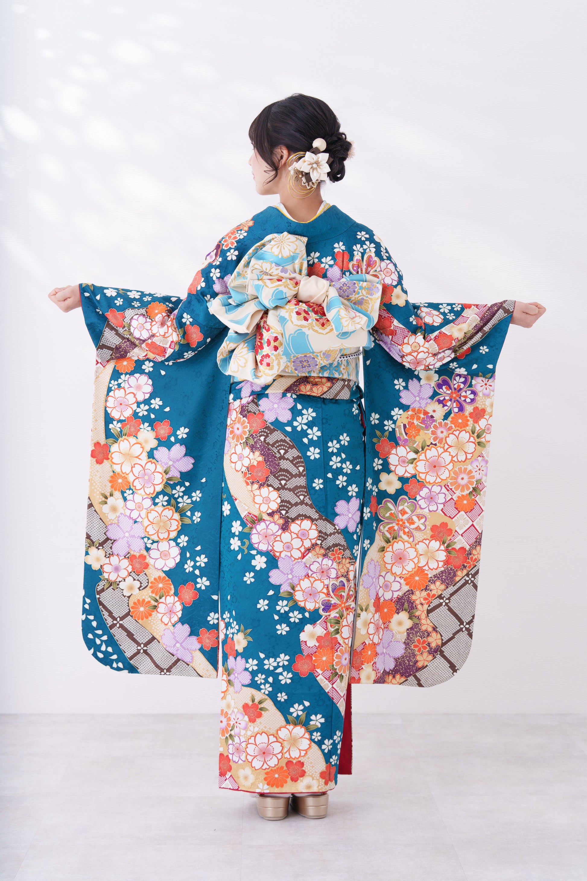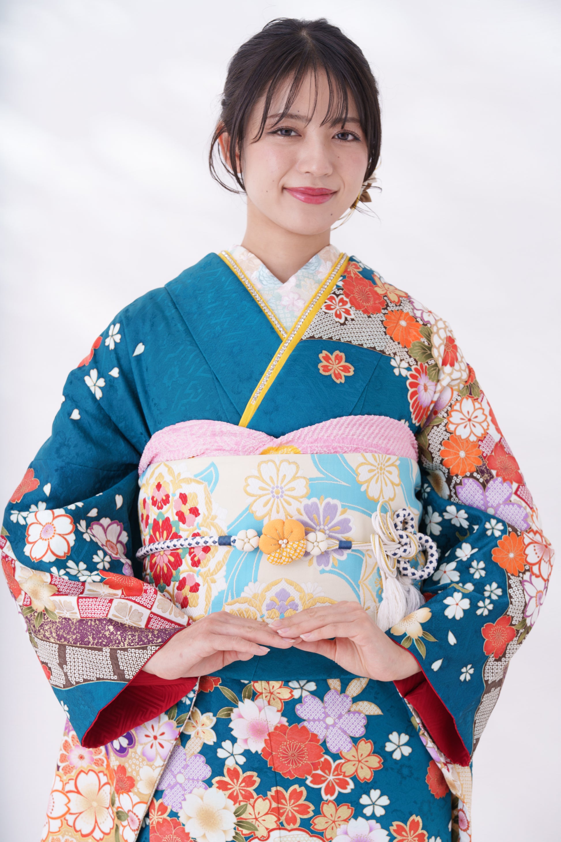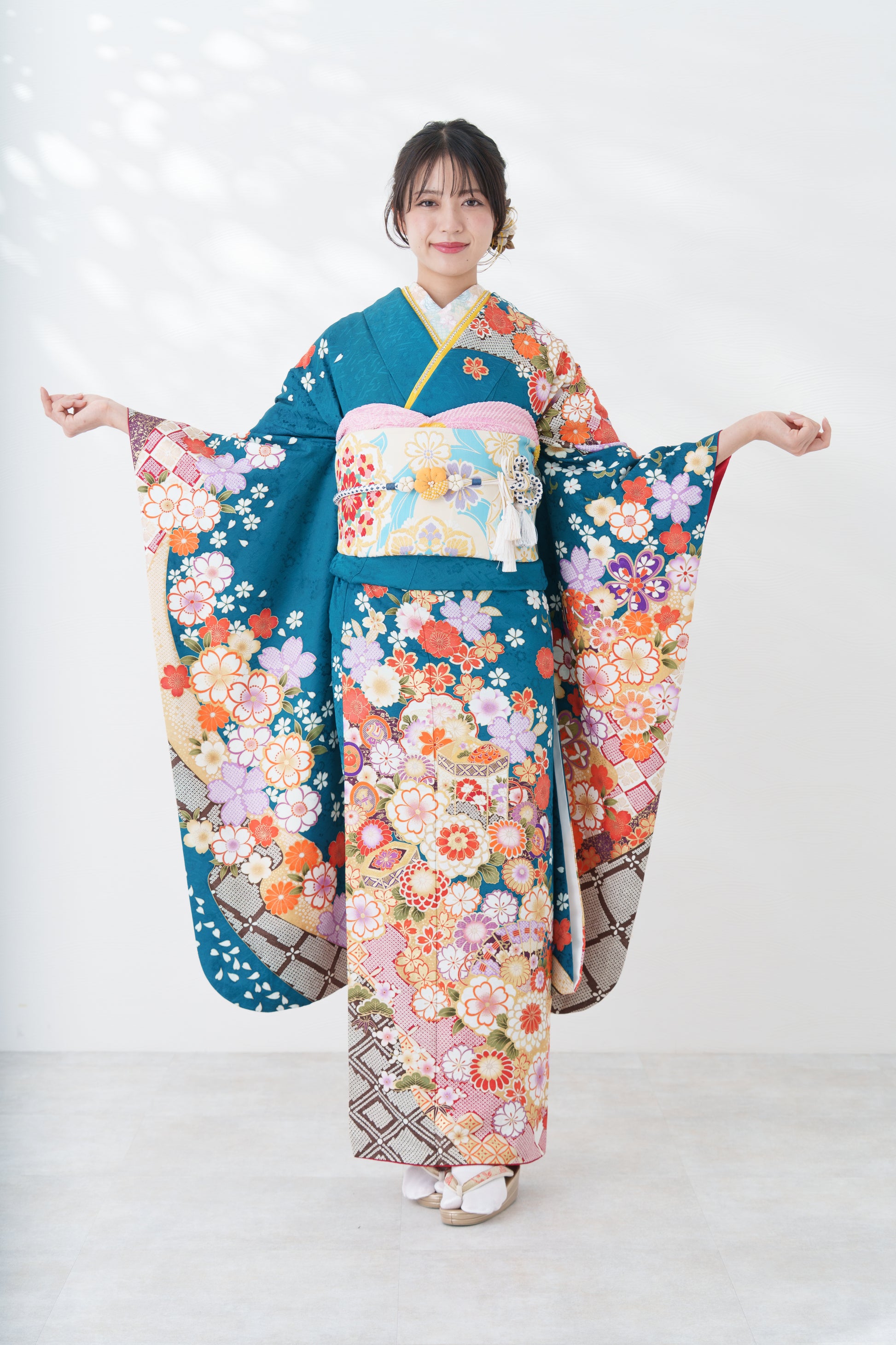 珍しい青緑のが鮮やかな一着。成人式らしい小物合わせで華やかに。