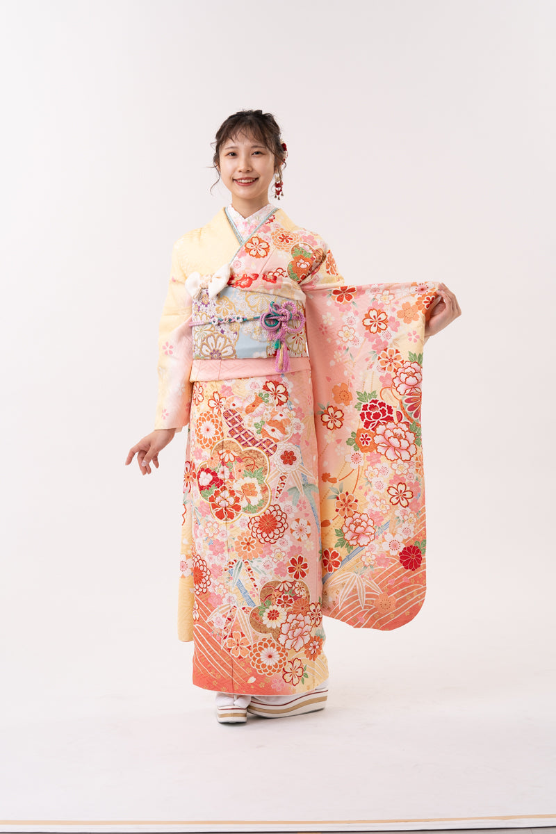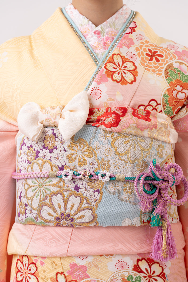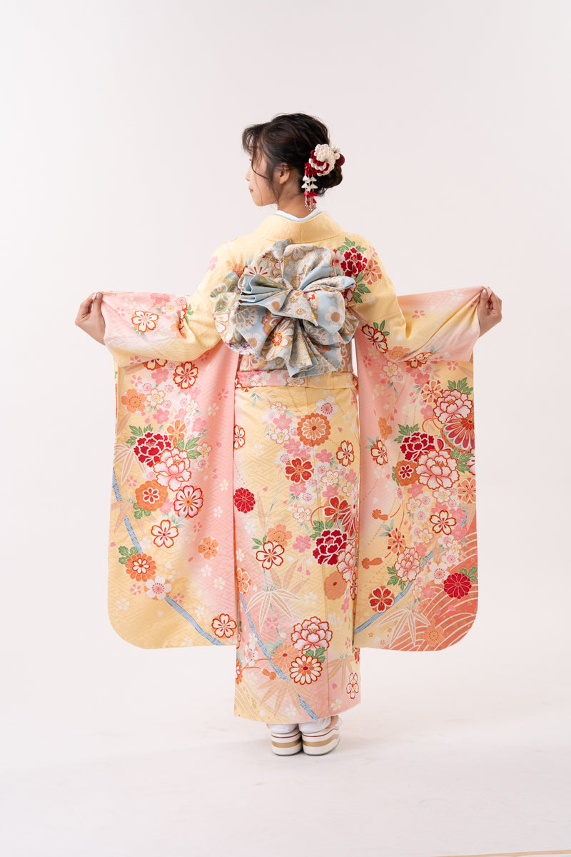 淡い黄色に水色の小物合わせが美しい振袖です。衿元のストーンが華やかな印象です。