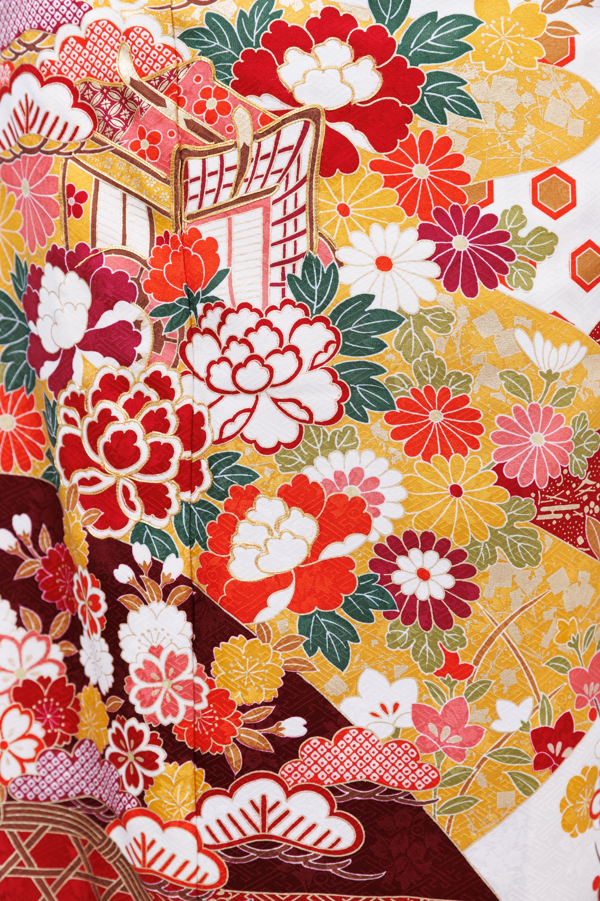 牡丹や菊が全面に咲き誇り、どの角度から見ても美しいです。