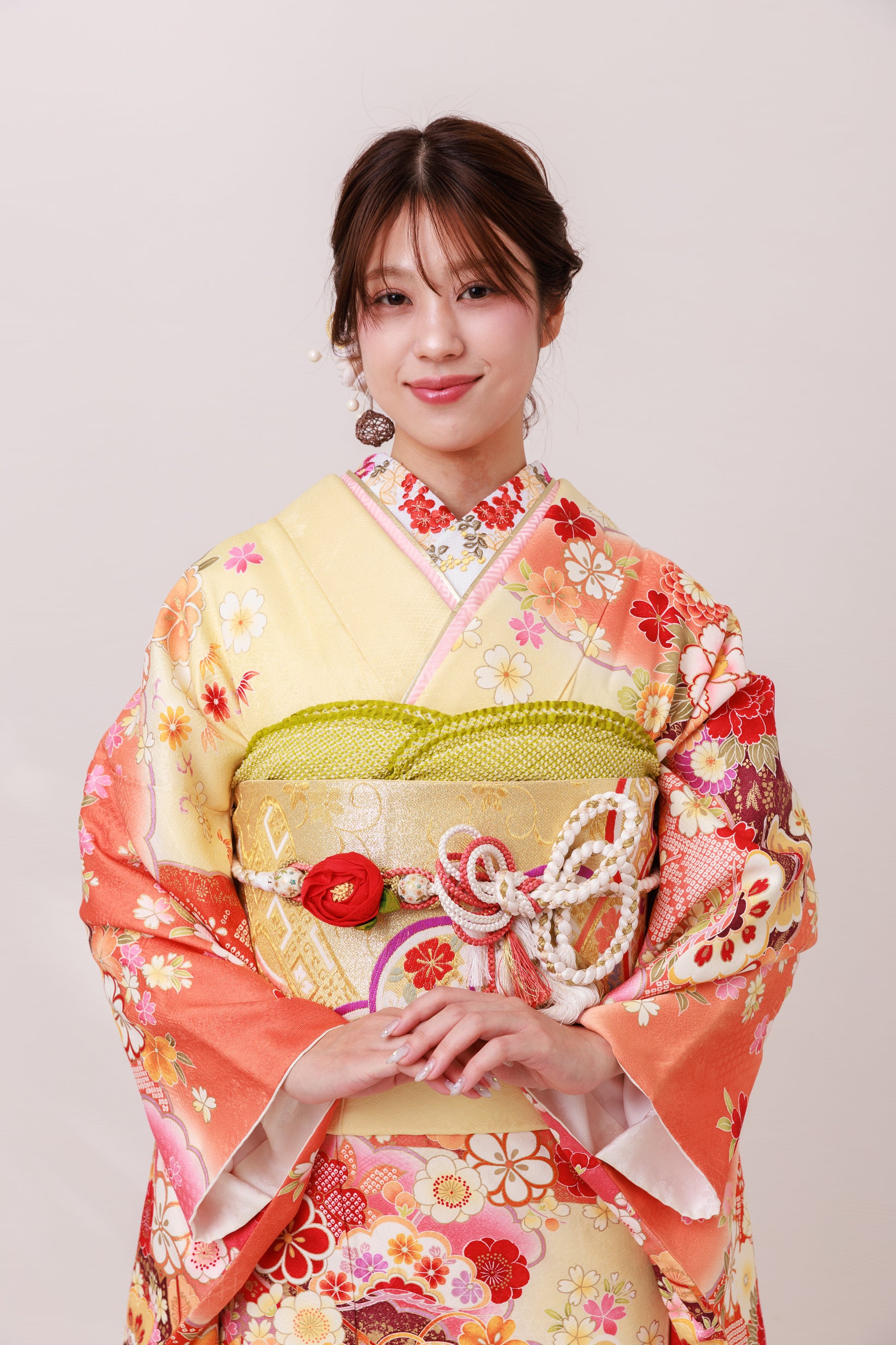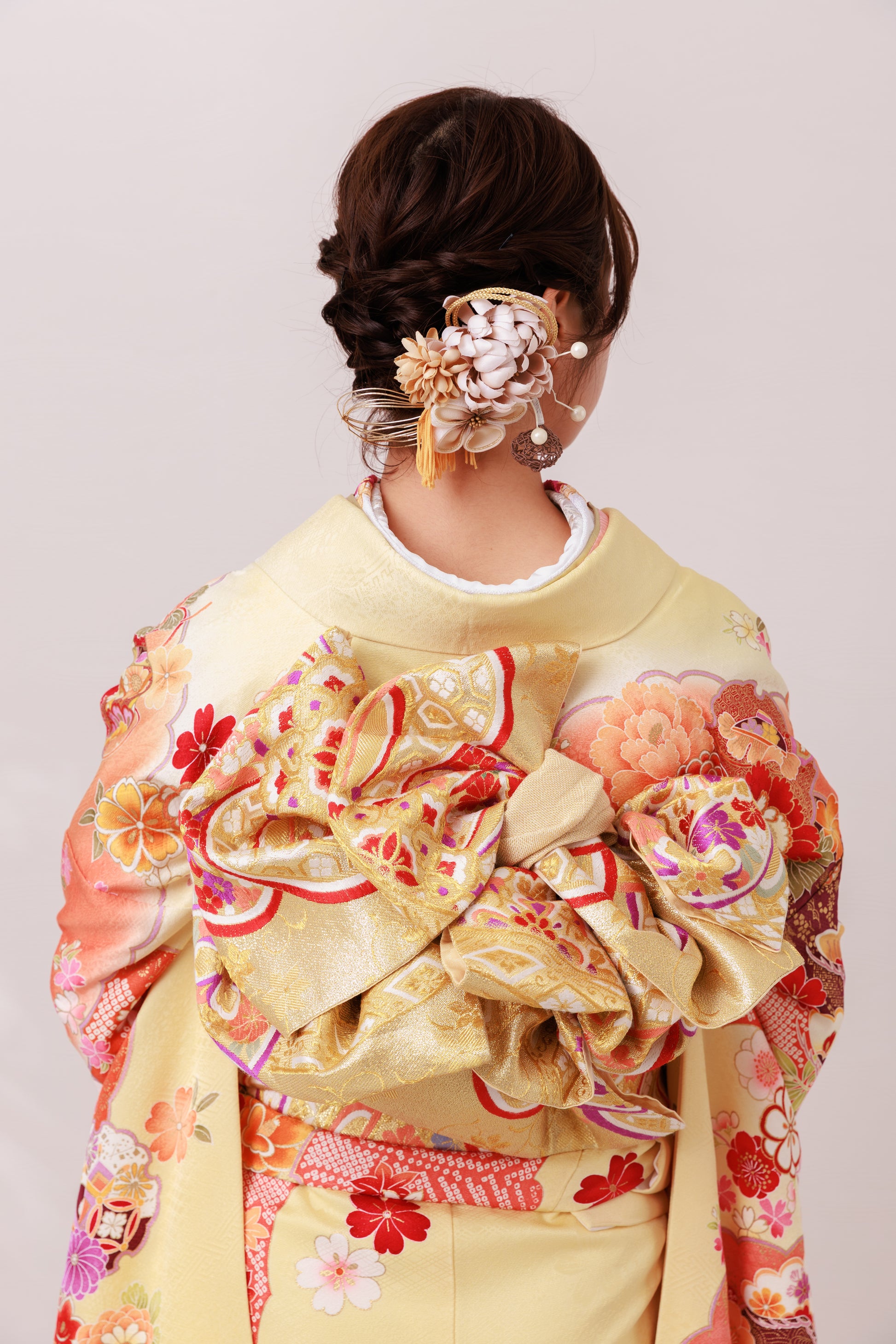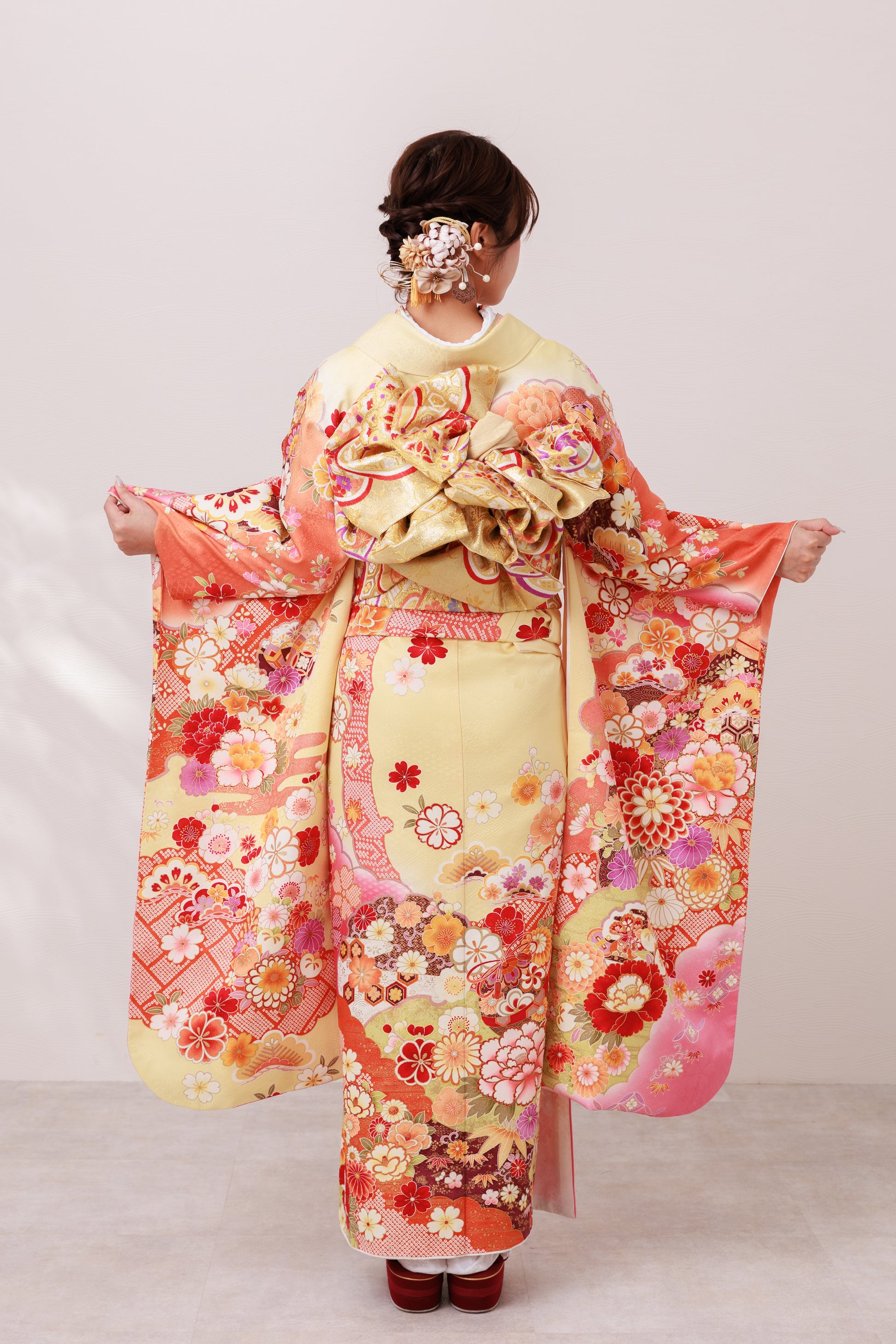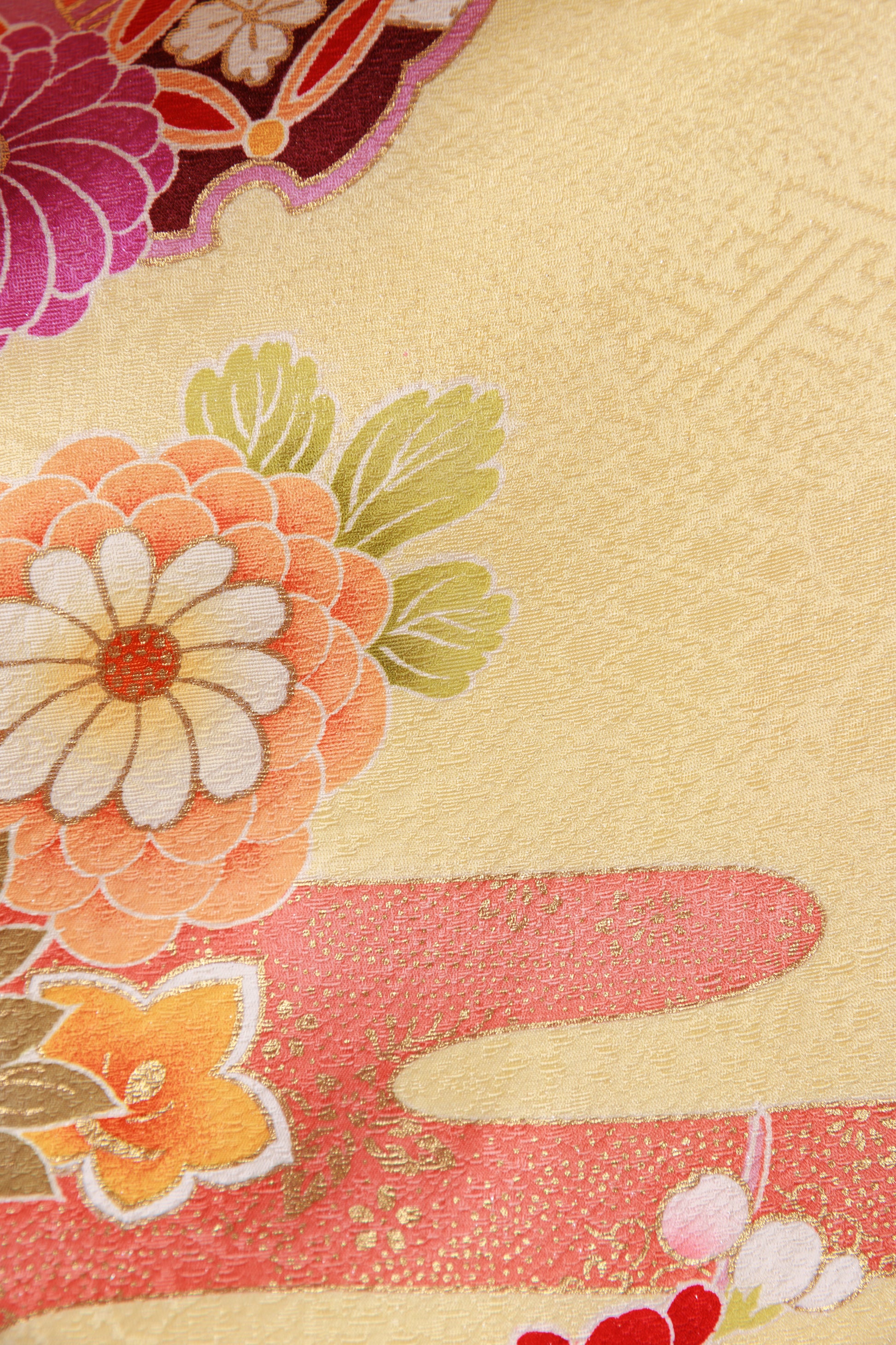 可愛らしいクリーム地に縁起柄が広がる、やわらかく愛らしい雰囲気の一着。牡丹や菊などの花々が華やかさと可憐さを添え、統一感のある小物合わせでより可愛くまとまります。