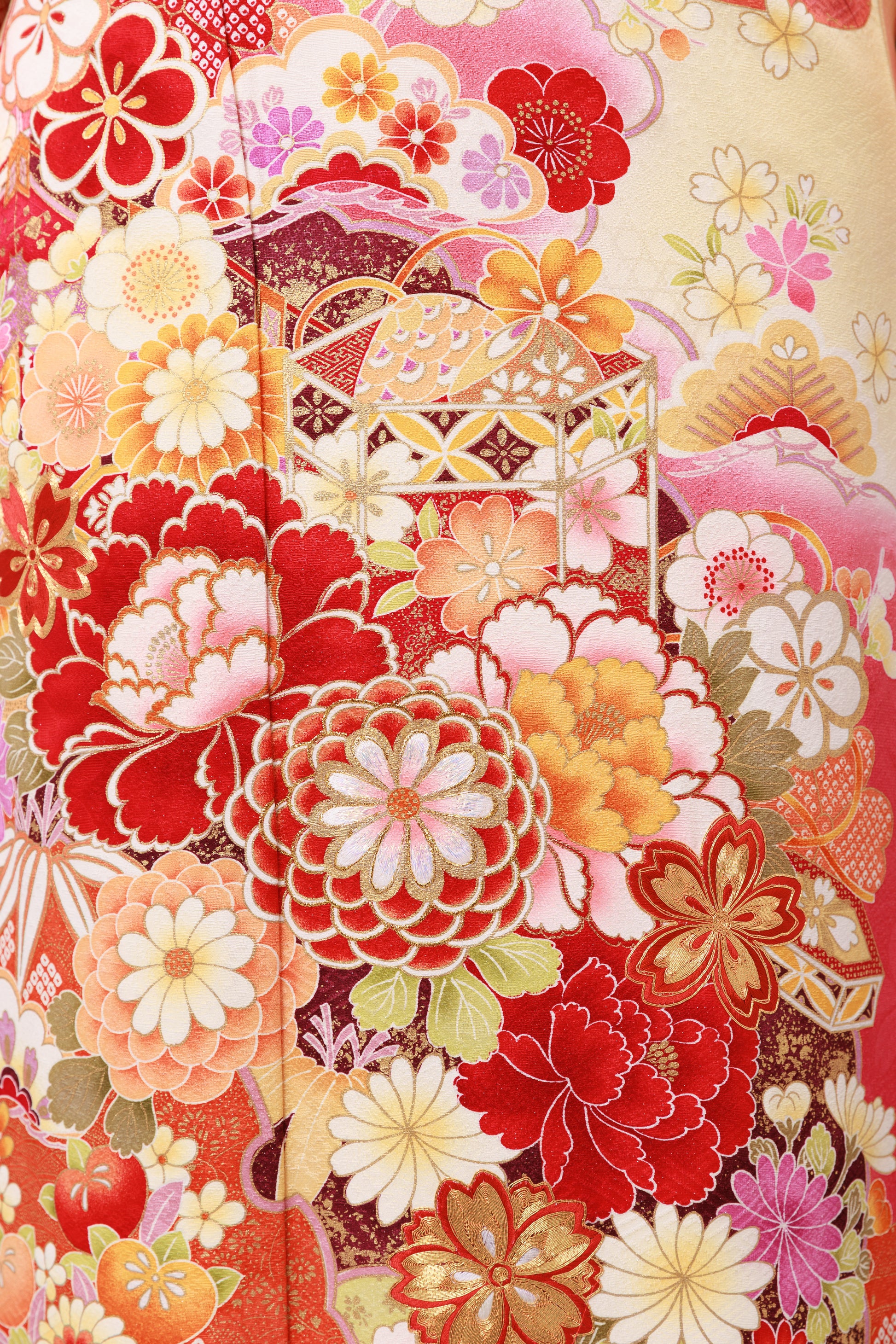 クリーム地 ピンクぼかし 牡丹・丸菊・貝桶 正絹振袖【871】