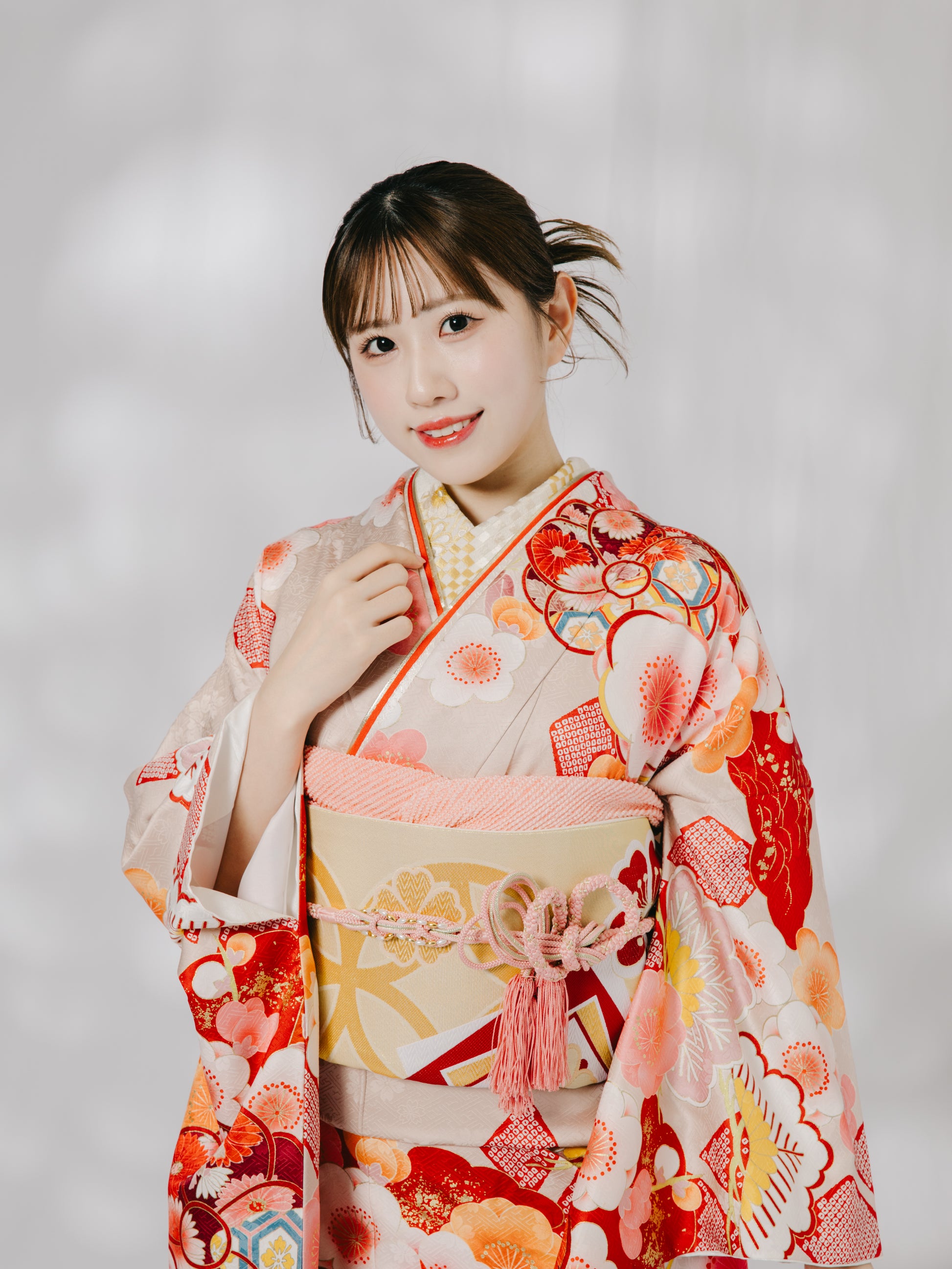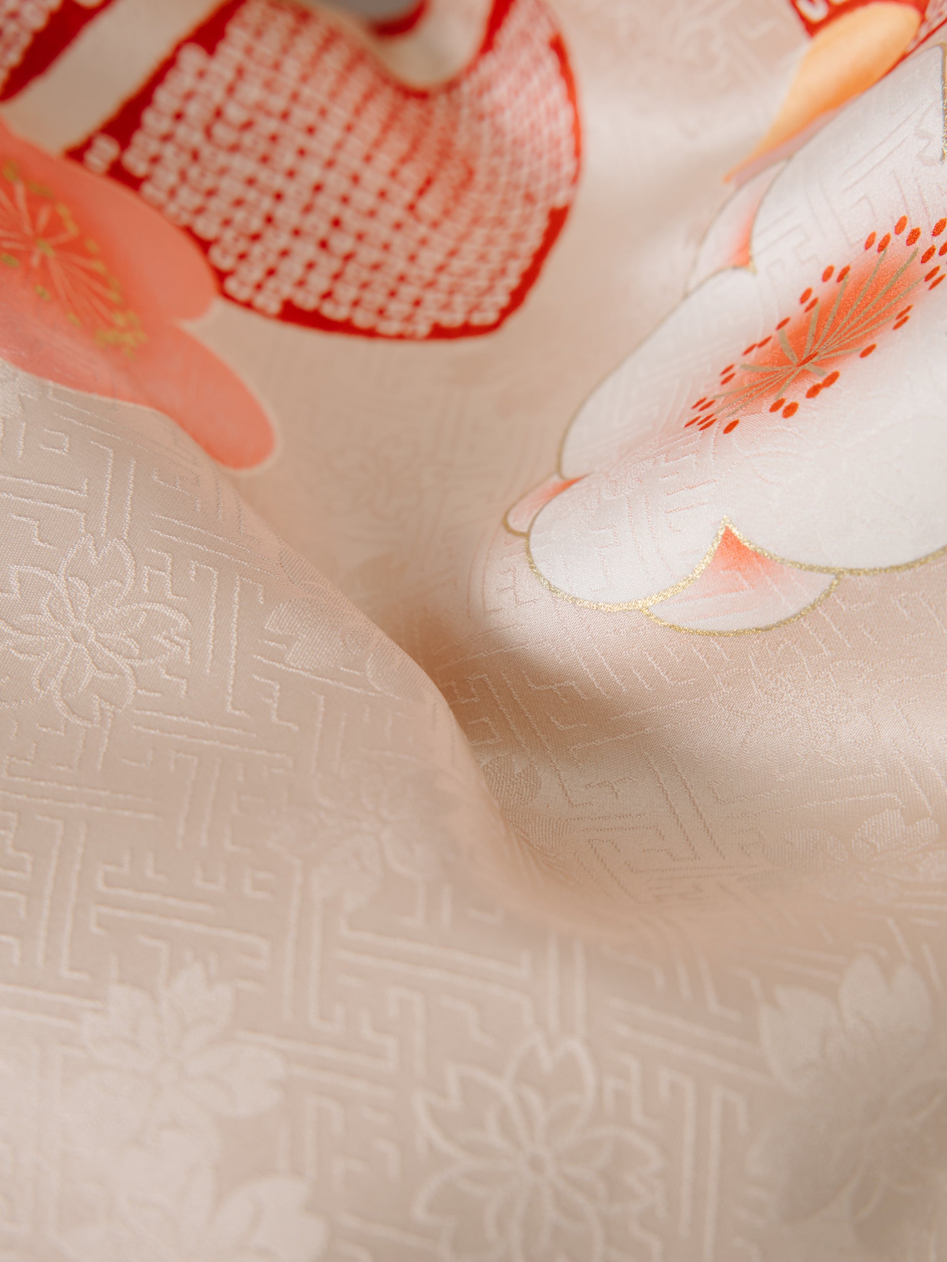 全体をピンクでまとめた可愛らしい一着。ゴールドの帯で煌びやかに