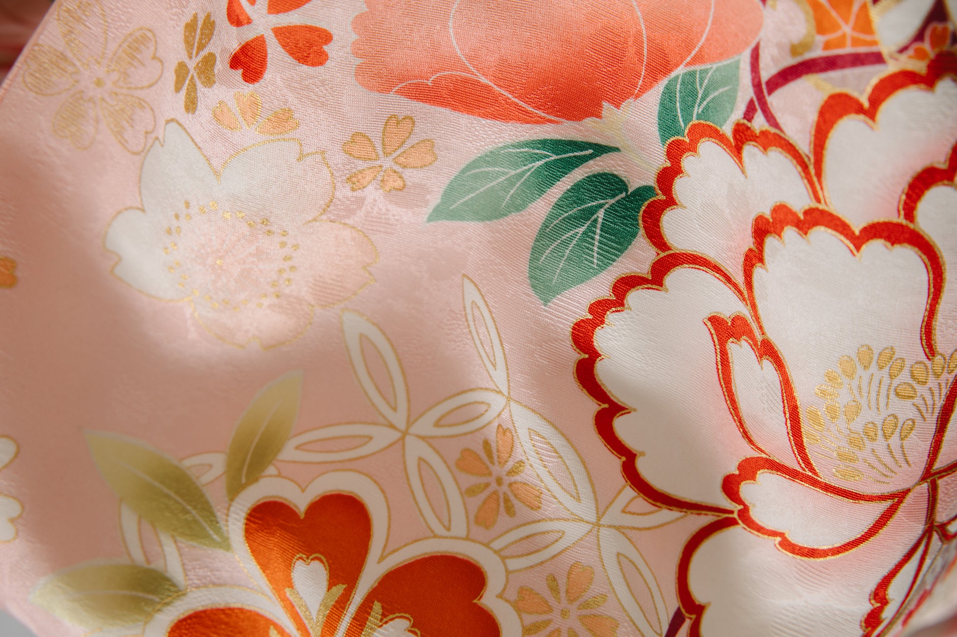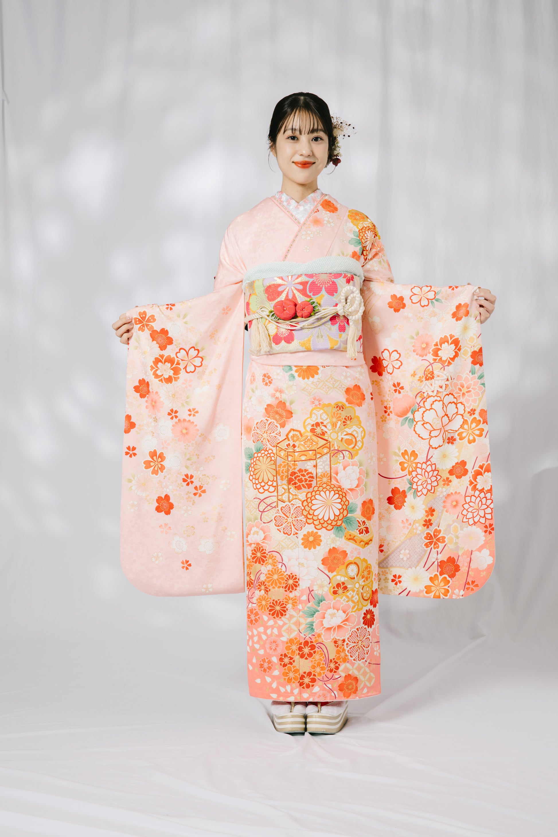 ピンク地 貝桶 丸菊柄 正絹振袖【516】