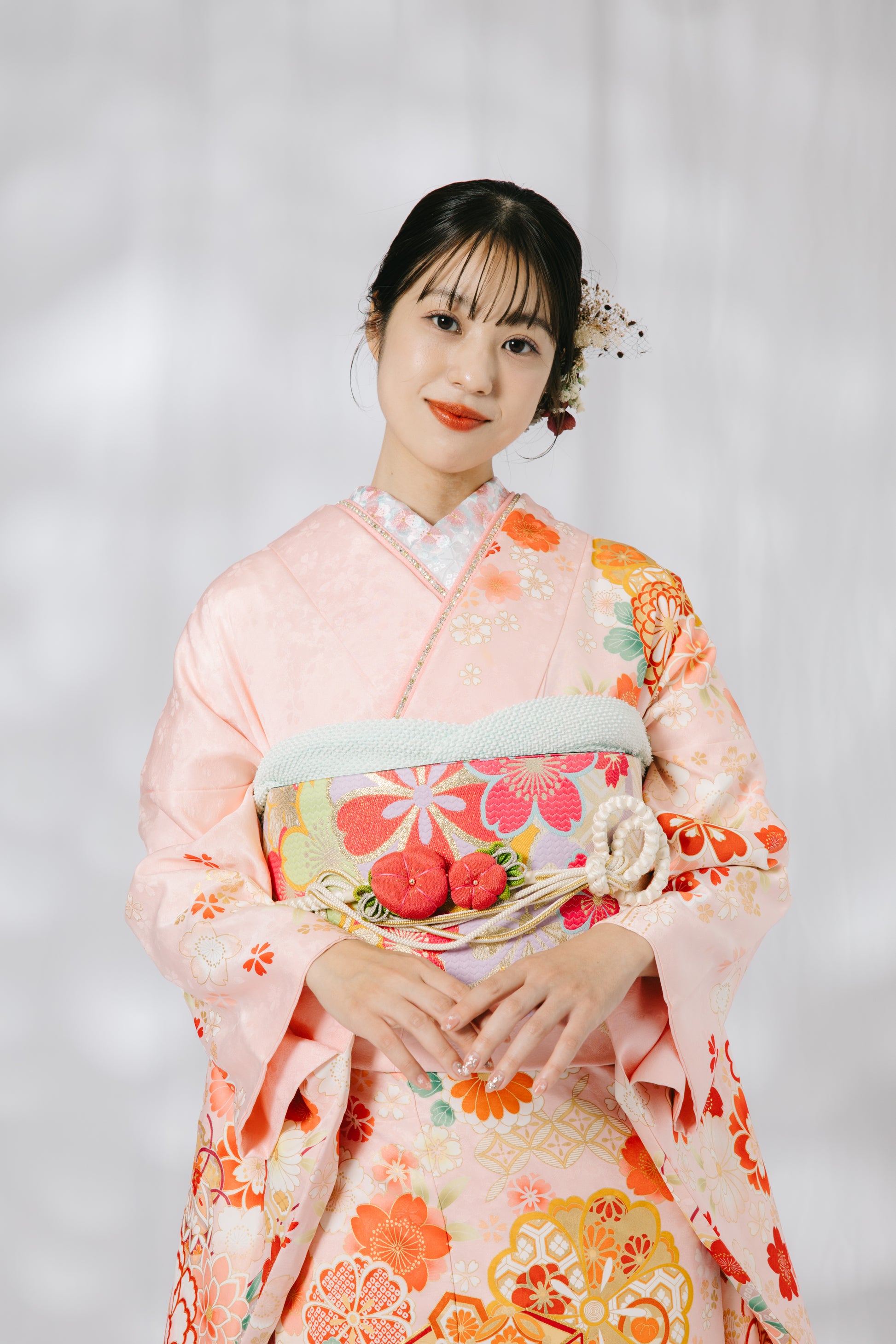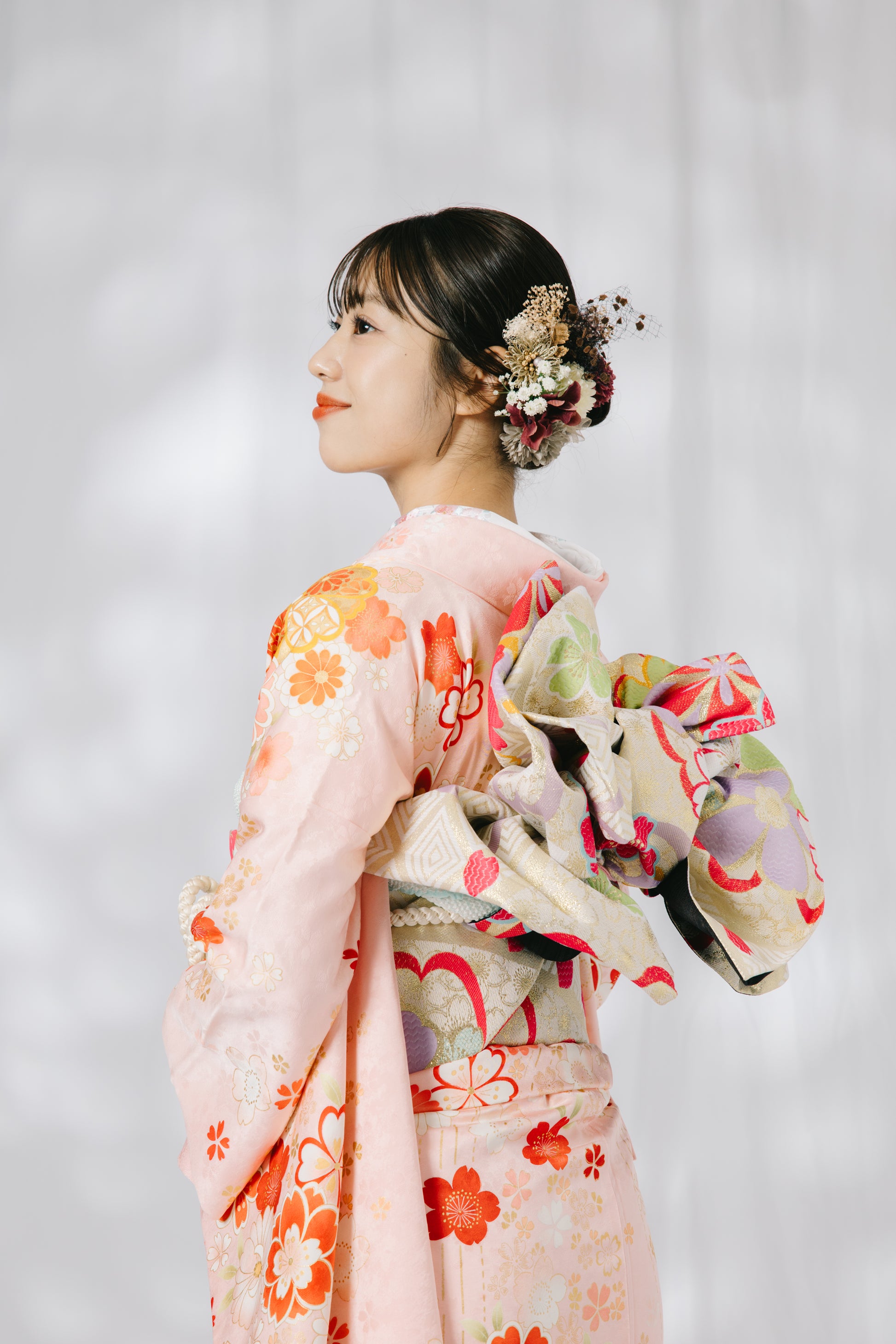 ピンク地にカラフルな小花柄で可愛らしいお振袖。小物もパステル調でまとまりのある甘めコーディネートに。