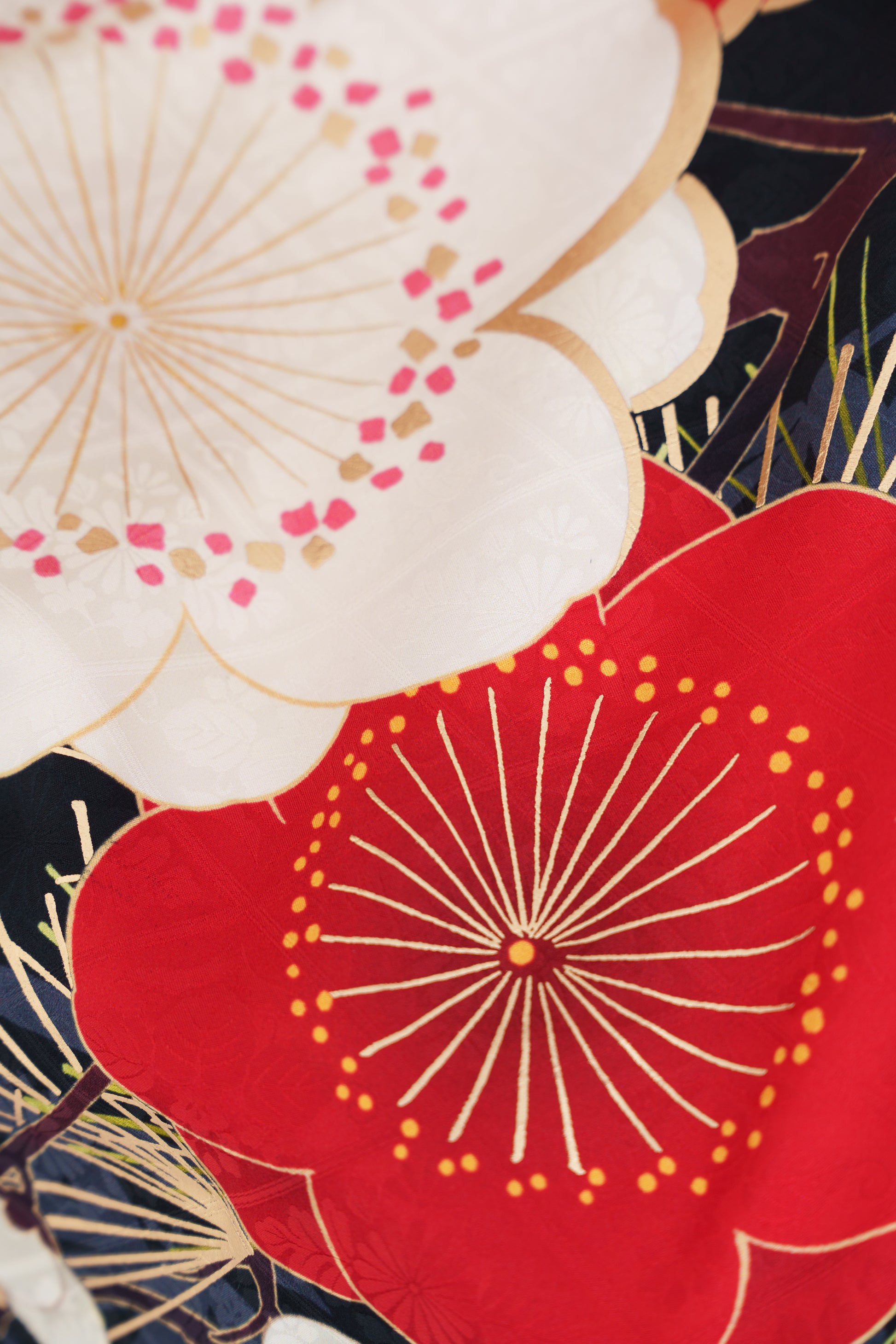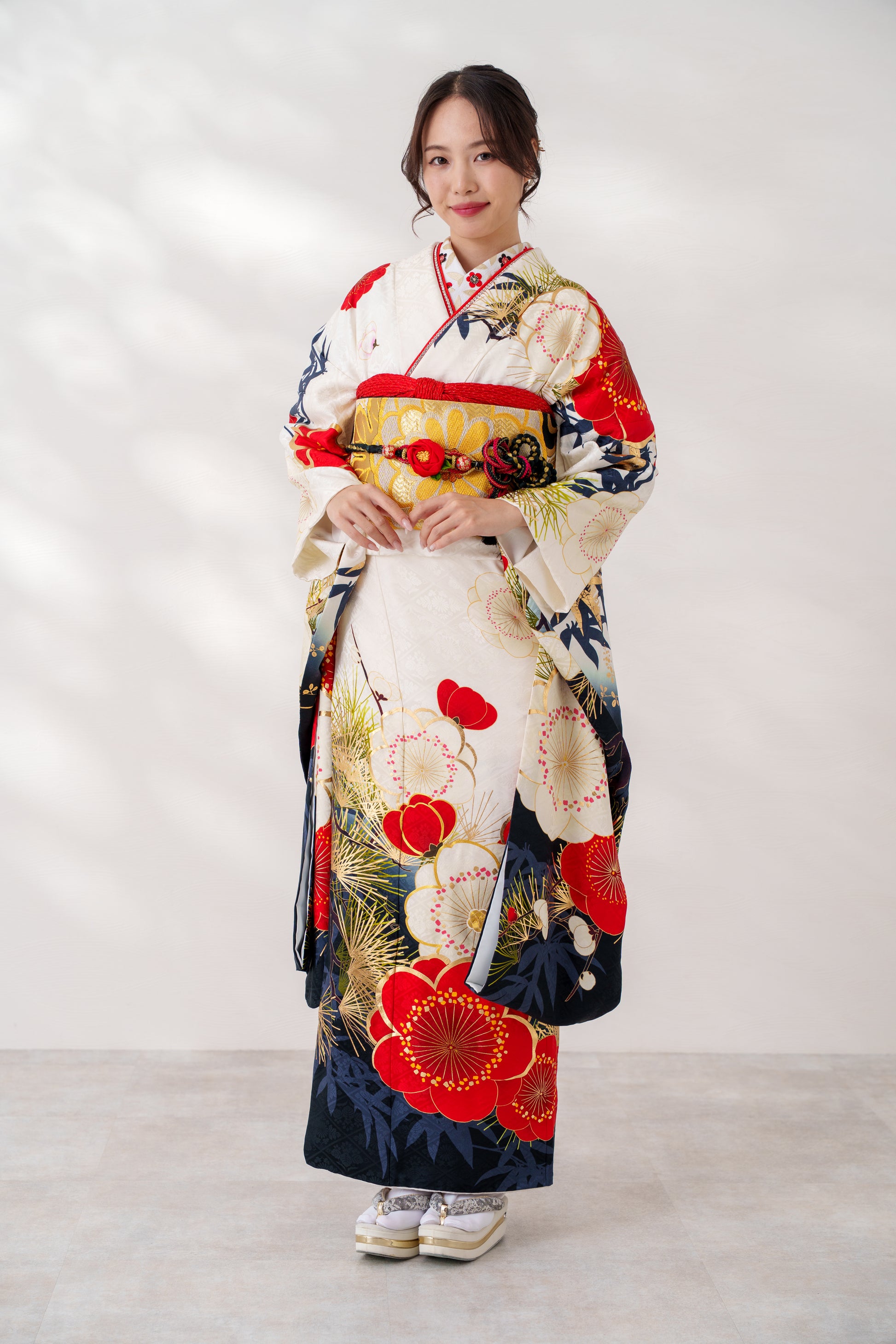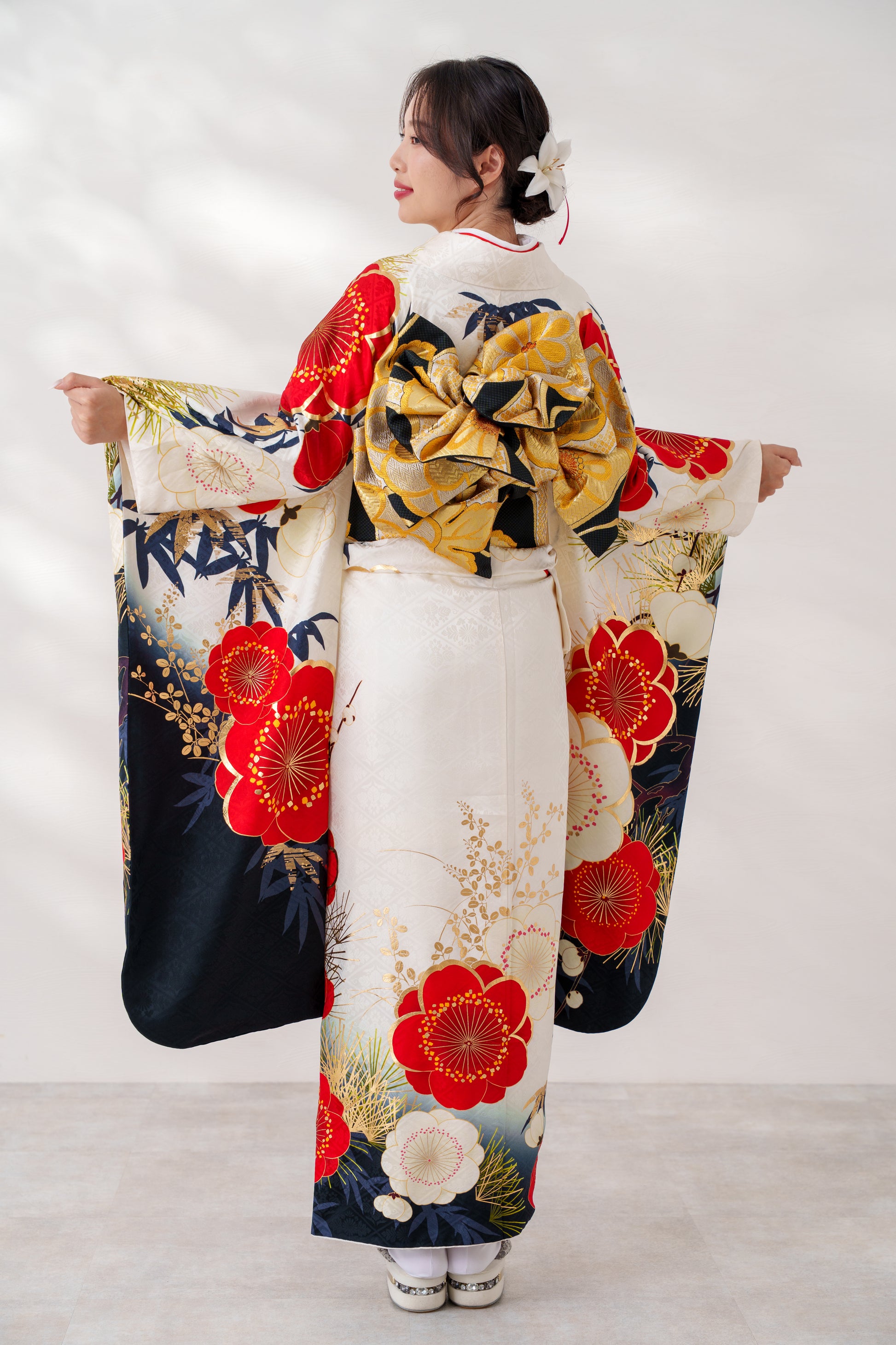 白地に裾元の黒に赤い梅が特徴的な一着。ゴールドの小物と合わせてかっこいい雰囲気に。