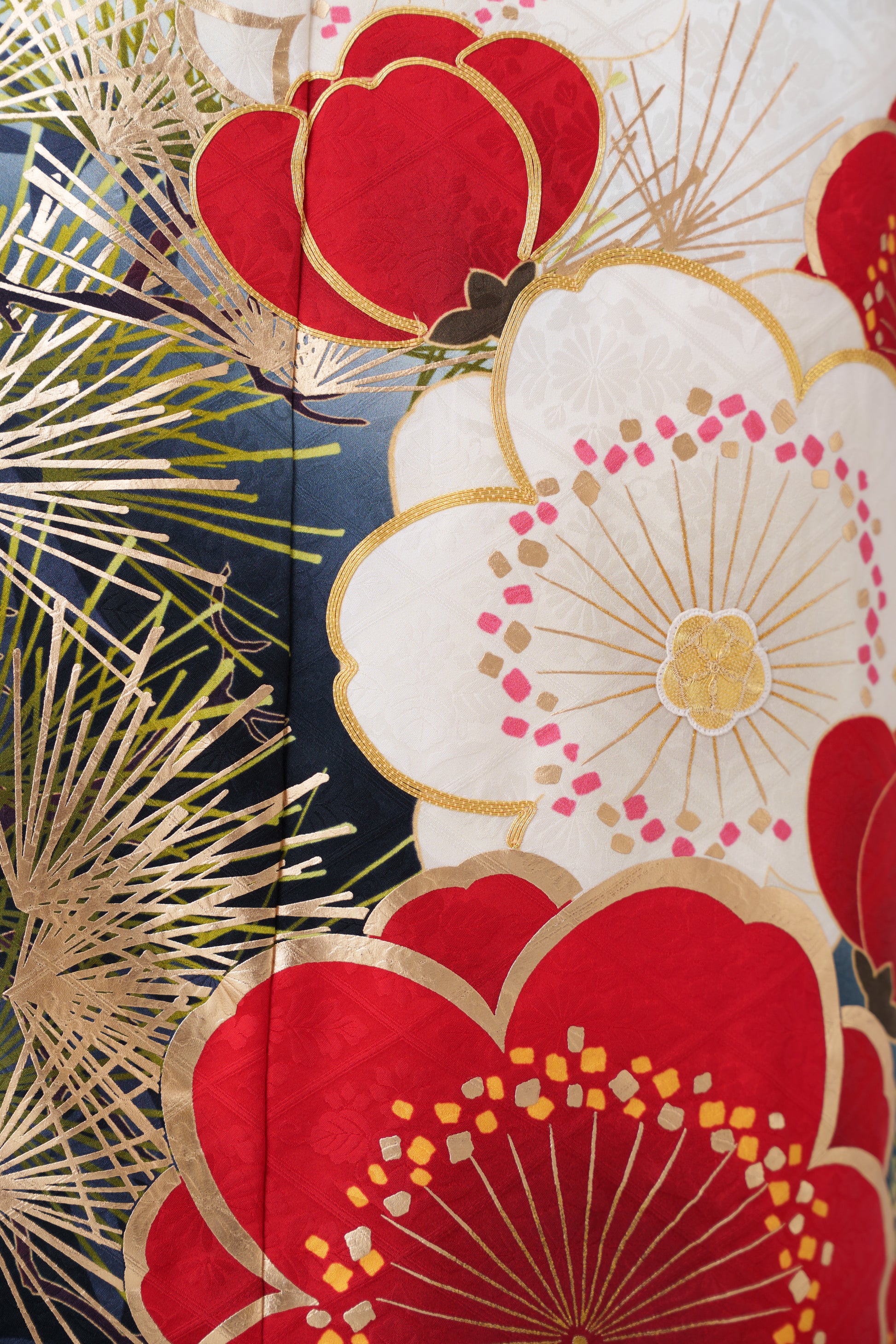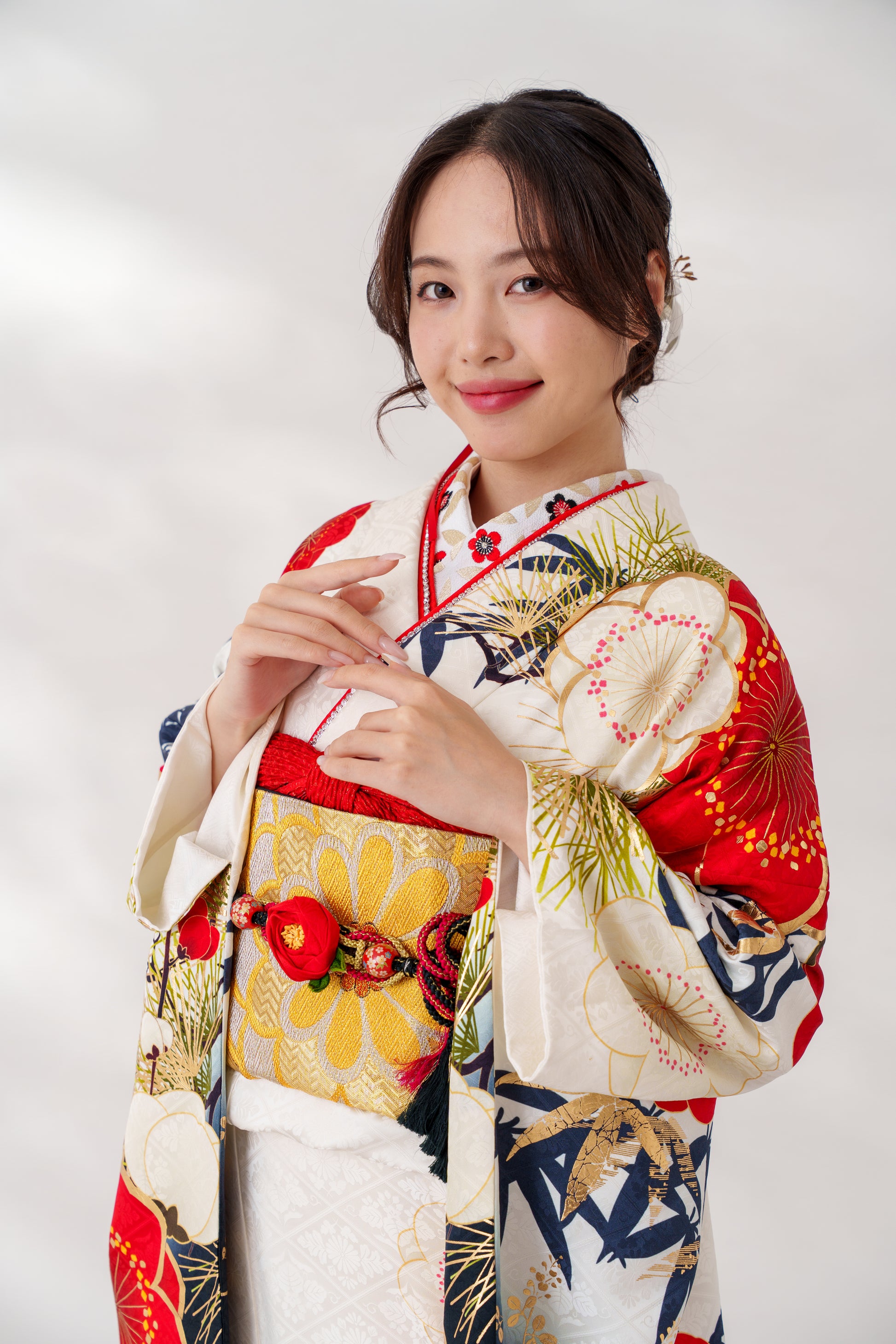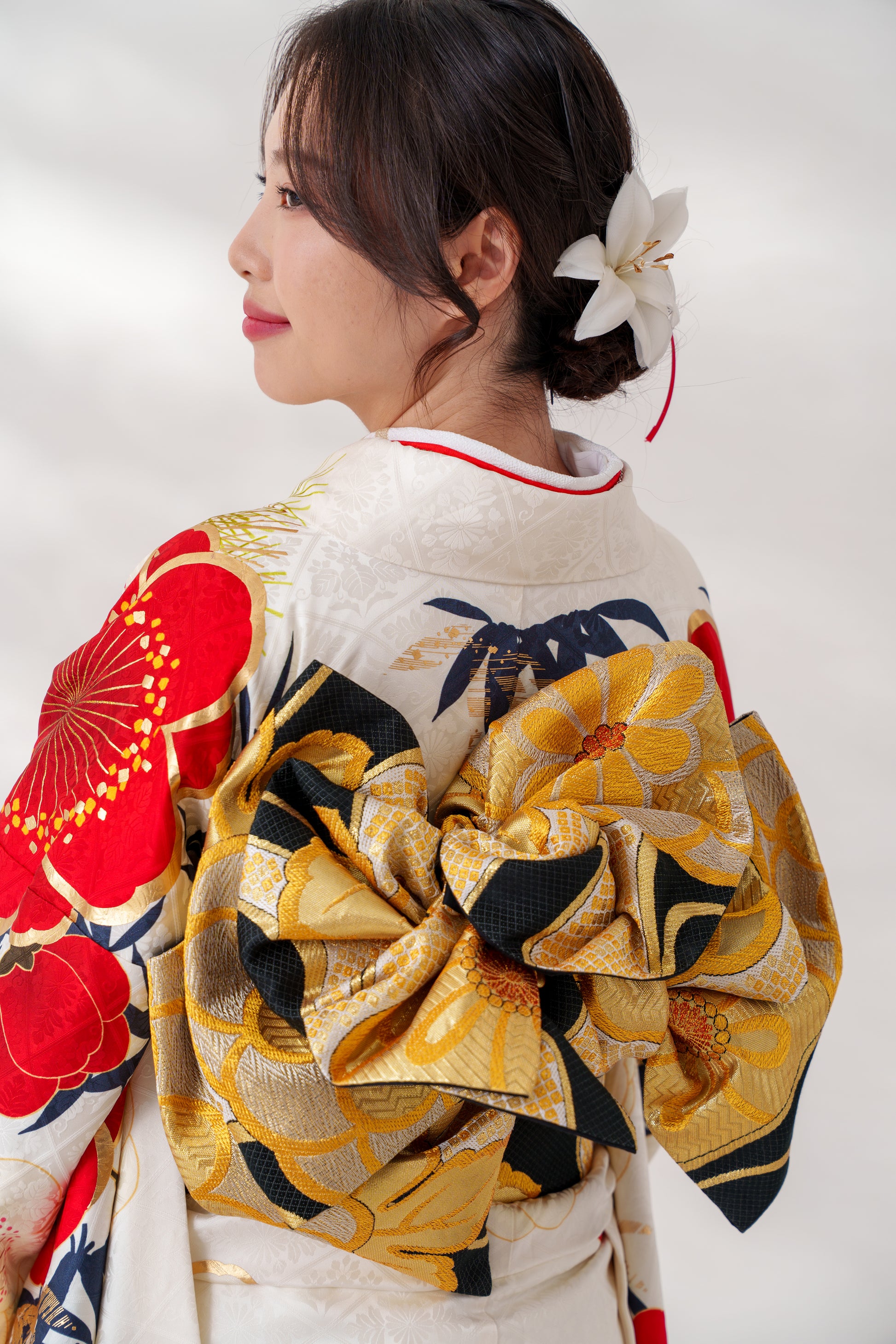 白地に裾元の黒に赤い梅が特徴的な一着。ゴールドの小物と合わせてかっこいい雰囲気に。