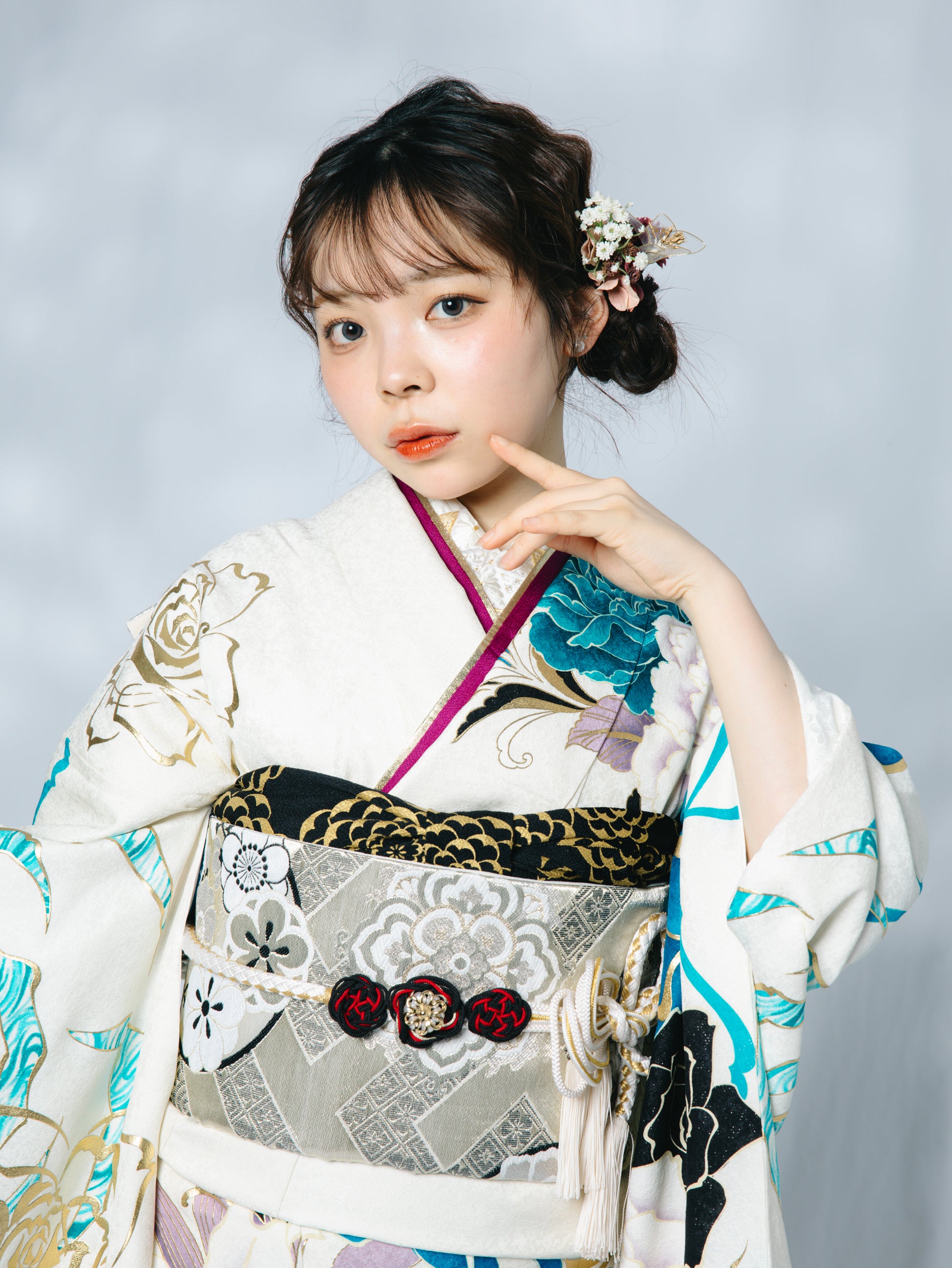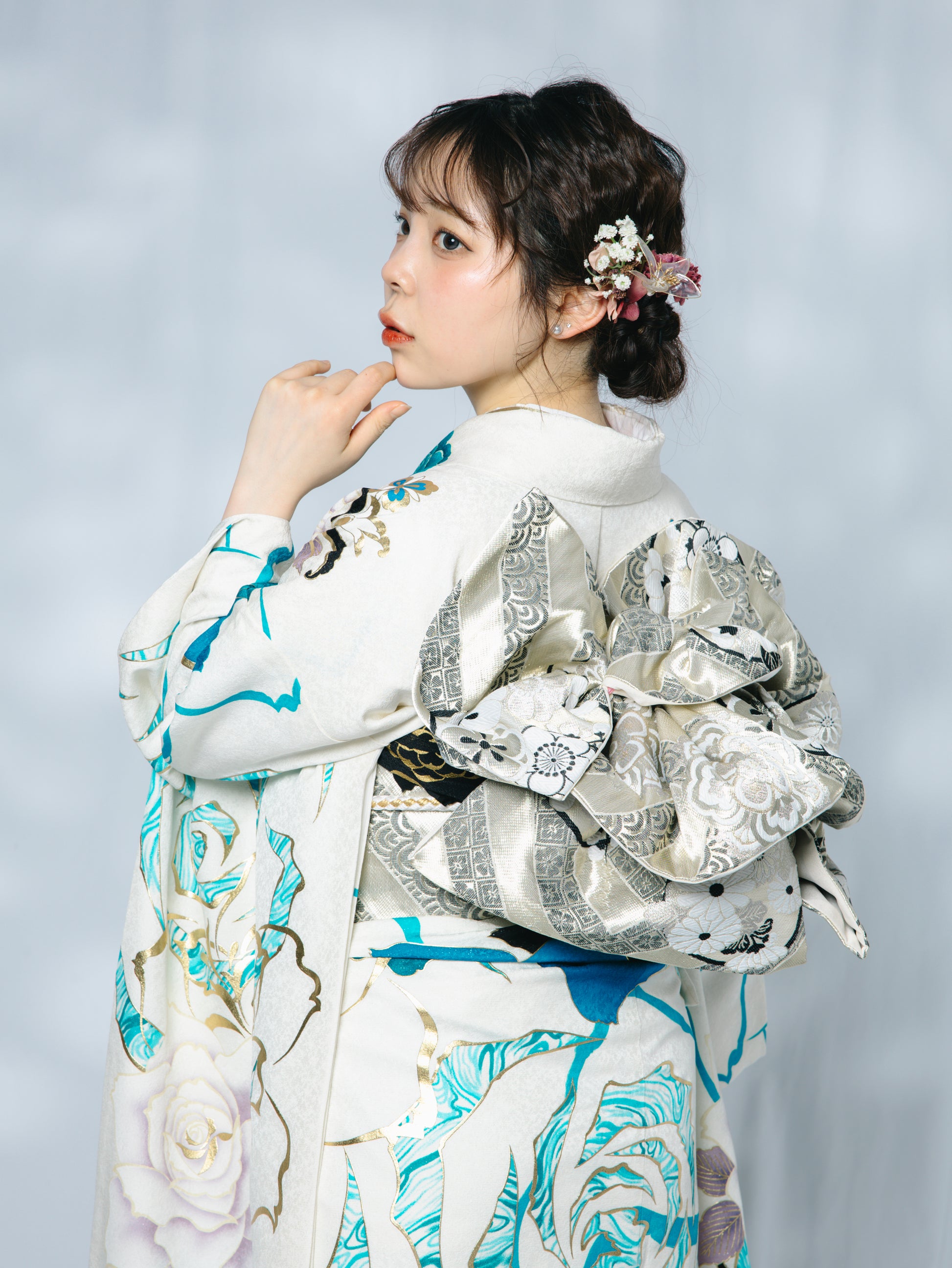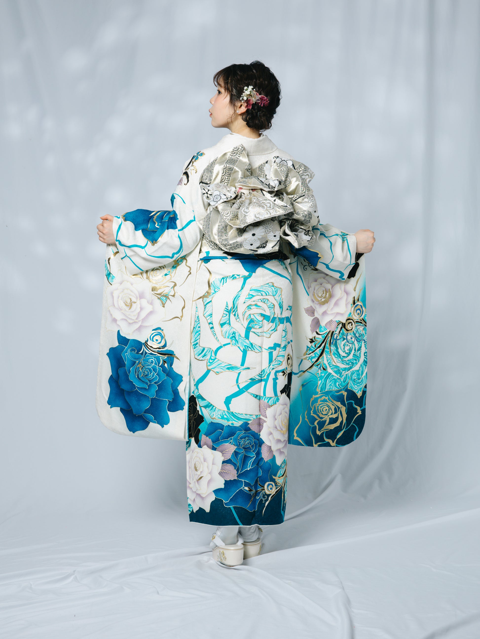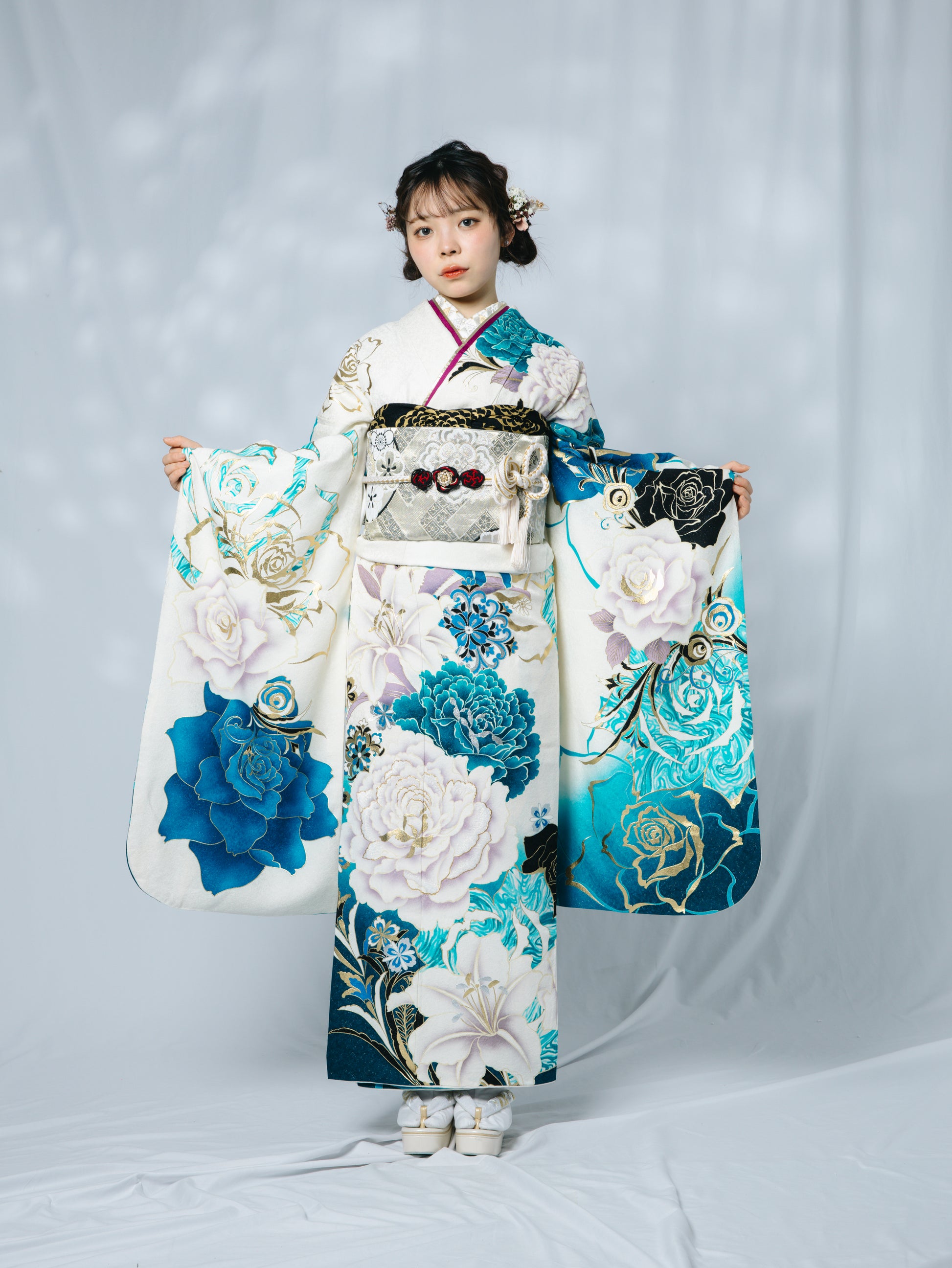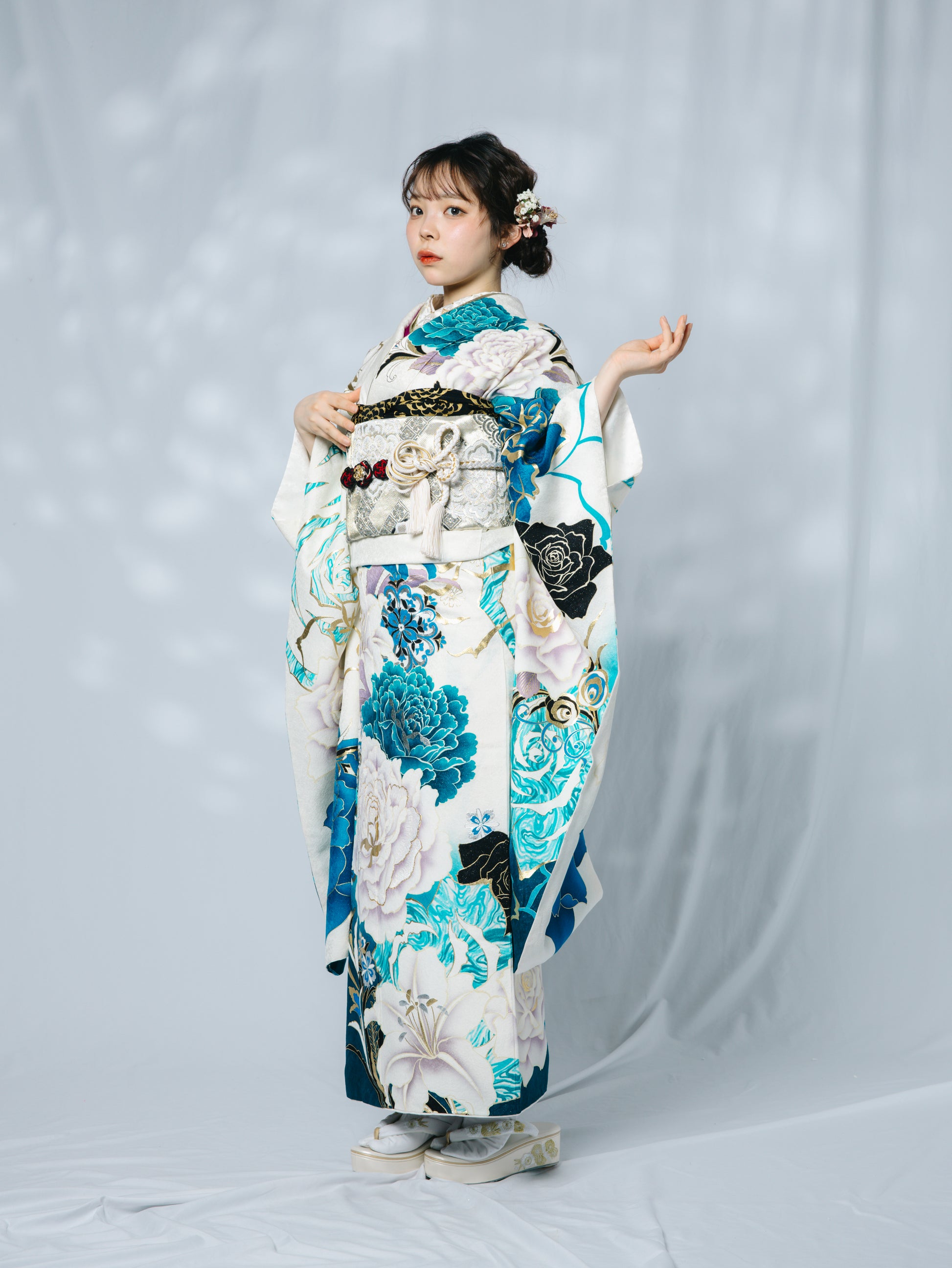 裾や柄にはブルーをあしらった、現代的な一着。小物は統一感のある黒でまとめてクールな印象に