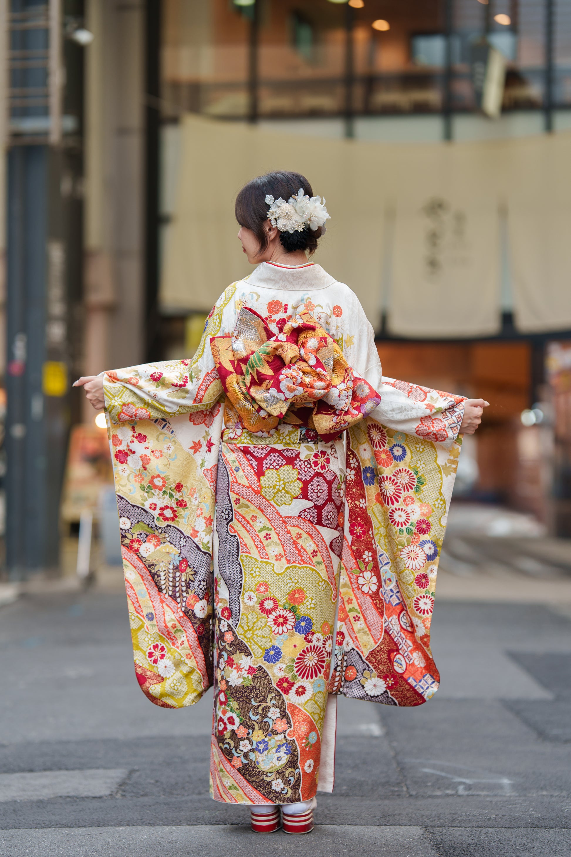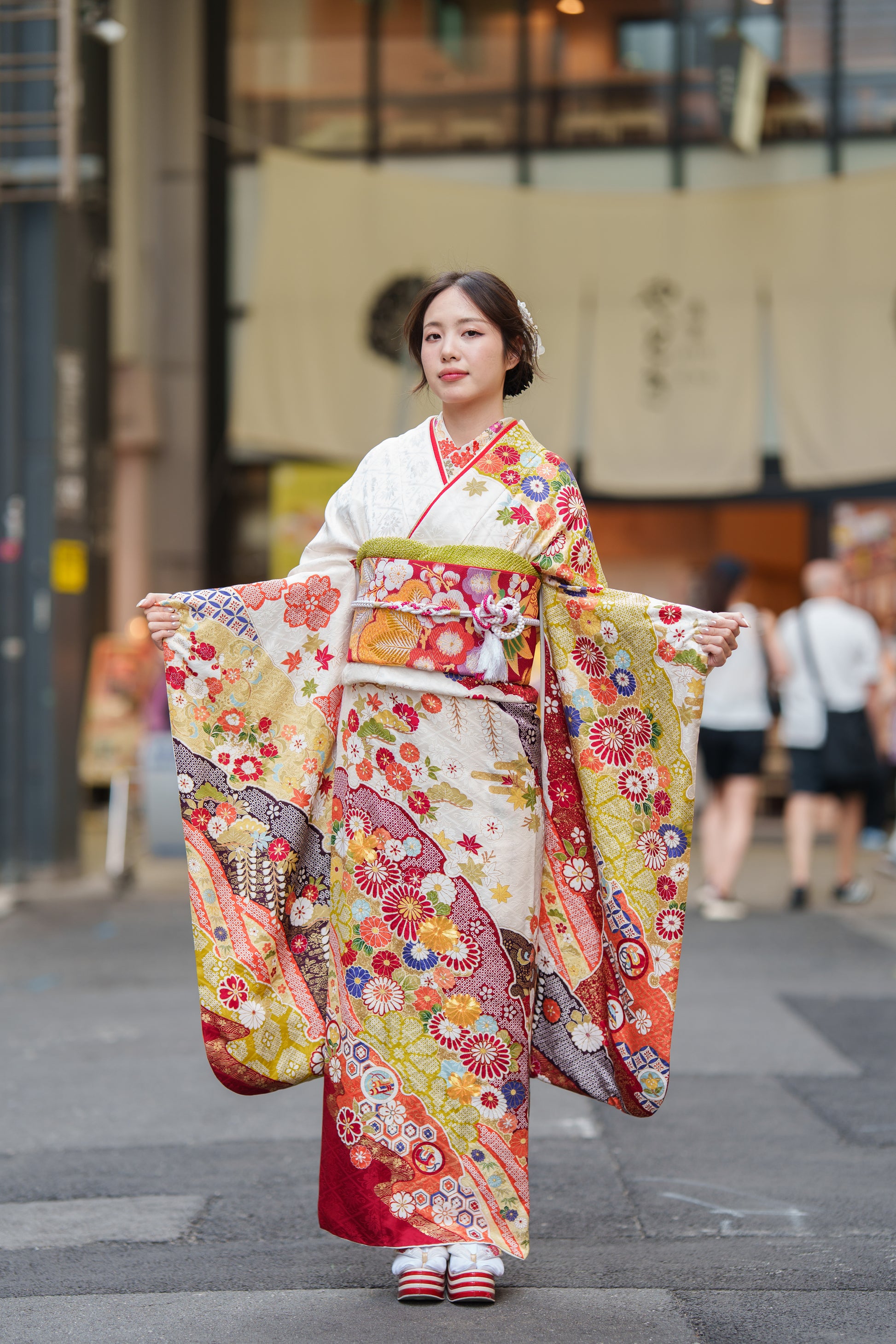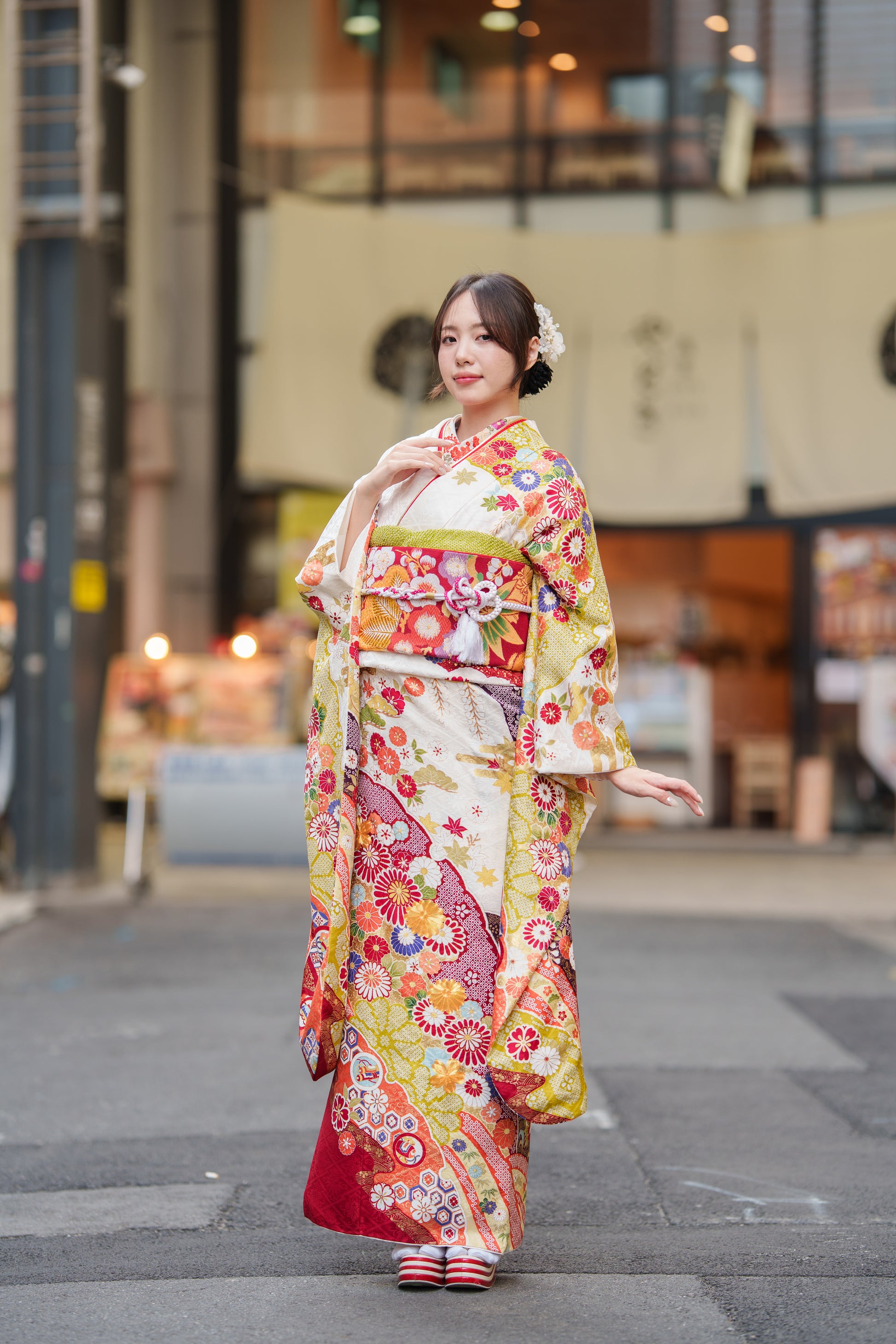 クリーム地の振袖に赤や紫で彩られた椿が印象的な一着。