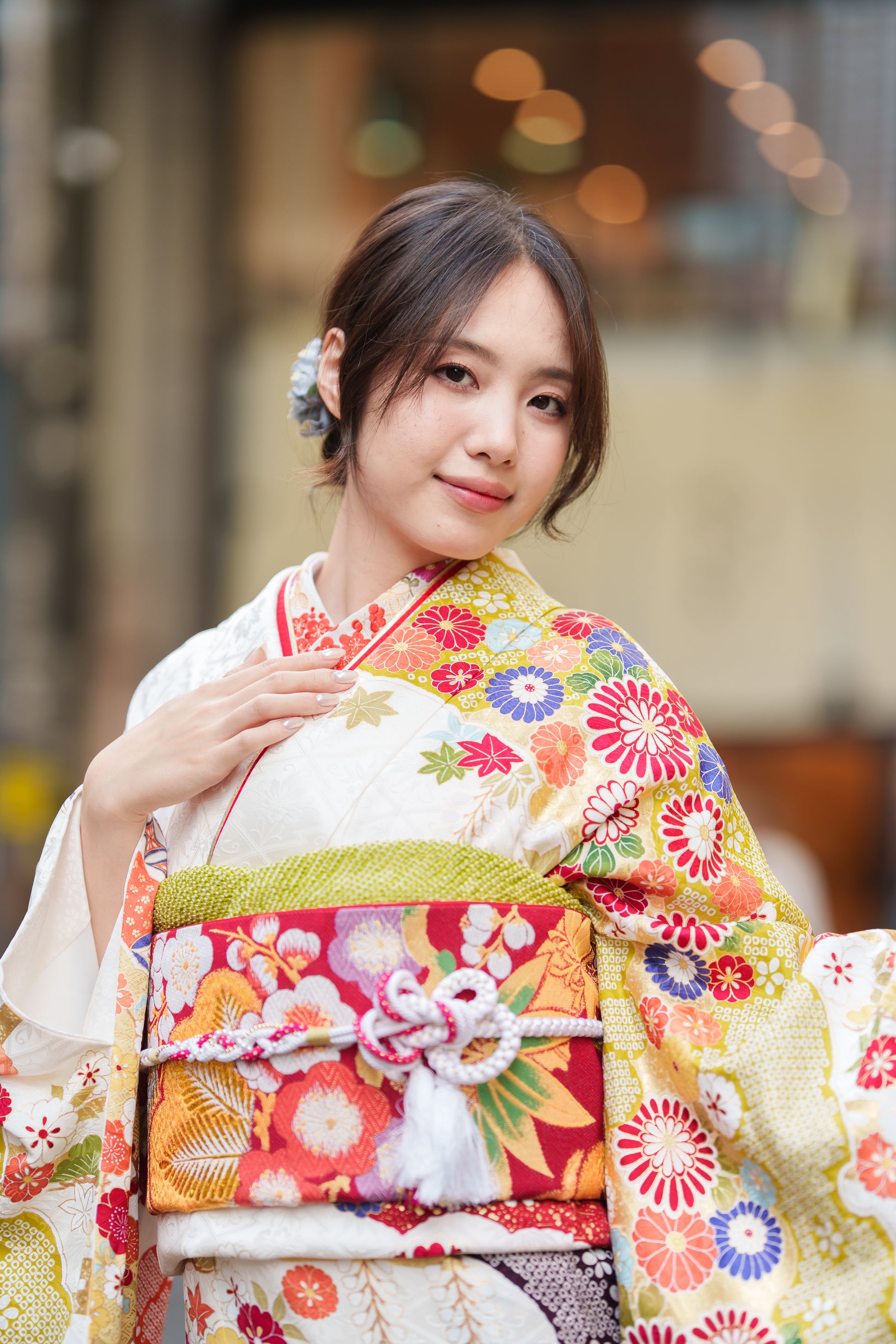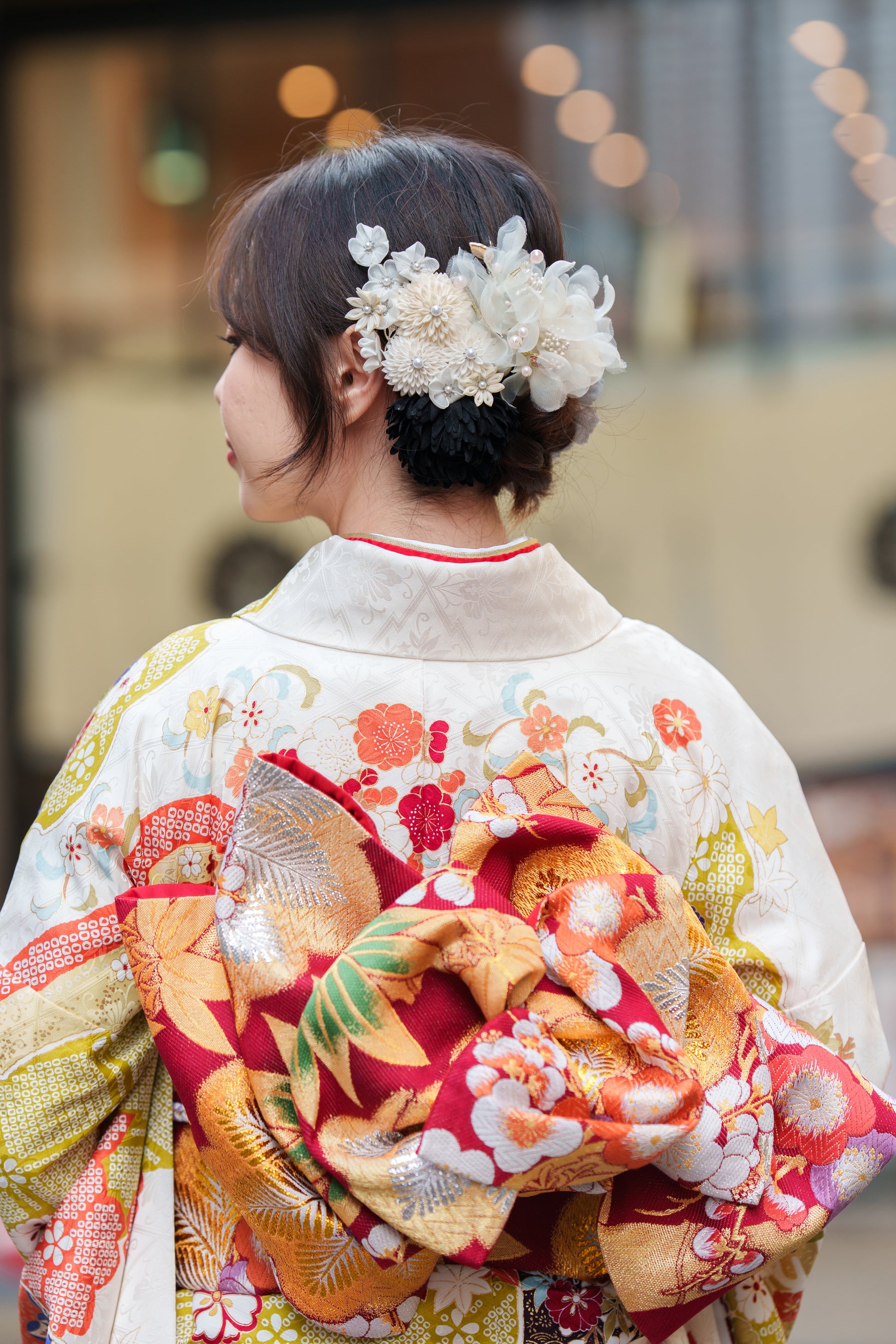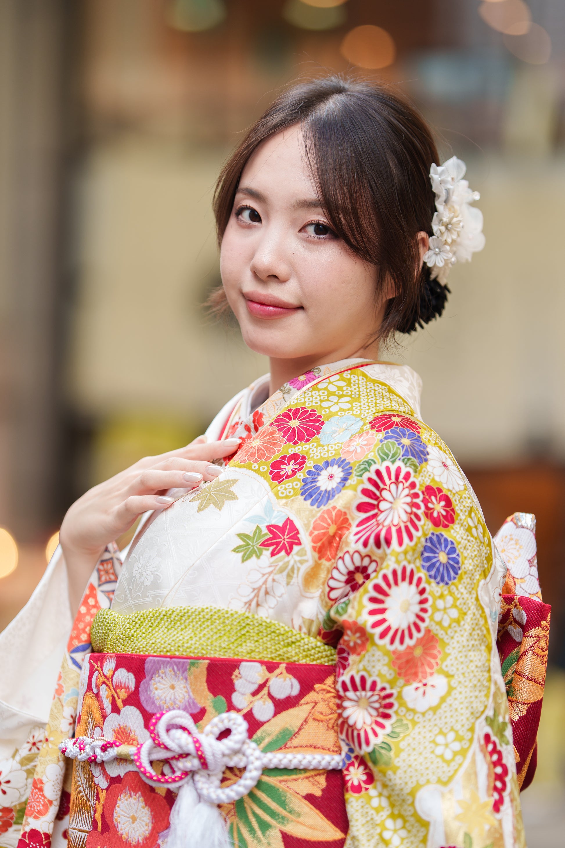 クリーム地の振袖に赤や紫で彩られた椿が印象的な一着。
