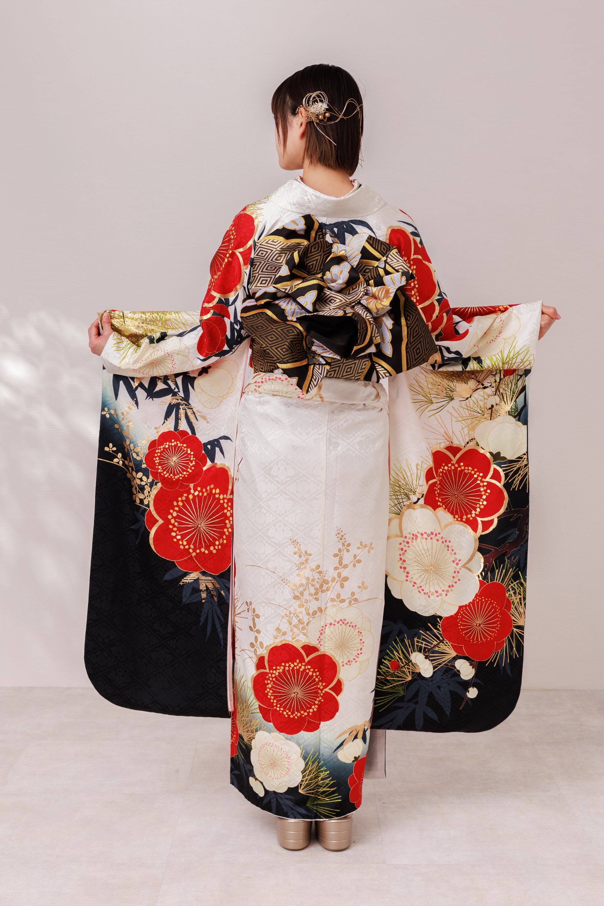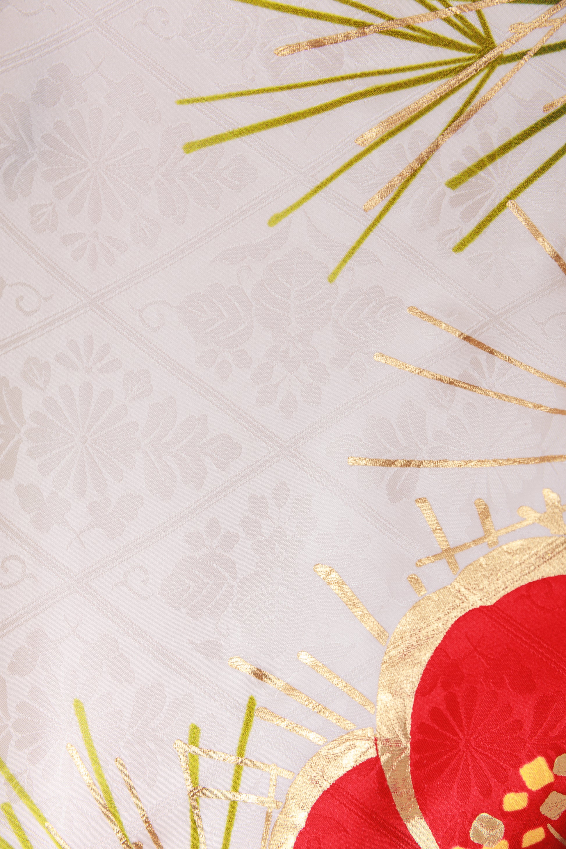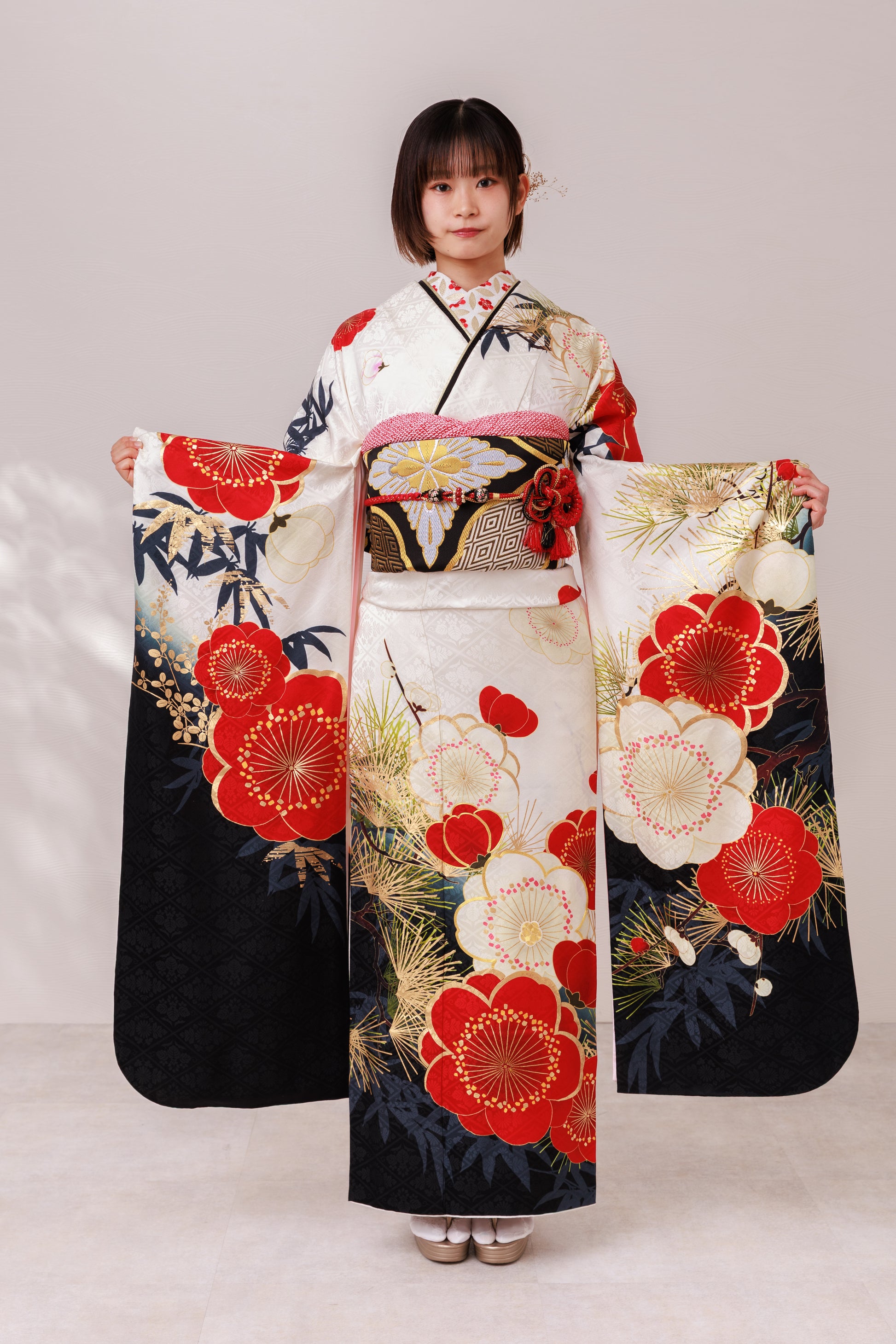 白地に咲く大輪の赤白の梅が、華やかで存在感のある一着。