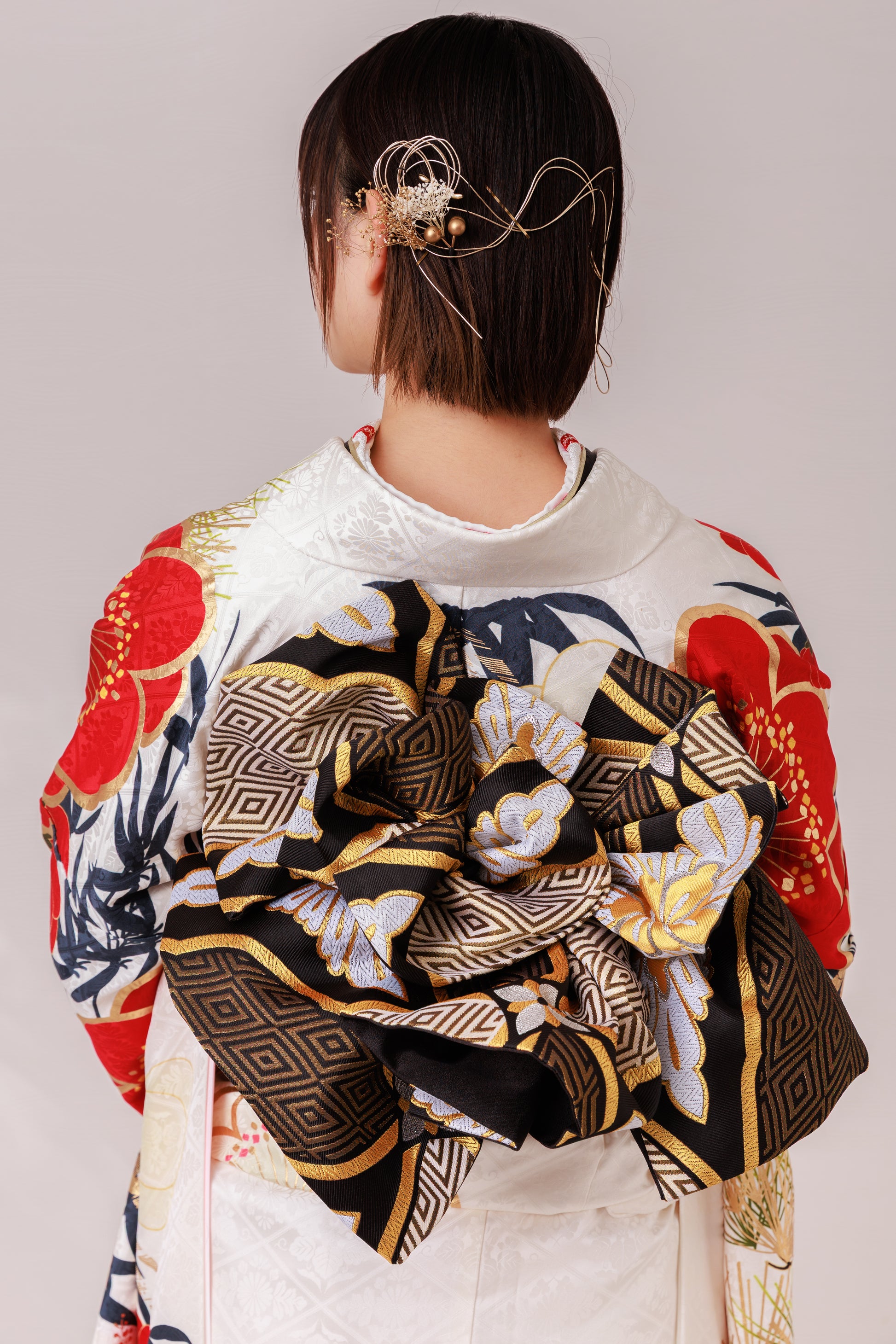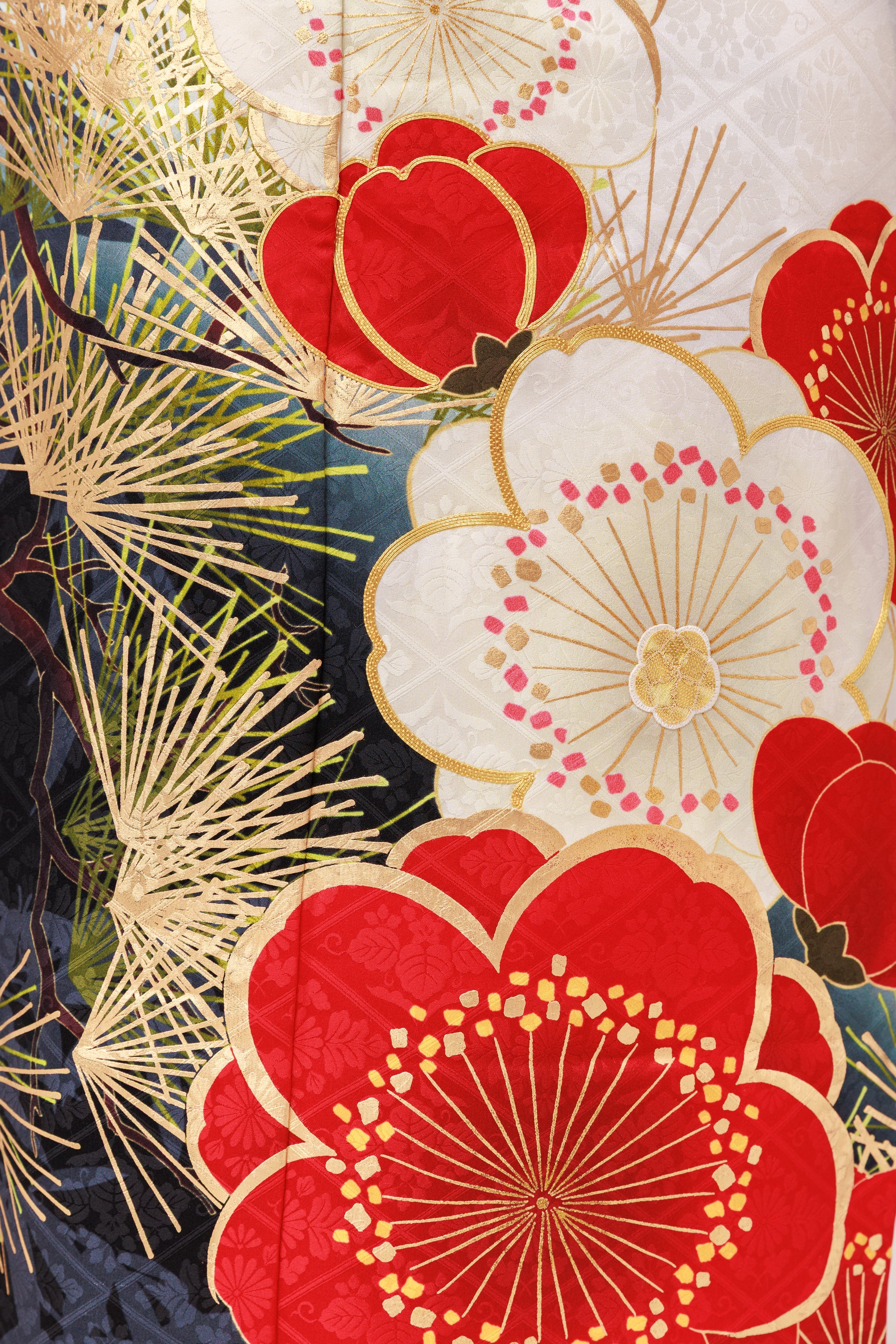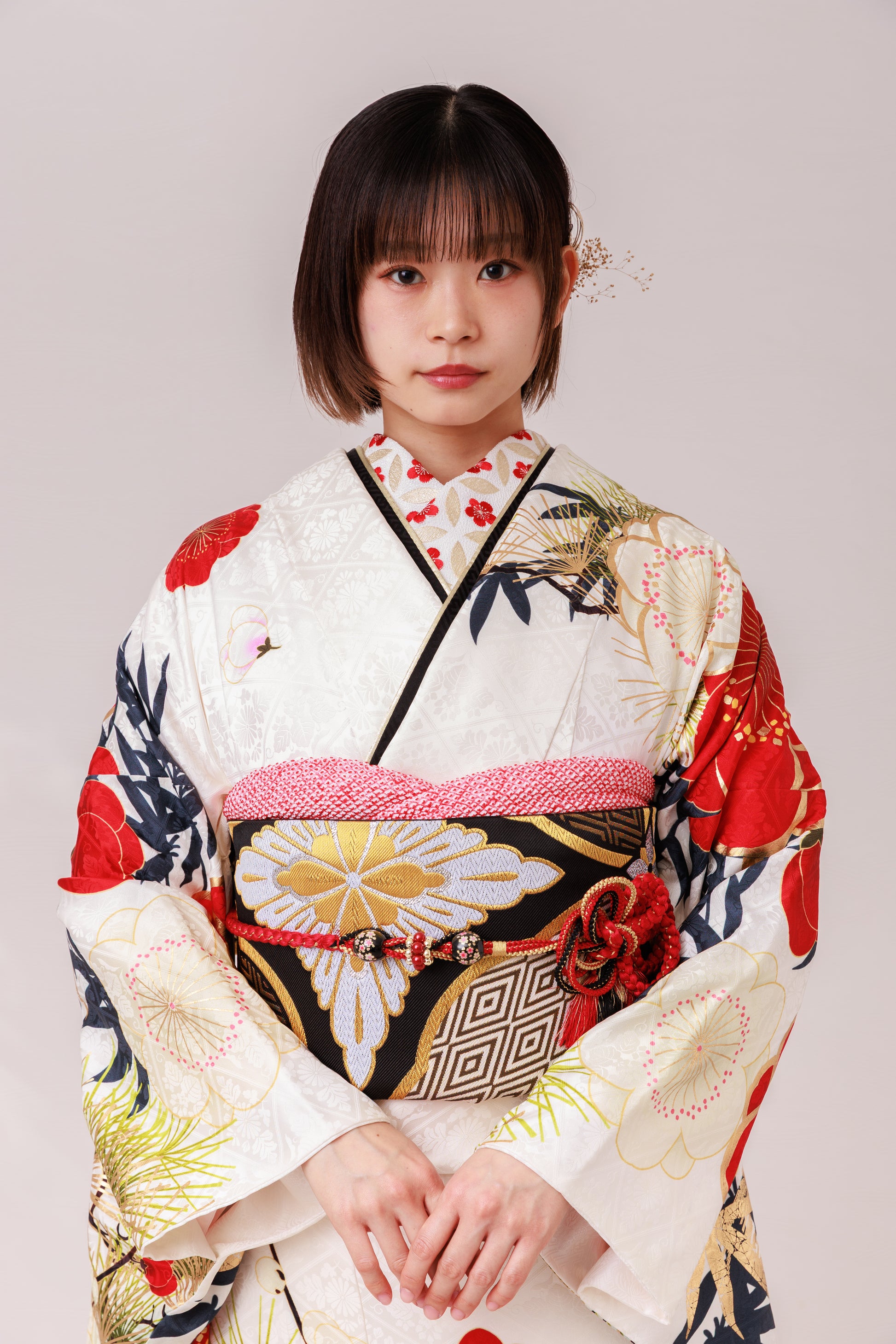 白地に咲く大輪の赤白の梅が、華やかで存在感のある一着。