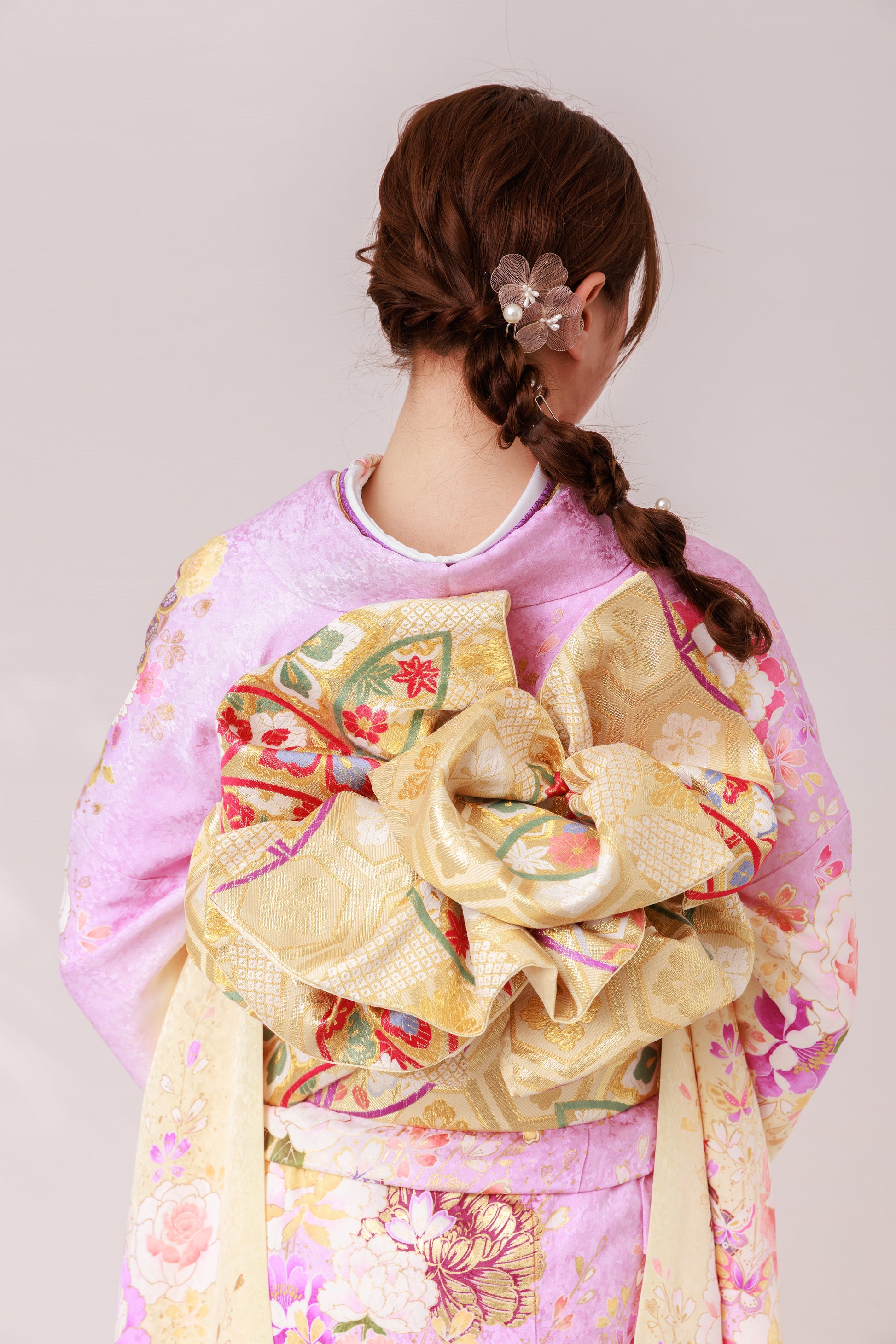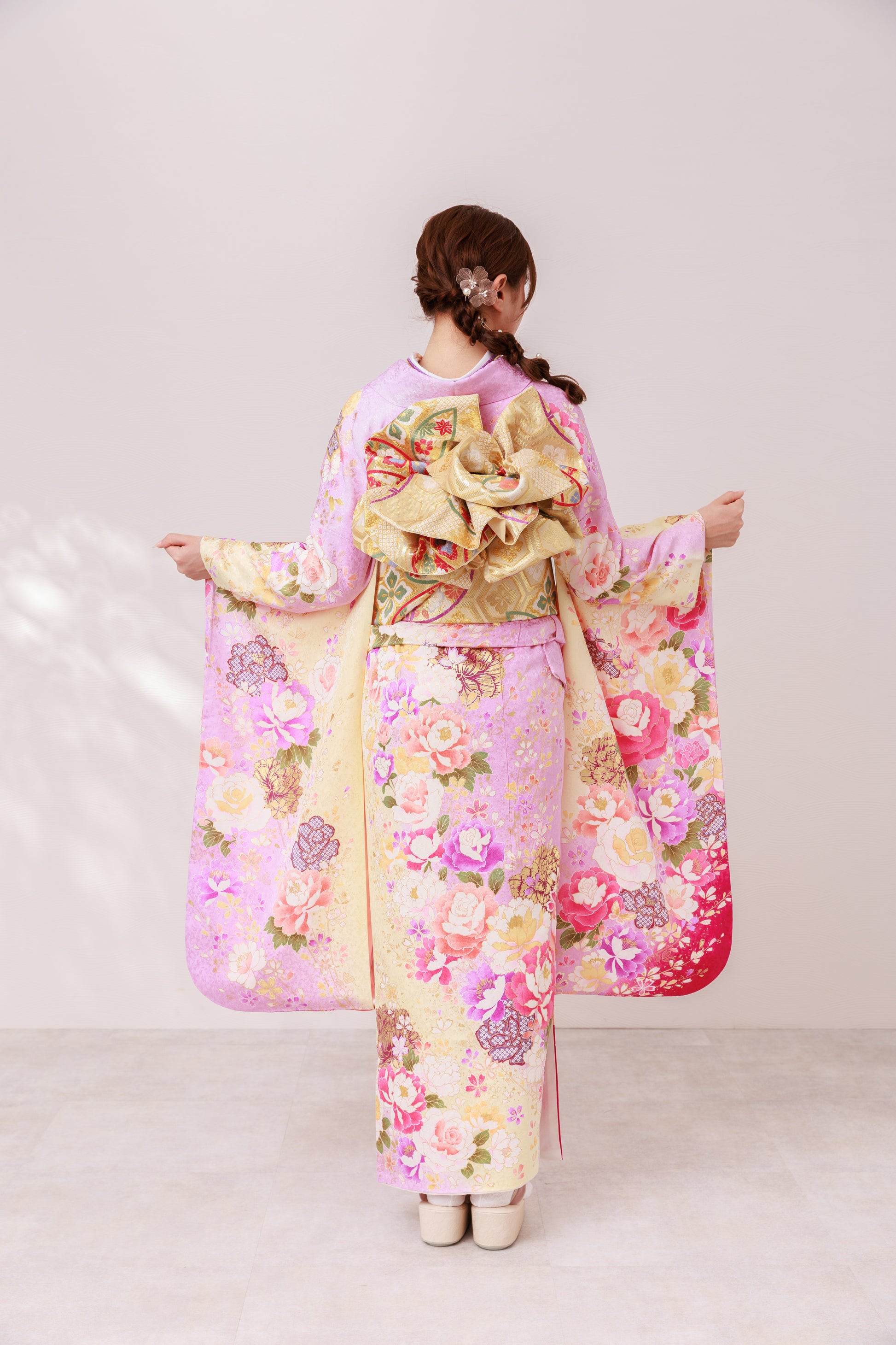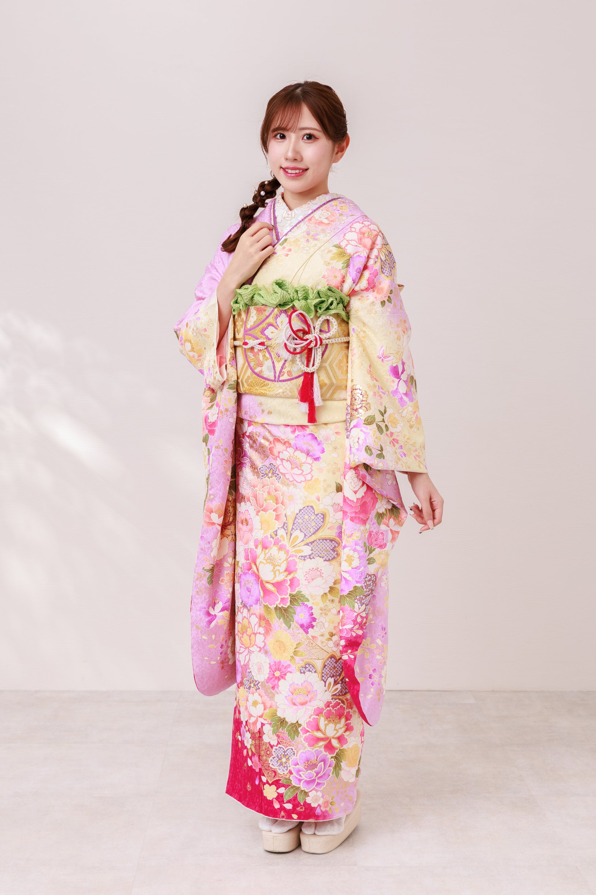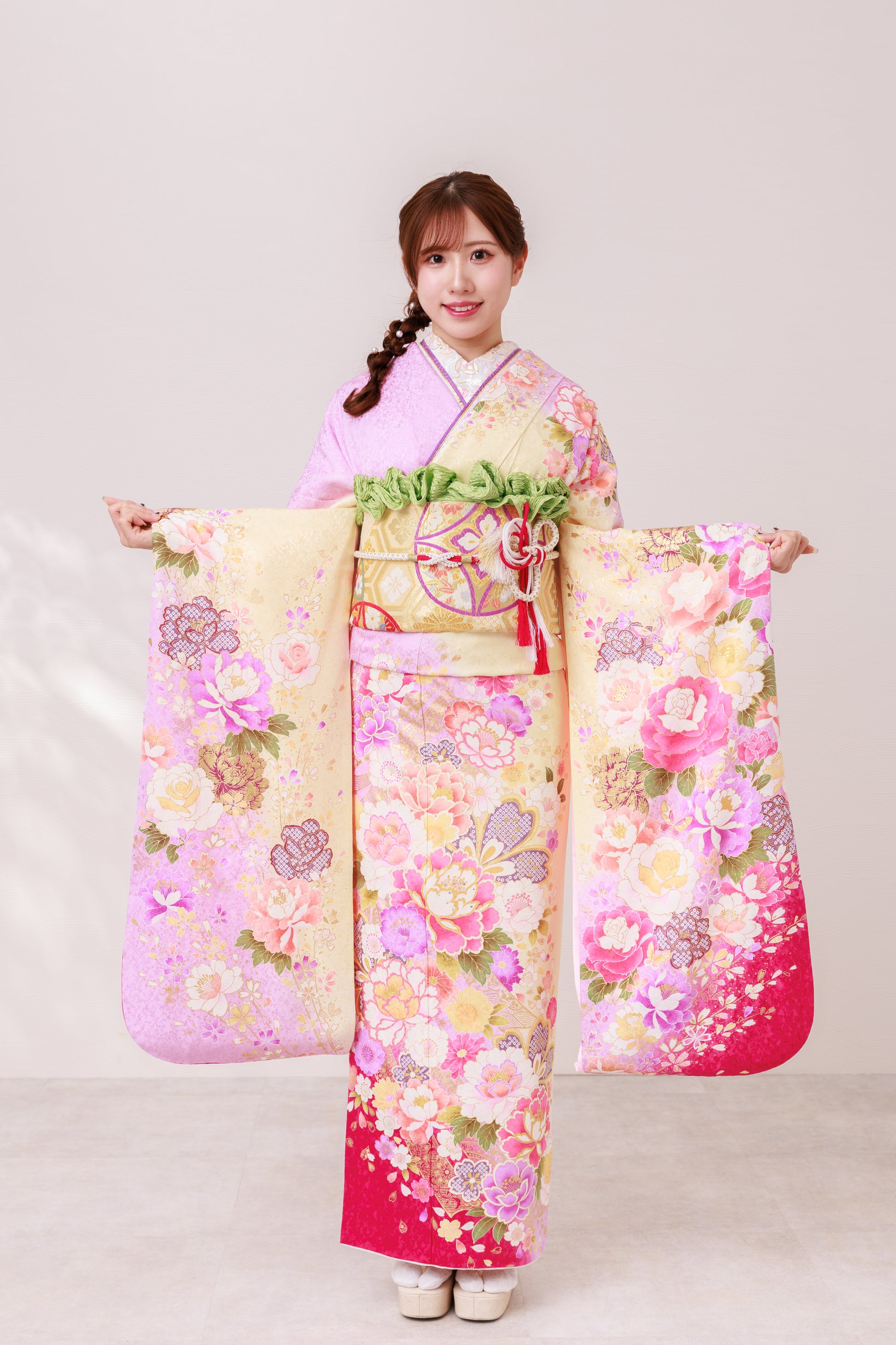 牡丹や桜が咲き誇るピンクの振袖で、会場いちばんの可愛いさをまとえる一着。