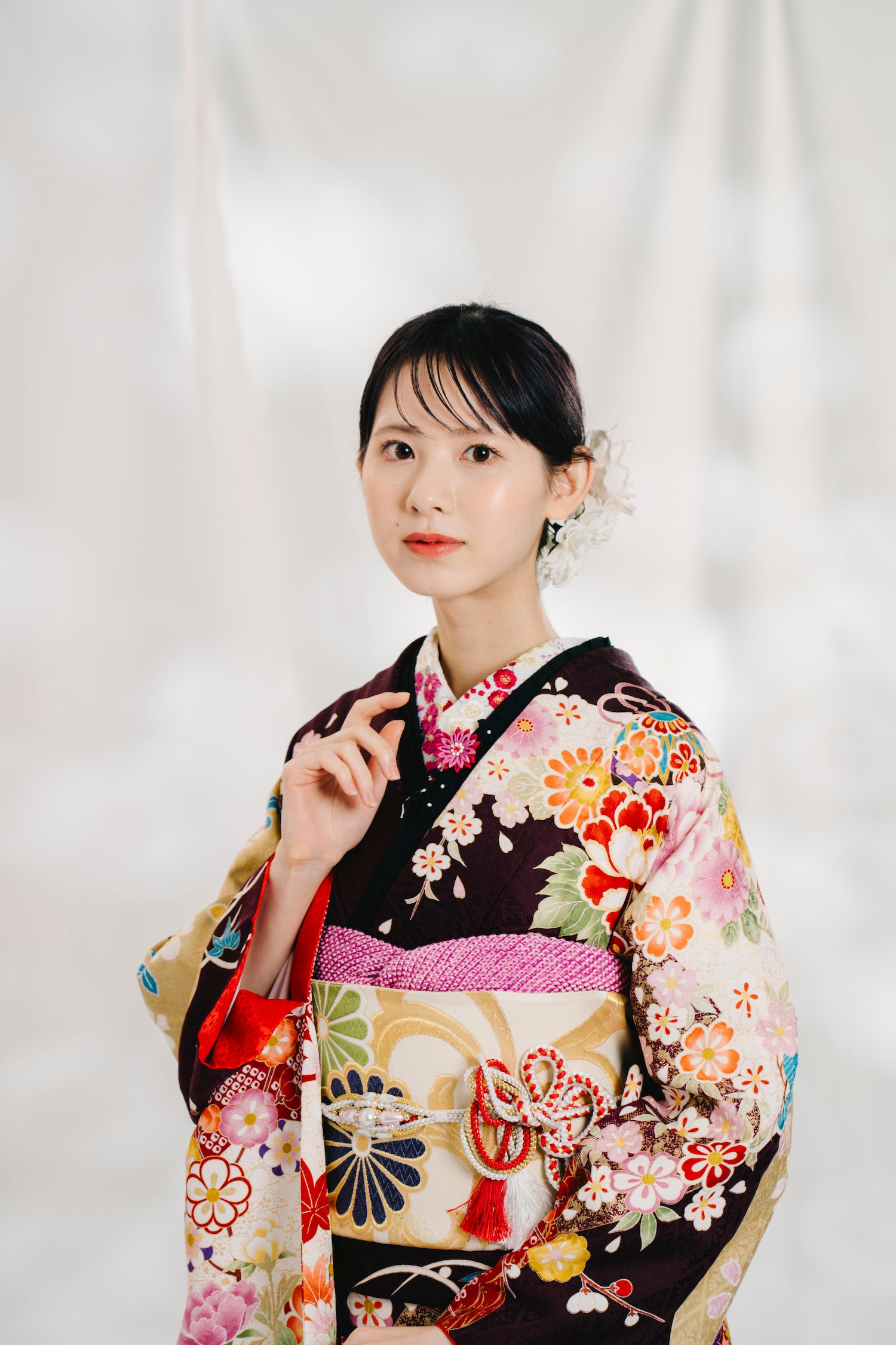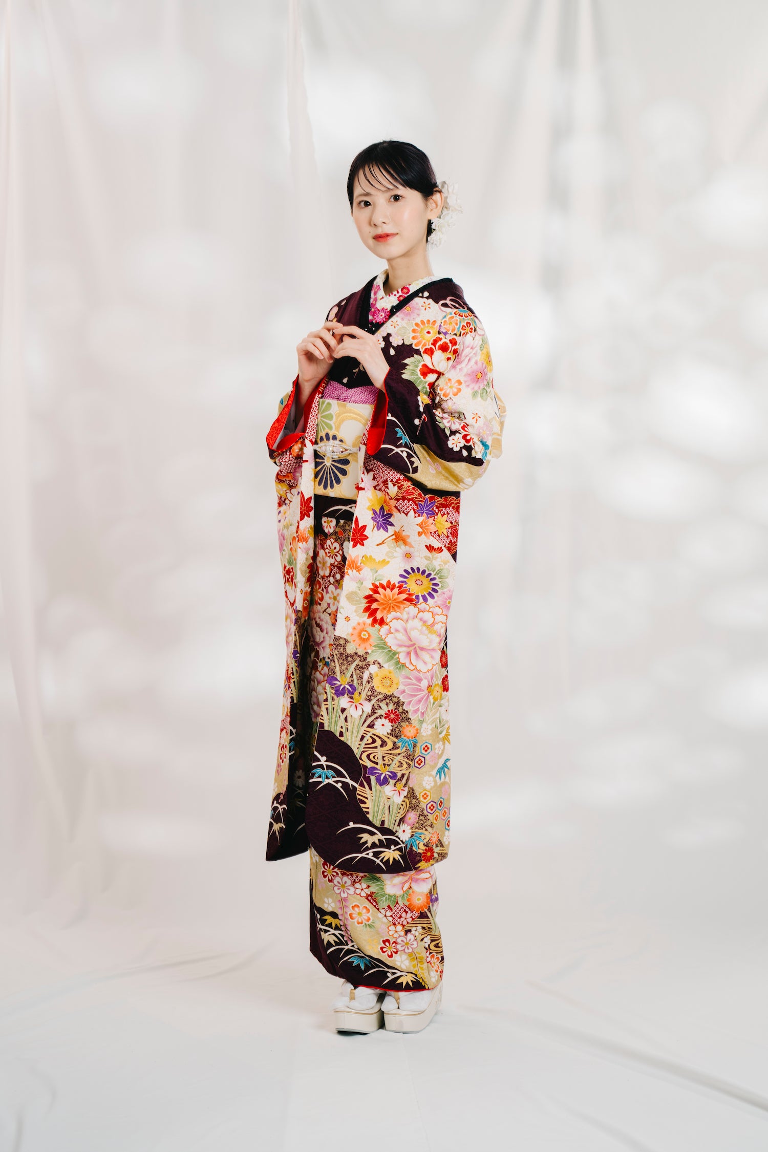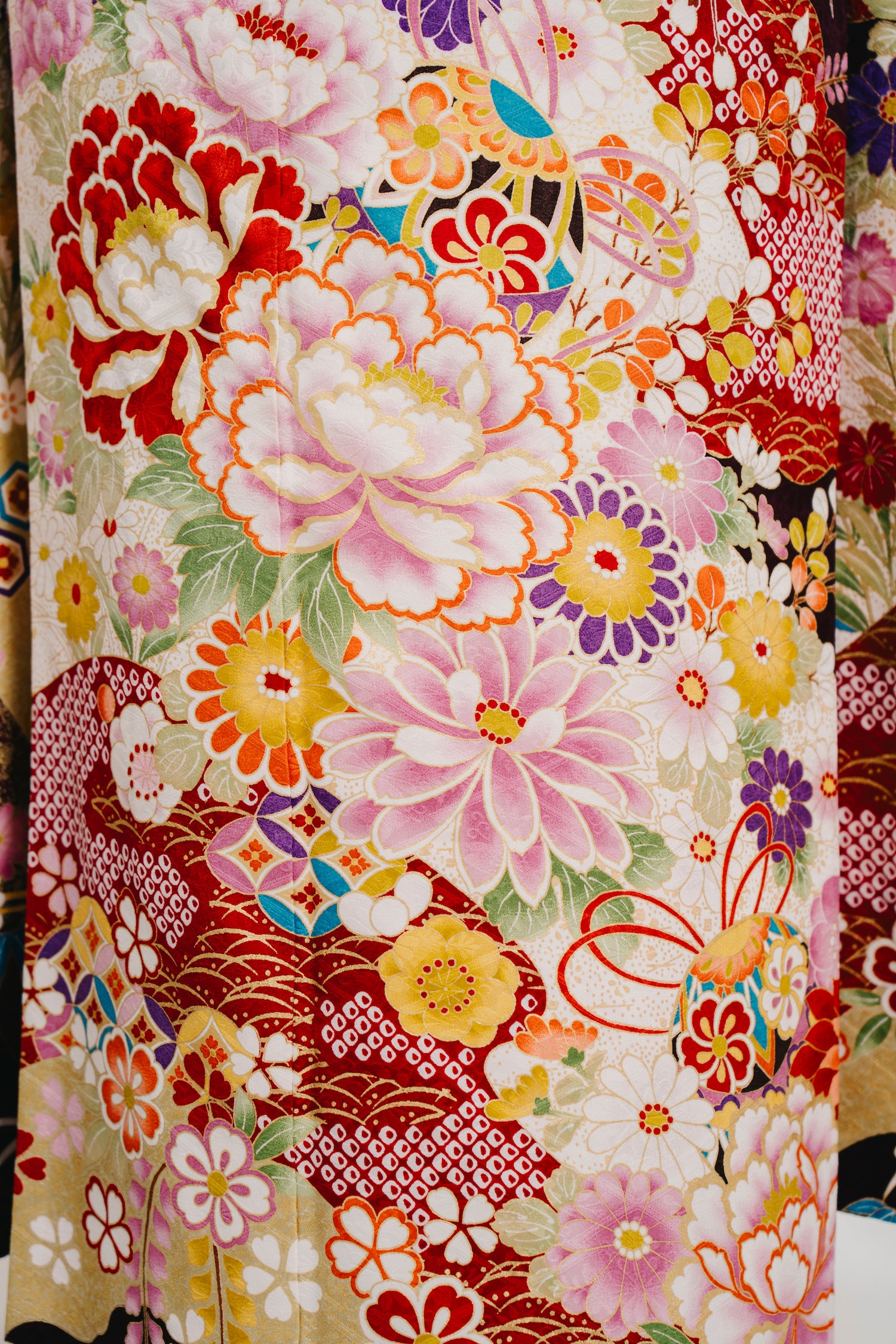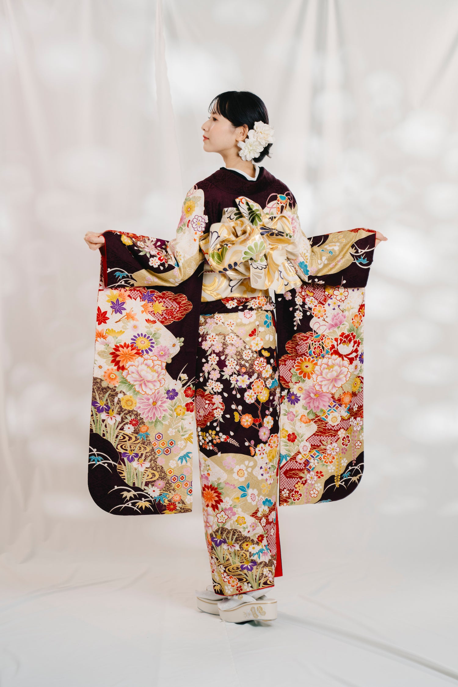 深い茶色地に色とりどりのお花が豪華な印象の一着。 衿元に黒の重ね衿を入れ、かっこいい印象にまとめて。