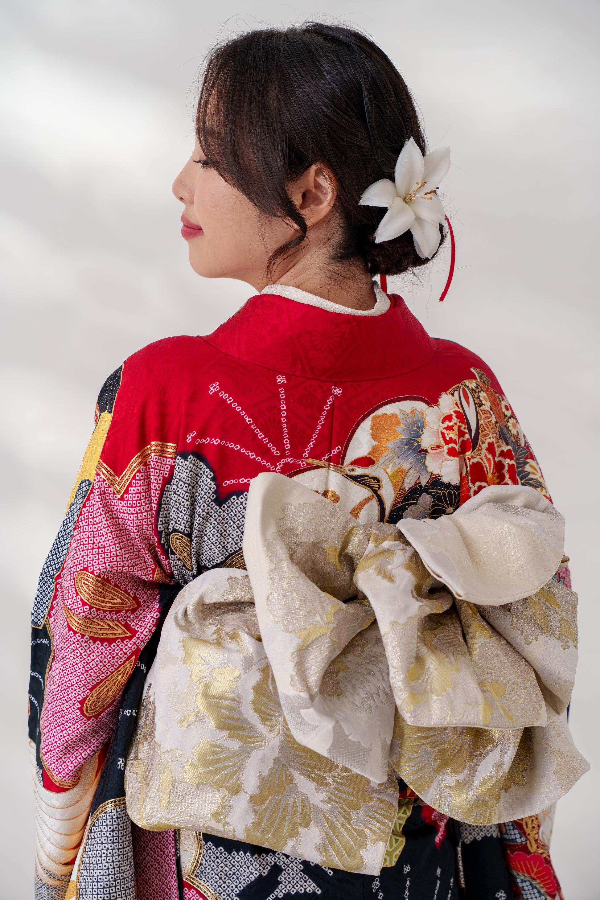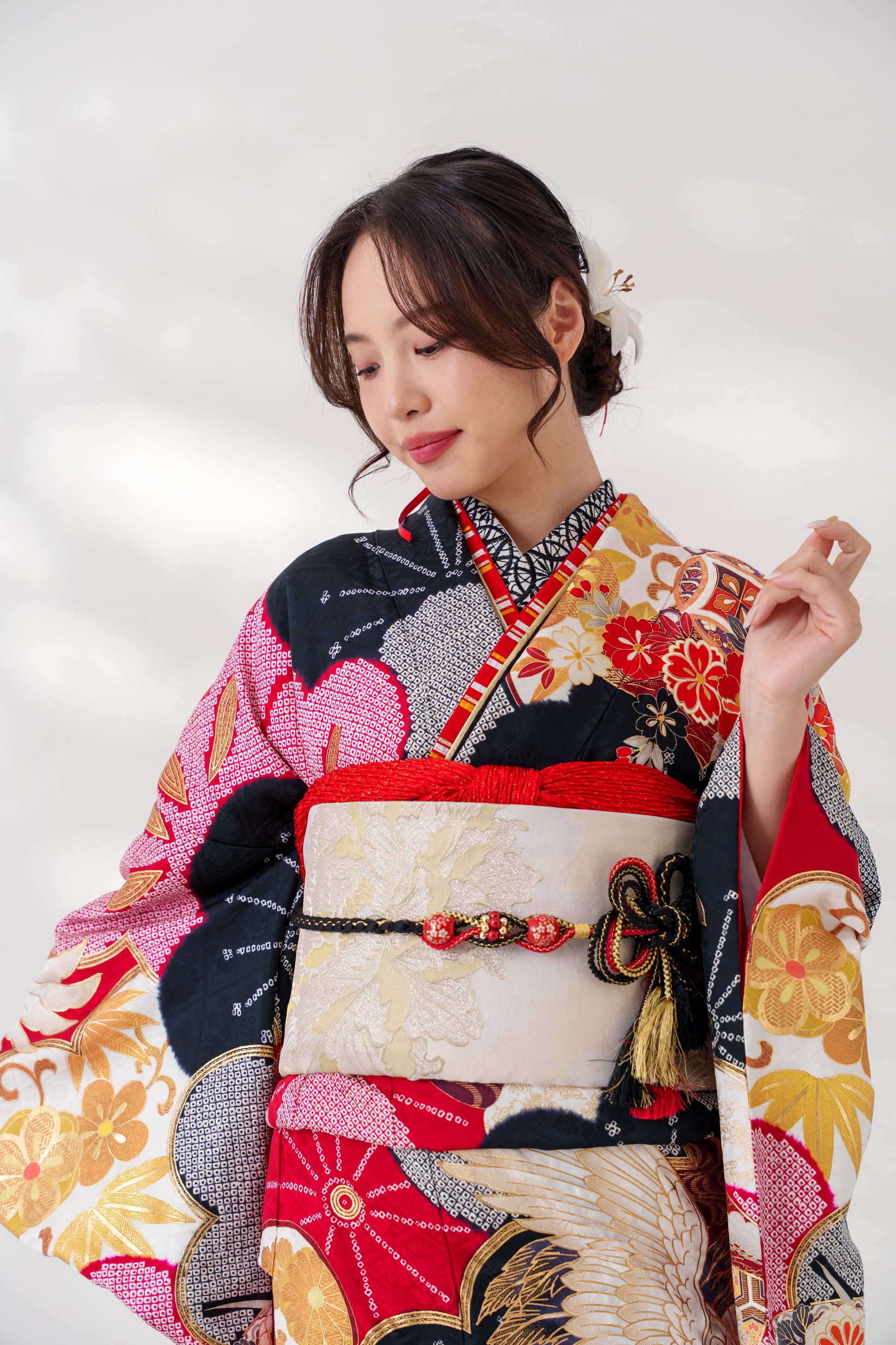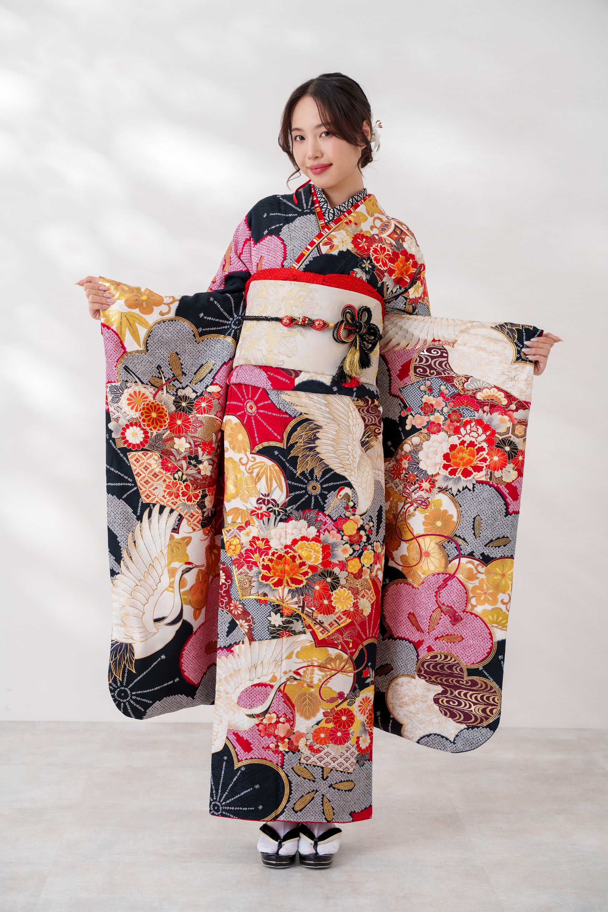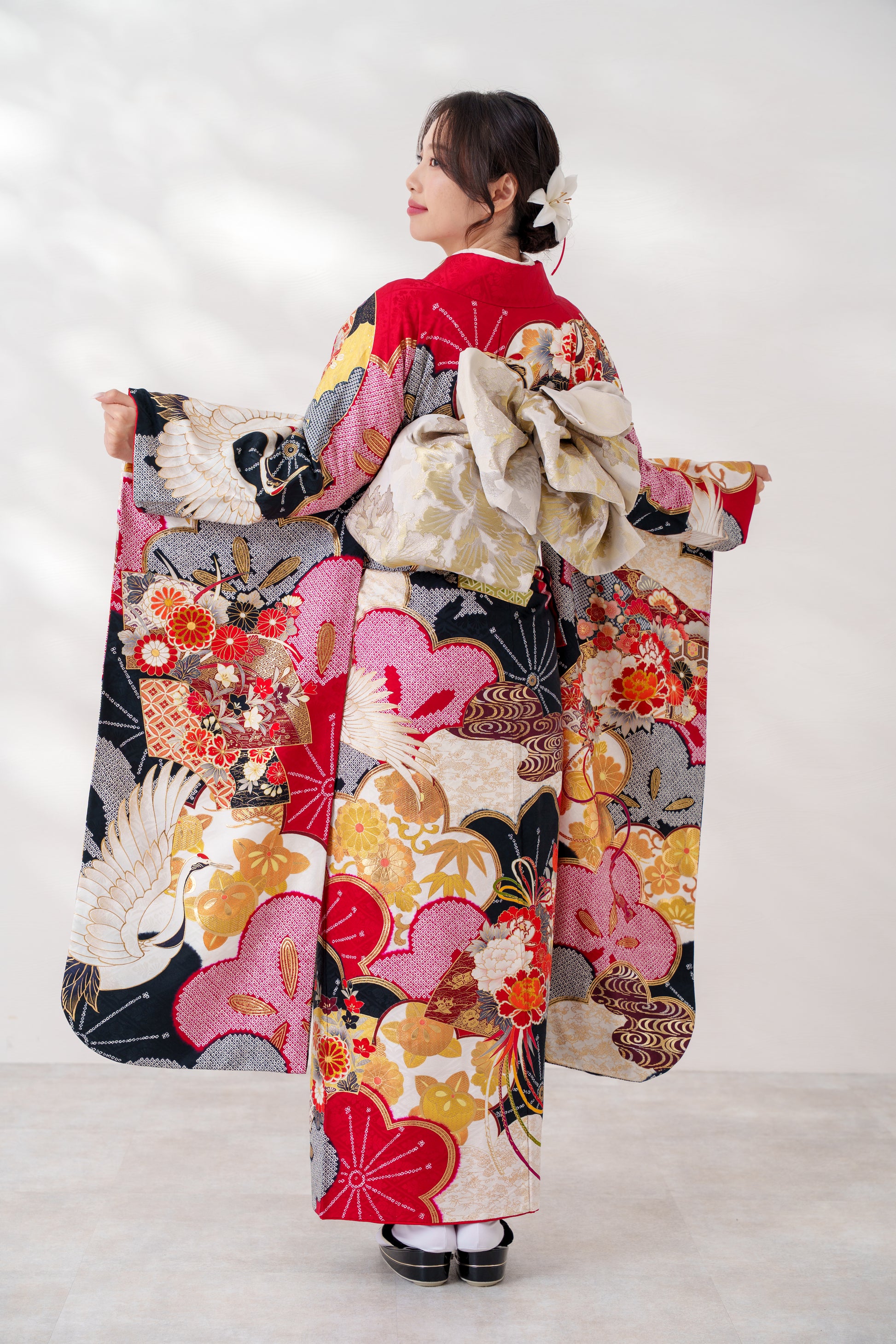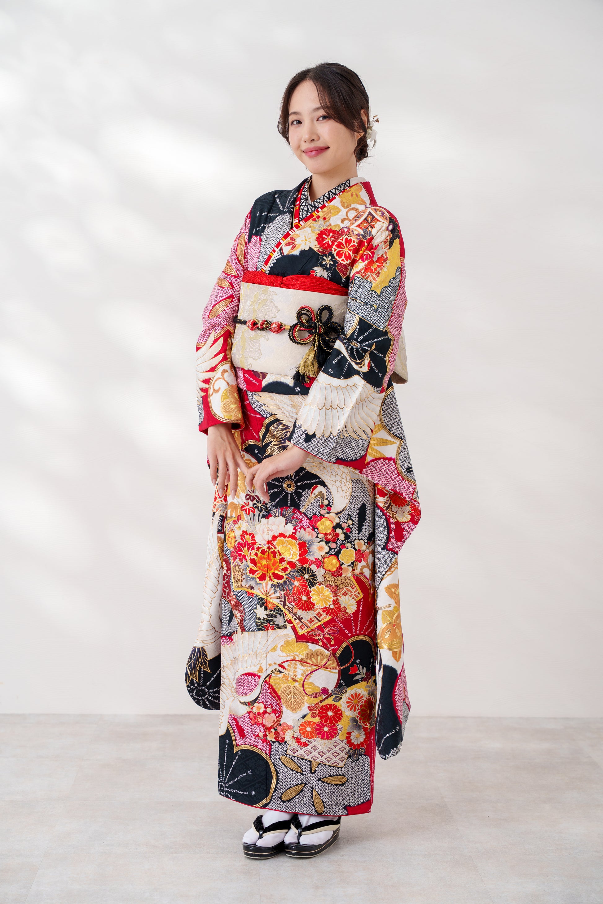 大きな鶴が特徴的な一着。白や赤の小物でさらにおしゃれな雰囲気に。