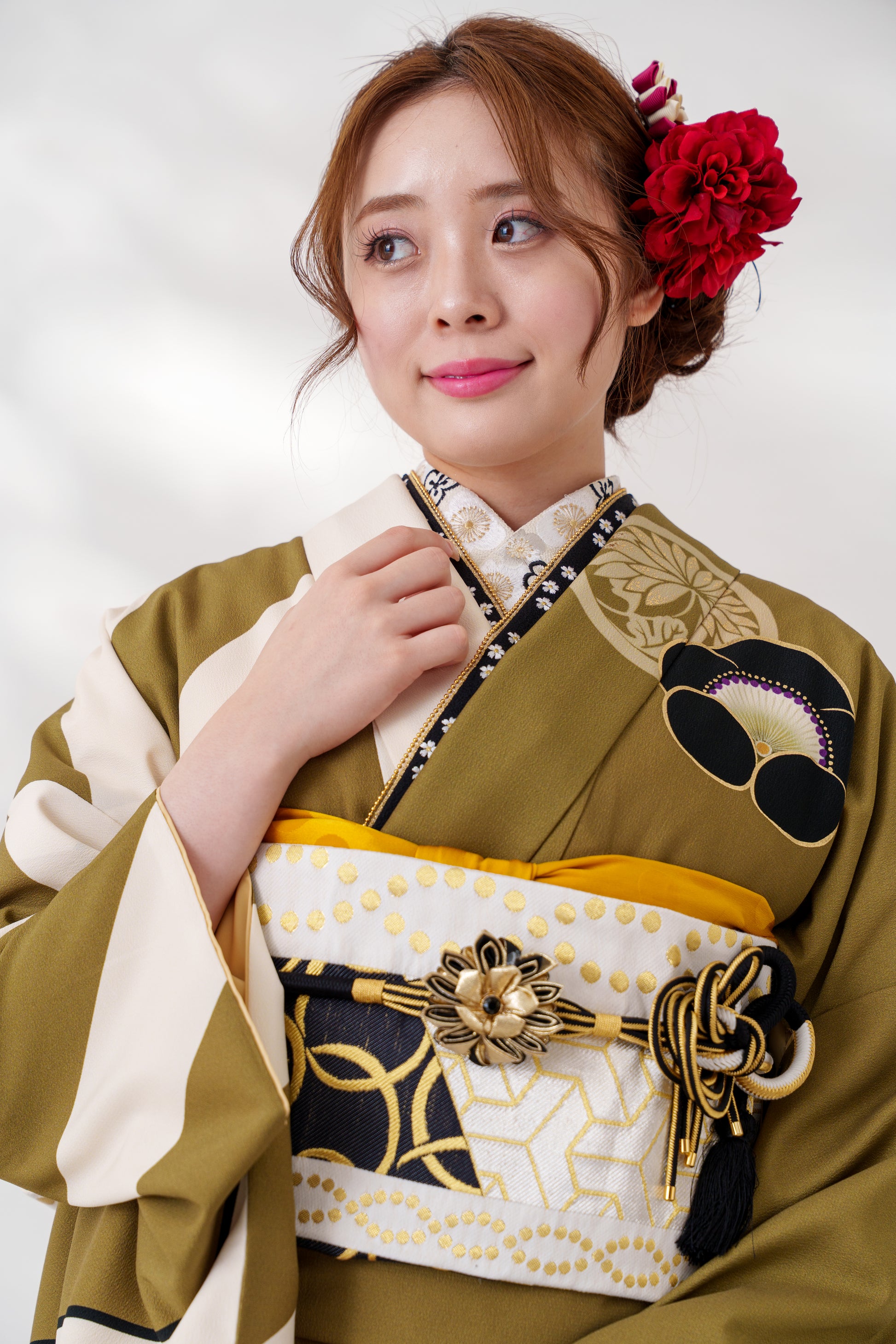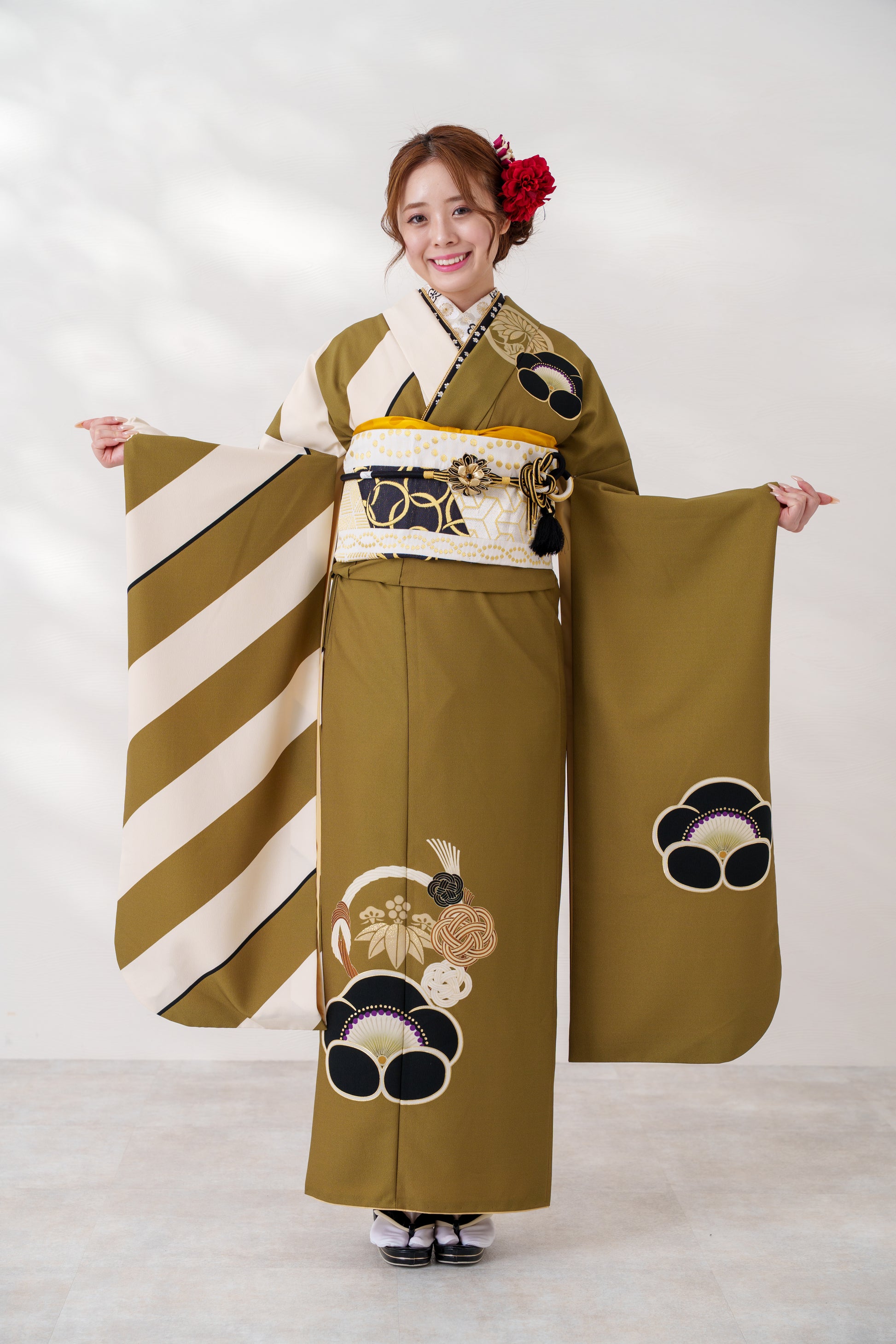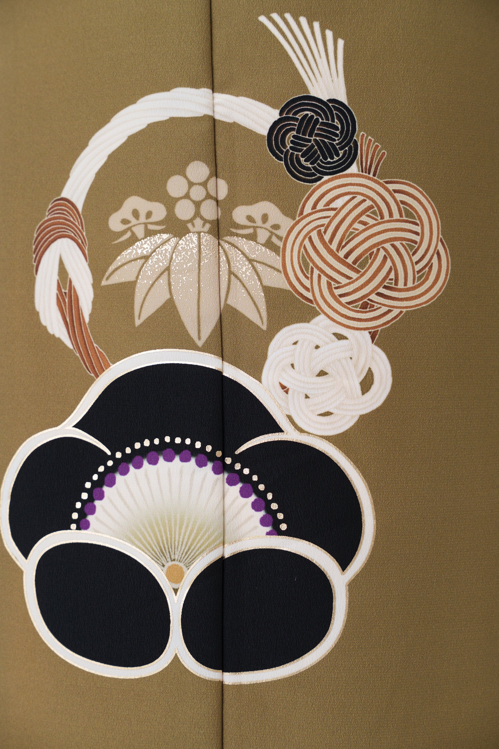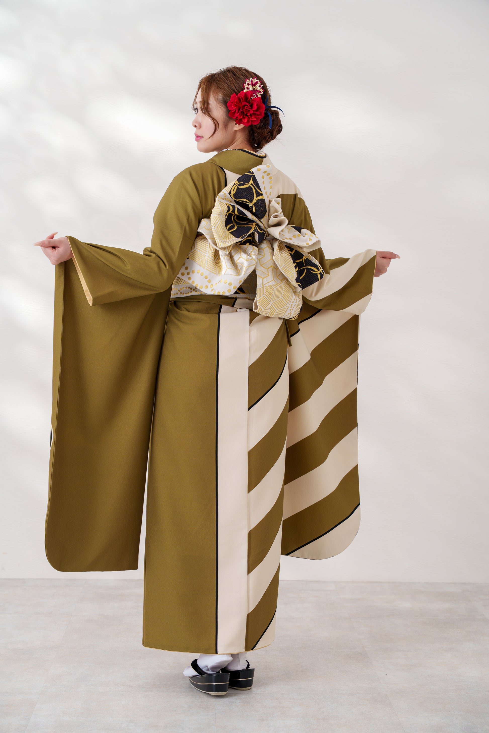 黒のワンポイント梅が珍しい一着。片側のストライプもおしゃれな雰囲気に。