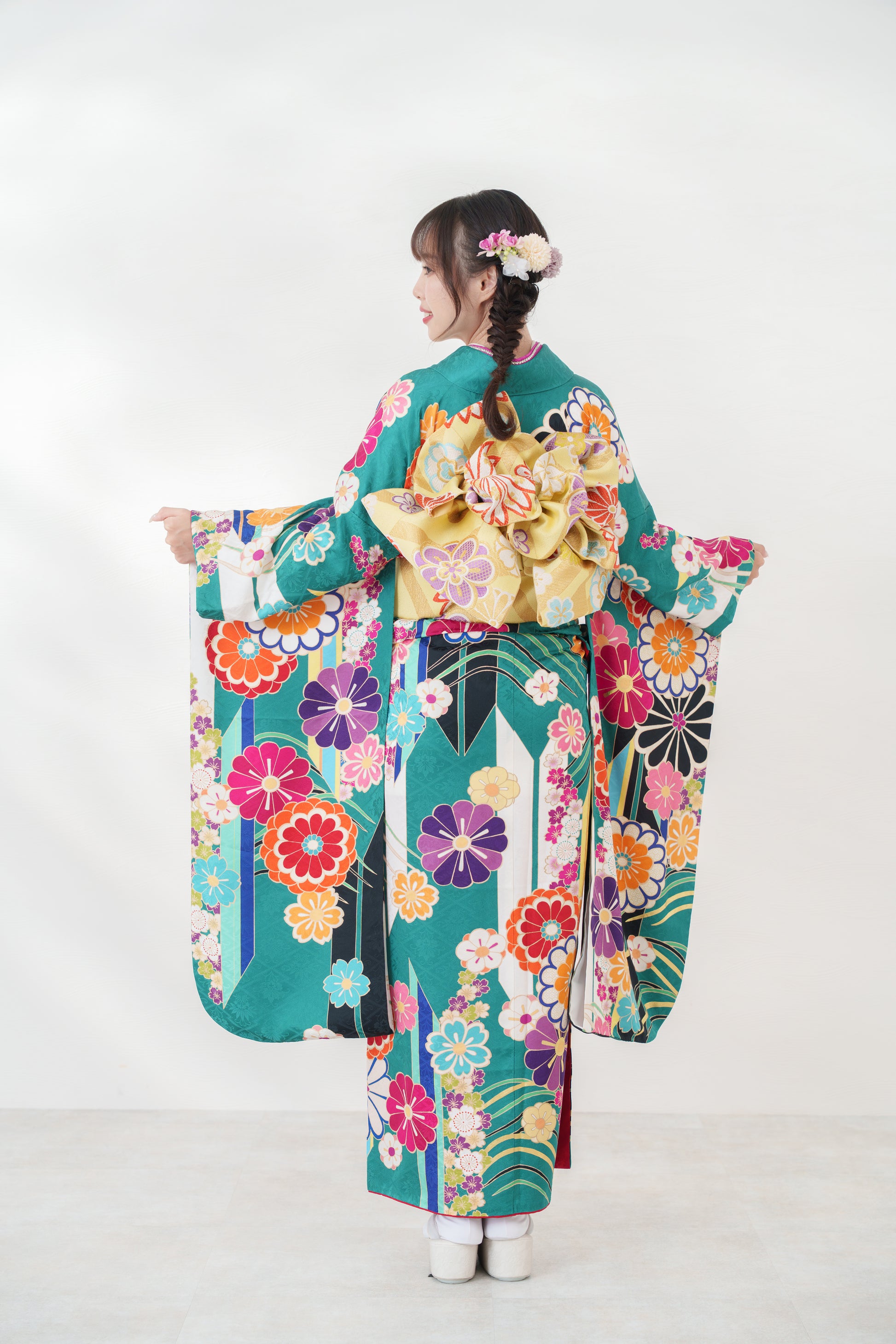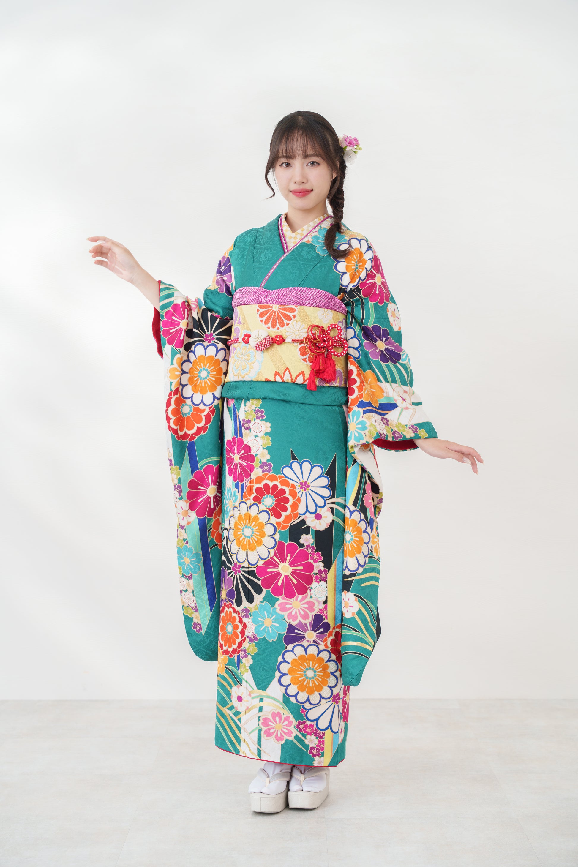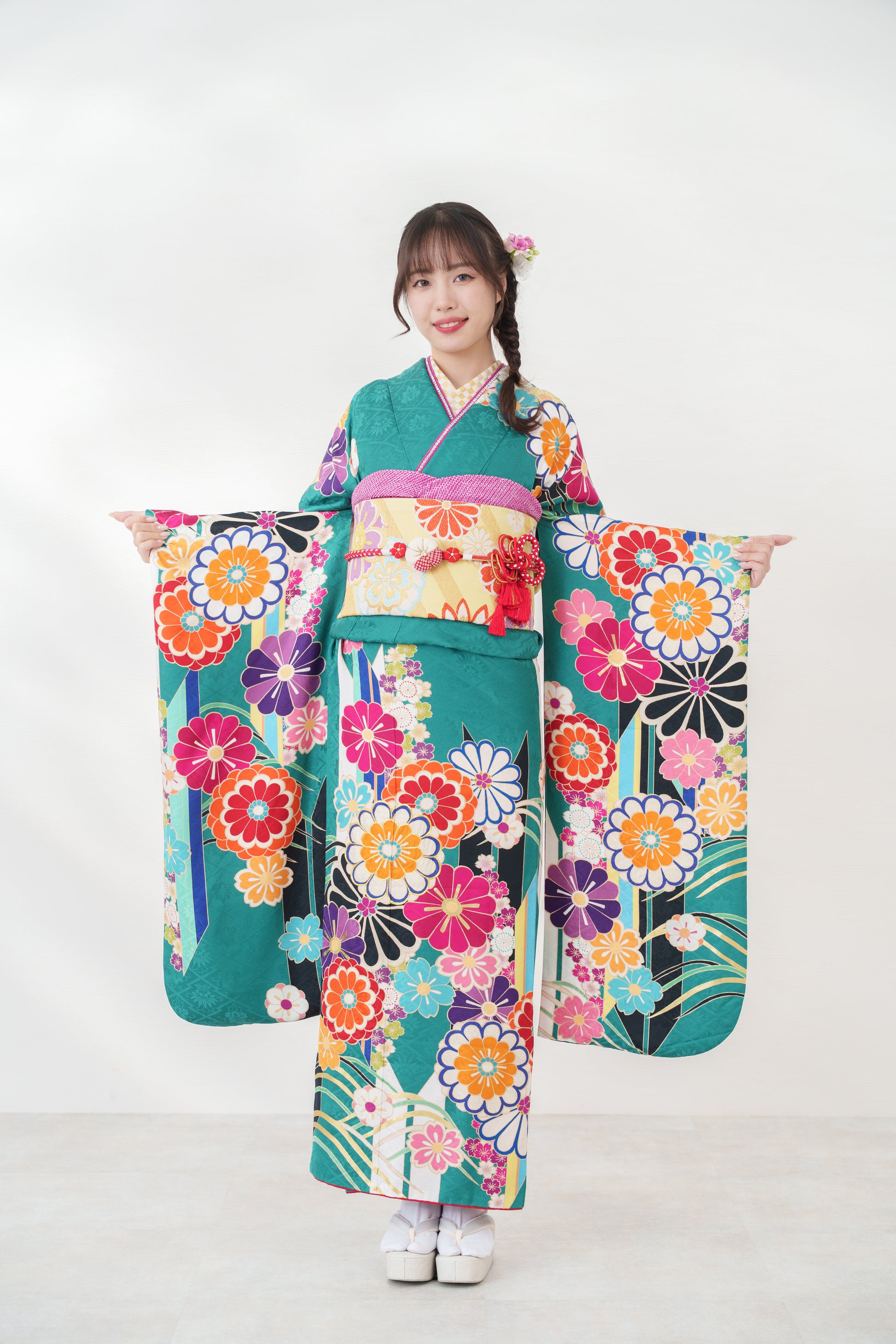 カラフルな菊の花が目を引き一着。ポップな小物でまとめて個性的な雰囲気に