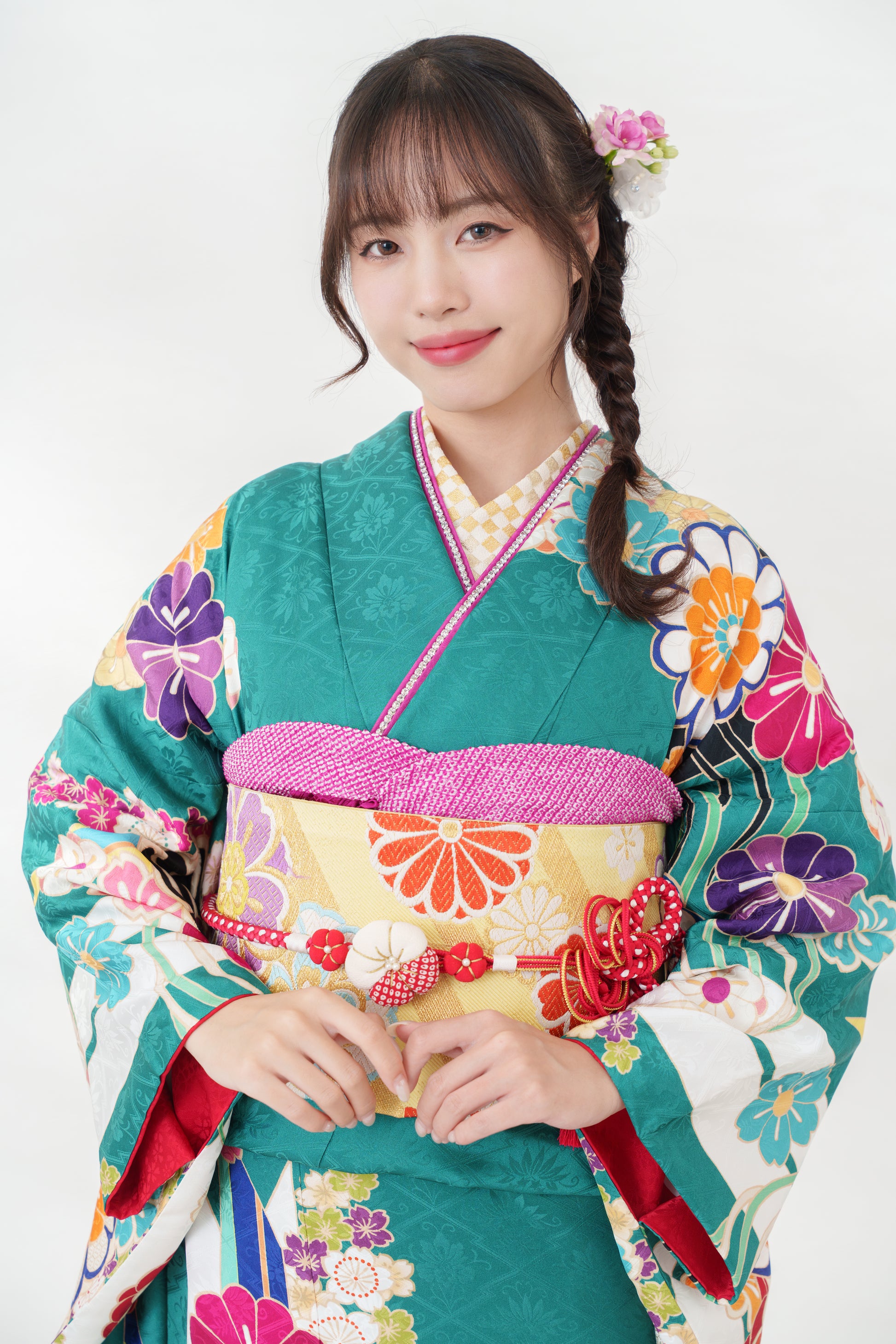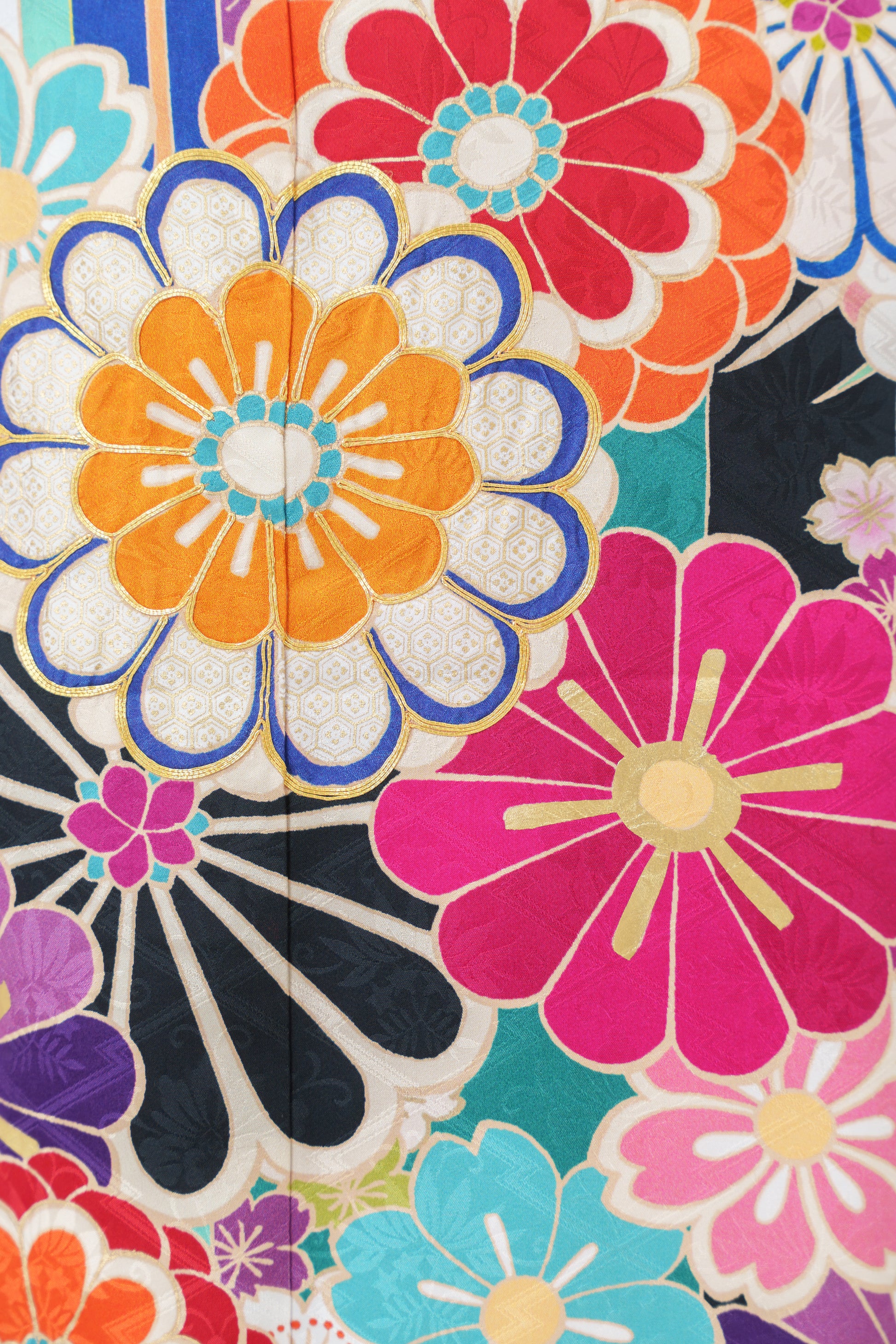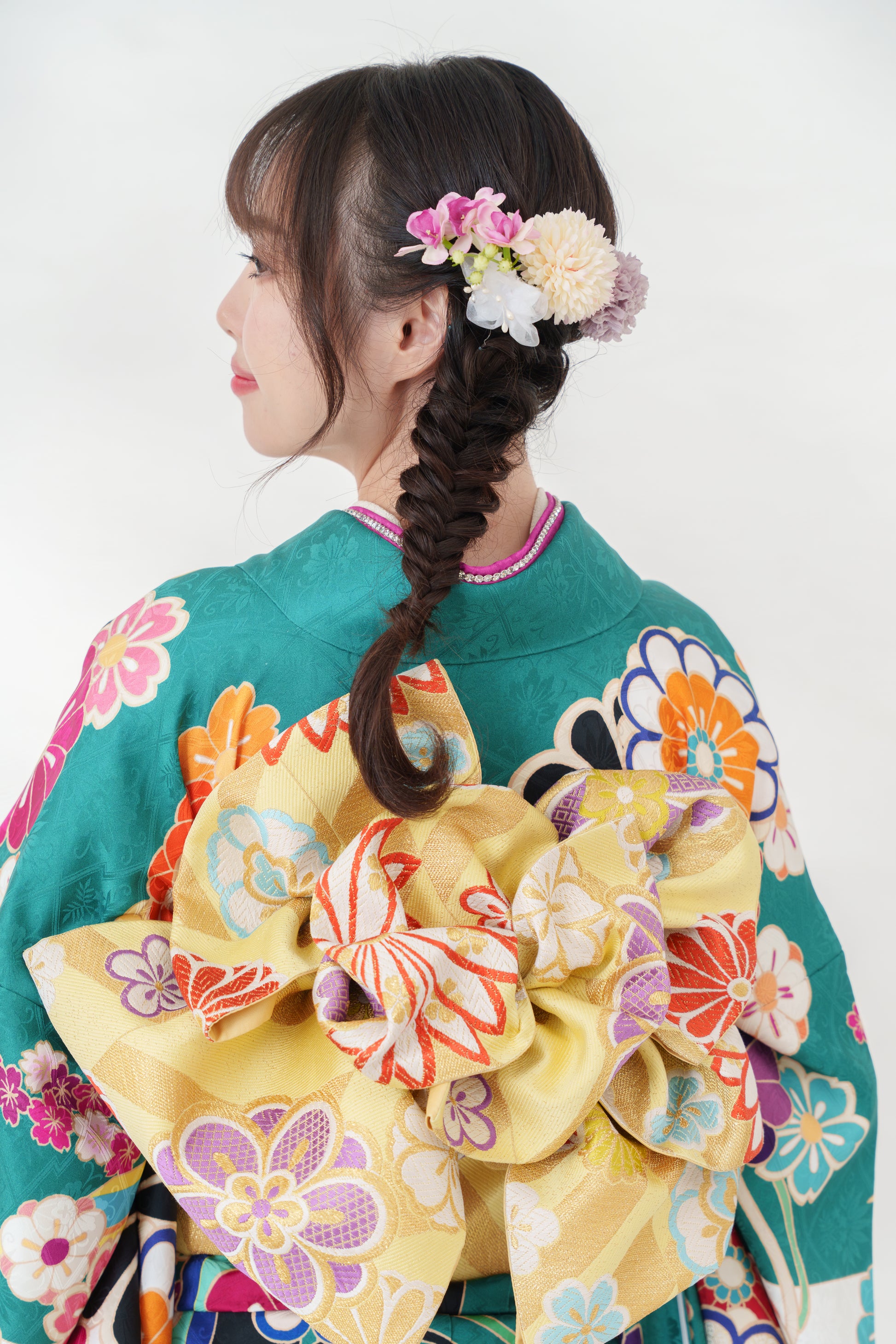 カラフルな菊の花が目を引き一着。ポップな小物でまとめて個性的な雰囲気に