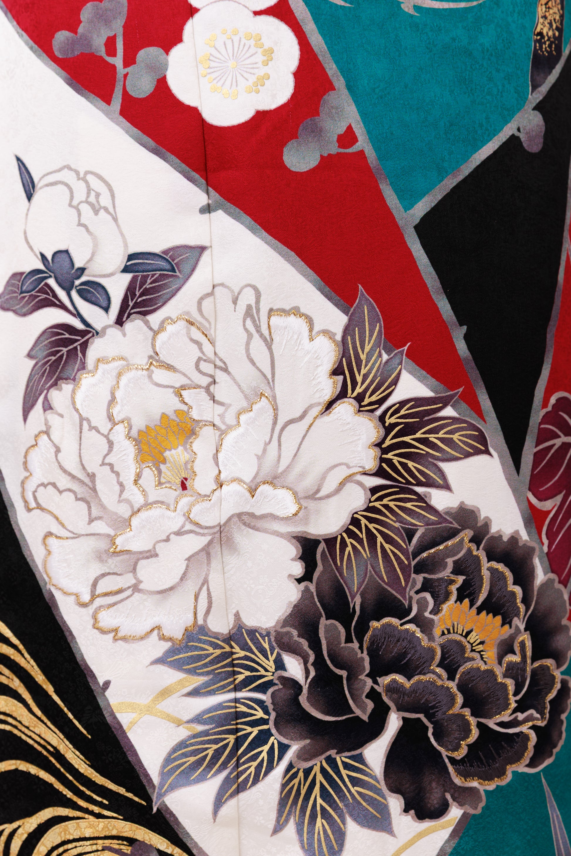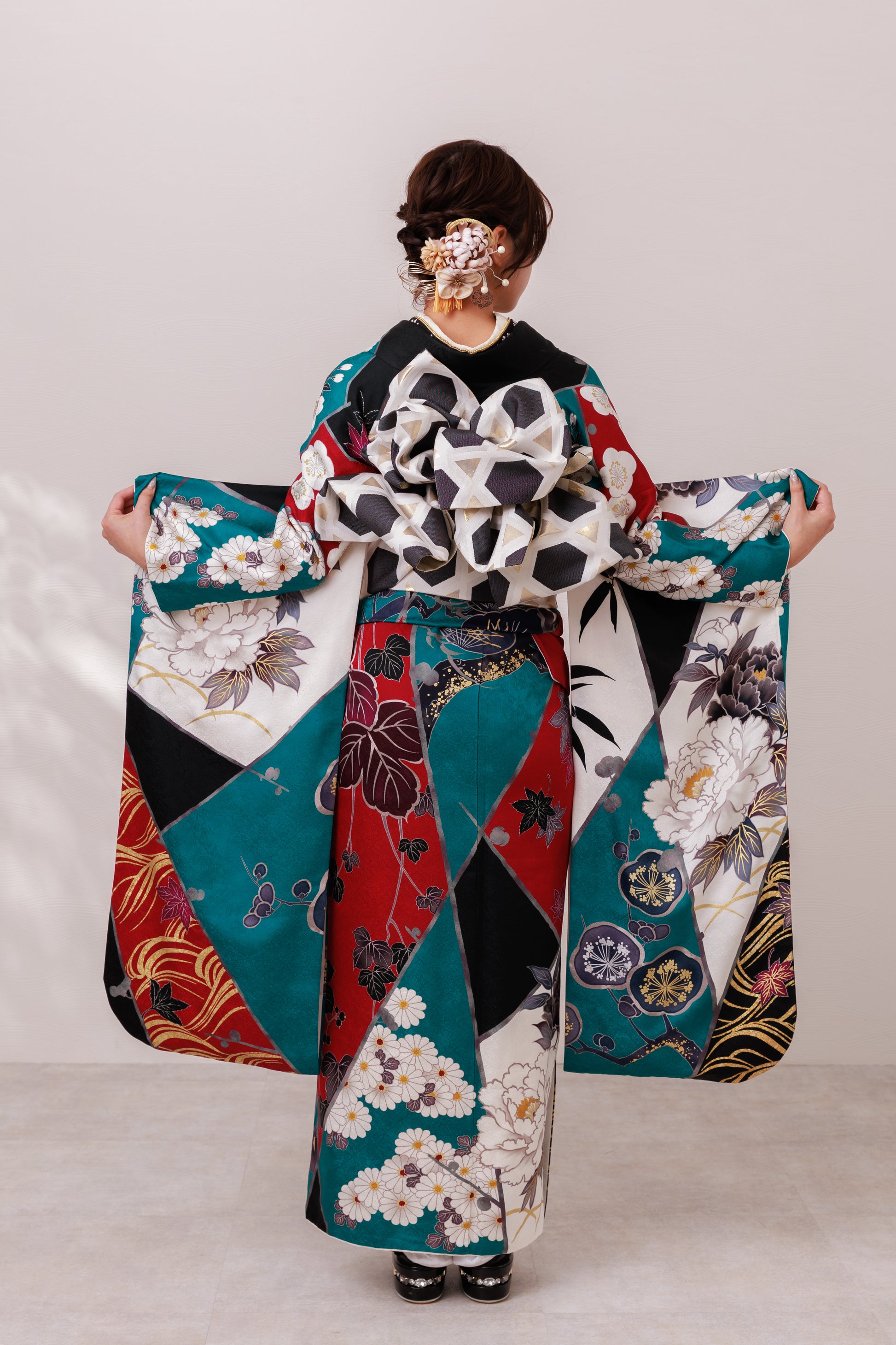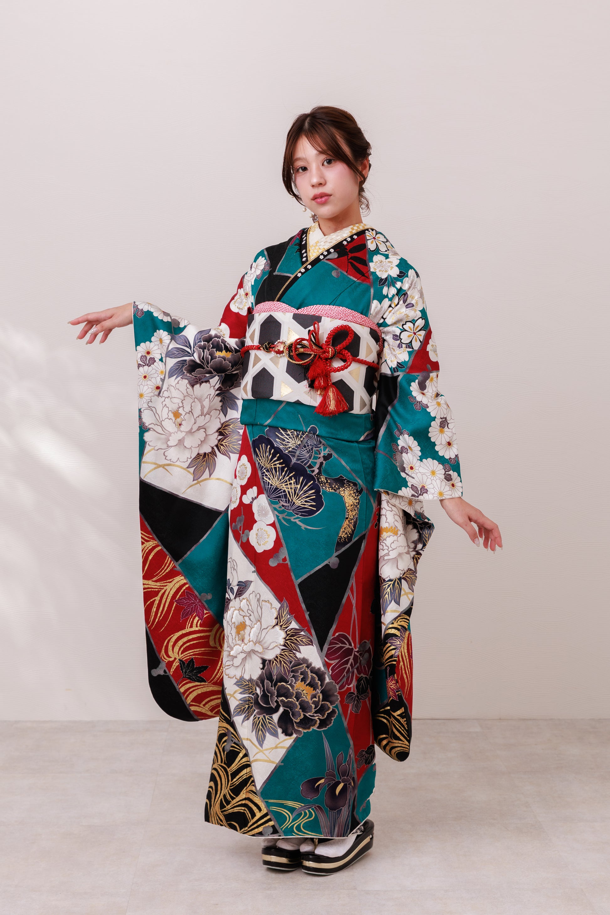 めずらしい青緑の地色に、黒と白の牡丹がかっこよく映える振袖。