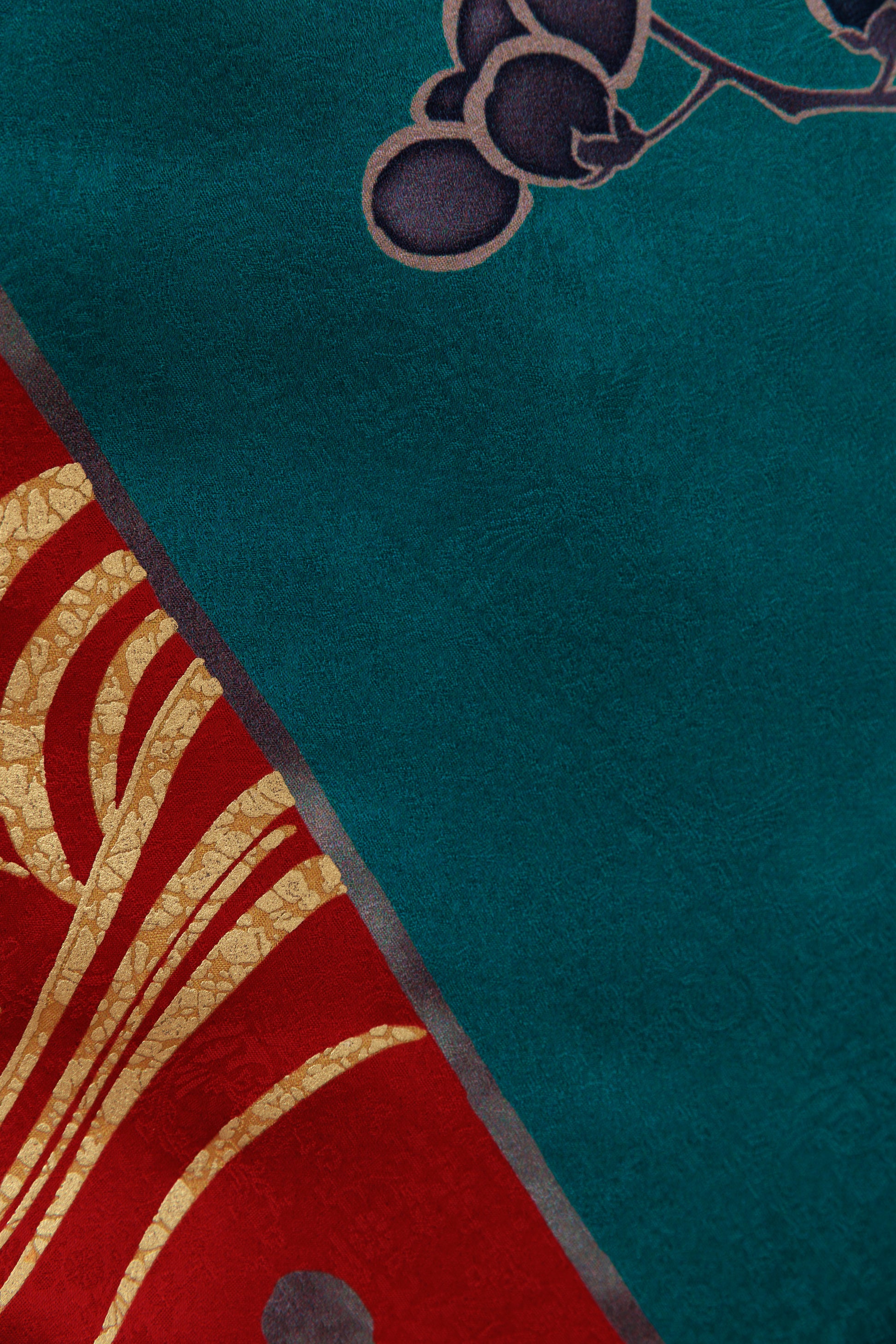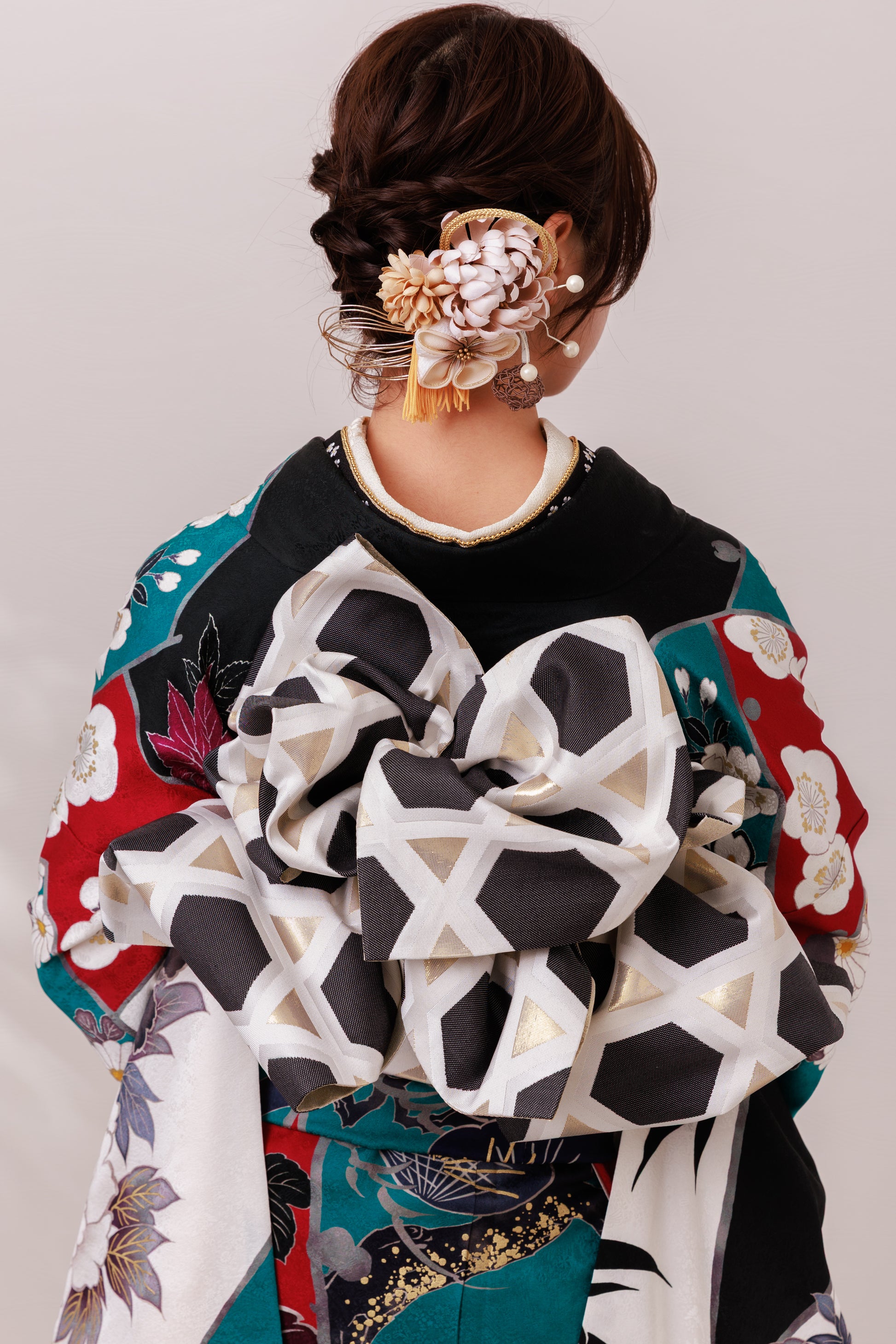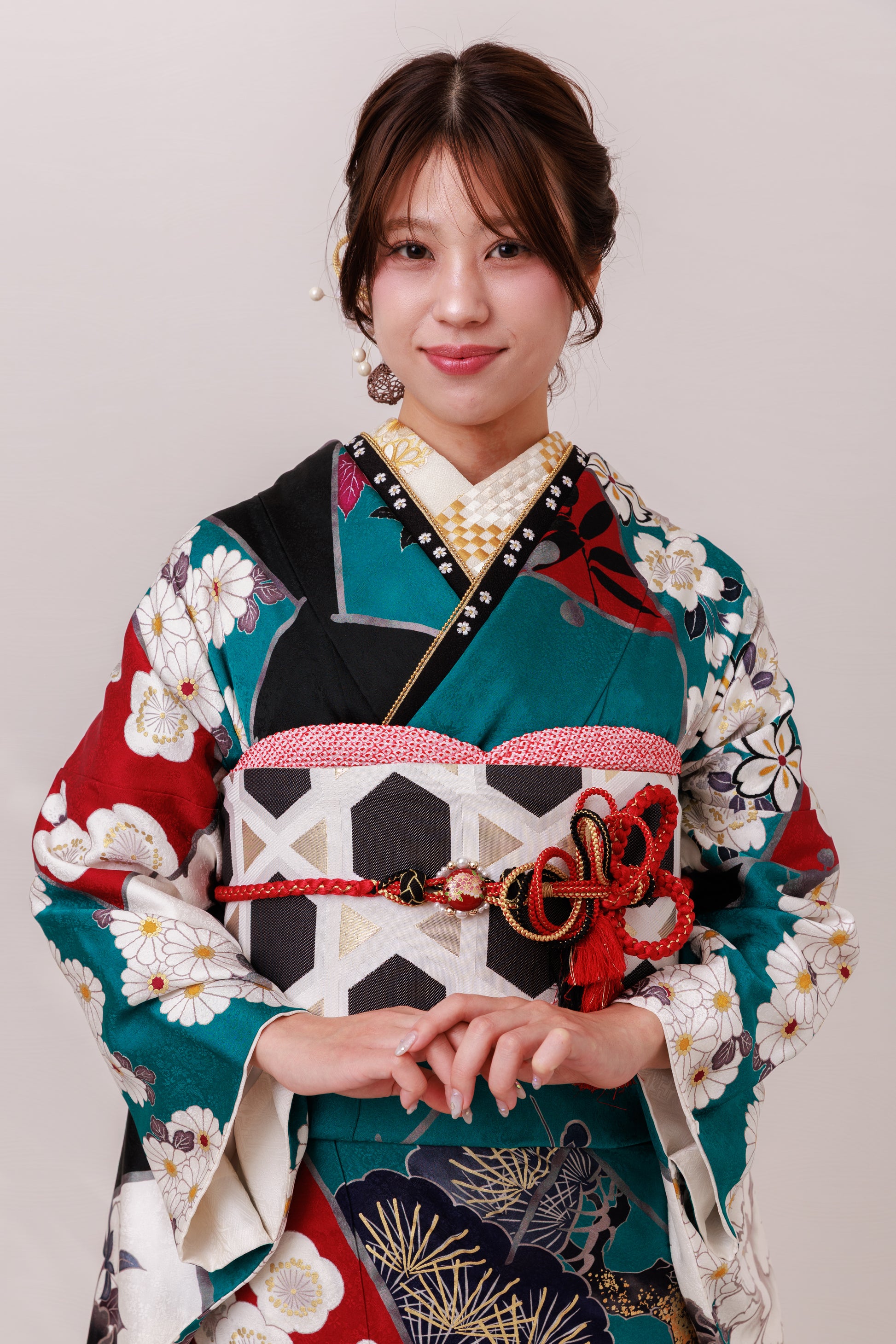 めずらしい青緑の地色に、黒と白の牡丹がかっこよく映える振袖。