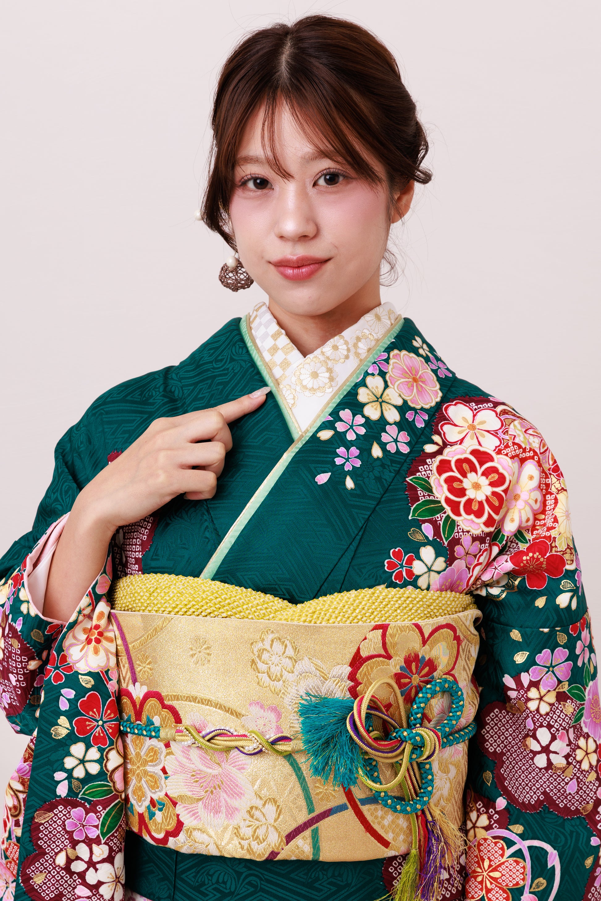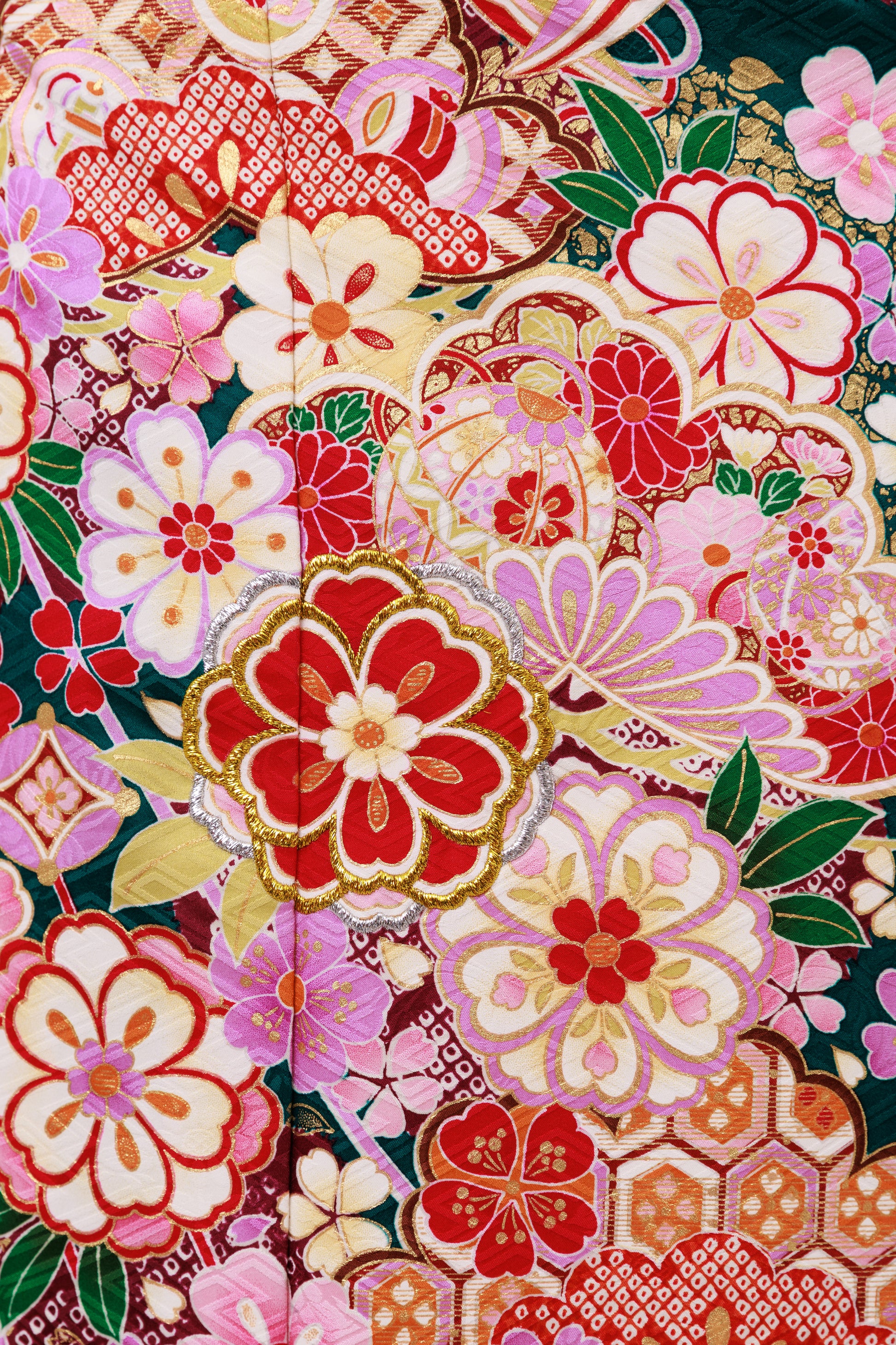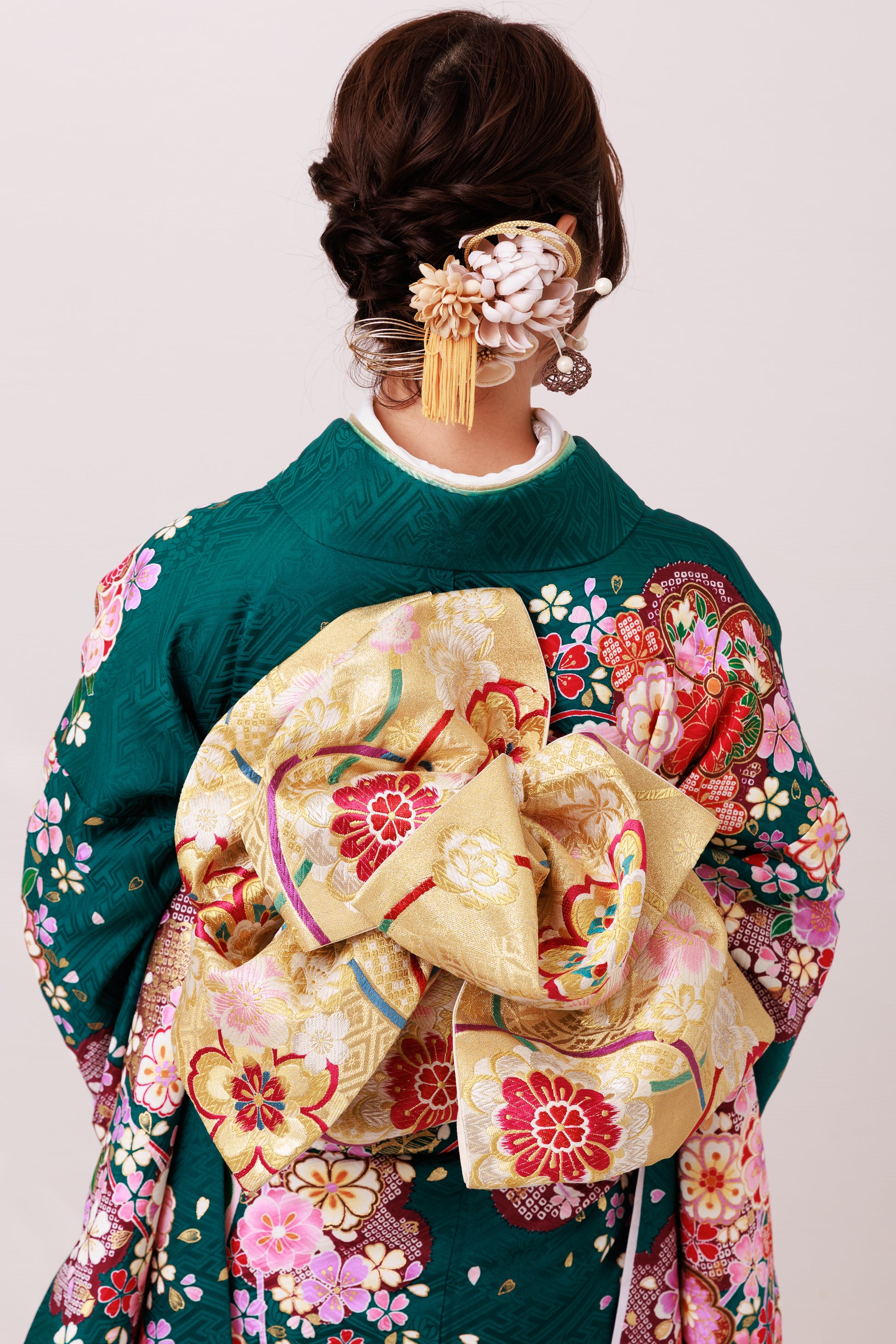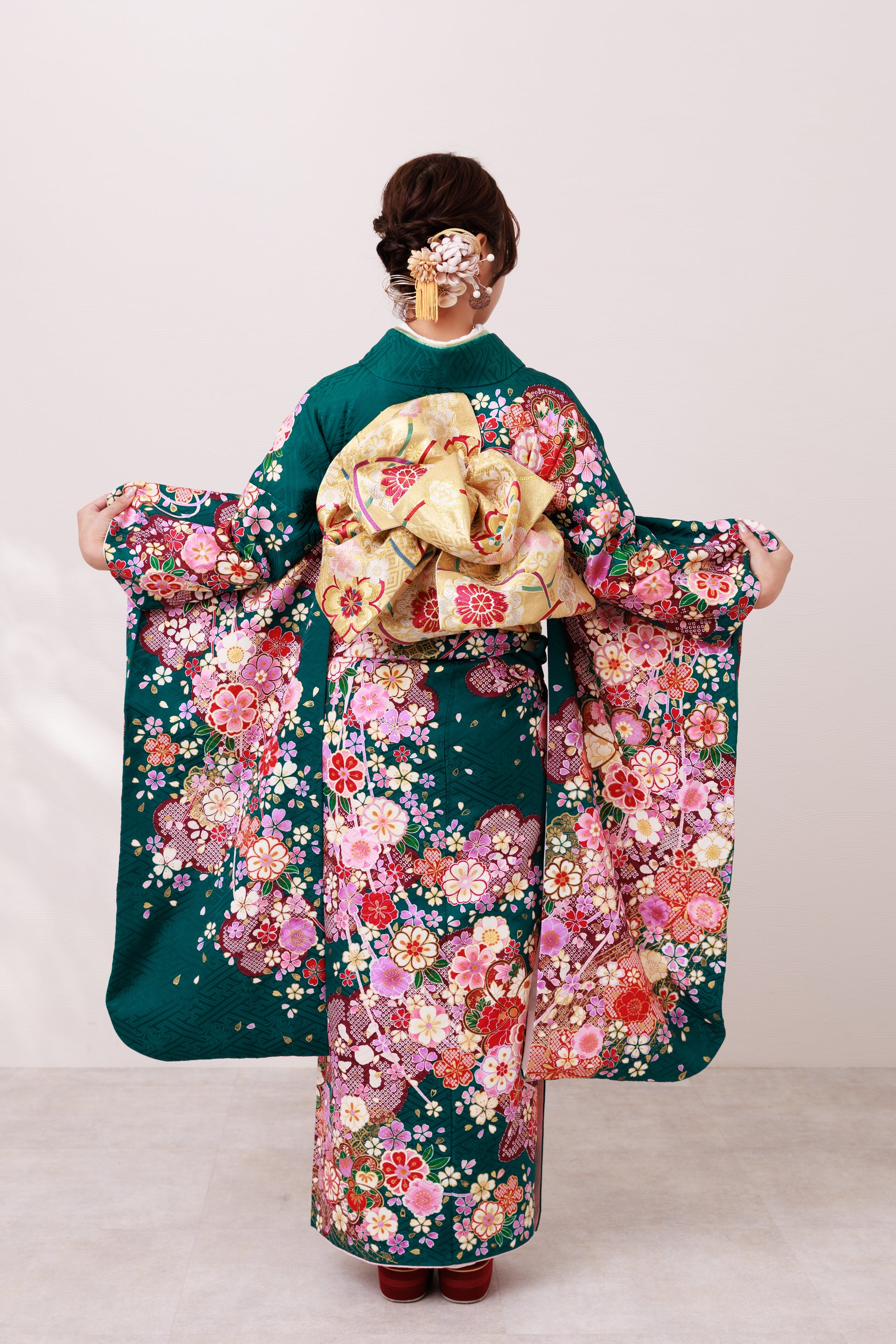 大人気の緑の地に、花々が華やかに咲き誇る一着。全体に咲く桜や菊の花が可憐さを引き立てます。柔らかな色合いのコーディネートでどこから見ても美しく、晴れの日にふさわしい装いに仕上がります。