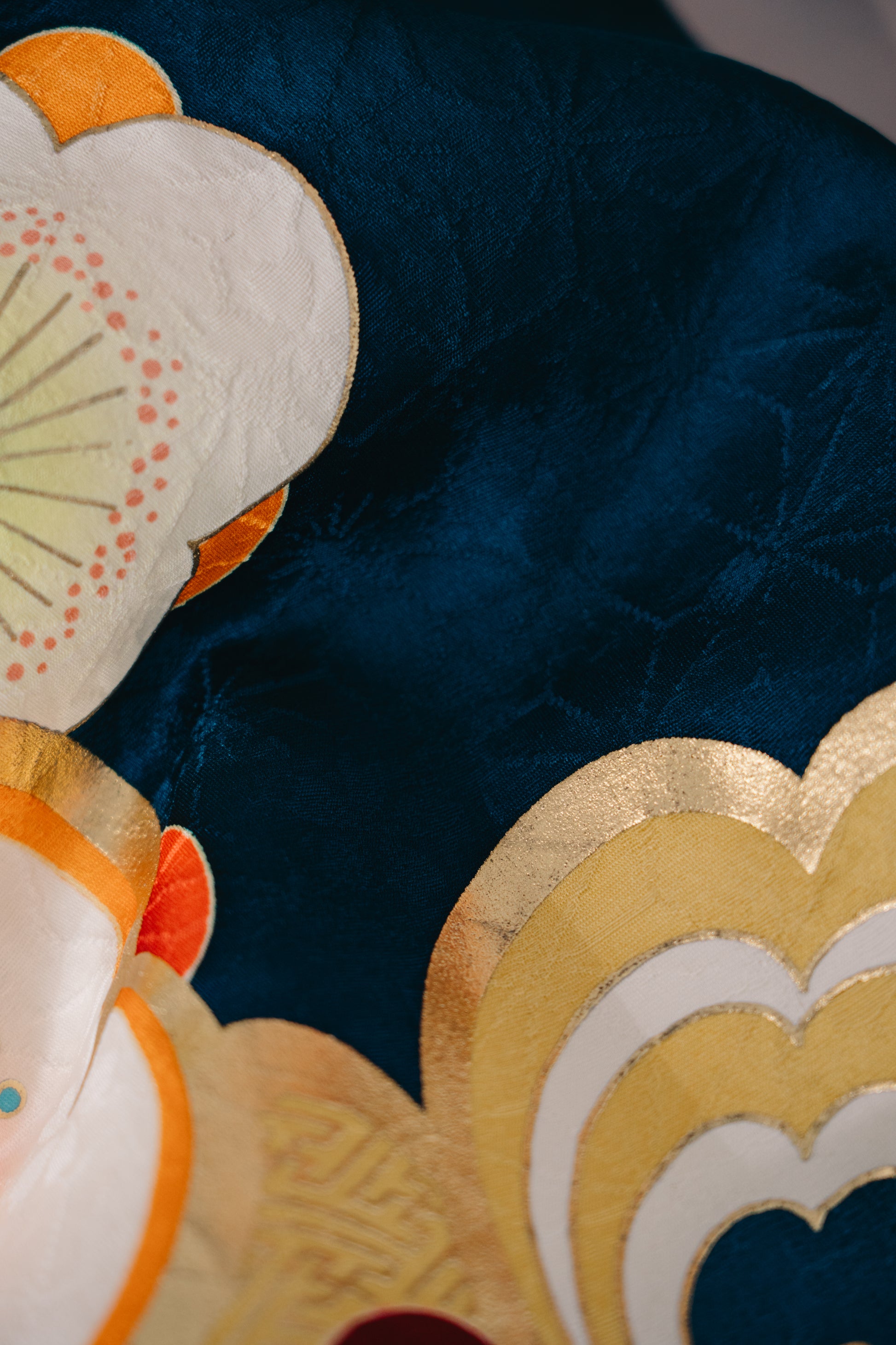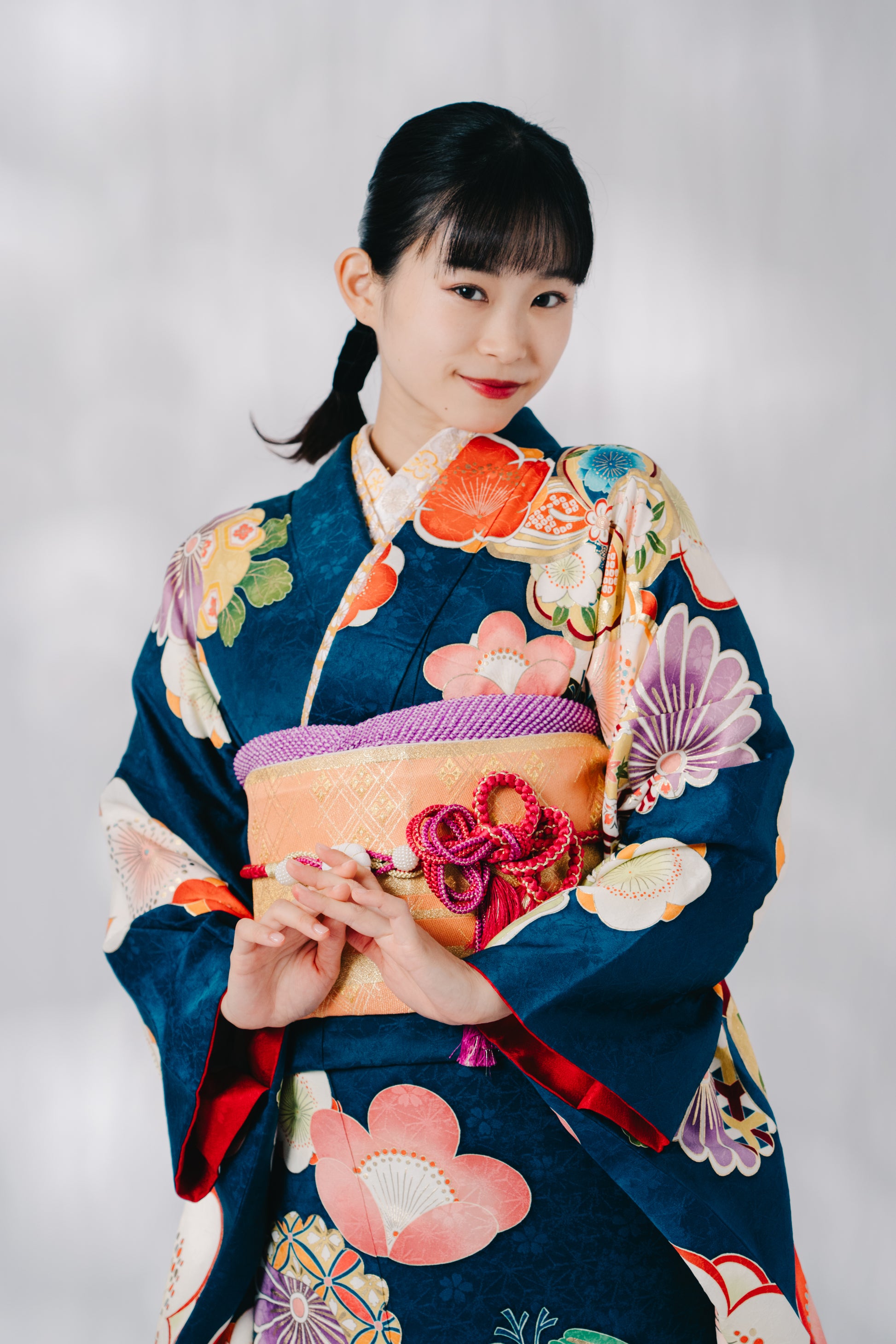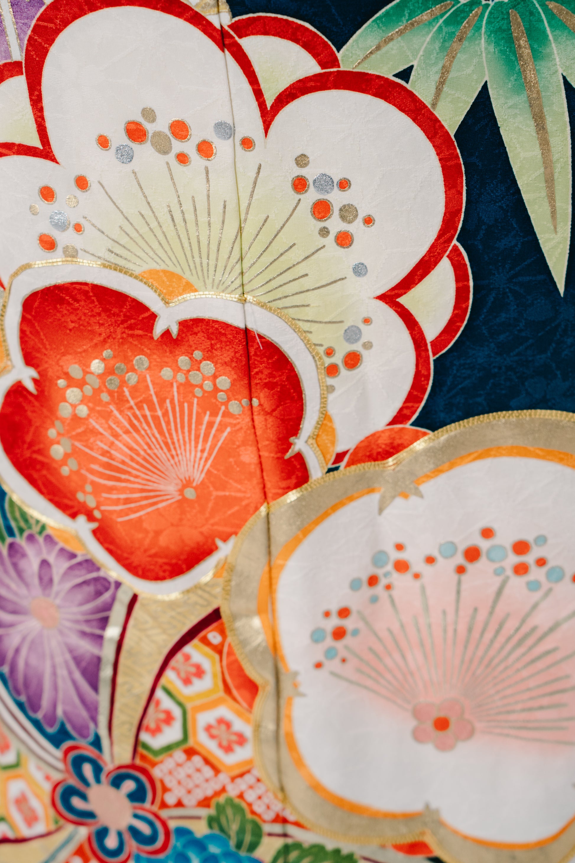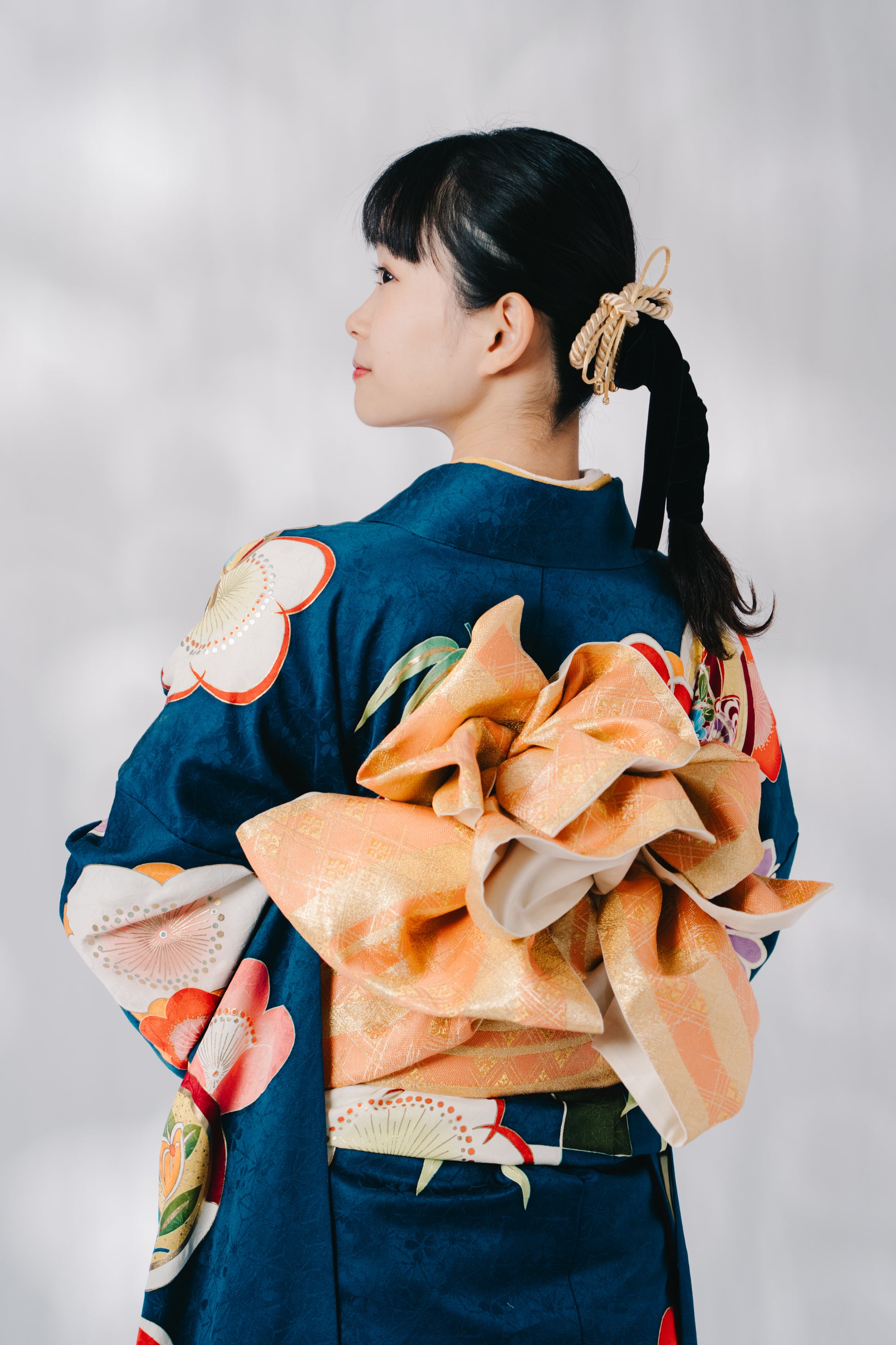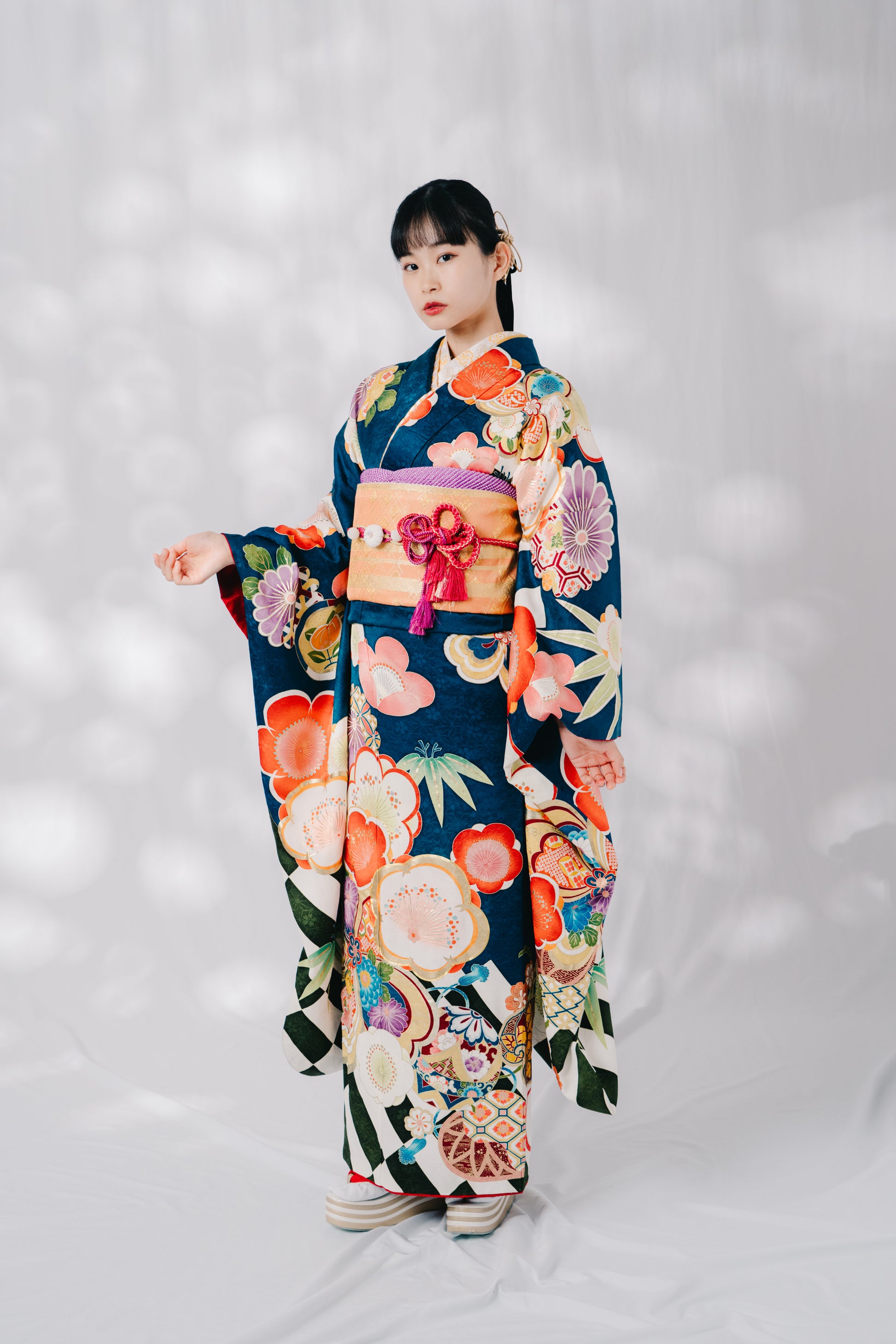 青緑に大きな梅の花をあしらったポップな一着。帯周りの小物には紫、赤を使い可愛らしい雰囲気に