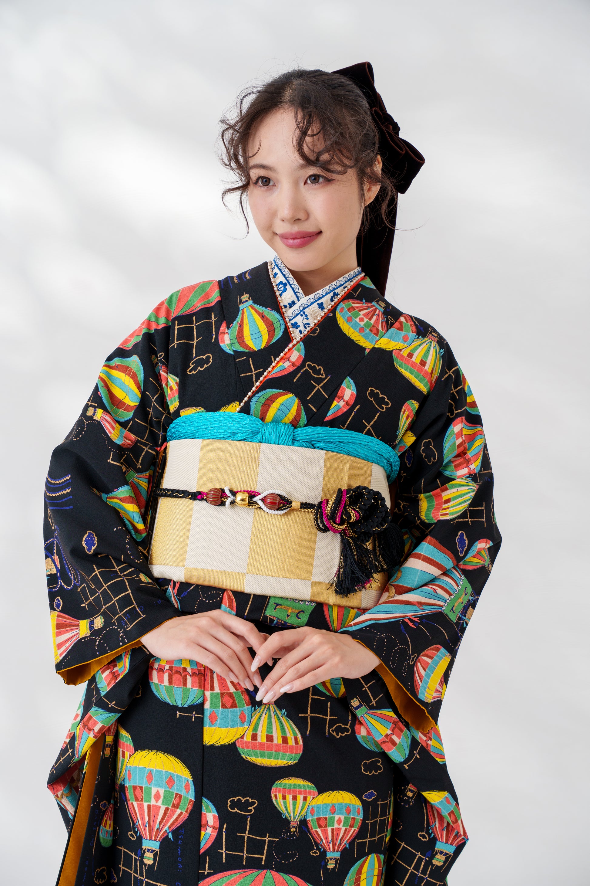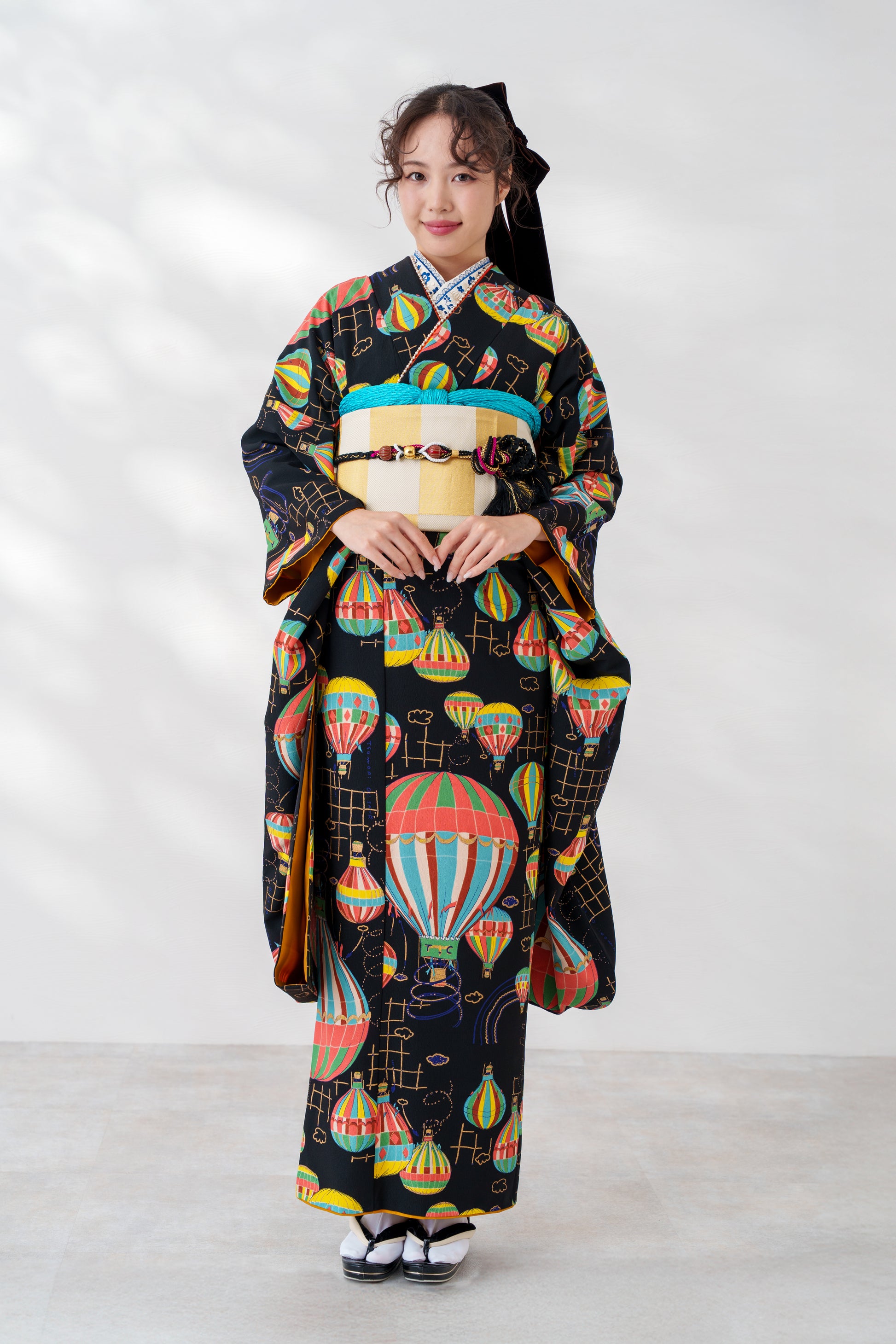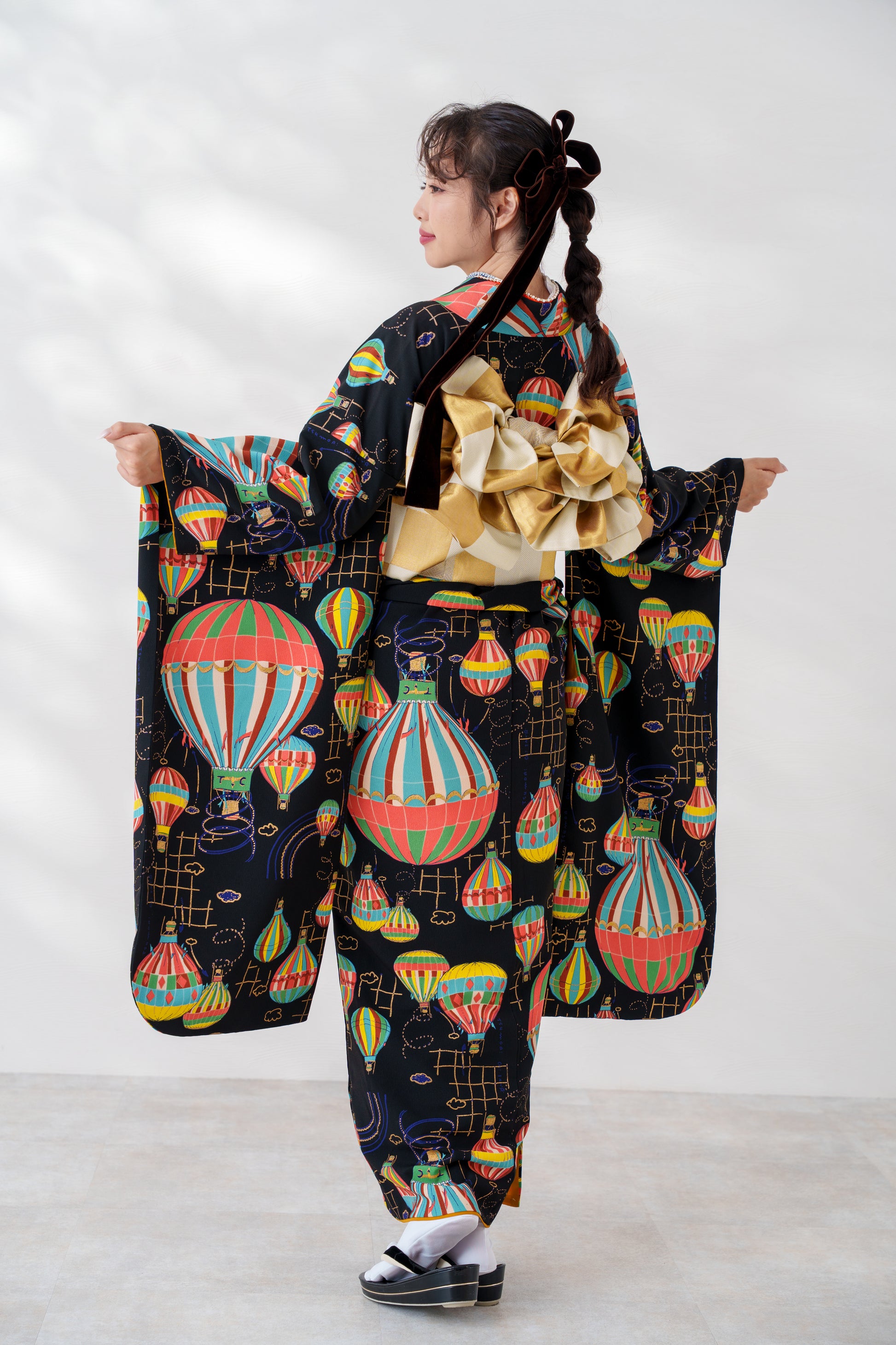 黒地に珍しい気球柄の振袖。コーディネートでさらにおしゃれな雰囲気に