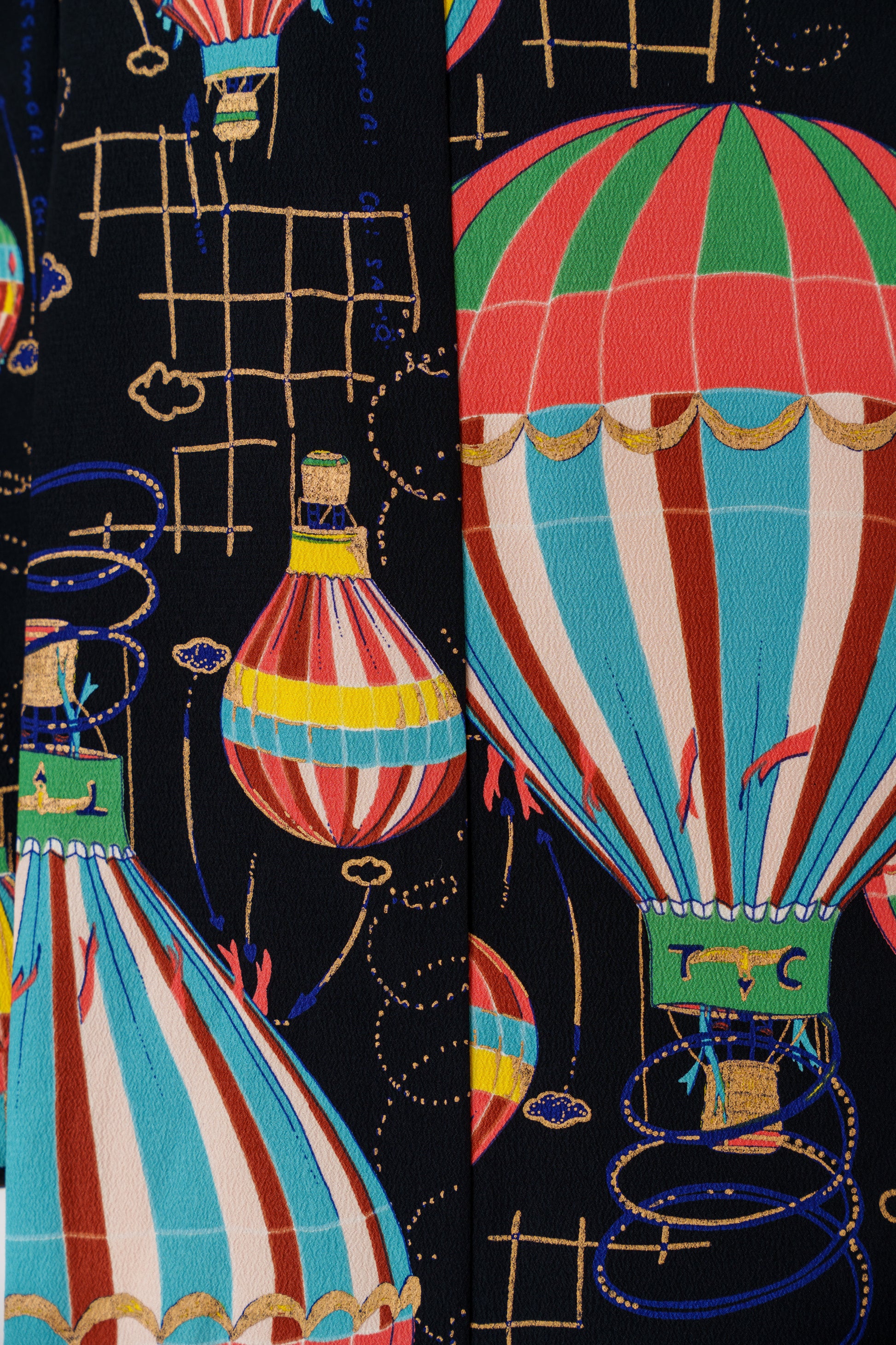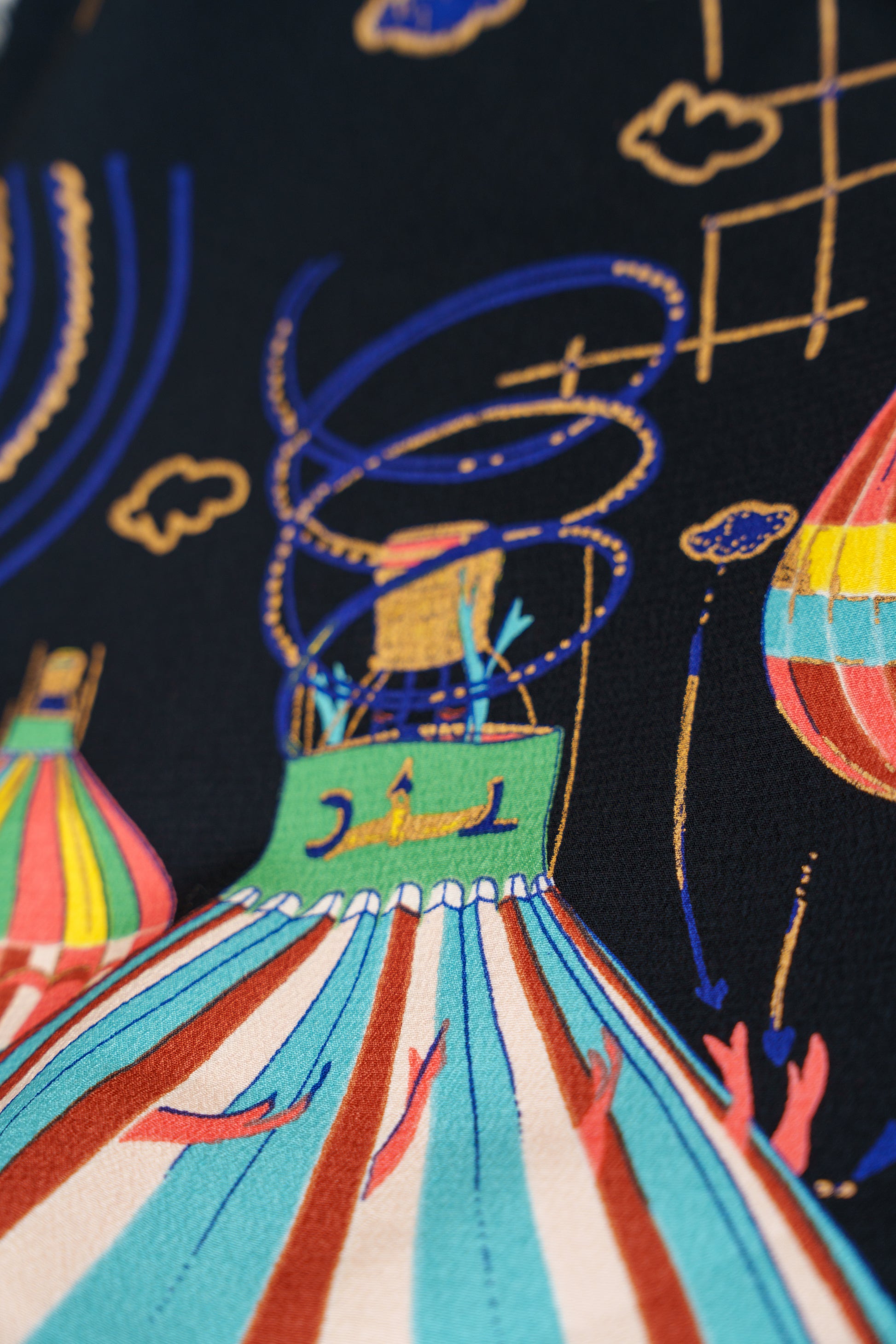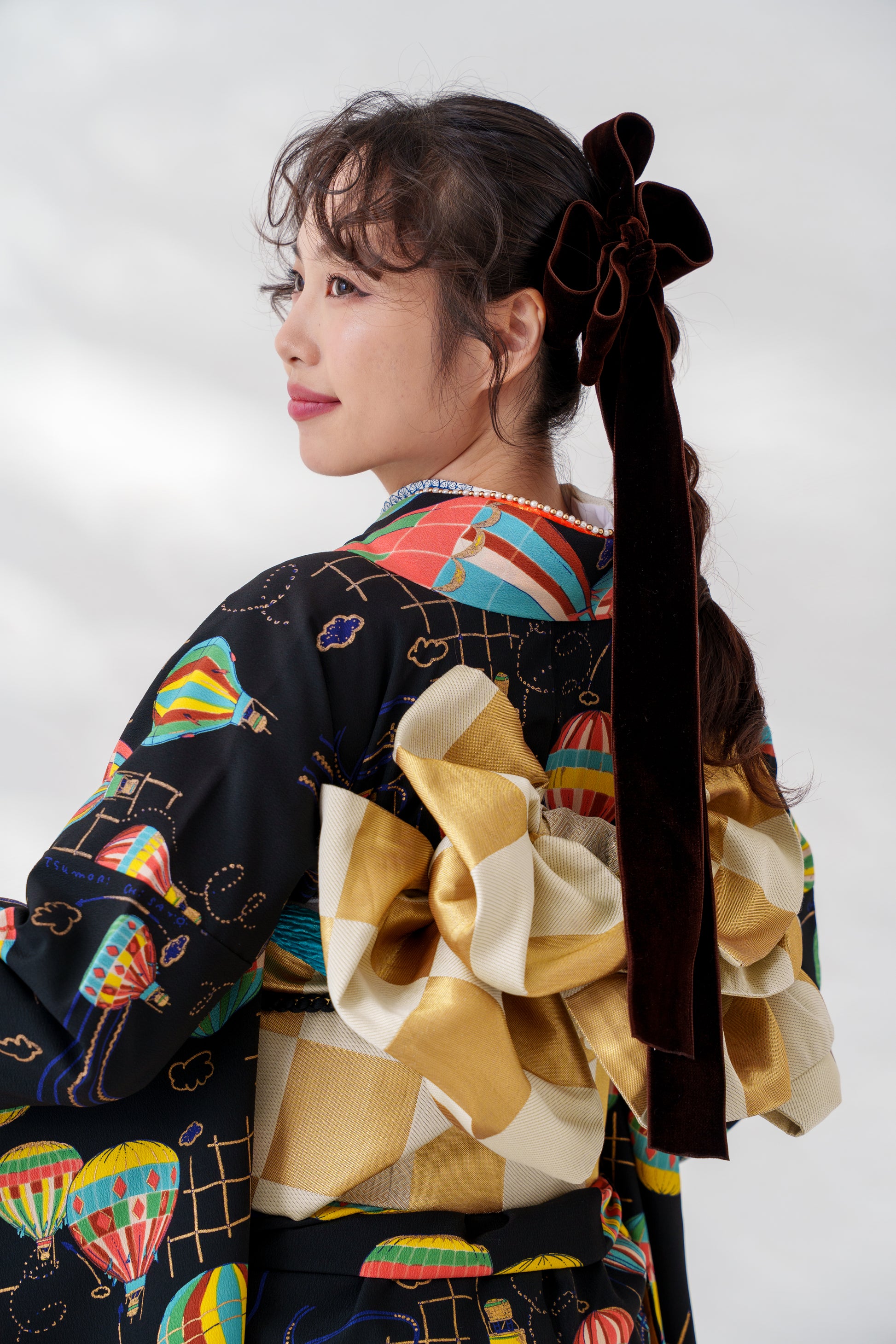 黒地に珍しい気球柄の振袖。コーディネートでさらにおしゃれな雰囲気に