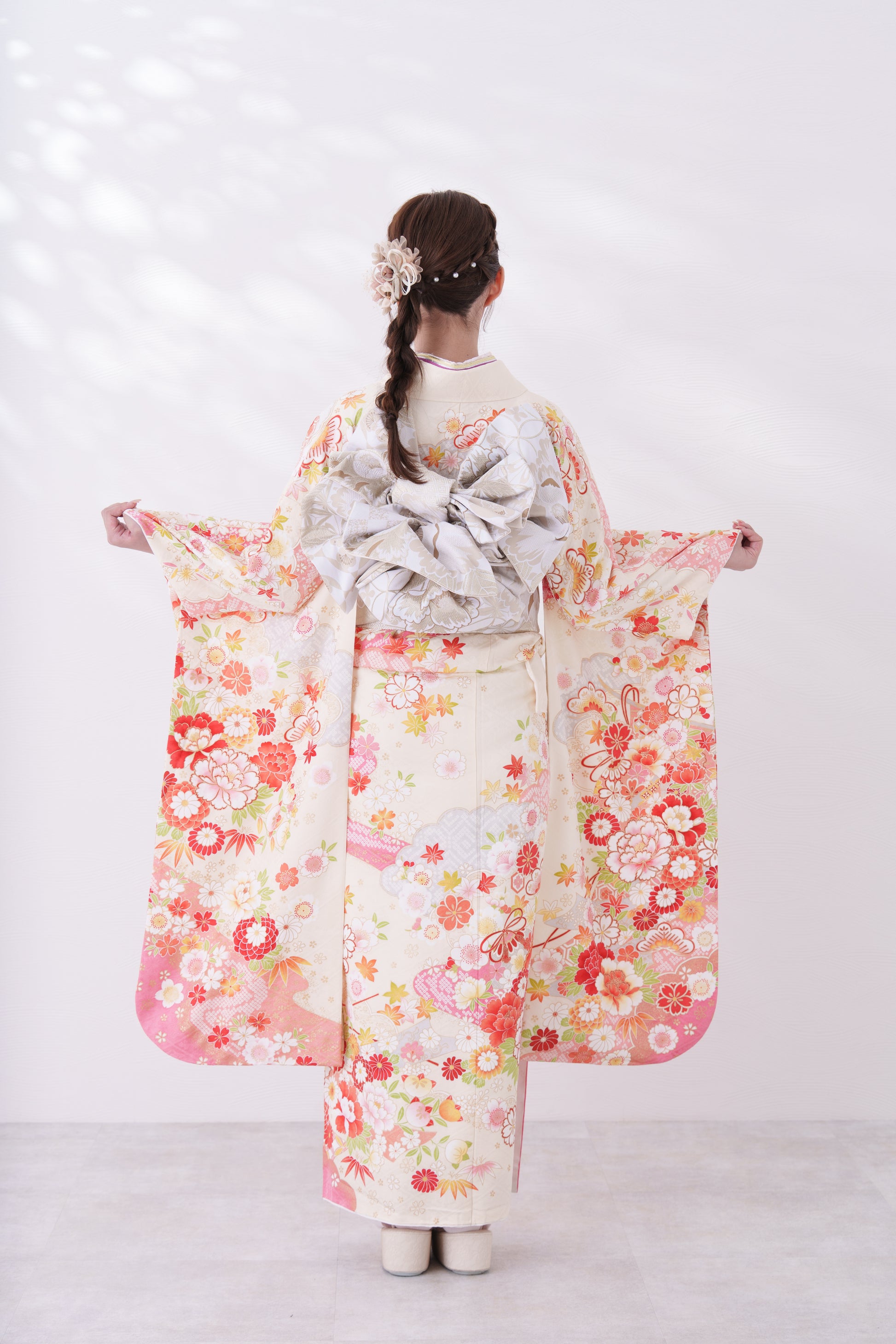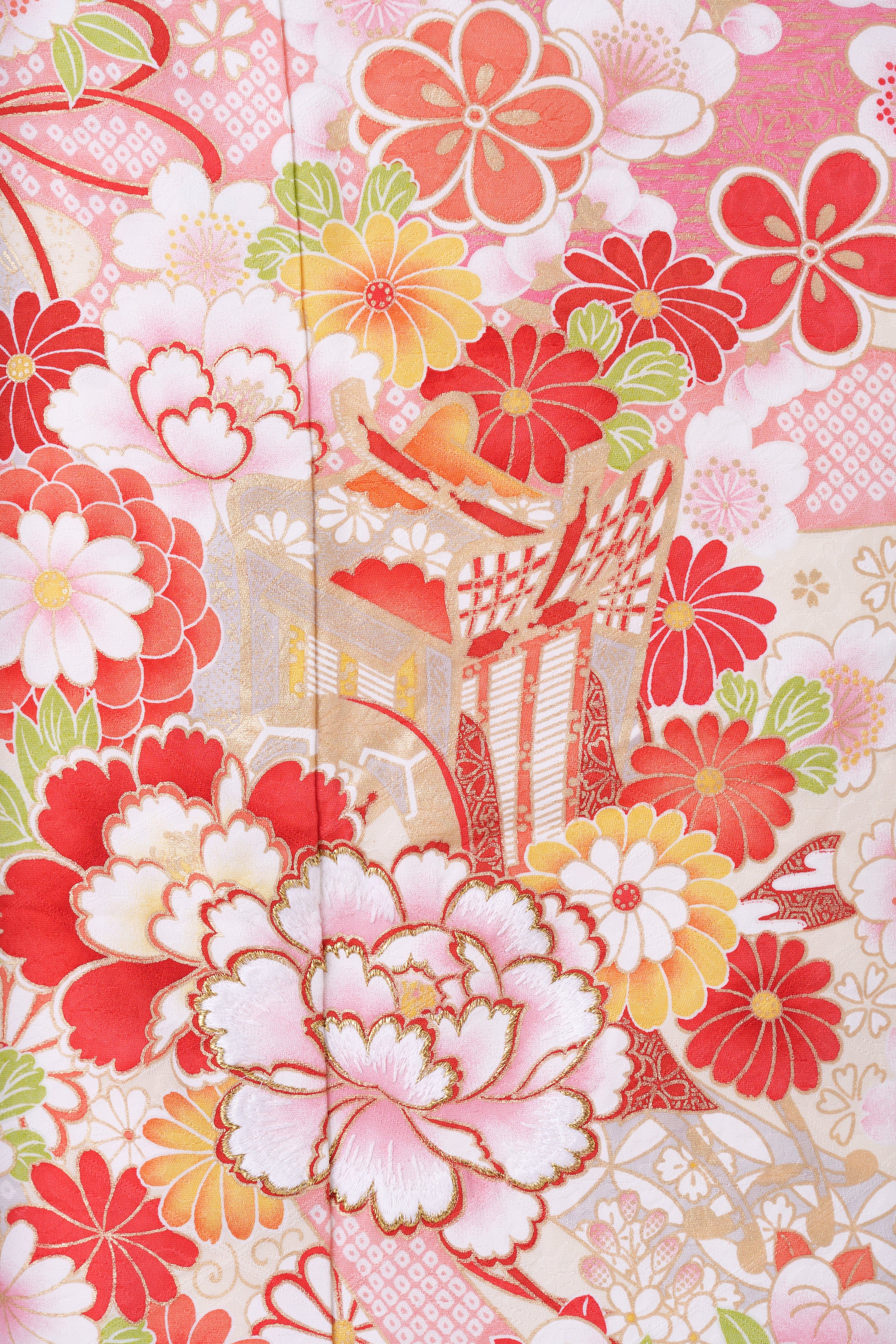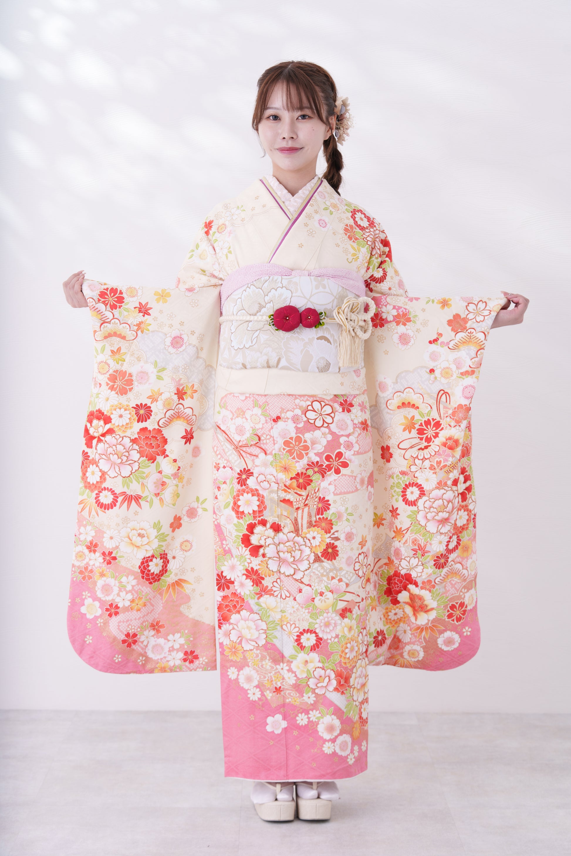 クリーム地に大きな牡丹の花が特徴的な一着。裾のピンクが可愛らしさを引き立たせてくれます。