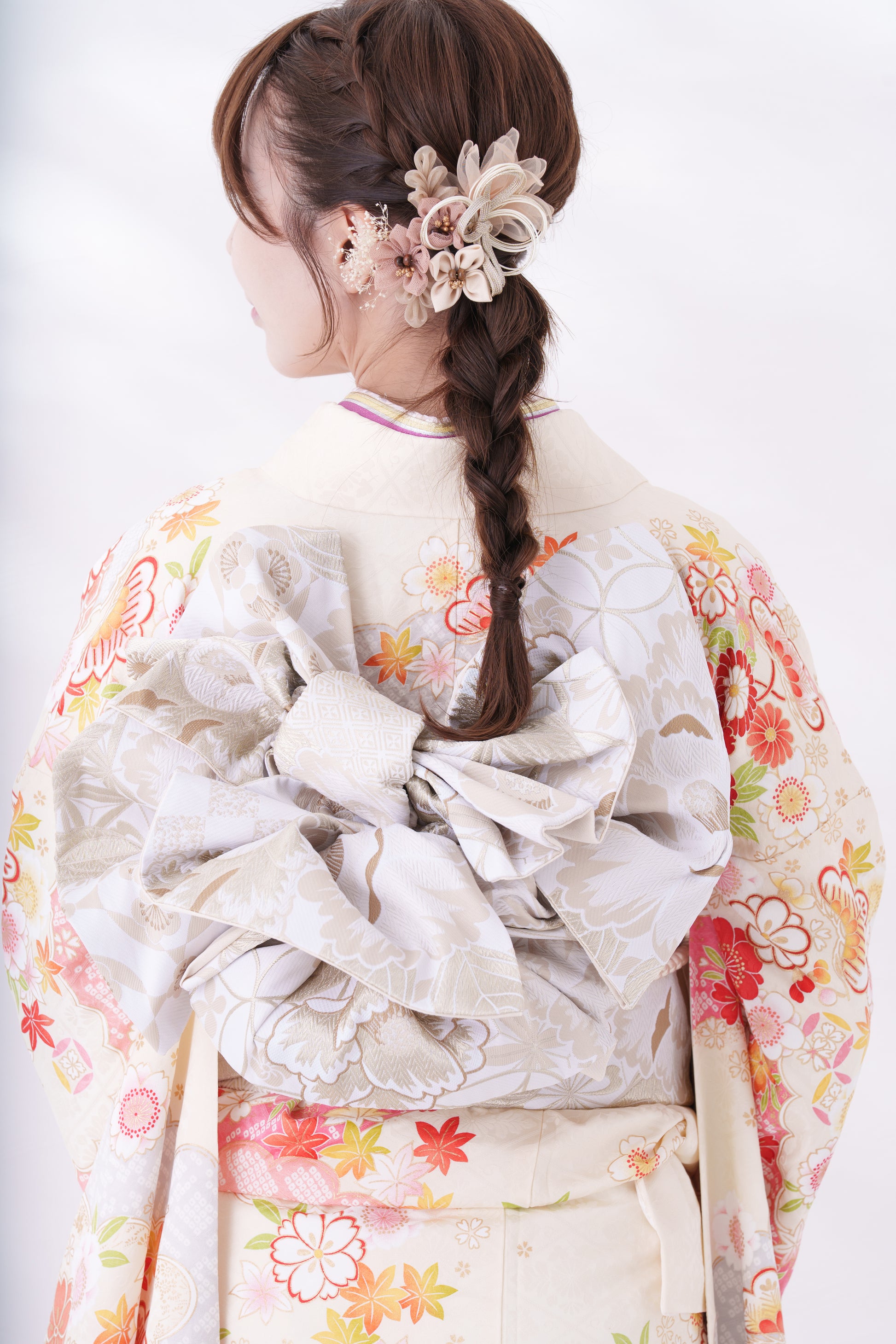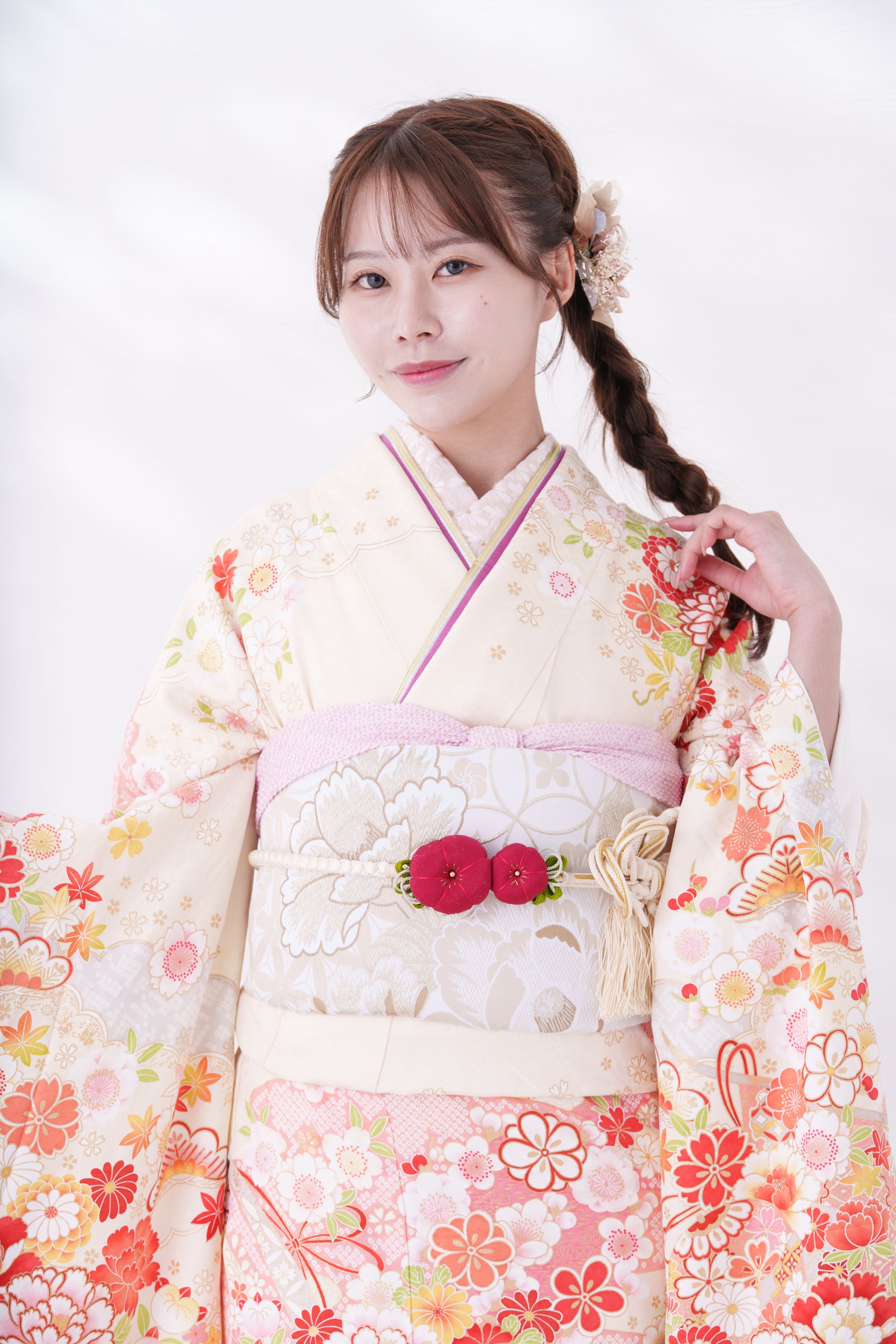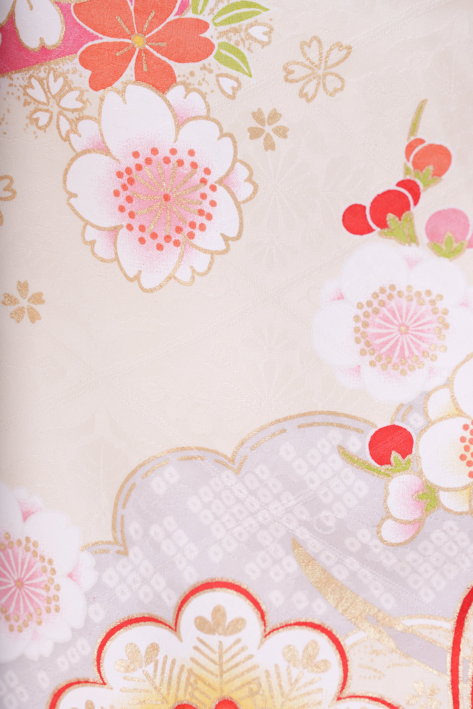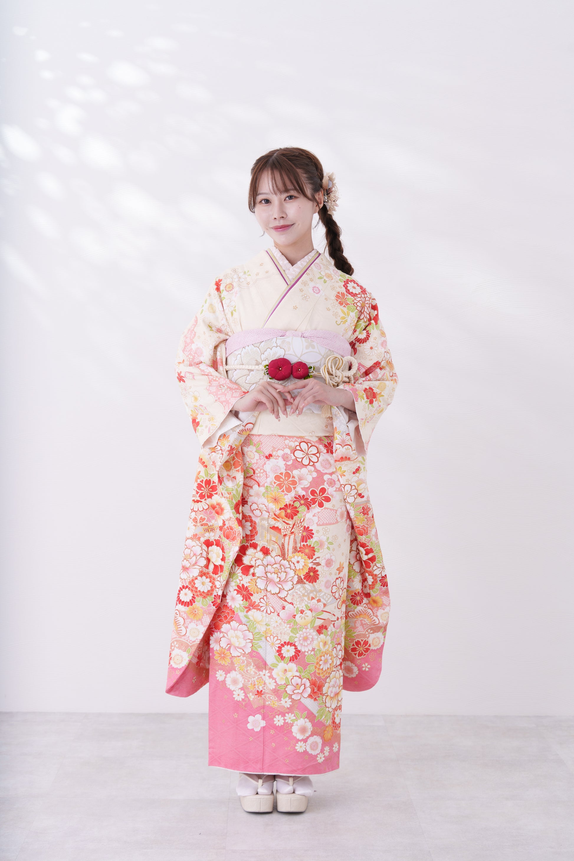 クリーム地に大きな牡丹の花が特徴的な一着。裾のピンクが可愛らしさを引き立たせてくれます。