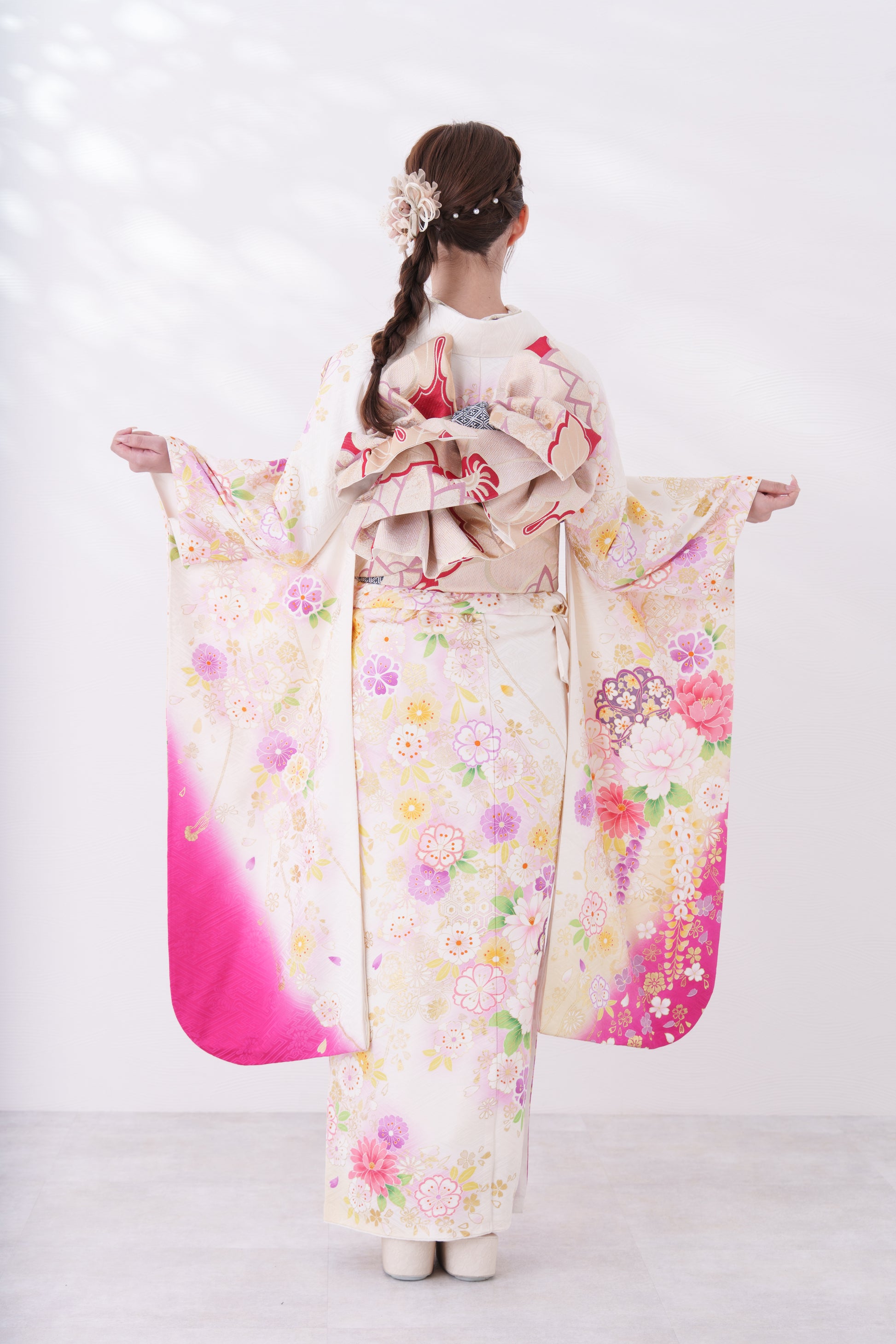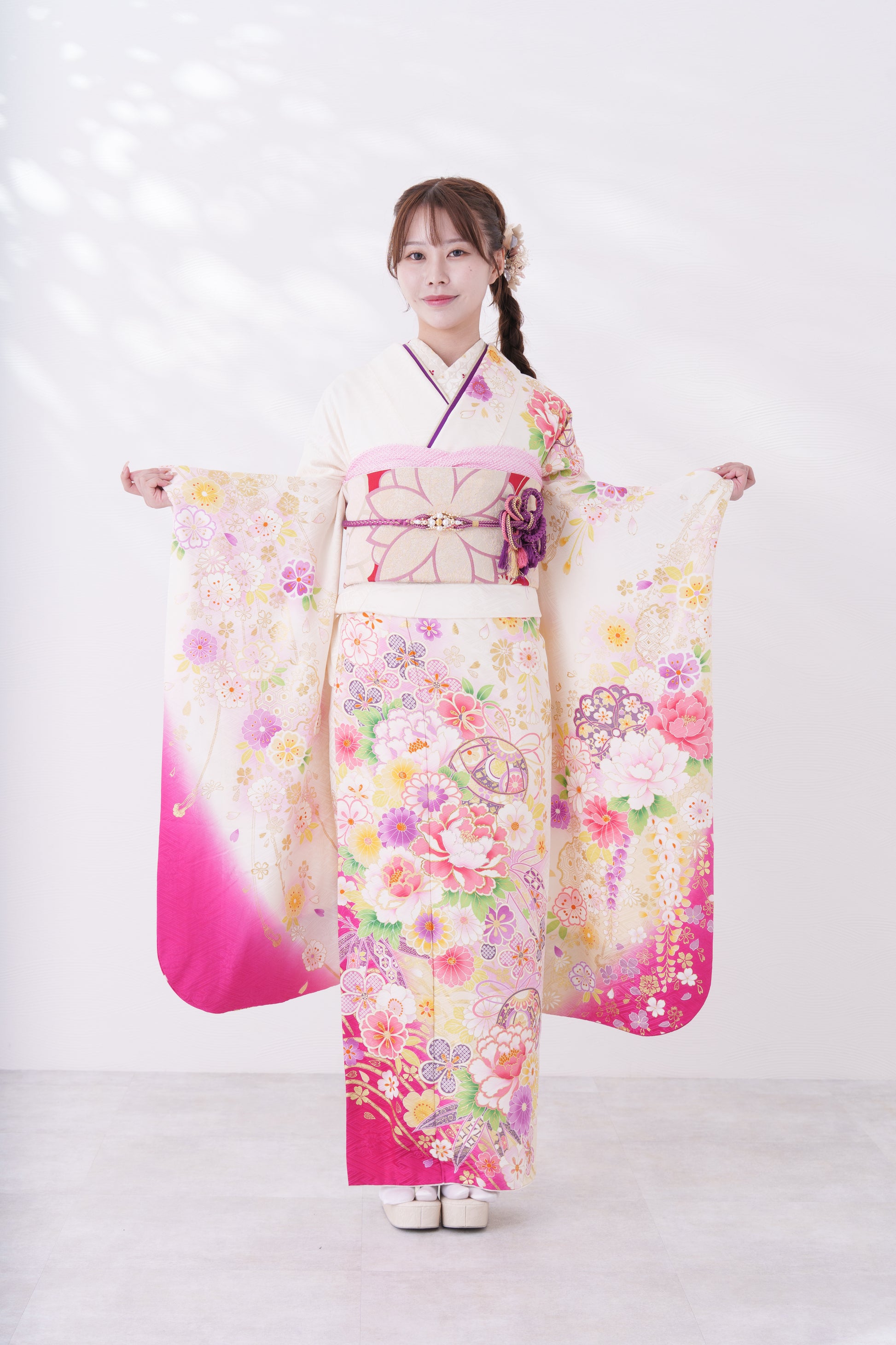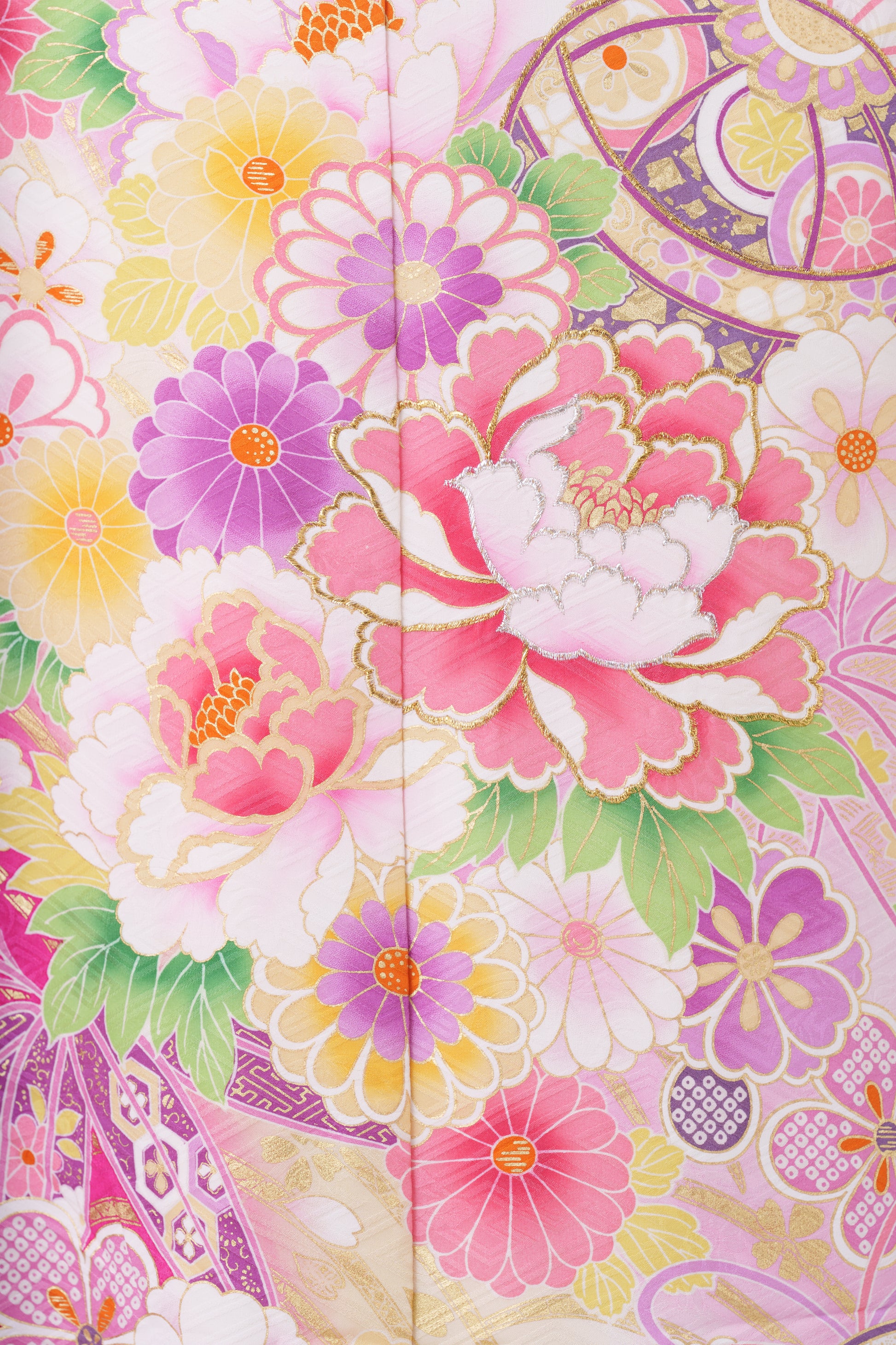 白地にピンクや紫であしらわれた花々が美しい一着。