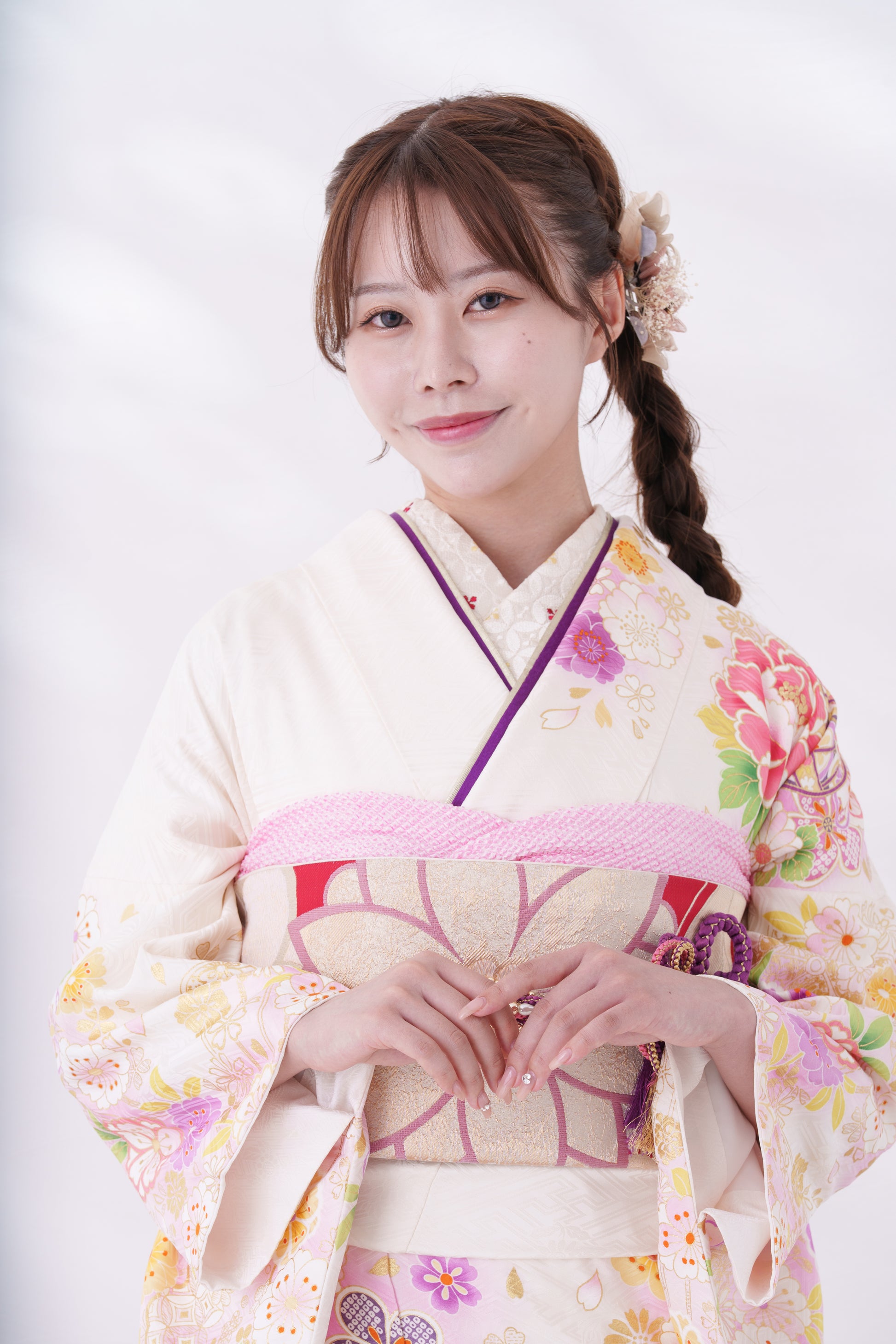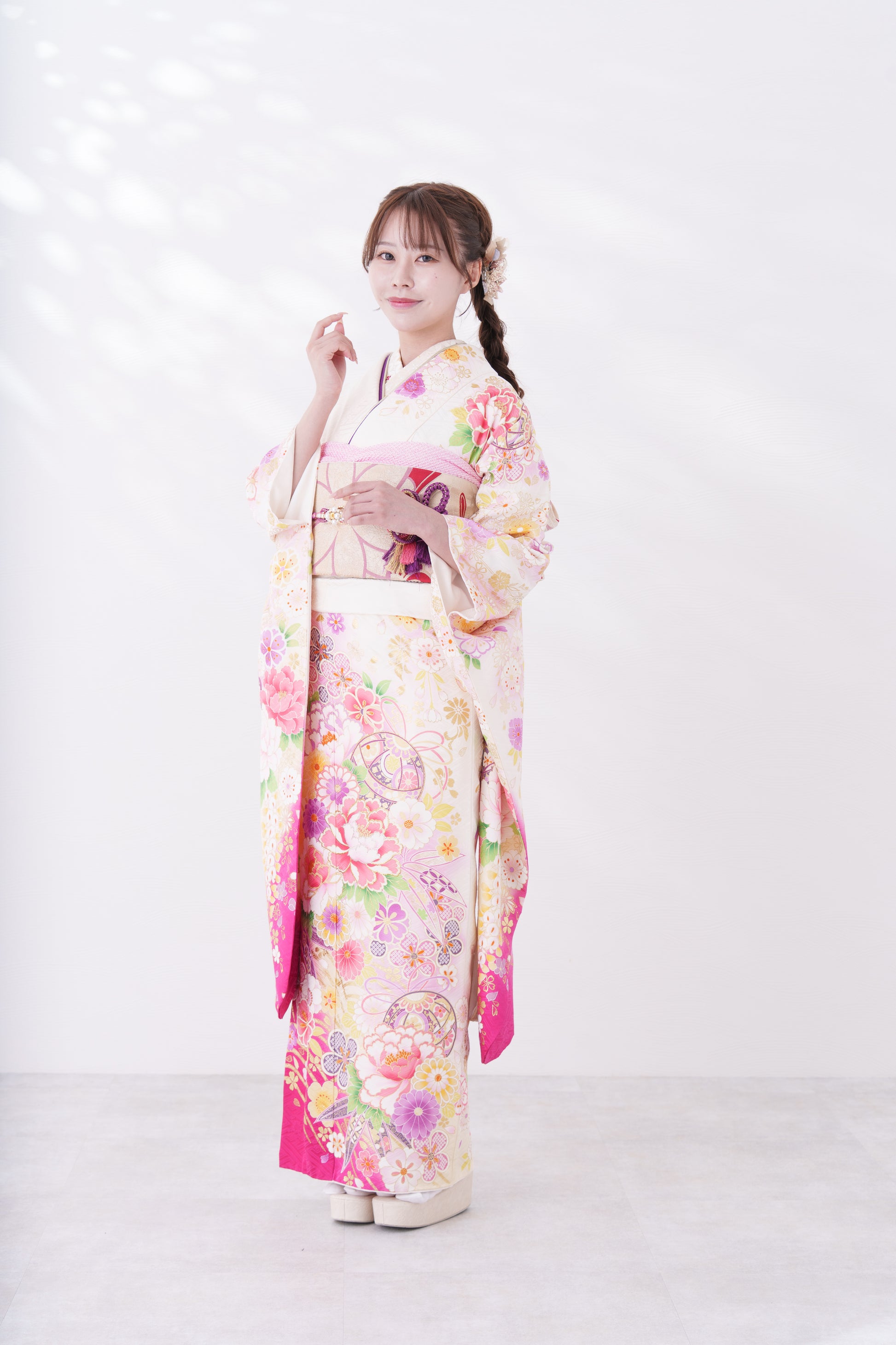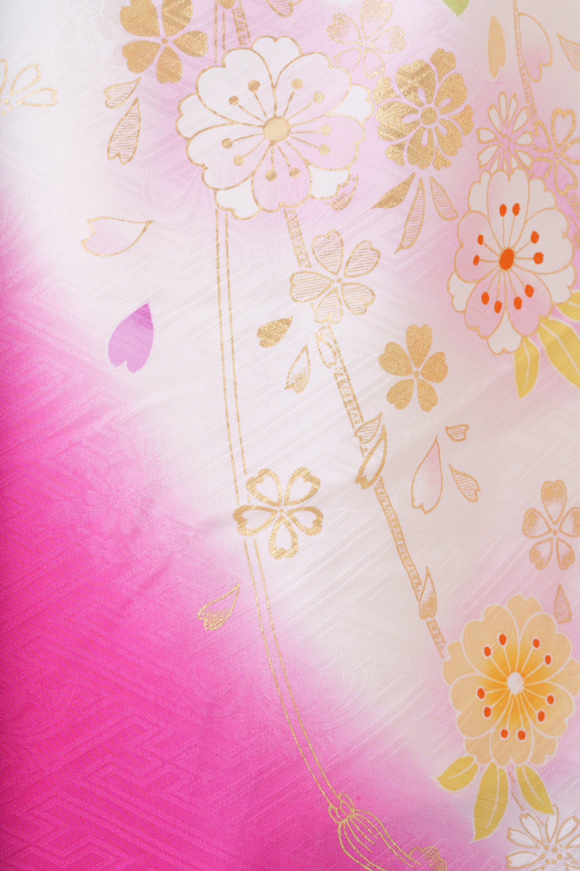 白地にピンクや紫であしらわれた花々が美しい一着。