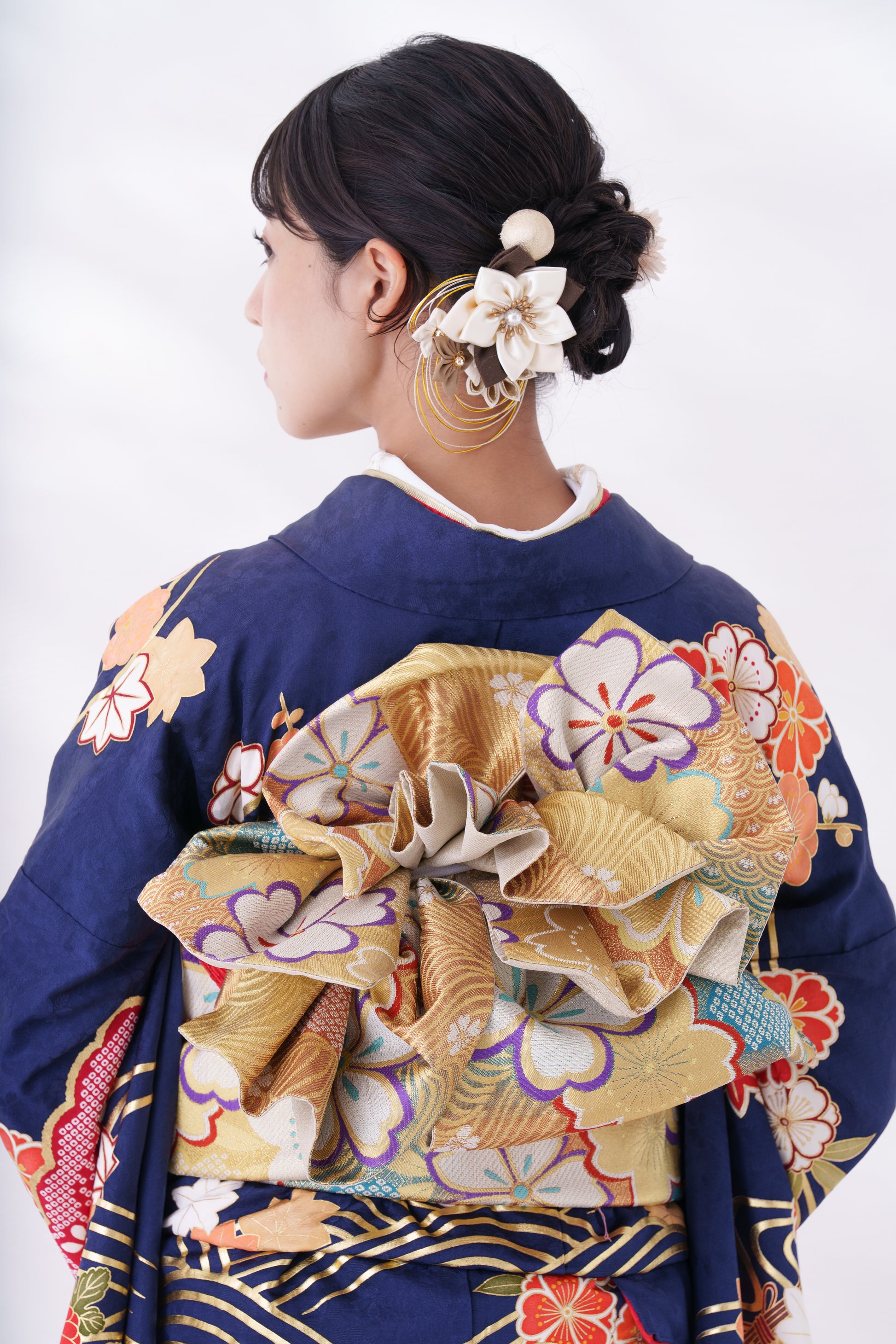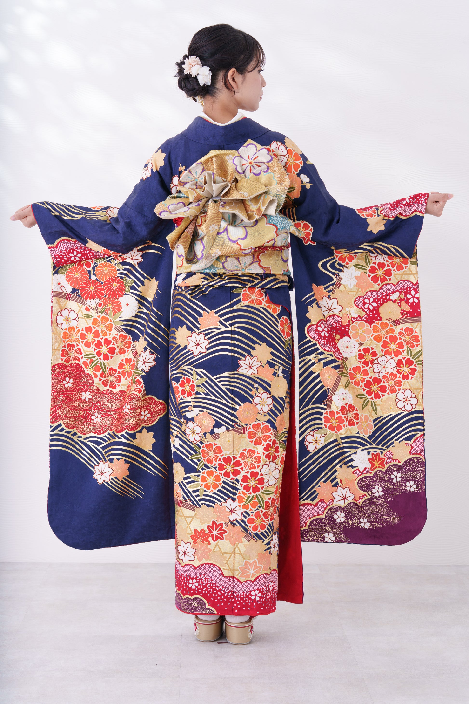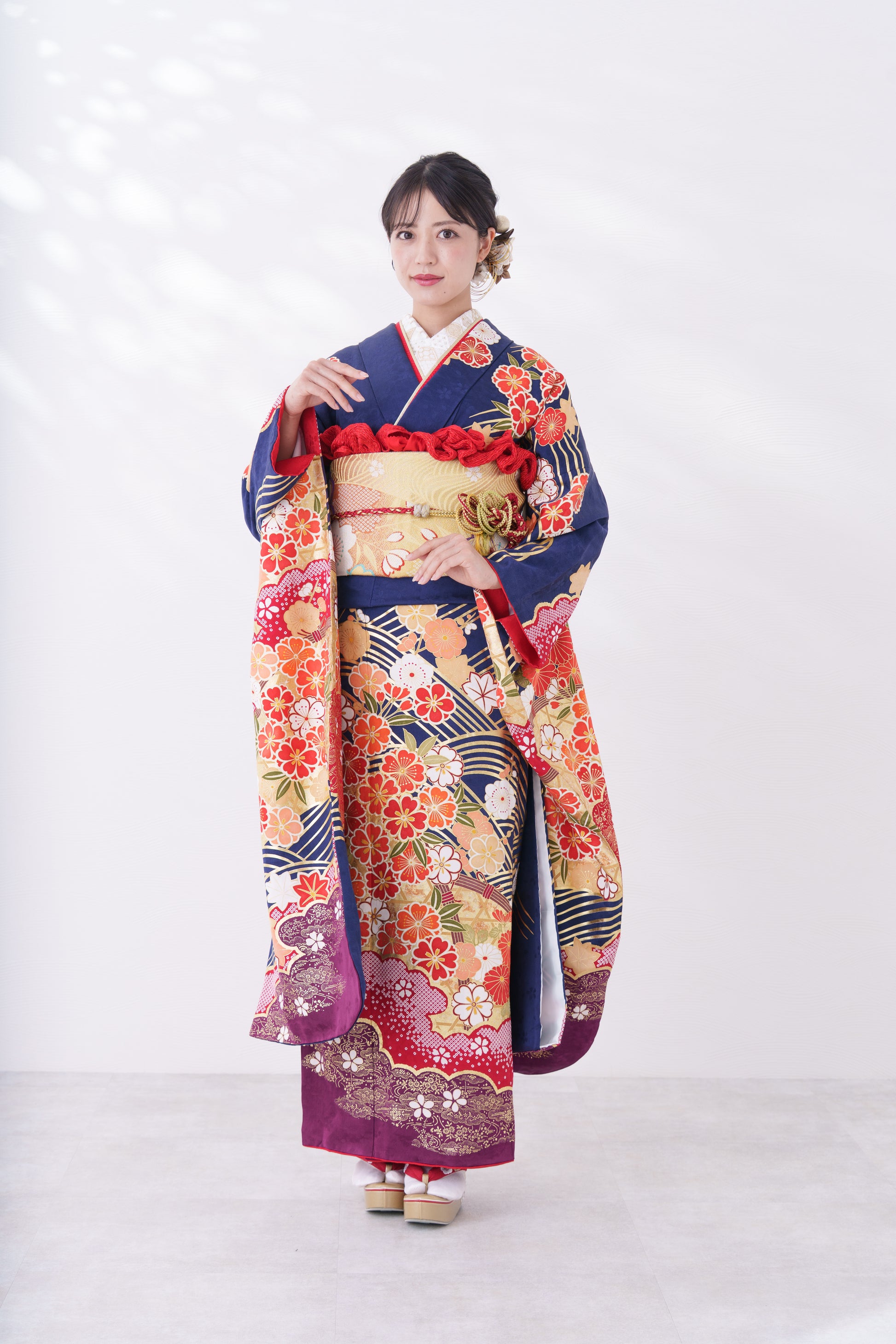 成人式らしさ溢れる華やかな一着。シックな紺地とは対照的な明るい小物合わせの特別な一着。