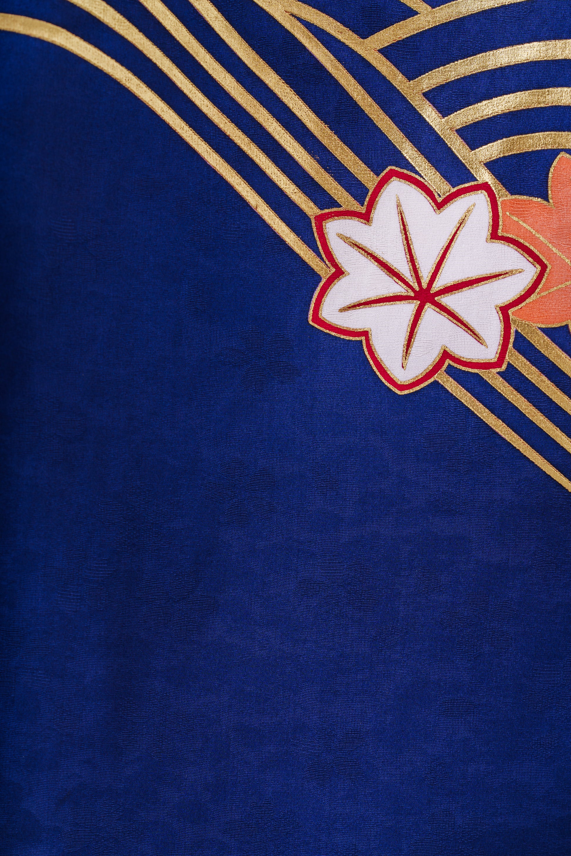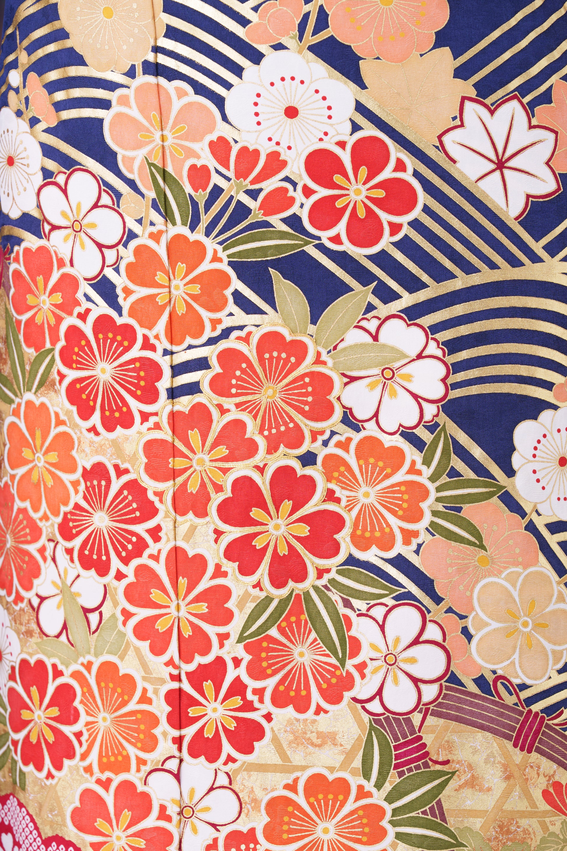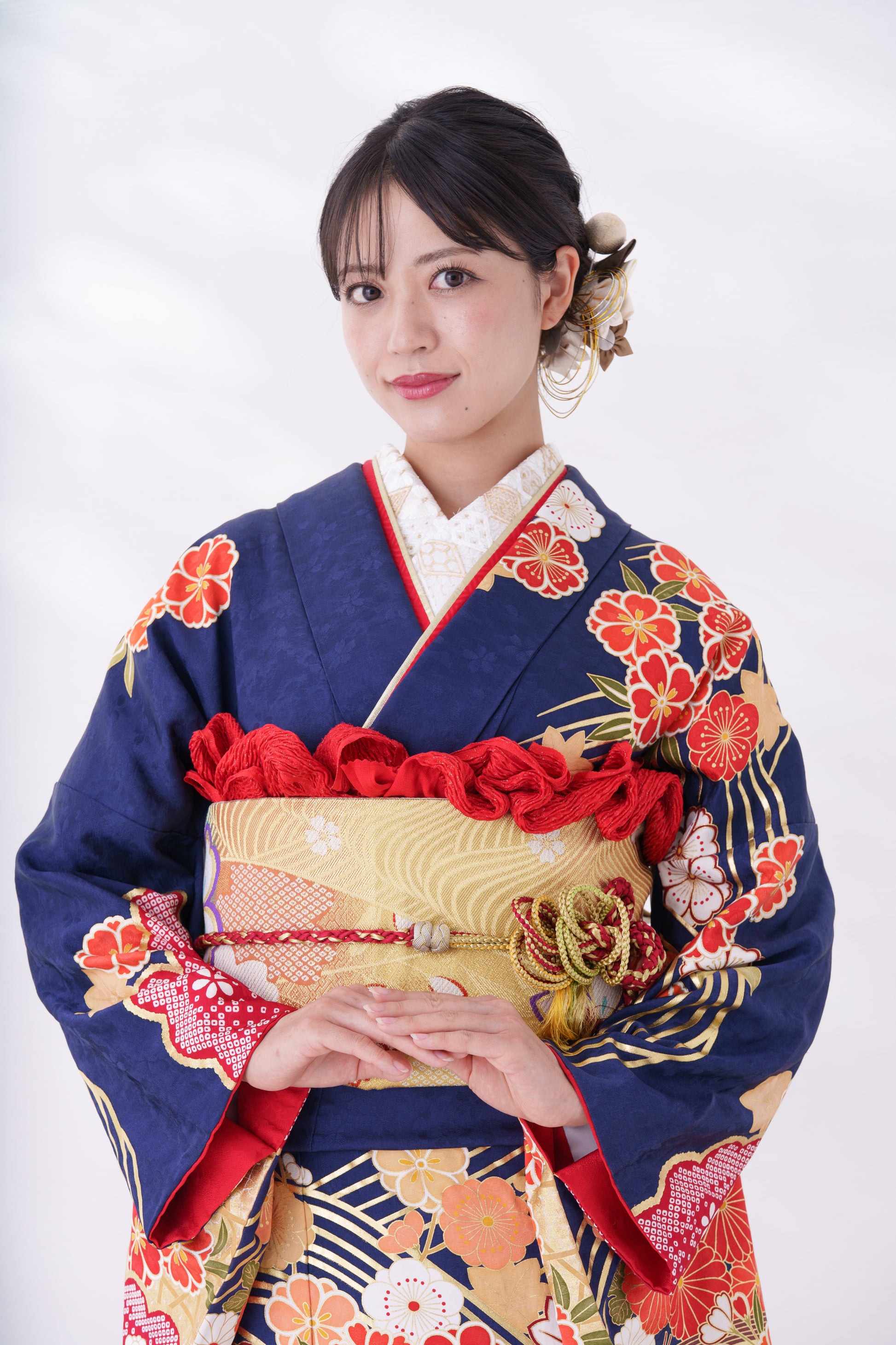 成人式らしさ溢れる華やかな一着。シックな紺地とは対照的な明るい小物合わせの特別な一着。