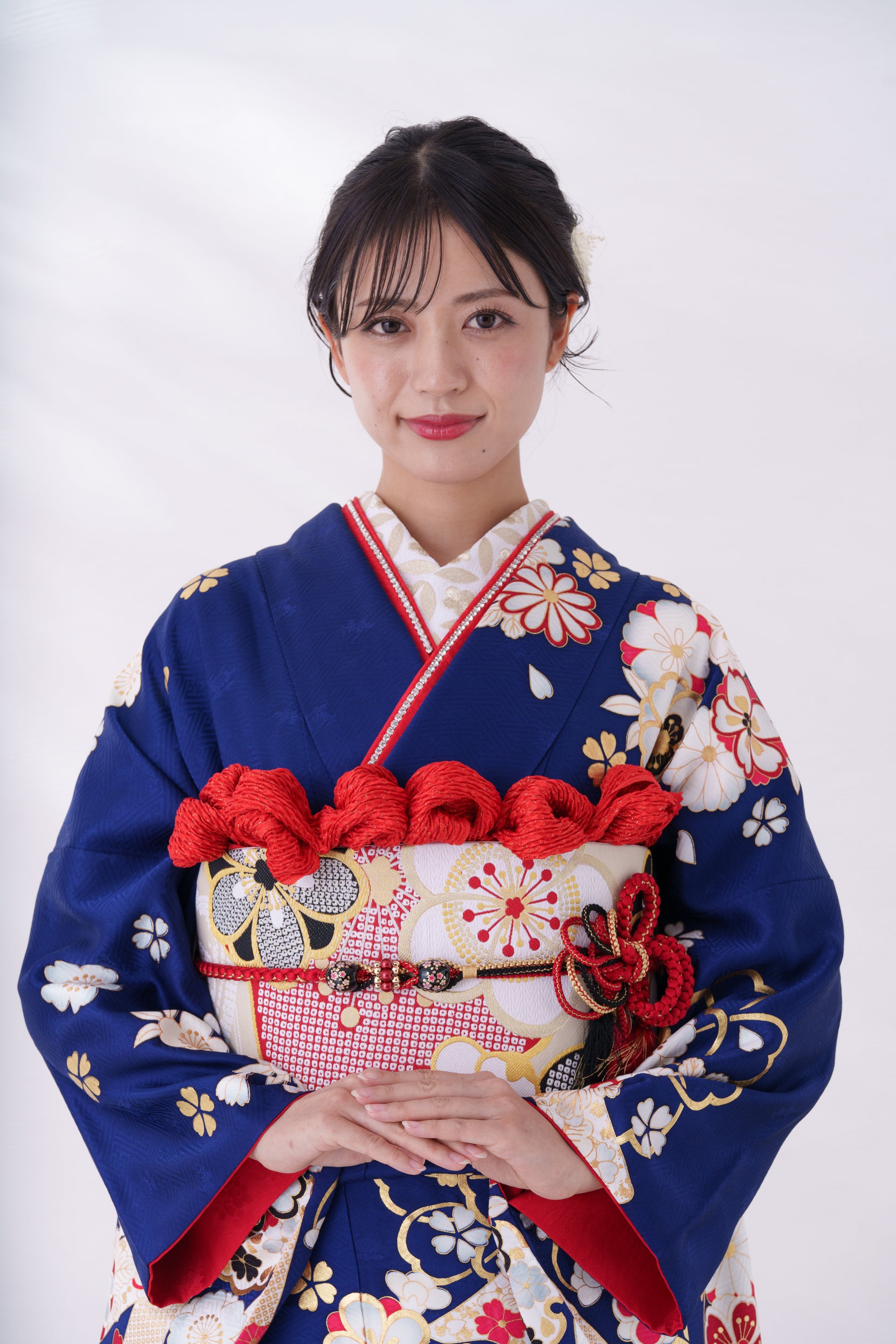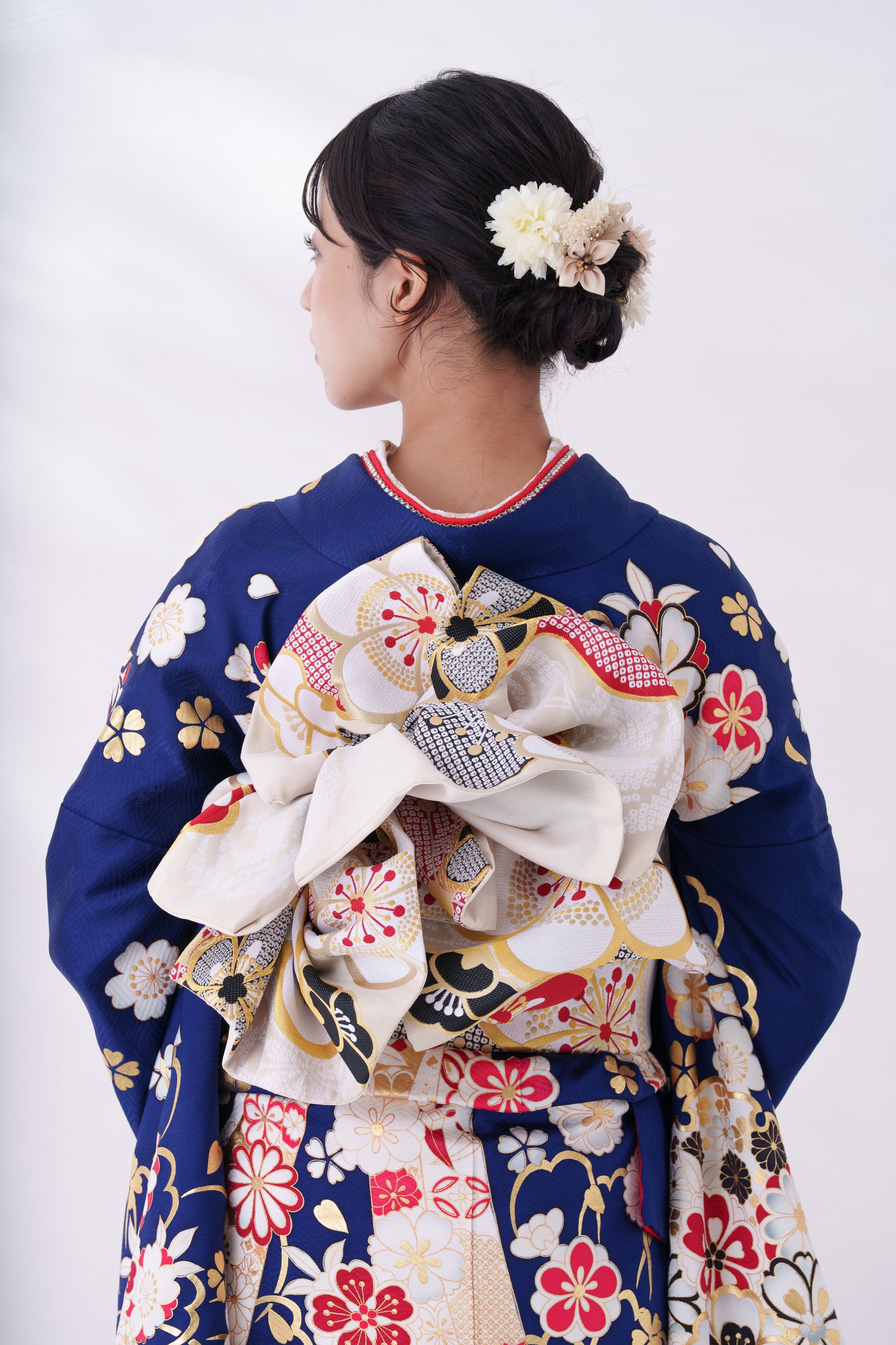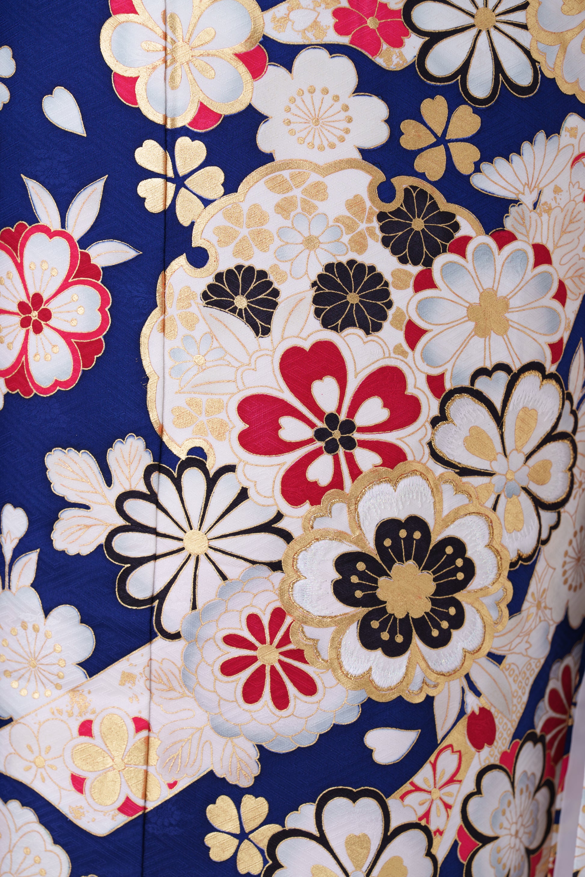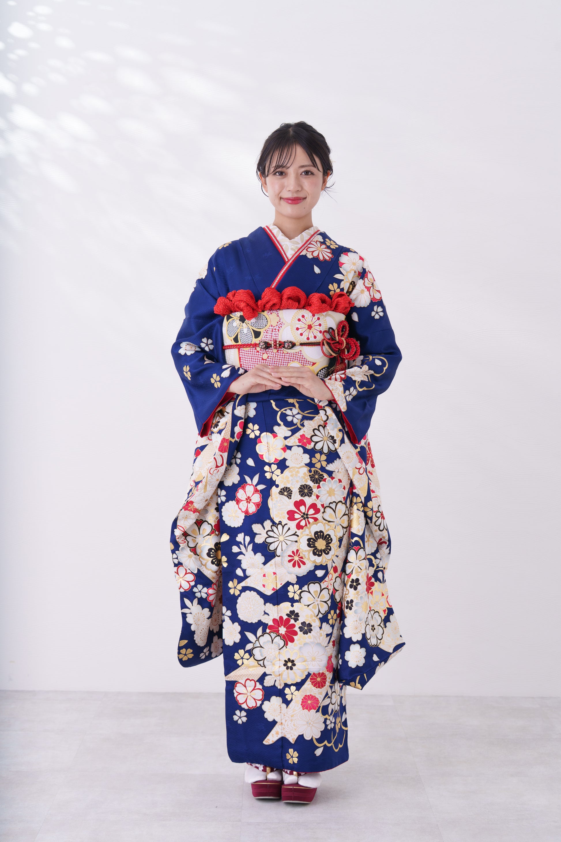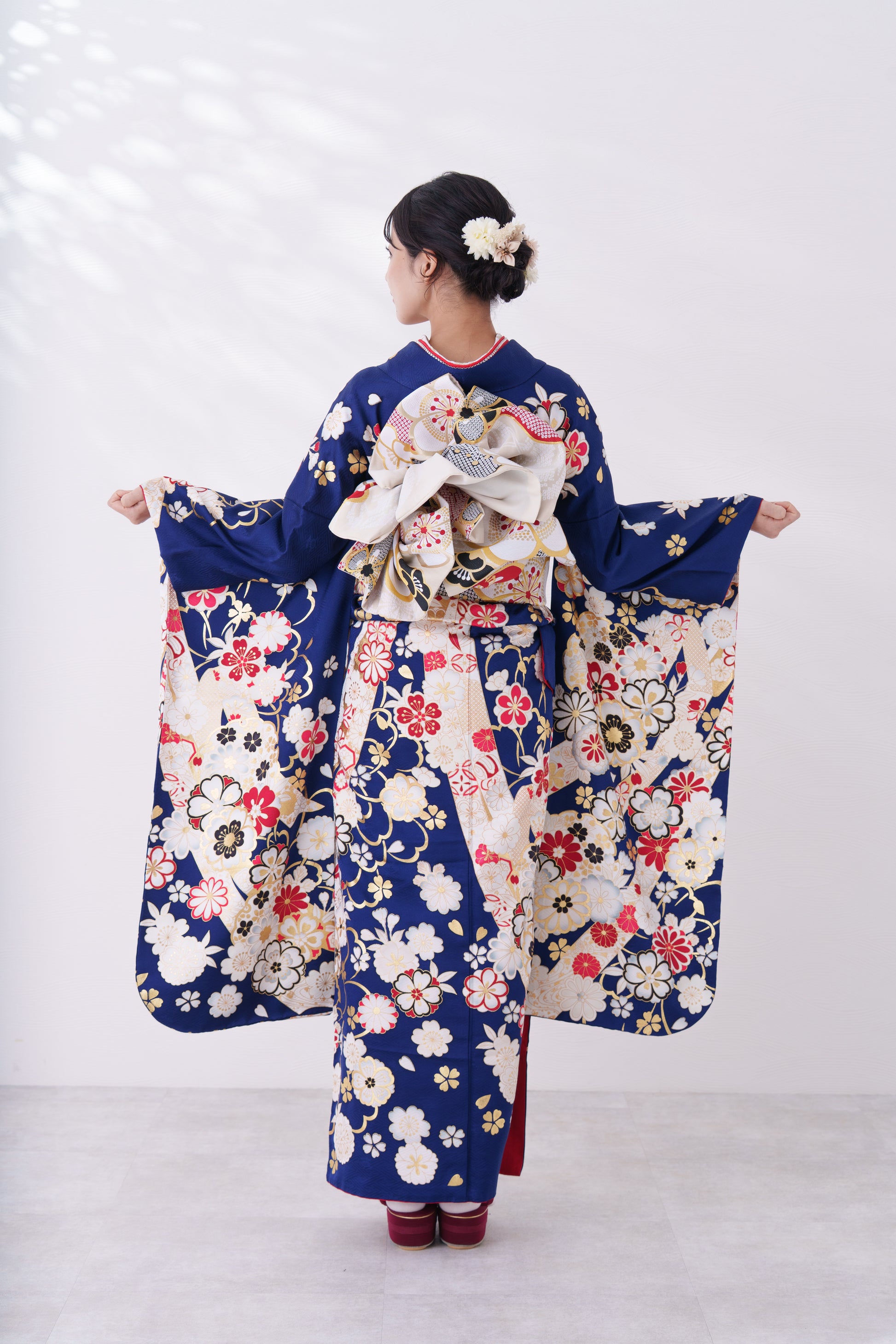 青みがかった紺色の振袖に白を基調とした桜の花が美しい一着。