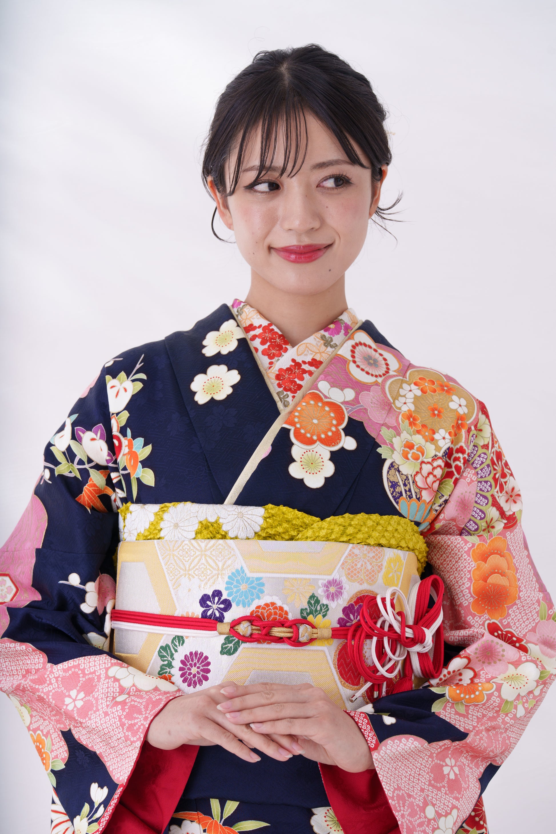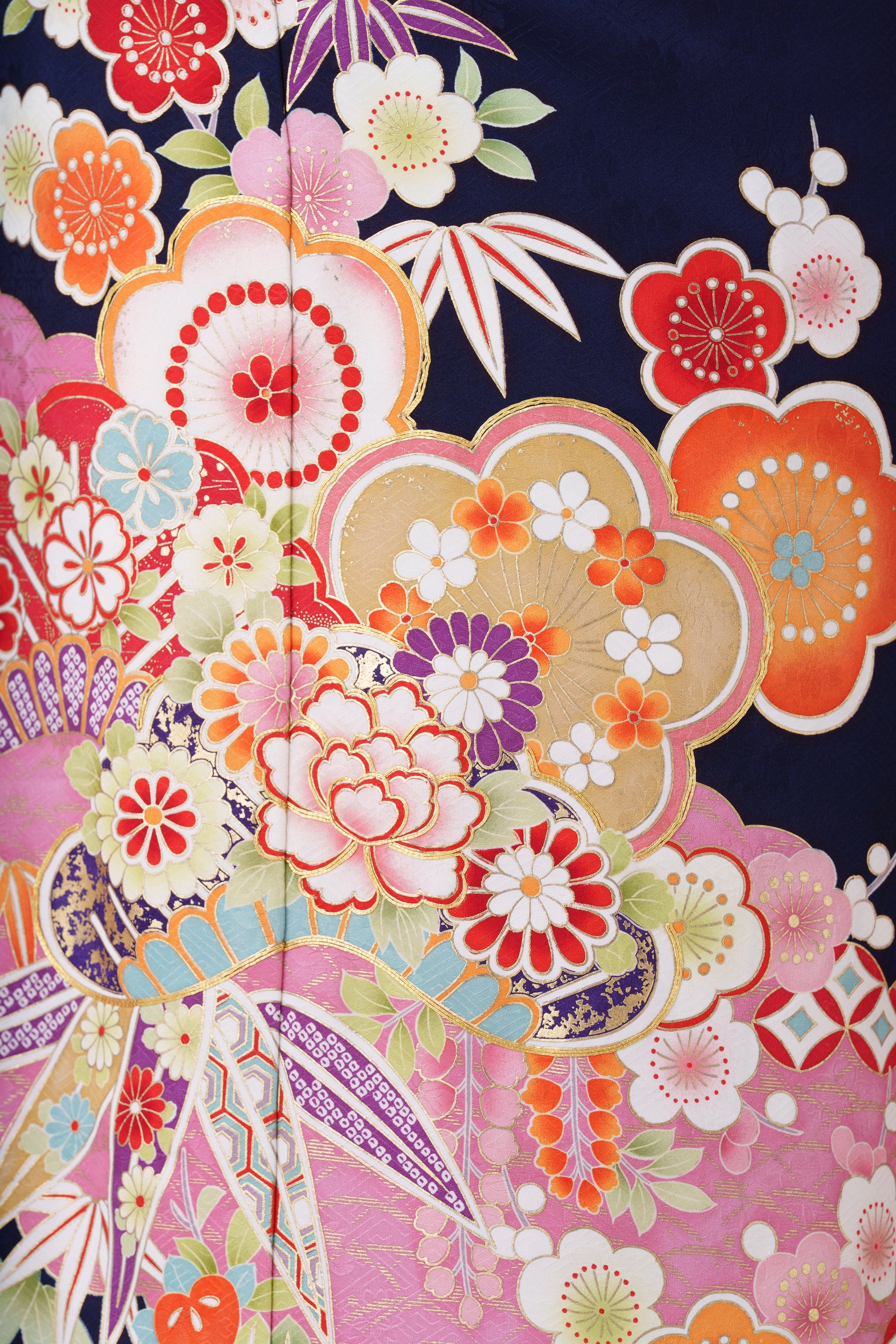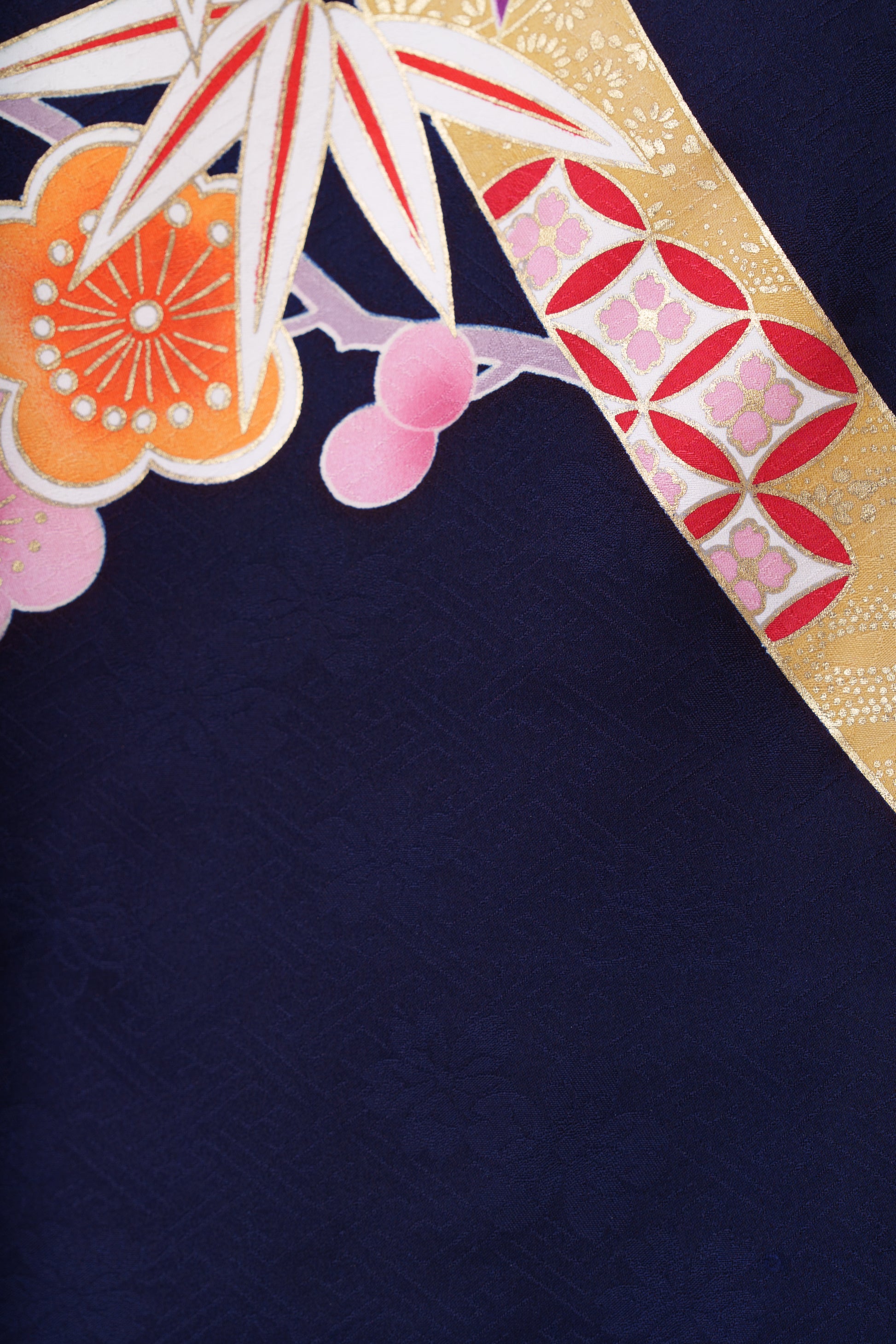 シックな紺地にカラフルな柄と小物合わせで主役の着こなしを。
