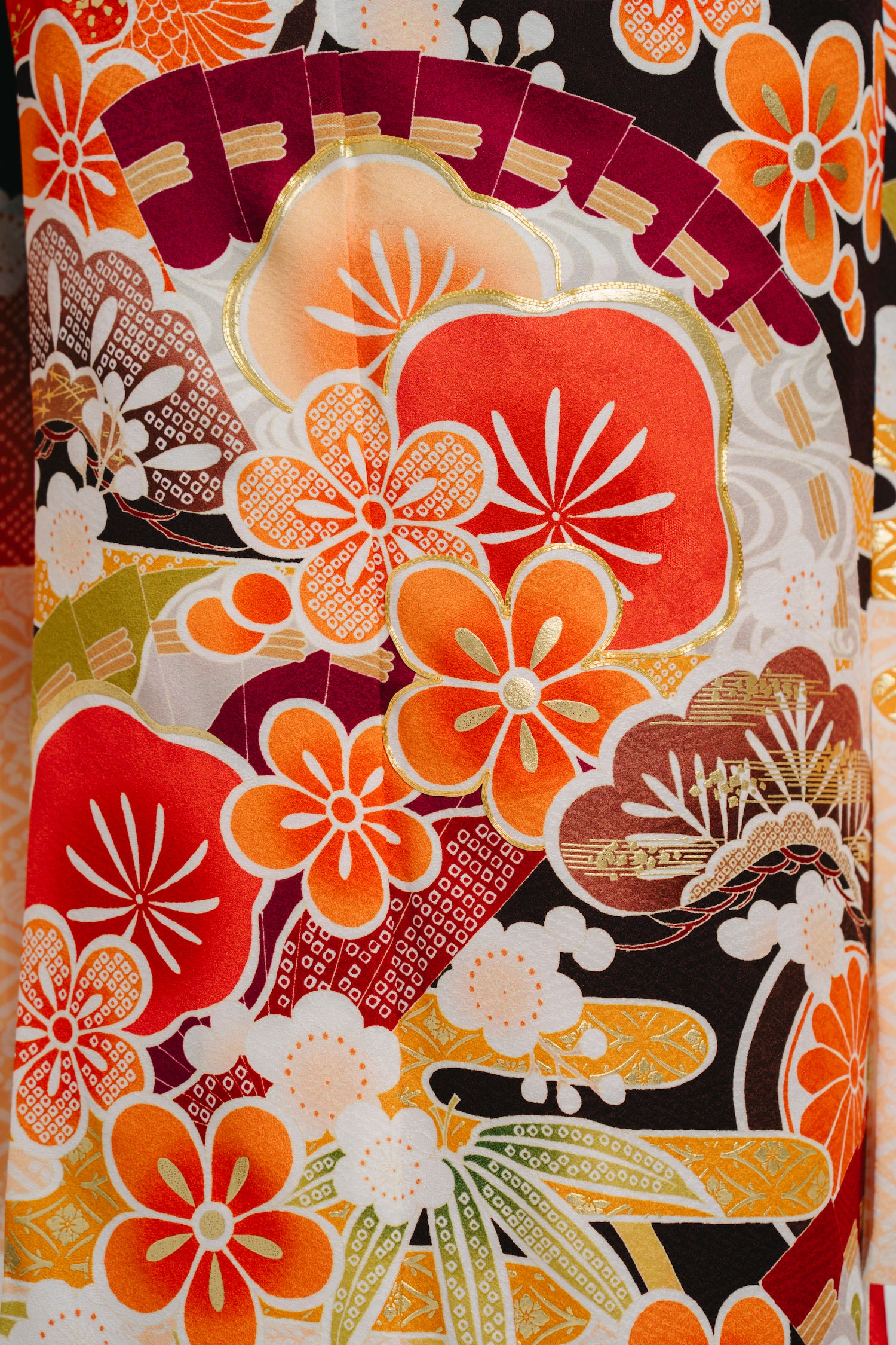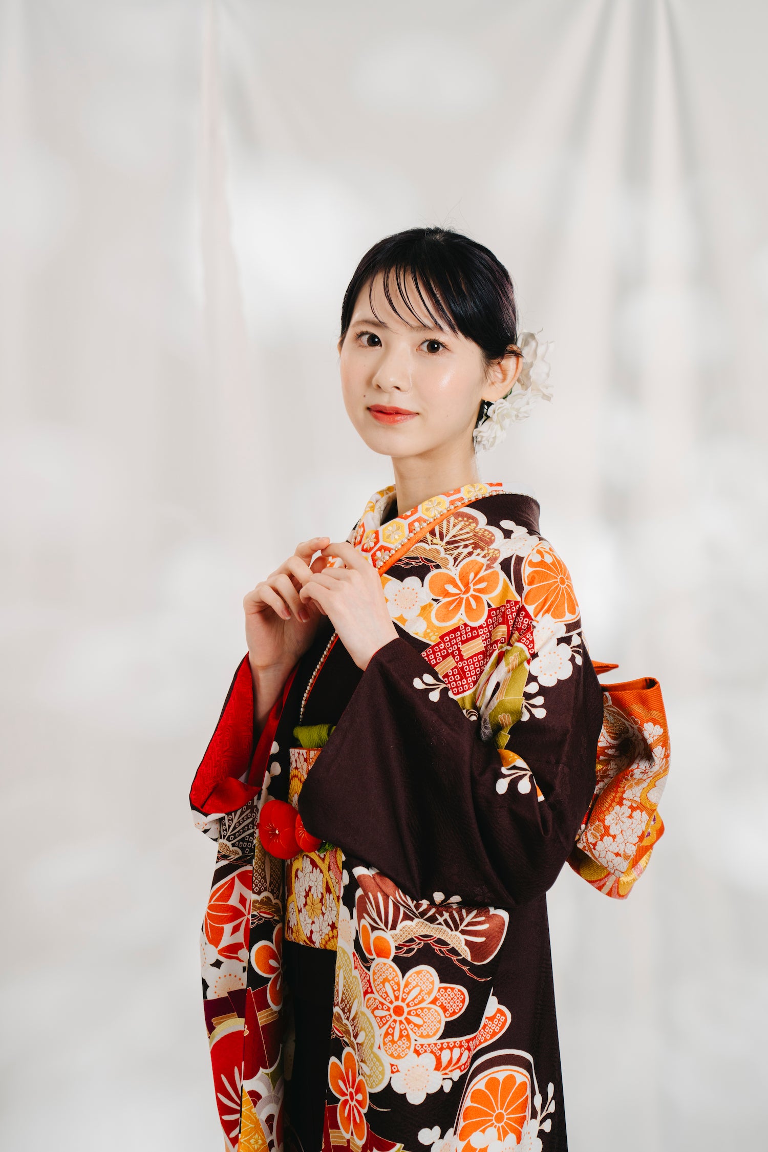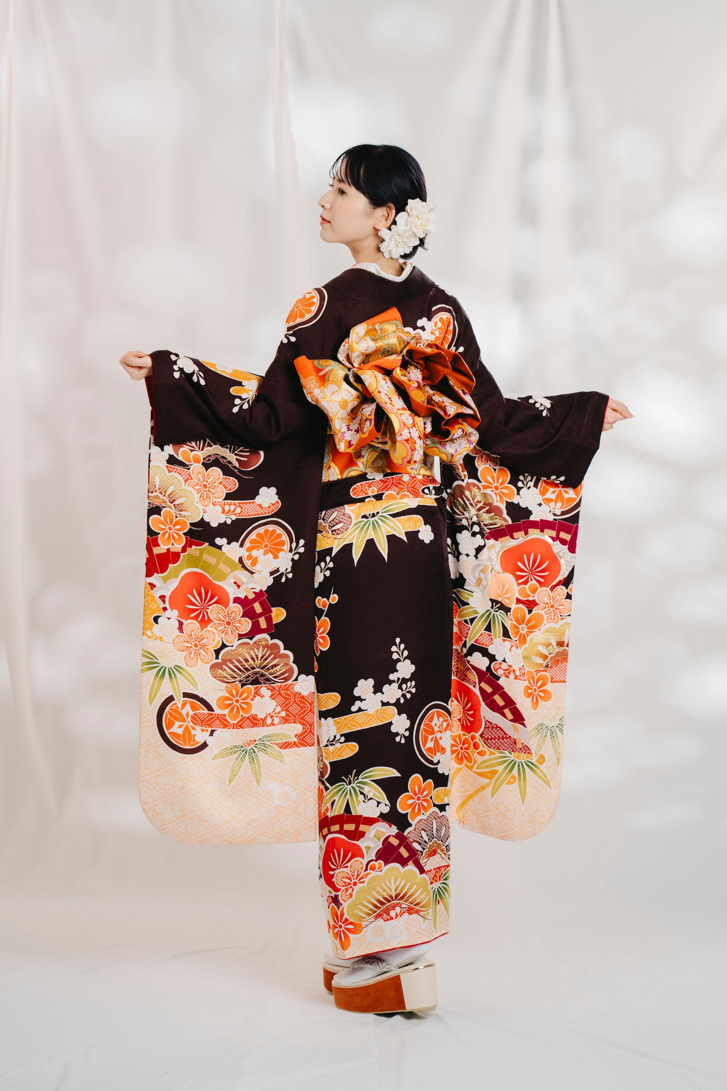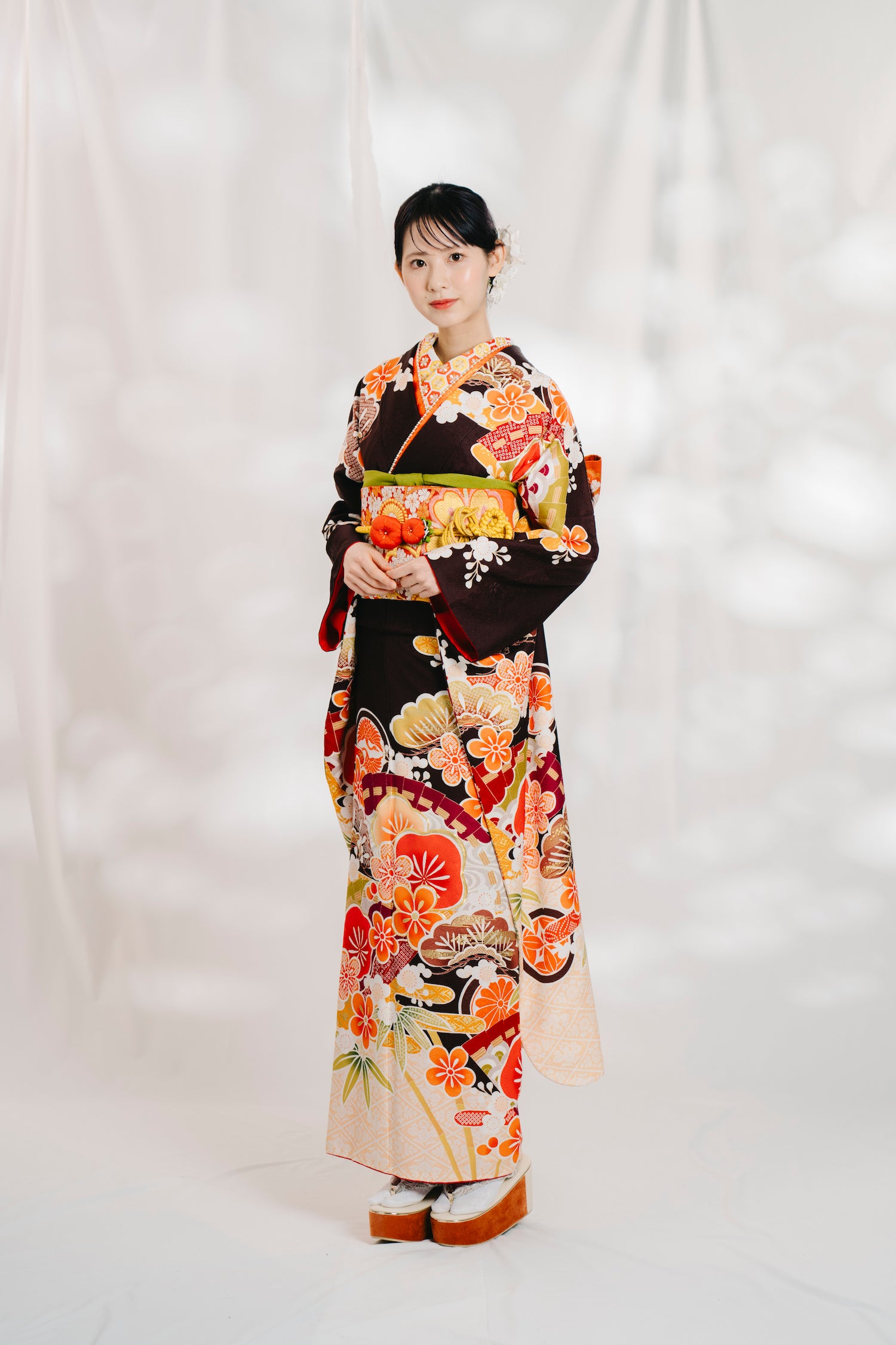 茶色地にオレンジの梅柄が豪華に描かれた華やかな一着です。黄色の帯締めがポイントに。