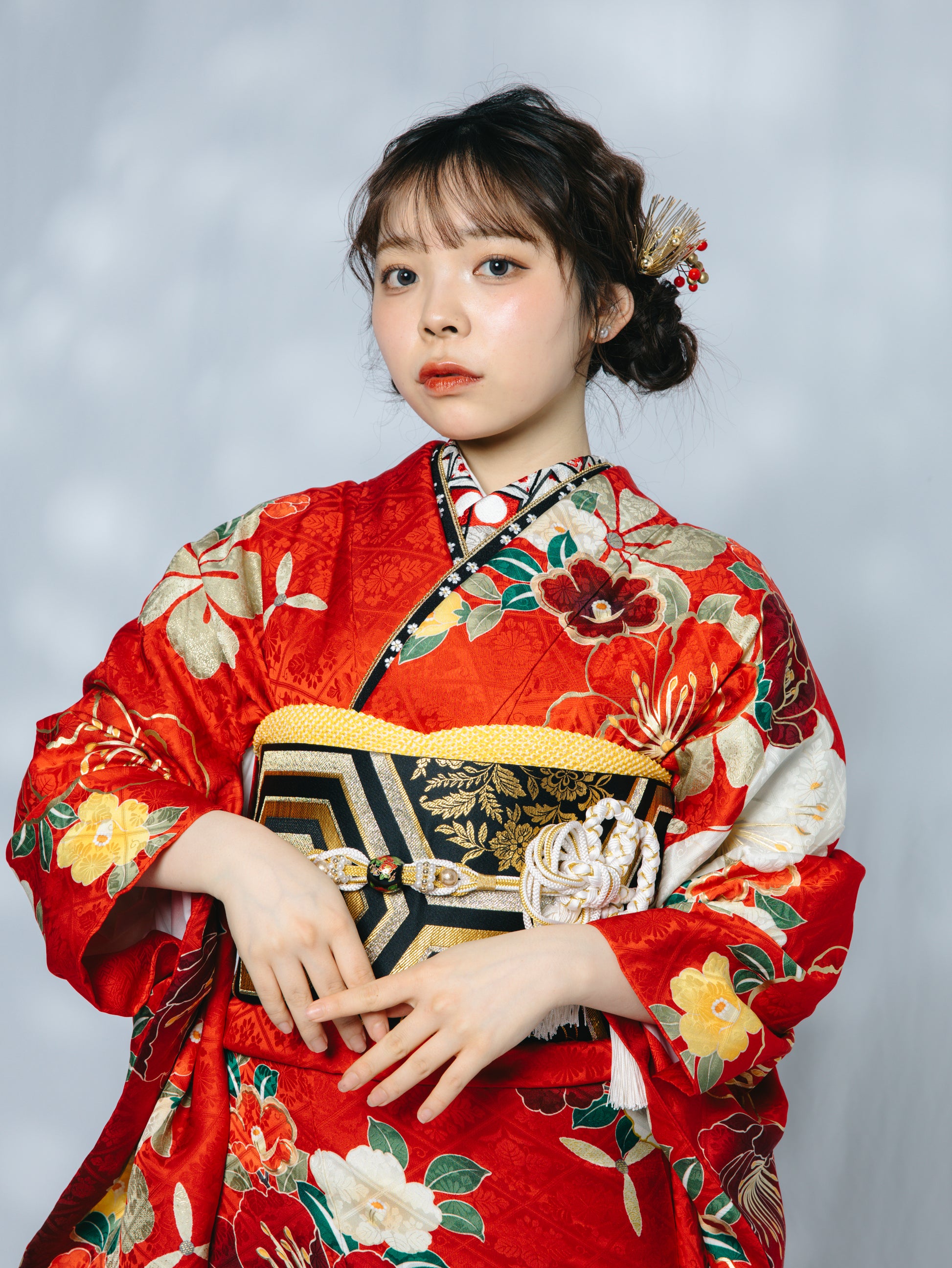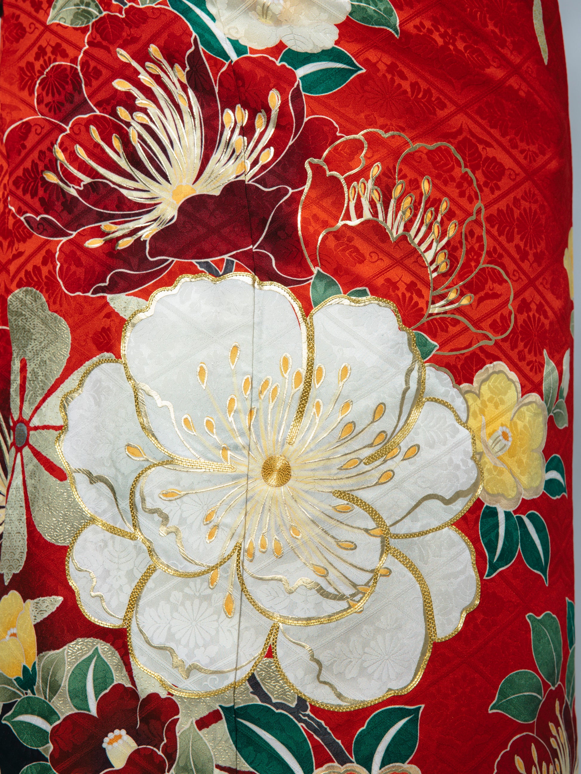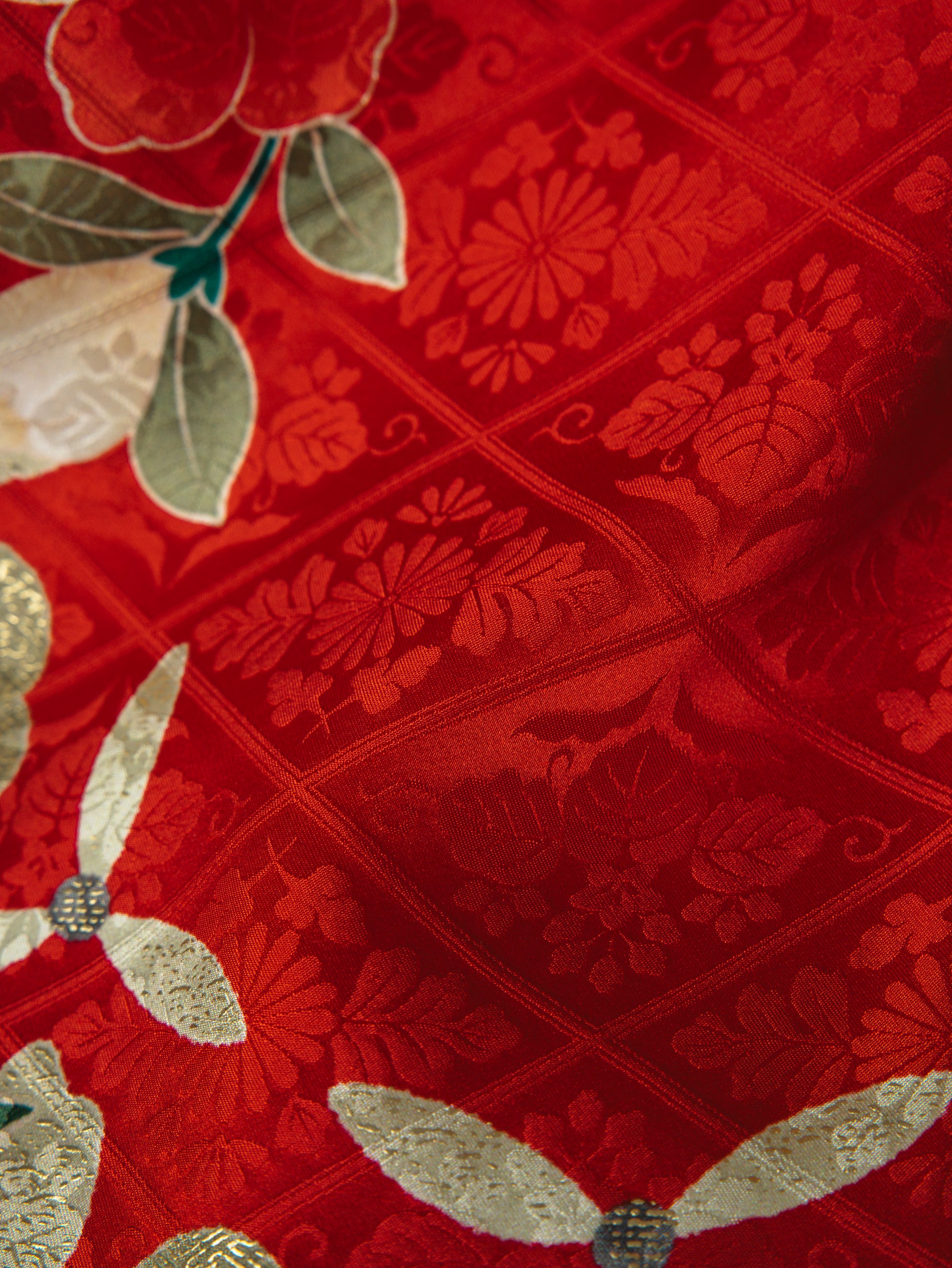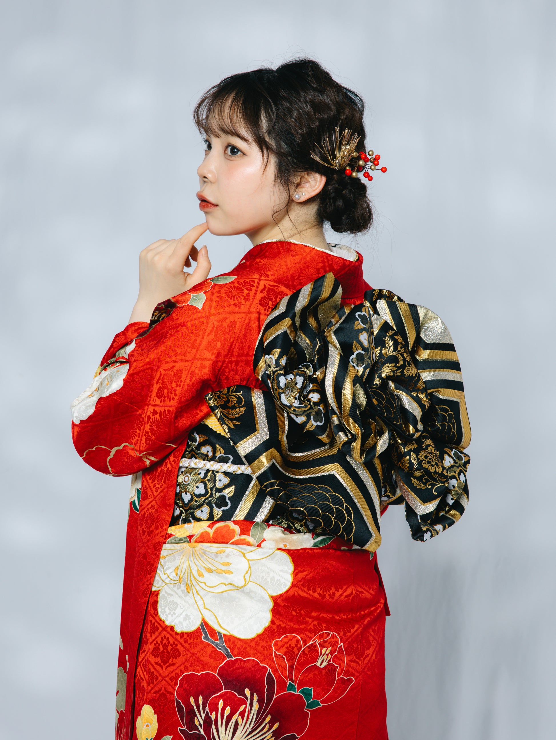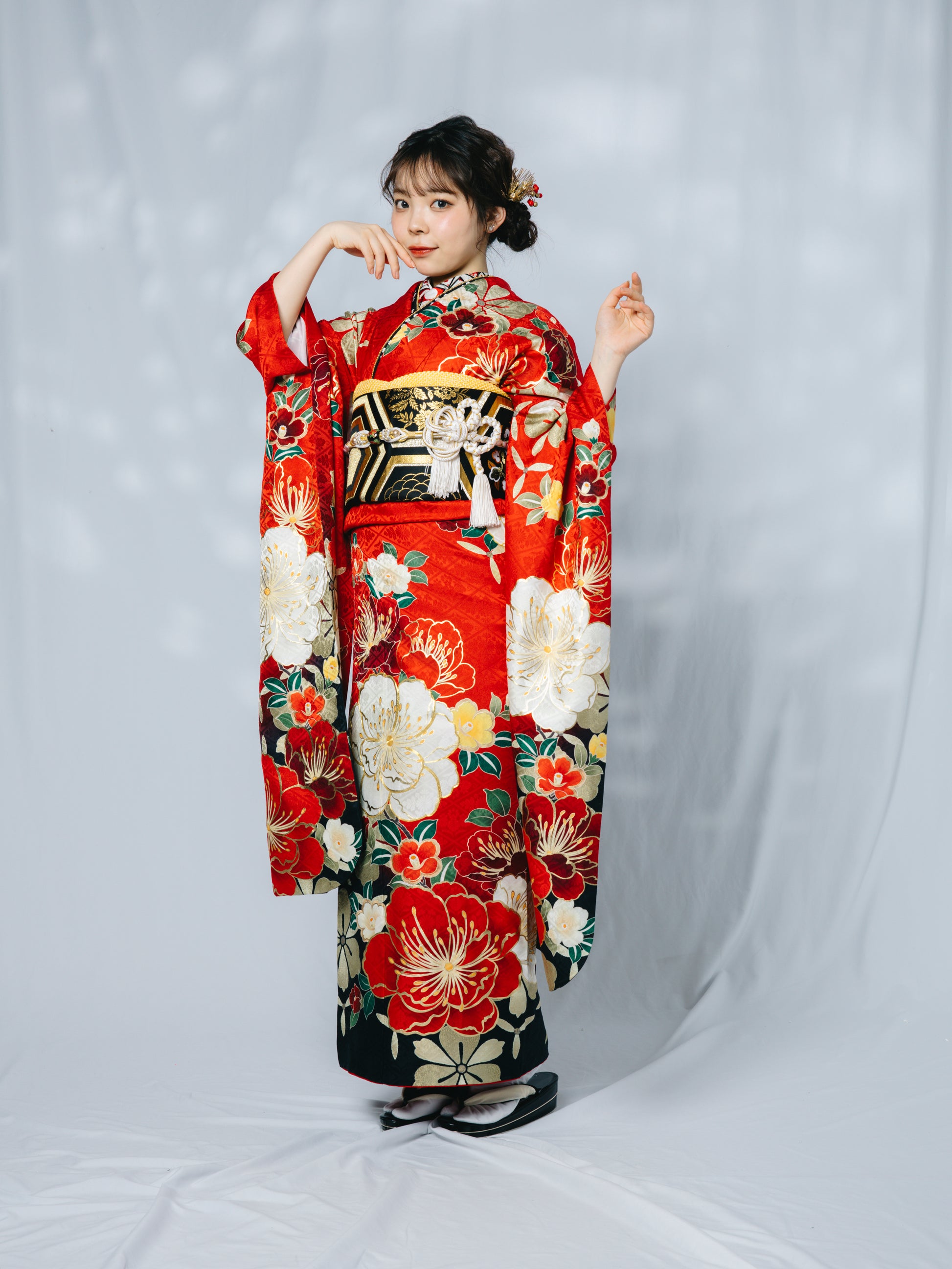 赤地に大きな牡丹と椿があしらわれた豪華な一着。黒や赤で統一感のある印象に